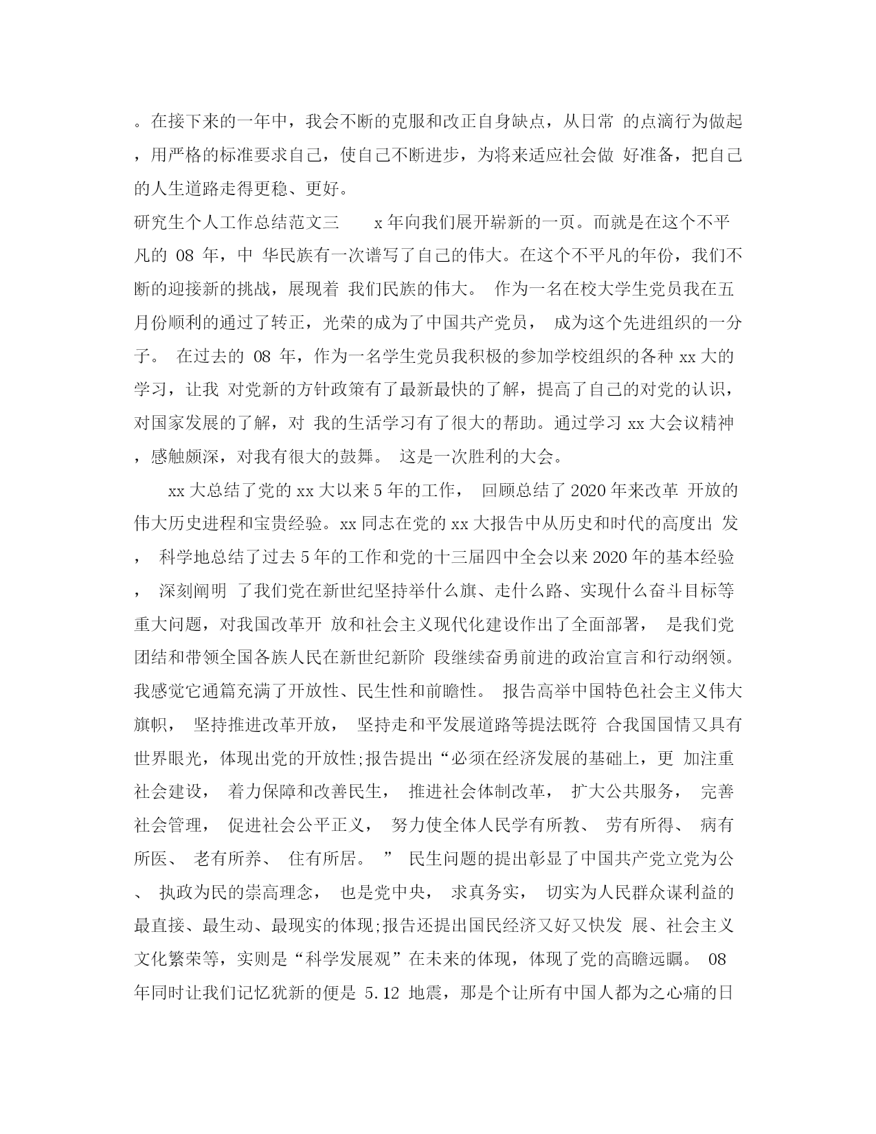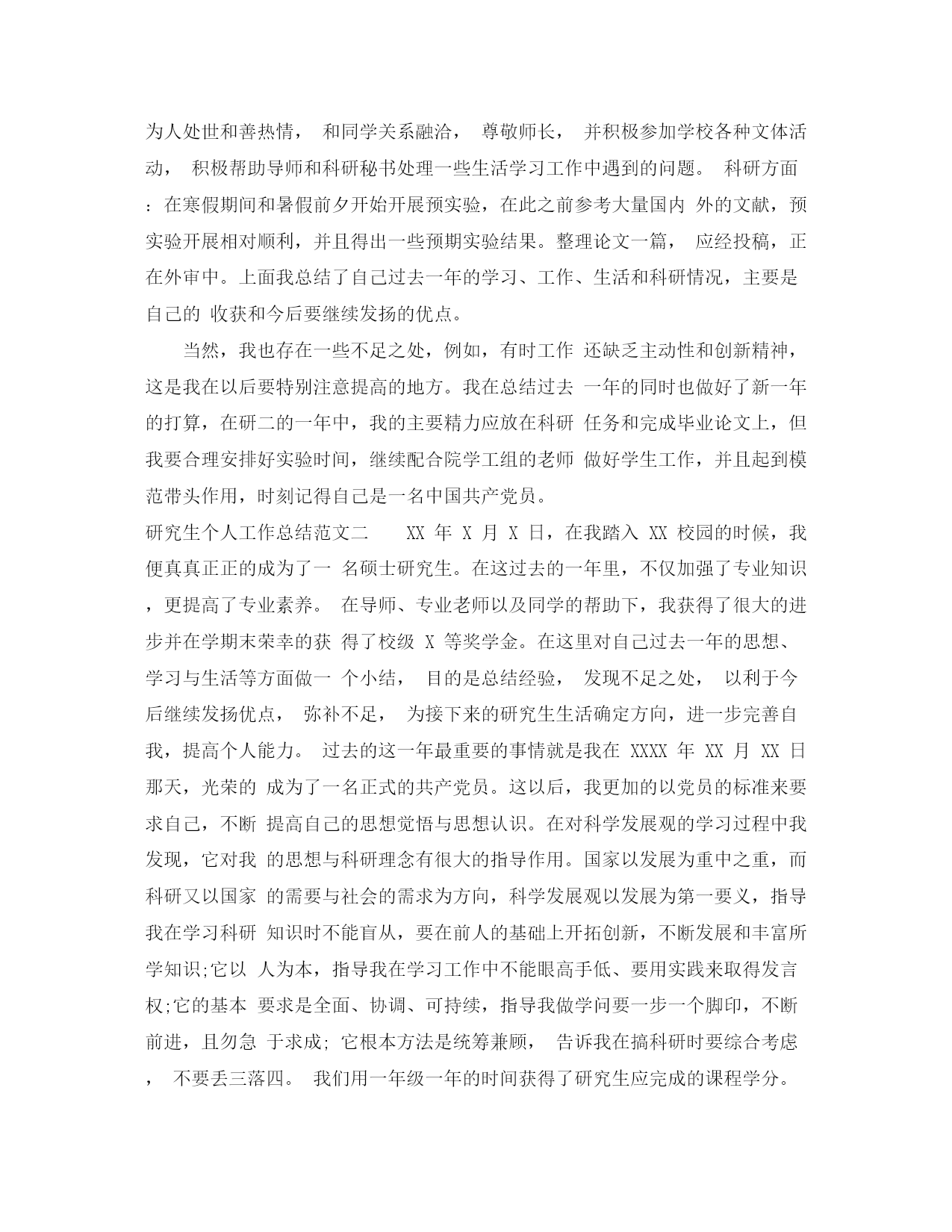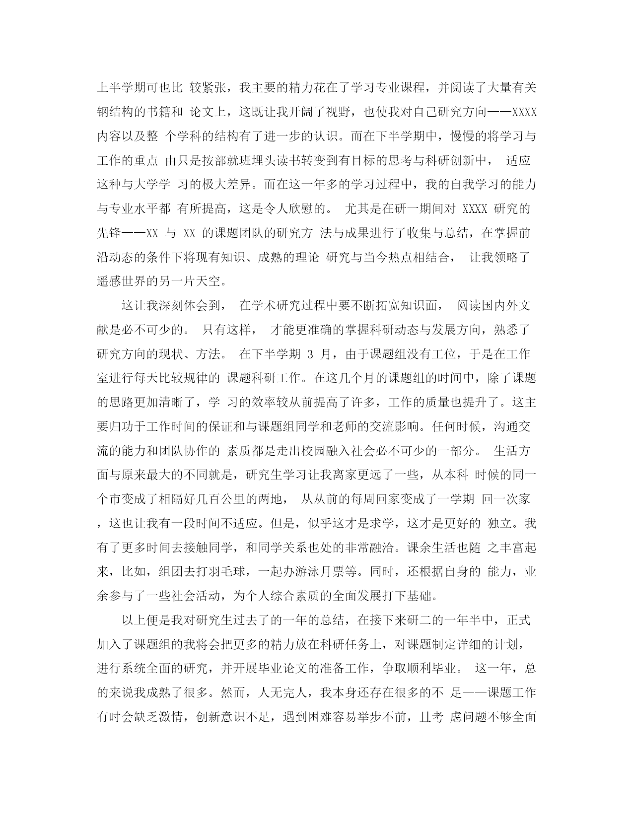 此资料由网络收集而来,如有侵权请告知上传者立即删除。资料共分享,我们负责传递知识。研究生个人工作总结研究生教育指的是培养某一学科或专业领域内掌握扎实的基础理论与系统的专门知识和具备一定的研究与创造能力的研究人员或高层次的专业人员。今天小编给大家整理了研究生个人工作总结,希望对大家有所帮助。研究生个人工作总结范文一时光飞逝,岁月如梭,一年的研究生生活很快的过去了。回首过去的一年,我觉得还是比较充实而有意义的,有很多收获,当然也有失落。总的来说自己成熟了很多。在这里对自己过去一年的学习、生活、科研及社会工作等做一个小结,目的是总结经验,发现不足之处,以利于今后继续发扬优点,弥补不足,为将来适应社会做好准备,把自己的人生道路走得更稳、更好。思想方面:我一直对自己有较高的要求。大学时期我已经加入中国共产党,始终高标准要求自己。我注意学习先进的政治理论,关心国内国际大事,积极拥护党和国家的各项路线、方针、政策,自觉遵守法律、法规和学校的各项规章制度切实地提高了自己的思想认识,同时注重加强对外界时政的了解,通过学习,提高了自己的政治敏锐性和鉴别能力,坚定了立场,坚定了信念,在大是大非问题面前,能够始终保持清醒的头脑。时刻提醒着我注意什么是一个党员该做的,什么是不该做的,这就更加促进了我的进步。同时,我清醒地意识到自己所担负的社会责任。对个人的人生理想和发展目标,我也有了相对成熟的认识和定位。因为我是一名党员了,就应该拿出吃苦耐劳的精神,如果连自己的缺点都不能克服还谈什么先锋模范作用。这一年里,我积极响应学校组织的多次党员活动,配合当前的理论前沿,为自己补充新鲜血液。学习方面:我努力学习专业课程,并阅读了大量与本专业相关的书籍和论文,这既让我开阔了视野,也使我对自己研究方向的内容以及整个学科的结构有了进一步的认识。研究生的课程学习并不是很重,但是老师的宽松对我来说就像是无形的压力。突然感觉自己好像有好多东西需要学习,所以我不敢放松学习,希望在有限的学生生涯中更多地学到点东西。生活方面:严格要求自己,养成良好的生活习惯。作为班里的班长,我平时为人处世和善热情,和同学关系融洽,尊敬师长,并积极参加学校各种文体活动,积极帮助导师和科研秘书处理一些生活学习工作中遇到的问题。科研方面:在寒假期间和暑假前夕开始开展预实验,在此之前参考大量国内外的文献,预实验开展相对顺利,并且得出一些预期实验结果。整理论文一篇,应经投稿,正在外审中。上面我总结了自己过去一年的学习、工作、生活和科研情况,主要是自己的收获和今后要继续发扬的优点。当然,我也存在一些不足之处,例如,有时工作还缺乏主动性和创新精神,这是我在以后要特别注意提高的地方。我在总结过去一年的同时也做好了新一年的打算,在研二的一年中,我的主要精力应放在科研任务和完成毕业论文上,但我要合理安排好实验时间,继续配合院学工组的老师做好学生工作,并且起到模范带头作用,时刻记得自己是一名中国共产党员。研究生个人工作总结范文二XX年X月X日,在我踏入XX校园的时候,我便真真正正的成为了一名硕士研究生。在这过去的一年里,不仅加强了专业知识,更提高了专业素养。在导师、专业老师以及同学的帮助下,我获得了很大的进步并在学期末荣幸的获得了校级X等奖学金。在这里对自己过去一年的思想、学习与生活等方面做一个小结,目的是总结经验,发现不足之处,以利于今后继续发扬优点,弥补不足,为接下来的研究生生活确定方向,进一步完善自我,提高个人能力。过去的这一年最重要的事情就是我在XXXX年XX月XX日那天,光荣的成为了一名正式的共产党员。这以后,我更加的以党员的标准来要求自己,不断提高自己的思想觉悟与思想认识。在对科学发展观的学习过程中我发现,它对我的思想与科研理念有很大的指导作用。国家以发展为重中之重,而科研又以国家的需要与社会的需求为方向,科学发展观以发展为第一要义,指导我在学习科研知识时不能盲从,要在前人的基础上开拓创新,不断发展和丰富所学知识;它以人为本,指导我在学习工作中不能眼高手低、要用实践来取得发言权;它的基本要求是全面、协调、可持续,指导我做学问要一步一个脚印,不断前进,且勿急于求成;它根本方法是统筹兼顾,告诉我在搞科研时要综合考虑,不要丢三落四。我们用一年级一年的时间获得了研究生应完成的课程学分。上半学期可也比较紧张,我主要的精力花在了学习专业课程,并阅读了大量有关钢结构的书籍和论文上,这既让我开阔了视野,也使我对自己研究方向——XXXX内容以及整个学科的结构有了进一步的认识。而在下半学期中,慢慢的将学习与工作的重点由只是按部就班埋头读书转变到有目标的思考与科研创新中,适应这种与大学学习的极大差异。而在这一年多的学习过程中,我的自我学习的能力与专业水平都有所提高,这是令人欣慰的。尤其是在研一期间对XXXX研究的先