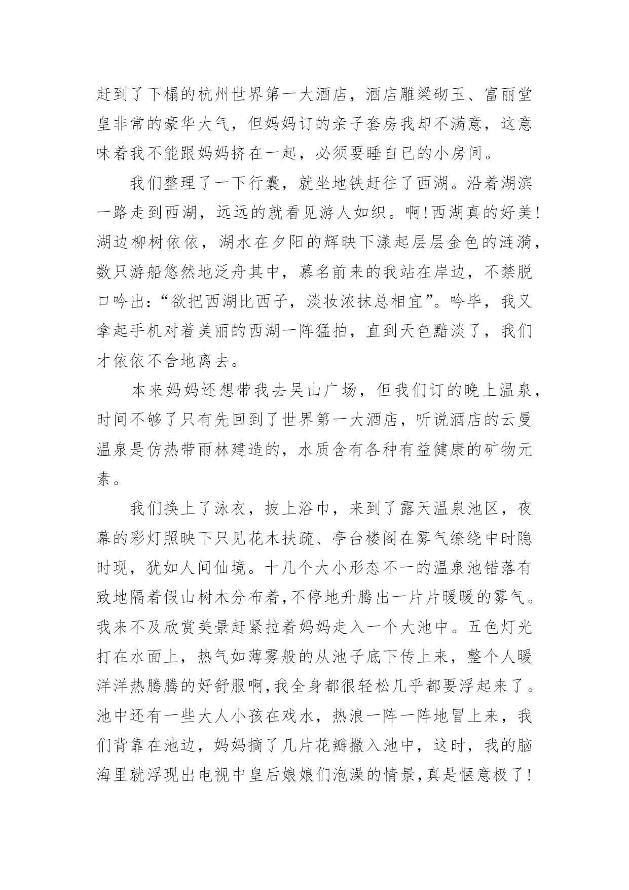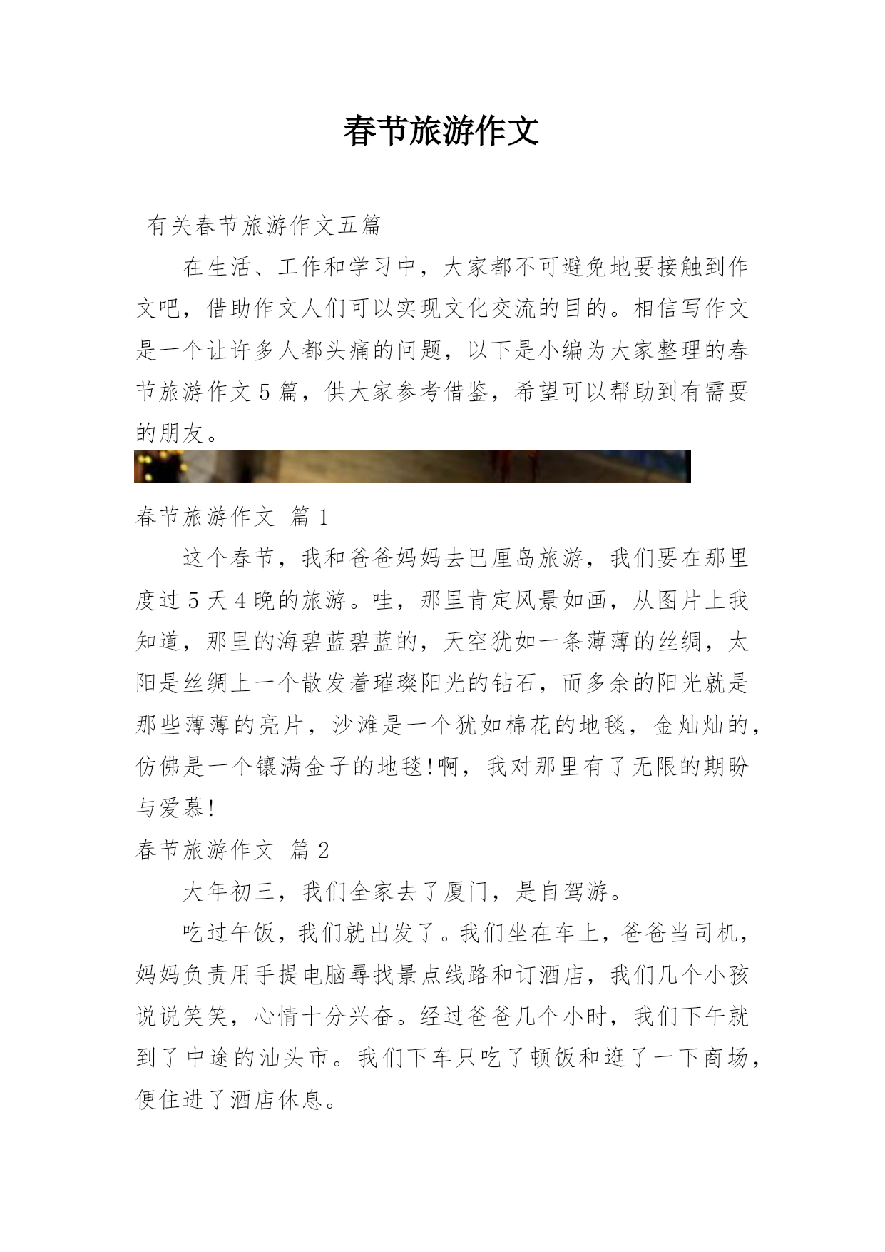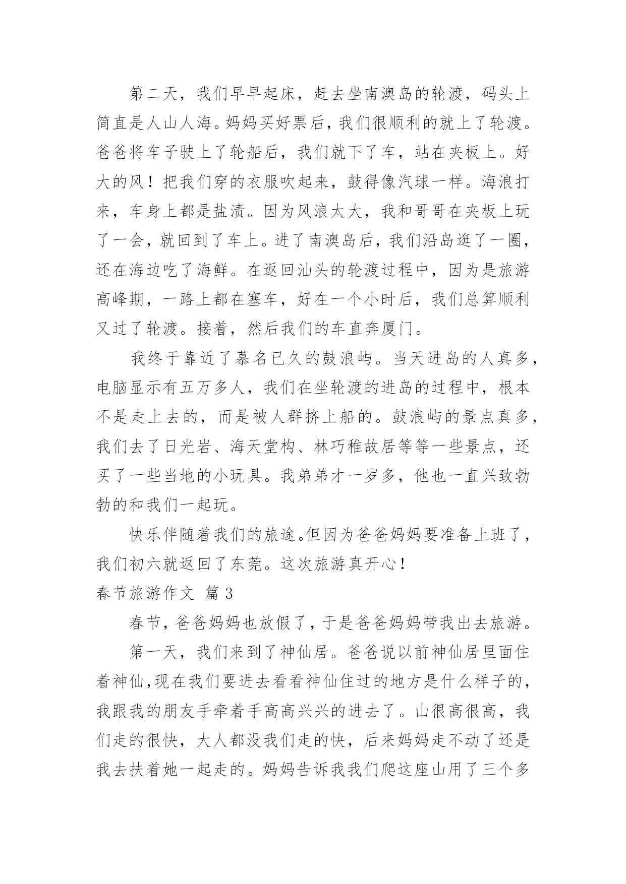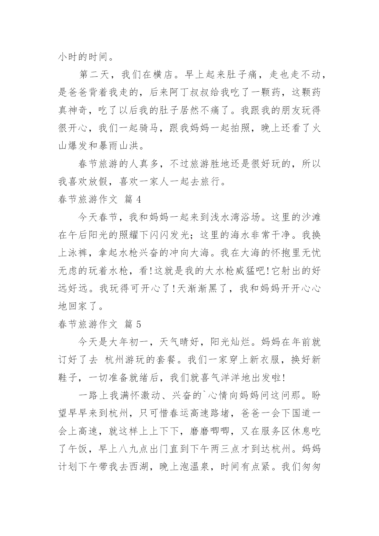 春节旅游作文有关春节旅游作文五篇在生活、工作和学习中,大家都不可避免地要接触到作文吧,借助作文人们可以实现文化交流的目的。相信写作文是一个让许多人都头痛的问题,以下是小编为大家整理的春节旅游作文5篇,供大家参考借鉴,希望可以帮助到有需要的朋友。春节旅游作文篇1这个春节,我和爸爸妈妈去巴厘岛旅游,我们要在那里度过5天4晚的旅游。哇,那里肯定风景如画,从图片上我知道,那里的海碧蓝碧蓝的,天空犹如一条薄薄的丝绸,太阳是丝绸上一个散发着璀璨阳光的钻石,而多余的阳光就是那些薄薄的亮片,沙滩是一个犹如棉花的地毯,金灿灿的,仿佛是一个镶满金子的地毯!啊,我对那里有了无限的期盼与爱慕!春节旅游作文篇2大年初三,我们全家去了厦门,是自驾游。吃过午饭,我们就出发了。我们坐在车上,爸爸当司机,妈妈负责用手提电脑尋找景点线路和订酒店,我们几个小孩说说笑笑,心情十分兴奋。经过爸爸几个小时,我们下午就到了中途的汕头市。我们下车只吃了顿饭和逛了一下商场,便住进了酒店休息。第二天,我们早早起床,赶去坐南澳岛的轮渡,码头上简直是人山人海。妈妈买好票后,我们很顺利的就上了轮渡。爸爸将车子驶上了轮船后,我们就下了车,站在夹板上。好大的风!把我们穿的衣服吹起来,鼓得像汽球一样。海浪打来,车身上都是盐渍。因为风浪太大,我和哥哥在夹板上玩了一会,就回到了车上。进了南澳岛后,我们沿岛逛了一圈,还在海边吃了海鲜。在返回汕头的轮渡过程中,因为是旅游高峰期,一路上都在塞车,好在一个小时后,我们总算顺利又过了轮渡。接着,然后我们的车直奔厦门。我终于靠近了慕名已久的鼓浪屿。当天进岛的人真多,电脑显示有五万多人,我们在坐轮渡的进岛的过程中,根本不是走上去的,而是被人群挤上船的。鼓浪屿的景点真多,我们去了日光岩、海天堂构、林巧稚故居等等一些景点,还买了一些当地的小玩具。我弟弟才一岁多,他也一直兴致勃勃的和我们一起玩。快乐伴随着我们的旅途。但因为爸爸妈妈要准备上班了,我们初六就返回了东莞。这次旅游真开心!春节旅游作文篇3春节,爸爸妈妈也放假了,于是爸爸妈妈带我出去旅游。第一天,我们来到了神仙居。爸爸说以前神仙居里面住着神仙,现在我们要进去看看神仙住过的地方是什么样子的,我跟我的朋友手牵着手高高兴兴的进去了。山很高很高,我们走的很快,大人都没我们走的快,后来妈妈走不动了还是我去扶着她一起走的。妈妈告诉我我们爬这座山用了三个多小时的时间。第二天,我们在横店。早上起来肚子痛,走也走不动,是爸爸背着我走的,后来阿丁叔叔给我吃了一颗药,这颗药真神奇,吃了以后我的肚子居然不痛了。我跟我的朋友玩得很开心,我们一起骑马,跟我妈妈一起拍照,晚上还看了火山爆发和暴雨山洪。春节旅游的人真多,不过旅游胜地还是很好玩的,所以我喜欢放假,喜欢一家人一起去旅行。春节旅游作文篇4今天春节,我和妈妈一起来到浅水湾浴场。这里的沙滩在午后阳光的照耀下闪闪发光;这里的海水非常干净。我换上泳裤,拿起水枪兴奋的冲向大海。我在大海的怀抱里无忧无虑的玩着水枪,看!这就是我的大水枪威猛吧!它射出的好远好远。我玩得可开心了!天渐渐黑了,我和妈妈开开心心地回家了。春节旅游作文篇5今天是大年初一,天气晴好,阳光灿烂。妈妈在年前就订好了去杭州游玩的套餐。我们一家穿上新衣服,换好新鞋子,一切准备就绪后,我们就喜气洋洋地出发啦!一路上我满怀激动、兴奋的`心情向妈妈问这问那。盼望早早来到杭州,只可惜春运高速路堵,爸爸一会下国道一会上高速,就这样上上下下,磨磨唧唧,又在服务区休息吃了午饭,早上八九点出门直到下午两三点才到达杭州。妈妈计划下午带我去西湖,晚上泡温泉,时间有点紧。我们匆匆赶到了下榻的杭州世界第一大酒店,酒店雕梁砌玉、富丽堂皇非常的豪华大气,但妈妈订的亲子套房我却不满意,这意味着我不能跟妈妈挤在一起,必须要睡自已的小房间。我们整理了一下行囊,就坐地铁赶往了西湖。沿着湖滨一路走到西湖,远远的就看见游人如织。啊!西湖真的好美!湖边柳树依依,湖水在夕阳的辉映下漾起层层金色的涟漪,数只游船悠然地泛舟其中,慕名前来的我站在岸边,不禁脱口吟出:“欲把西湖比西子,淡妆浓抹总相宜”。吟毕,我又拿起手机对着美丽的西湖一阵猛拍,直到天色黯淡了,我们才依依不舍地离去。本来妈妈还想带我去吴山广场,但我们订的晚上温泉,时间不够了只有先回到了世界第一大酒店,听说酒店的云曼温泉是仿热带雨林建造的,水质含有各种有益健康的矿物元素。我们换上了泳衣,披上浴巾,来到了露天温泉池区,夜幕的彩灯照映下只见花木扶疏、亭台楼阁在雾气缭绕中时隐时现,犹如人间仙境。十几个大小形态不一的温泉池错落有致地隔着假山树木分布着,不停地升腾出一片片暖暖的雾气。我来不及欣赏美景赶紧拉着妈妈走入一个大池中。五色灯光打在水面上,热气如薄雾般的从池子底下传上来,整个人暖洋洋热腾腾的好舒服啊,我全身都很轻松