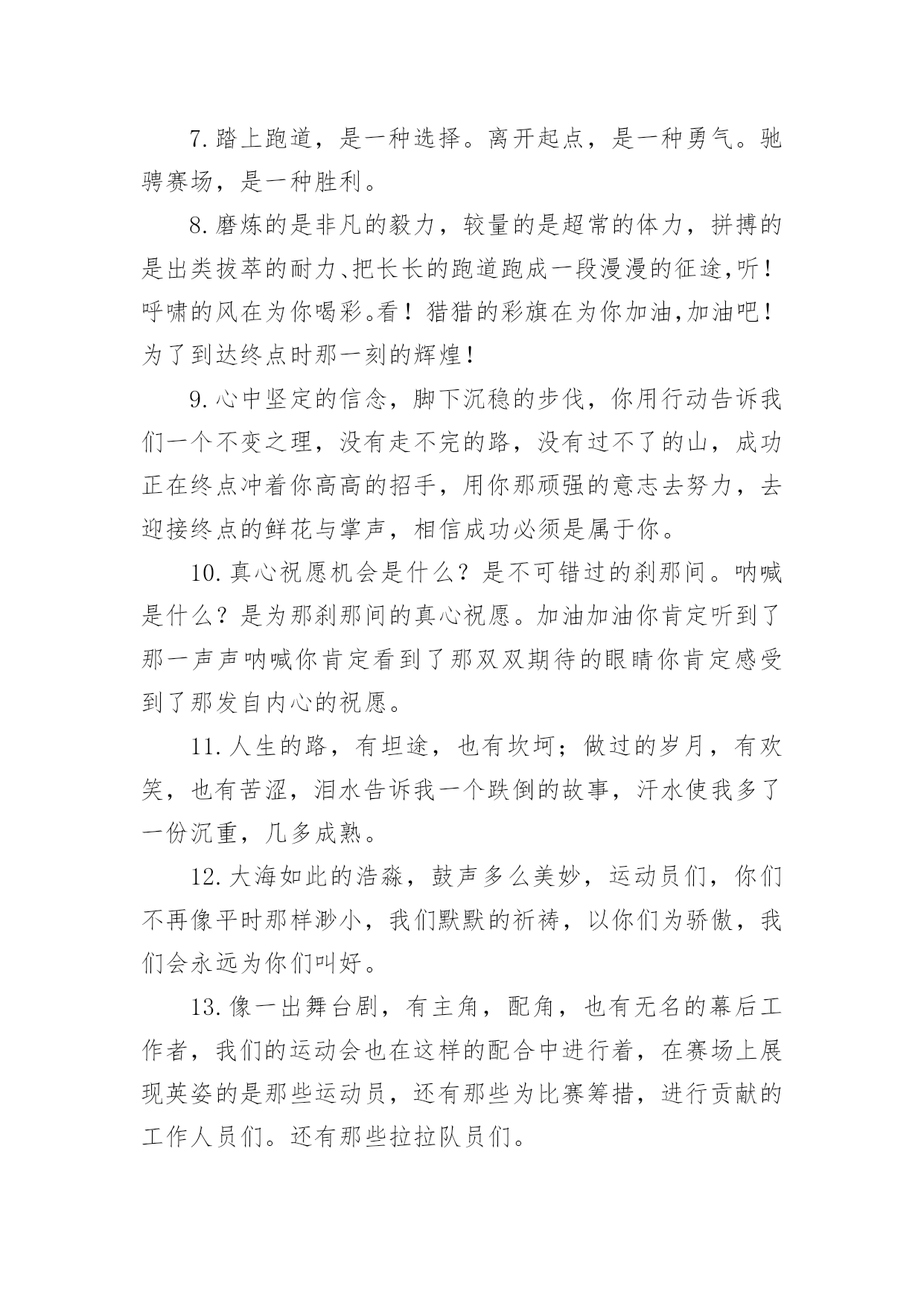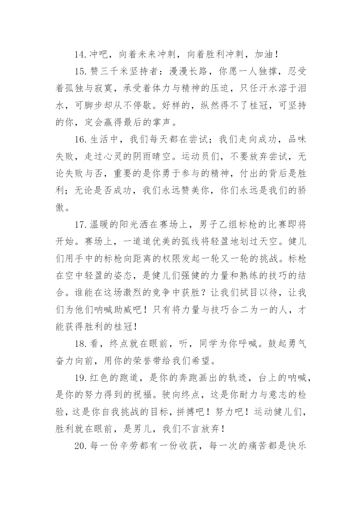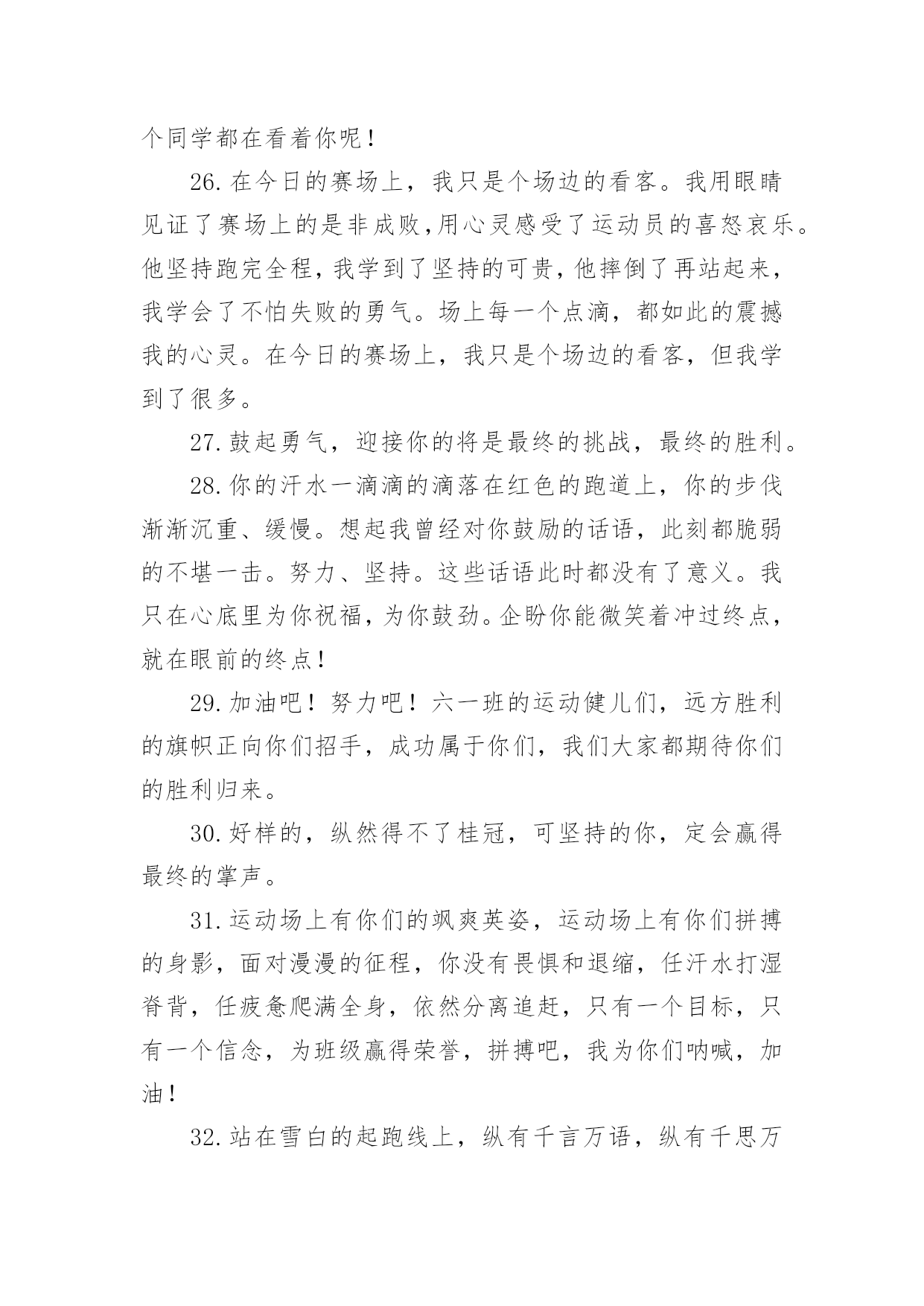 运动会加油稿运动会加油稿在快速变化和不断变革的今天,接触并使用加油稿的人越来越多,加油稿是一种对他人有正向激励作用的文稿。还是对加油稿一筹莫展吗?以下是小编为大家整理的运动会加油稿,欢迎大家借鉴与参考,希望对大家有所帮助。运动会加油稿11、你们是我心中的太阳在热度的考验下你们渴望在风度的辛意中你们痴狂亲爱的运动员们愿你们冲破乌云放出耀眼的光芒2、加油吧,运动健儿们!阵阵有力的步伐,声声有劲的呐喊,运动场上洒下我们青春的点点滴滴。旗摇摇,鼓声声,那里挡不助的是青春活力;枪声响起,“预备起跑”,挡不助的是健儿们如火般的气势。英雄舍我其谁,胜利当仁不让,声声誓言浸透着健儿们的昂扬斗志。朋友们,为运动健儿们喝彩,为运动喝彩吧!场上精彩纷呈,空气里的每一个分子浸透着自信。3、广阔的绿茵场,是为你们搭建的舞台。张扬吧,年轻的心,我们将为你永远喝彩!泰戈尔在诗中说,天空没有翅膀的影子,但我已飞过;艾青对朋友说,也许有人到达不了彼岸,但我们共同拥有大海。也许你们没有显赫的成绩,但运动场上留下了你们的足迹。也许你们没有奖品,但我们心中留下了你们拼搏的身影。所有的努力都是为了迎接这一刹那,所有的拼搏都是为了这一声令下。4、理想毕竟不同于现实,失败是生活的一部分,谁也无法选择,无法拒绝。人生要自己去拼搏,去奋斗,在风雨中百折不挠勇往前进,在集资的每个驿站上都留下一段不悔的回忆。流泪不是失落,徘徊不是迷惑,成功属于那些战胜失败,坚持不懈、勇于追求梦想的人。加油吧,运动健儿们!5、致百米赛跑运动员,风一样的步伐在烈日下微笑奔跑,没有拉拉队,甚至听不到呐喊,你依旧那么欢悦。骄阳似火,你的激情却胜似火,整个操场你是最亮的一点。加油!6、致四百米运动员依然是蓝色的天空,依然是金色的阳光,依然是绿色的草地,依然是红色的跑道,依然是你,勇敢的你,坚强的你.不同的是,天空更加蔚蓝,阳光更加灿烂,草地更如翡翠一般,跑道更加的鲜艳,而你,定会更加的自信,你的成绩,必然更加辉煌.7、不为鲜花的围绕,不为刹那的荣耀,只有执着的信念,化作不停的奔跑,心中燃烧着梦想,脚下不停的步伐。8、运动不怕夺冠难,万里征程只等闲。操场尘土兴飞扬,铁足涉及踏深坑。老师同学齐上阵,个个为加油鼓励。更细桂冠终猎取,陈良过后尽开颜。9、今日的你们英姿飒爽,今日的你们朝气蓬勃,今日的你们一马当先。相信自己,你是最棒的!不要放弃,不要气馁。成功永远属于你们。米运动员啊!加油啊。10、场上英姿显自豪,脚下步伐在飞奔。你们是骄傲。你们是自豪,跑道因你幻彩,面对红色跑道,你们挥洒自如,不惧一切冲向终点。11、真的,人生要是能有一个草稿,能再誊写一次,那该多好!我们会绝对认真地叙写自己的人生,也许不必须比别人写得更好,但肯定要比自己第一次写得漂亮。或许,人生不可能像自己想象的那样完美,一生的路也不可能都是平坦的,人的情绪也不会永远静如止水。12、青春是不老的誓言,飞扬是年轻的梦想,金色的十月,让我们在这长长的跑道上青春飞扬,现出飒爽的风姿,亮出真我的风采,带上同学们的热情,载着同伴们的期望,背负老师的嘱托,在这活力四射的校园里,放飞你的青春活力和运动激情。13、场上英姿显自豪,脚下步伐在飞奔。你们是骄傲,你们是自豪,跑道因你幻彩,应对红色跑道,你们挥洒自如,不惧一切冲向终点!15.致百米运动员你将时间凝聚在一点,默默地??一声枪响,划破了宁静万箭飞花,直指终点努力呐,加油呀激情纵燃在终点成功点起笑脸14、致4×100接力赛的运动员:四个完美的弧线,被一根小小的棒儿连接。这是人生的`完美,这是运动的极限。莫要问,我们为什么配合这样默契,莫要问,我们为什么这样紧密团结。因为,我们是情同手足的,体育健儿!这是一根普通的木棒红白的对比刻画出它们的公正与刚毅。它握在你们--我们的接力运动员的手中。冰冷变为热情,刚毅溶进柔和。今天我们握它在赛场上飞奔,明天我们将与它共同踏上奥运征程。那激烈的场面,令每一个人心动。你们拼尽每一份力,把手中的胜利传给下一个人;我们用力加油,把心中的希望传给你们。你撞线了,我们欢呼了。不仅仅为了胜利,更重要的是,我们懂得了一种珍贵的精神,那就是--团结。15、时间在流逝,赛道在延伸,成功在你面前展现心脏的跳动,热血在沸腾,辉煌在你脚下铸就加油吧,健儿们,这是意志的拼搏。这是速度的挑战。胜利在向你们招手/胜利在向你们呼唤。16、你用行动述说着过城的重要,没有无尽的终点,没有无法攀登的险峰,希望载着终点在向你微笑,拼搏吧!经历是一种精彩,迸发你全部的能量,成功是你汗水的写照。运动会加油稿2力量,信念,拼搏与奋斗你是运动场的心脏,跳动梦想;你是漫长路的精神,激励辉煌;你们是将上下求索的人!风为你加油,云为你助兴,坚定,执着,耐力与希望在延伸的白色跑道中点点凝聚!力量,信念,拼搏与奋斗在遥远的终