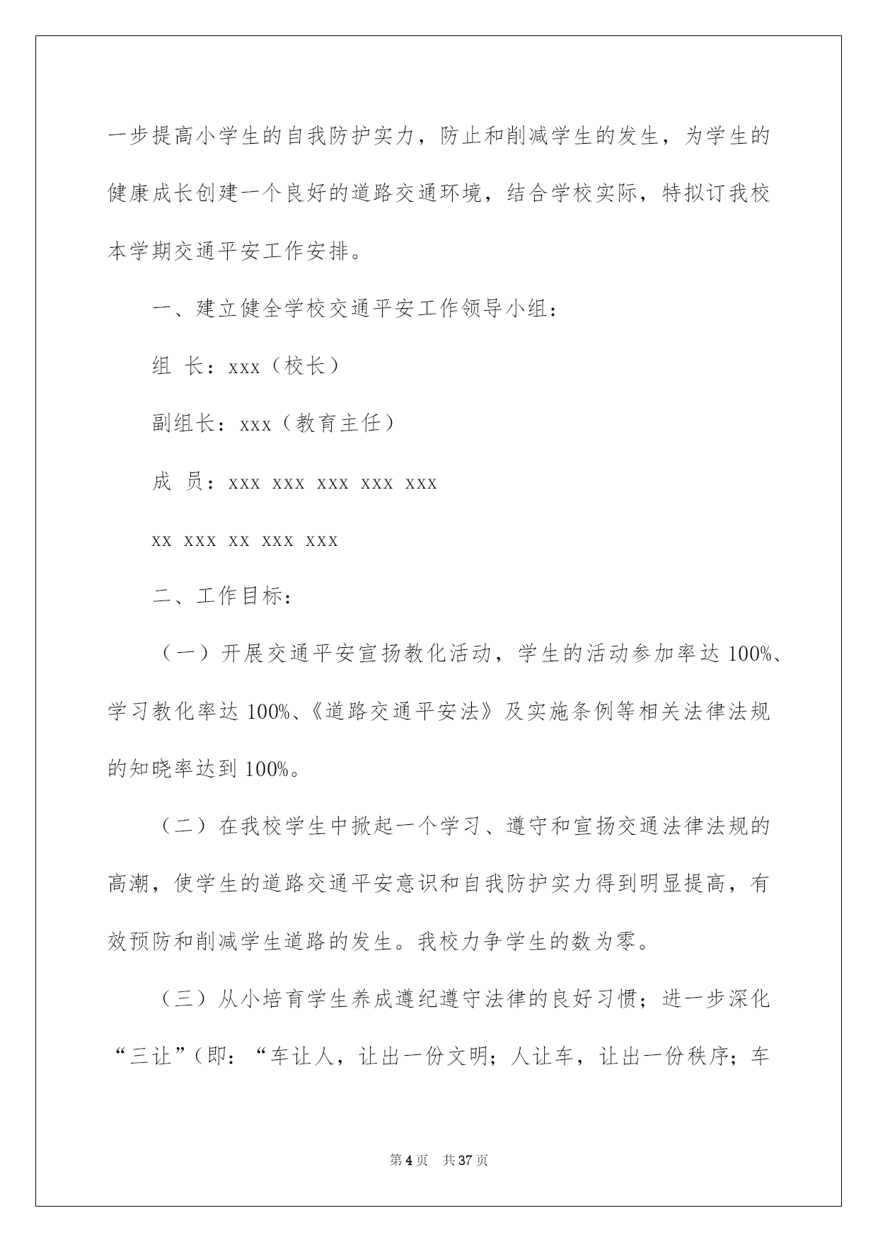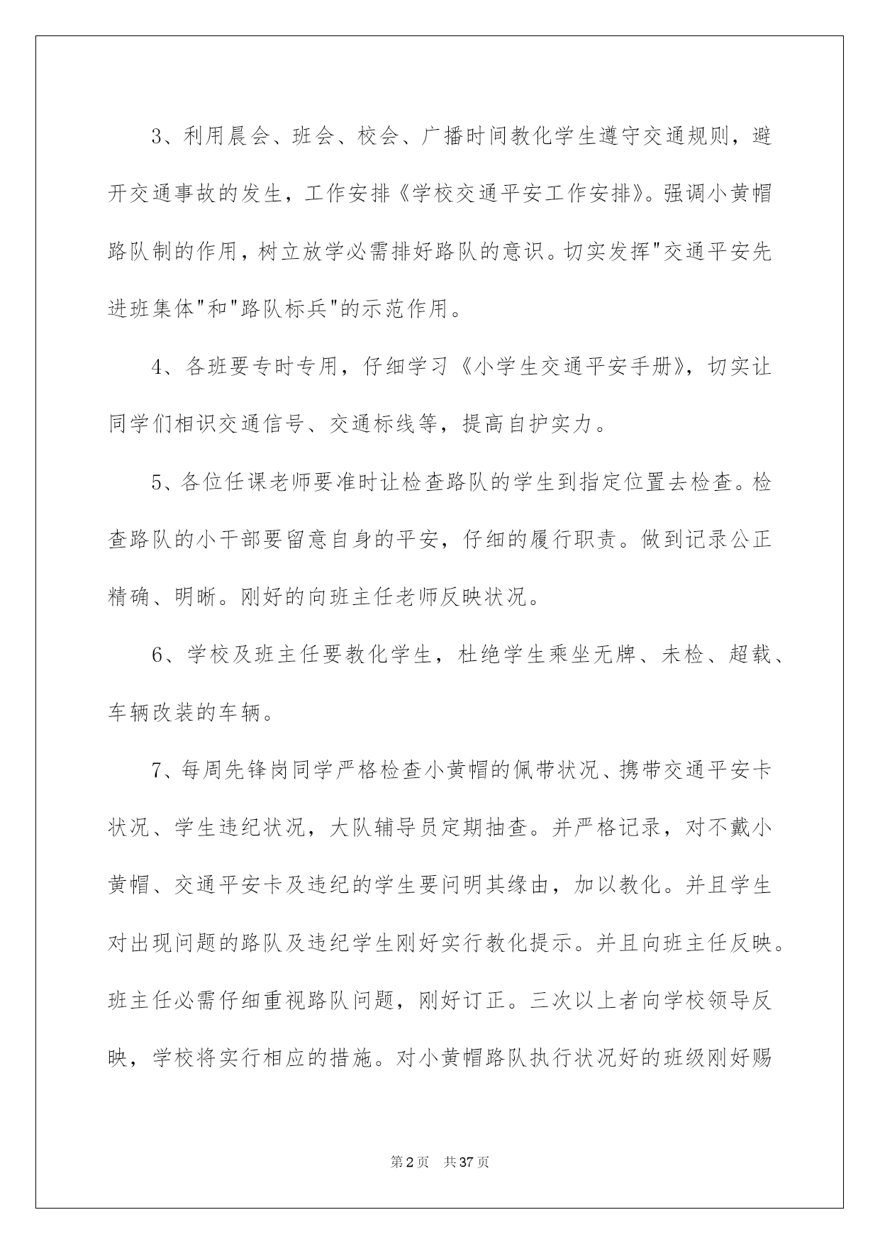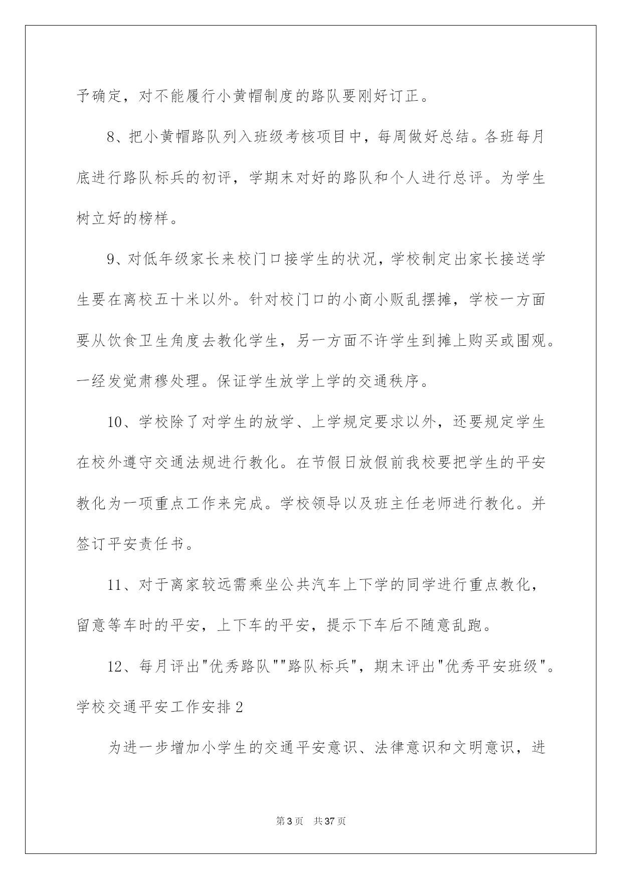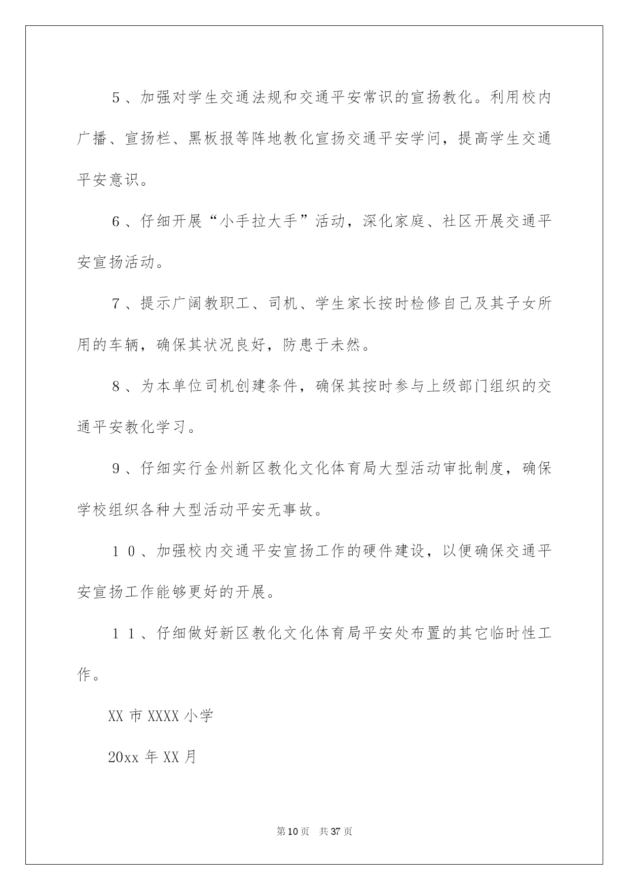 第PAGE\*Arabic\*MERGEFORMAT37页共NUMPAGES\*Arabic\*MERGEFORMAT37页第PAGE\*MERGEFORMAT37页共NUMPAGES\*MERGEFORMAT37页第PAGE\*MERGEFORMAT37页共NUMPAGES\*MERGEFORMAT37页第PAGE\*MERGEFORMAT37页共NUMPAGES\*MERGEFORMAT37页第PAGE\*MERGEFORMAT37页共NUMPAGES\*MERGEFORMAT37页第PAGE\*MERGEFORMAT37页共NUMPAGES\*MERGEFORMAT37页第PAGE\*MERGEFORMAT37页共NUMPAGES\*MERGEFORMAT37页第PAGE\*MERGEFORMAT37页共NUMPAGES\*MERGEFORMAT37页第PAGE\*MERGEFORMAT37页共NUMPAGES\*MERGEFORMAT37页第PAGE\*MERGEFORMAT37页共NUMPAGES\*MERGEFORMAT37页第PAGE\*MERGEFORMAT37页共NUMPAGES\*MERGEFORMAT37页2022学校交通安全工作计划学校交通平安工作安排(15篇)时间消逝得如此之快,我们的工作又将在劳碌中充溢着,在喜悦中收获着,是时候抽出时间写写安排了。那么我们该怎么去写安排呢?下面是我收集整理的学校交通平安工作安排,仅供参考,希望能够帮助到大家。学校交通平安工作安排1为了增加学生的平安意识,提高学生的自我爱护实力,使学生形成良好的平安行为习惯,树立学校良好的校内风气,学校交通平安工作安排。以达到高兴奋兴上学来,平平安安回家去的目的。特制定"交通平安工作安排"详细措施实施方法如下:1、学期初,班主任要与学生及学生家长签订平安责任书。2、学校及各位老师要向学生明确路队的详细要求,随时督促指导学生按要求去做,对不符合要求的学生要进行耐性、细致的思想教化工作,使他们相识到违反"路队制"的危害性,从而提高学生的平安意识和自我爱护意识。3、利用晨会、班会、校会、广播时间教化学生遵守交通规则,避开交通事故的发生,工作安排《学校交通平安工作安排》。强调小黄帽路队制的作用,树立放学必需排好路队的意识。切实发挥"交通平安先进班集体"和"路队标兵"的示范作用。4、各班要专时专用,仔细学习《小学生交通平安手册》,切实让同学们相识交通信号、交通标线等,提高自护实力。5、各位任课老师要准时让检查路队的学生到指定位置去检查。检查路队的小干部要留意自身的平安,仔细的履行职责。做到记录公正精确、明晰。刚好的向班主任老师反映状况。6、学校及班主任要教化学生,杜绝学生乘坐无牌、未检、超载、车辆改装的车辆。7、每周先锋岗同学严格检查小黄帽的佩带状况、携带交通平安卡状况、学生违纪状况,大队辅导员定期抽查。并严格记录,对不戴小黄帽、交通平安卡及违纪的学生要问明其缘由,加以教化。并且学生对出现问题的路队及违纪学生刚好实行教化提示。并且向班主任反映。班主任必需仔细重视路队问题,刚好订正。三次以上者向学校领导反映,学校将实行相应的措施。对小黄帽路队执行状况好的班级刚好赐予确定,对不能履行小黄帽制度的路队要刚好订正。8、把小黄帽路队列入班级考核项目中,每周做好总结。各班每月底进行路队标兵的初评,学期末对好的路队和个人进行总评。为学生树立好的榜样。9、对低年级家长来校门口接学生的状况,学校制定出家长接送学生要在离校五十米以外。针对校门口的小商小贩乱摆摊,学校一方面要从饮食卫生角度去教化学生,另一方面不许学生到摊上购买或围观。一经发觉肃穆处理。保证学生放学上学的交通秩序。10、学校除了对学生的放学、上学规定要求以外,还要规定学生在校外遵守交通法规进行教化。在节假日放假前我校要把学生的平安教化为一项重点工作来完成。学校领导以及班主任老师进行教化。并签订平安责任书。11、对于离家较远需乘坐公共汽车上下学的同学进行重点教化,留意等车时的平安,上下车的平安,提示下车后不随意乱跑。12、每月评出"优秀路队""路队标兵",期末评出"优秀平安班级"。学校交通平安工作安排2为进一步增加小学生的交通平安意识、法律意识和文明意识,进一步提高小学生的自我防护实力,防止和削减学生的发生,为学生的健康成长创建一个良好的道路交通环境,结合学校实际,特拟订我校本学期交通平安工作安排。一、建立健全学校交通平安工作领导小组:组长:xxx(校长)副组长:xxx(教育主任)成员:xxxxxxxxxxxxxxxxxxxxxxxxxxxx二、工