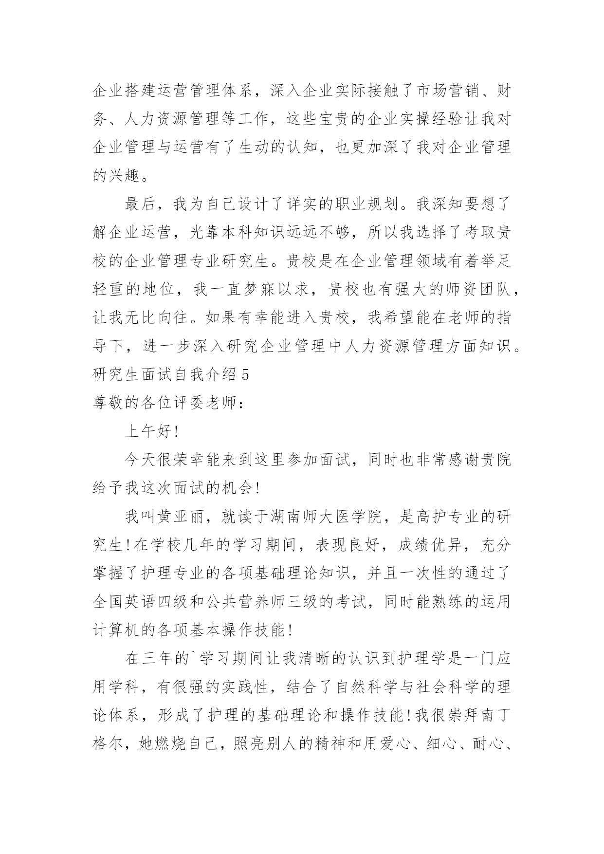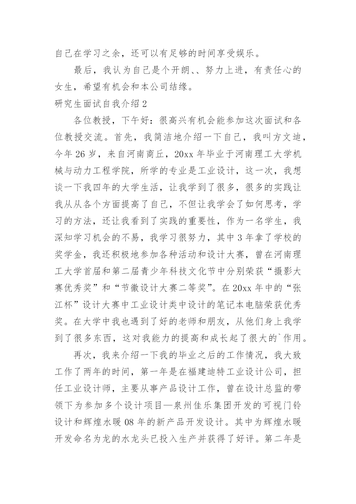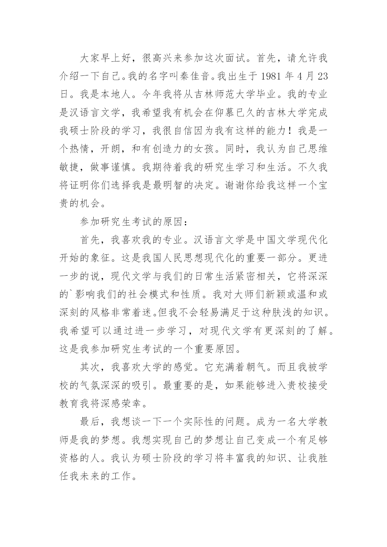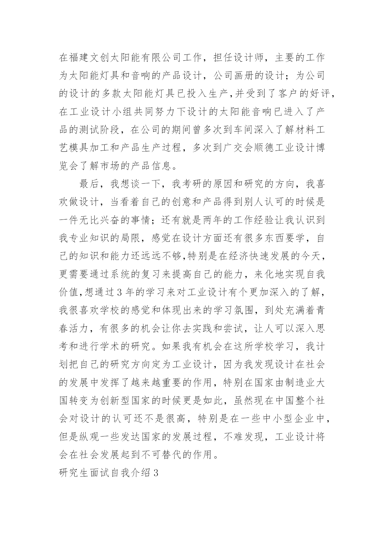 研究生面试自我介绍研究生面试自我介绍当碰到陌生人时候,我们有必要进行适当的自我介绍,自我介绍是我们重新认识自己的开始。那么我们该怎么去写自我介绍呢?以下是小编整理的研究生面试自我介绍,希望对大家有所帮助。研究生面试自我介绍1大家好,我是,来自于xxx学校,我的专业是工商管理。在大学的四年,我先后获得过xxx奖学金,校级优秀学生干部,xxx(国家、学校比赛)奖。今天我应聘的职位是xx市场类。我将主要从四个方面来以阐述:我的专业是工商管理,三年中,我主要做过的课业项目有:西安傣妹火锅店的市场满意度调查和选址分析;宜兴紫砂茶具进入英国市场的营销方案研究;陕西东岭工贸组织结构随织规模演变的'实证研究。通过理论知识的学习,利用假期及课余时间参加市场、销售方面的实习、兼职工作。XX年寒假,上海家化玉泽品牌助理实习;XX年寒假,陕西春雨文化教育有限工资咨询顾问实习以及西安海尔工贸有限公司海尔冰箱销售专员的兼职等。一直以来我对自己的要求是要想一个高速旋转的齿轮一样,所以我会提前对自己的时间做比较严密的规划,保证自己在学习之余,还可以有足够的时间享受娱乐。最后,我认为自己是个开朗、、努力上进,有责任心的女生,希望有机会和本公司结缘。研究生面试自我介绍2各位教授,下午好:很高兴有机会能参加这次面试和各位教授交流。首先,我简洁地介绍一下自己,我叫方文迪,今年26岁,来自河南商丘,20xx年毕业于河南理工大学机械与动力工程学院,所学的专业是工业设计,这一次,我想谈一下我四年的大学生活,让我学到了很多,很多的实践让我从从各个方面提高了自己,不但让我学会了如何思考,学习的方法,还让我看到了实践的重要性,作为一名学生,我深知学习机会的不易,我学习很努力,其中3年拿了学校的奖学金,我还积极地参加各种活动和设计大赛,曾在河南理工大学首届和第二届青少年科技文化节中分别荣获“摄影大赛优秀奖”和“节徽设计大赛二等奖”。在20xx年中的“张江杯”设计大赛中工业设计类中设计的笔记本电脑荣获优秀奖。在大学中我也遇到了好的老师和朋友,从他们身上我学到了很多东西,这对我能力的提高和成长起了很大的`作用。再次,我来介绍一下我的毕业之后的工作情况,我大致工作了两年的时间,第一年是在福建迪特工业设计公司,担任工业设计师,主要从事产品设计工作,曾在设计总监的带领下为参加多个设计项目—泉州佳乐集团开发的可视门铃设计和辉煌水暖08年的新产品开发设计。其中为辉煌水暖开发命名为龙的水龙头已投入生产并获得了好评。第二年是在福建文创太阳能有限公司工作,担任设计师,主要的工作为太阳能灯具和音响的产品设计,公司画册的设计;为公司的设计的多款太阳能灯具已投入生产,并受到了客户的好评,在工业设计小组共同努力下设计的太阳能音响已进入了产品的测试阶段,在公司的期间曾多次到车间深入了解材料工艺模具加工和产品生产过程,多次到广交会顺德工业设计博览会了解市场的产品信息。最后,我想谈一下,我考研的原因和研究的方向,我喜欢做设计,当看着自己的创意和产品得到别人认可的时候是一件无比兴奋的事情;还有就是两年的工作经验让我认识到我专业知识的局限,感觉在设计方面还有很多东西要学,自己的知识和能力还远远不够,特别是在经济快速发展的今天,更需要通过系统的复习来提高自己的能力,来化地实现自我价值,想通过3年的学习来对工业设计有个更加深入的了解,我很喜欢学校的感觉和体现出来的学习氛围,到处充满着青春活力,有很多的机会让你去实践和尝试,让人可以深入思考和进行学术的研究。如果我有机会在这所学校学习,我计划把自己的研究方向定为工业设计,因为我发现设计在社会的发展中发挥了越来越重要的作用,特别在国家由制造业大国转变为创新型国家的时候更是如此,虽然现在中国整个社会对设计的认可还不是很高,特别是在一些中小型企业中,但是纵观一些发达国家的发展过程,不难发现,工业设计将会在社会发展起到不可替代的作用。研究生面试自我介绍3大家早上好,很高兴来参加这次面试。首先,请允许我介绍一下自己。我的名字叫秦佳音。我出生于1981年4月23日。我是本地人。今年我将从吉林师范大学毕业。我的专业是汉语言文学,我希望我有机会在仰慕已久的吉林大学完成我硕士阶段的学习,我很自信因为我有这样的能力!我是一个热情,开朗,和有创造力的女孩。同时,我认为自己思维敏捷,做事谨慎。我期待着我的研究生学习和生活。不久我将证明你们选择我是最明智的决定。谢谢你给我这样一个宝贵的机会。参加研究生考试的原因:首先,我喜欢我的专业。汉语言文学是中国文学现代化开始的象征。这是我国人民思想现代化的重要一部分。更进一步的说,现代文学与我们的日常生活紧密相关,它将深深的`影响我们的社会模式和性质。我对大师们新颖或温和或深刻的风格非常着迷。但我不会轻易满足于这种肤浅的知识。我希望可以通过进一步学习,对现