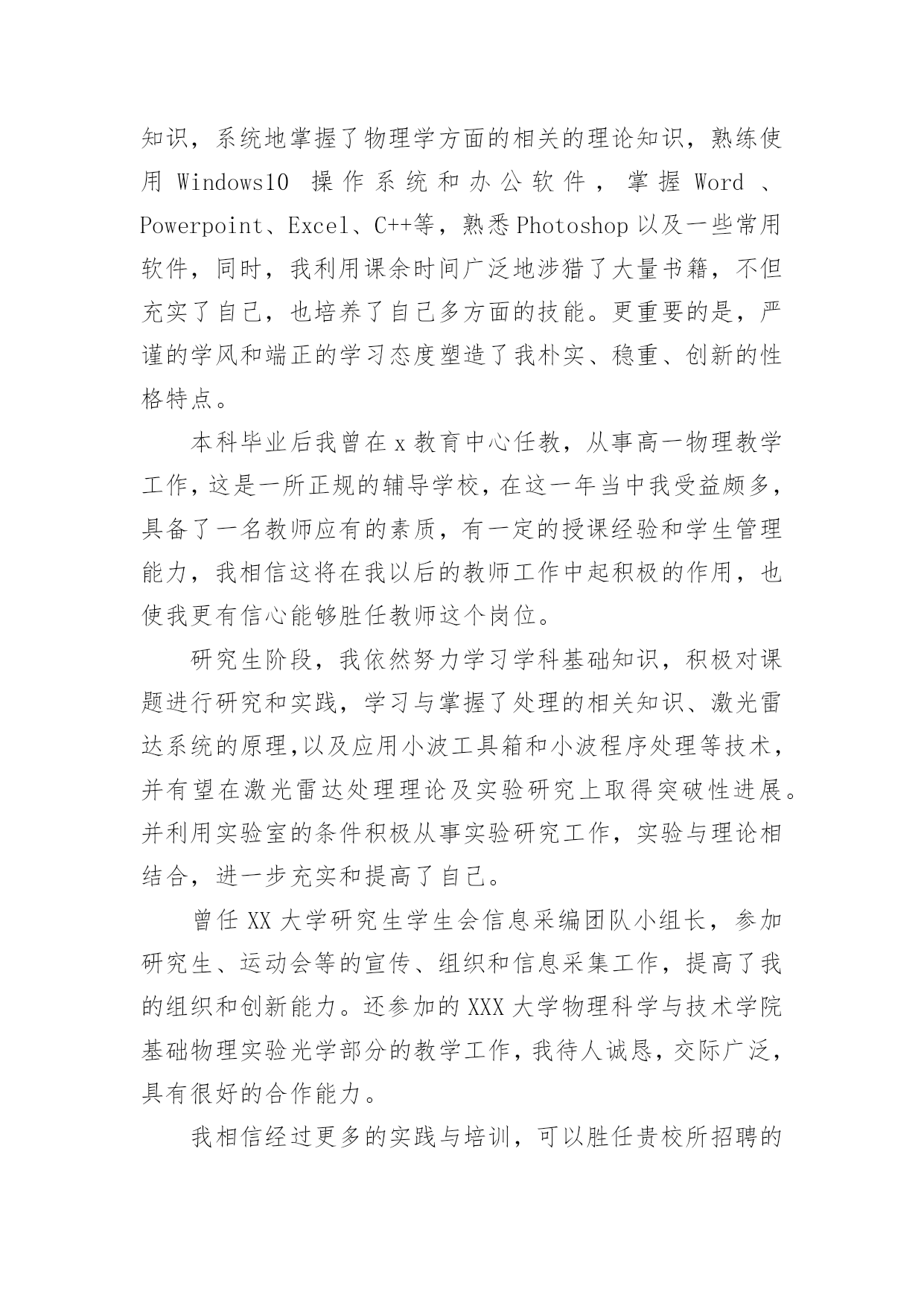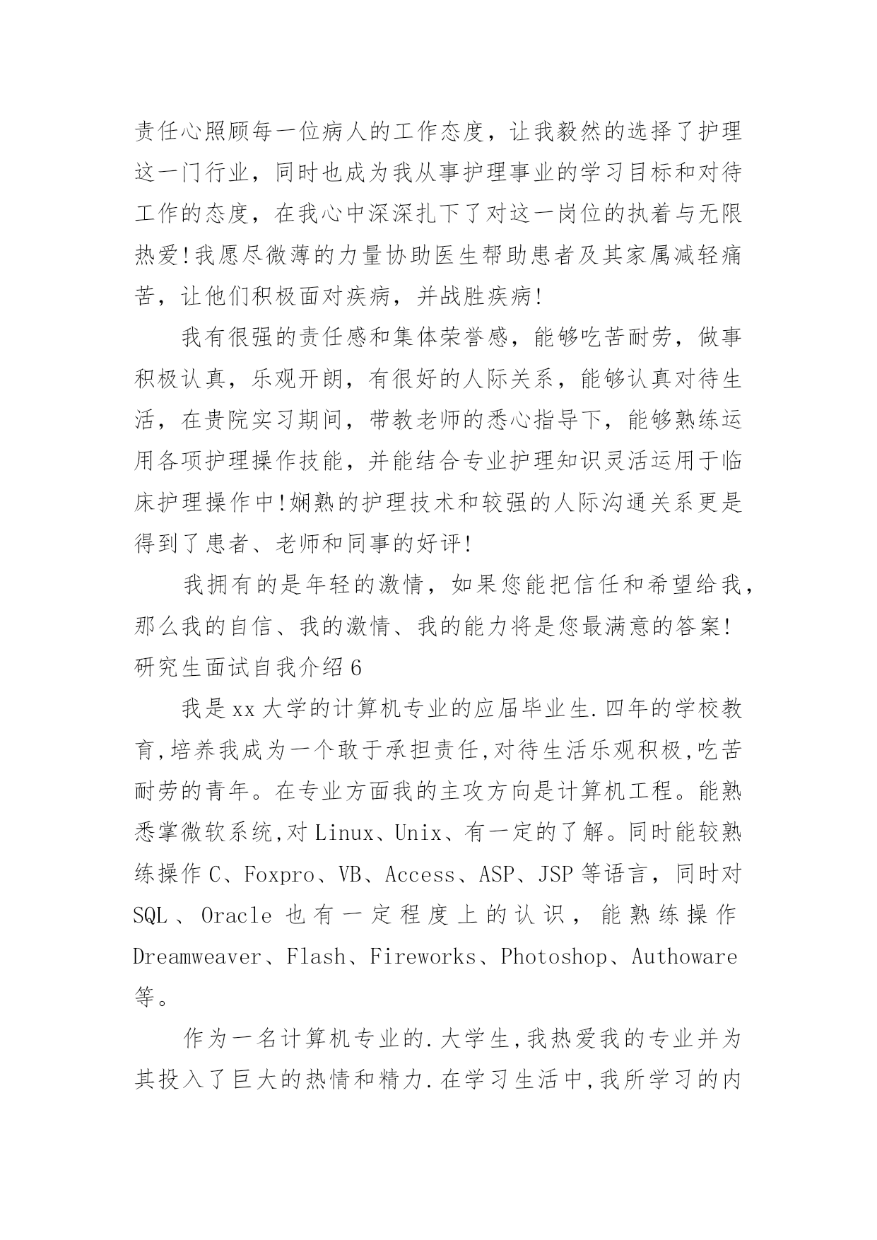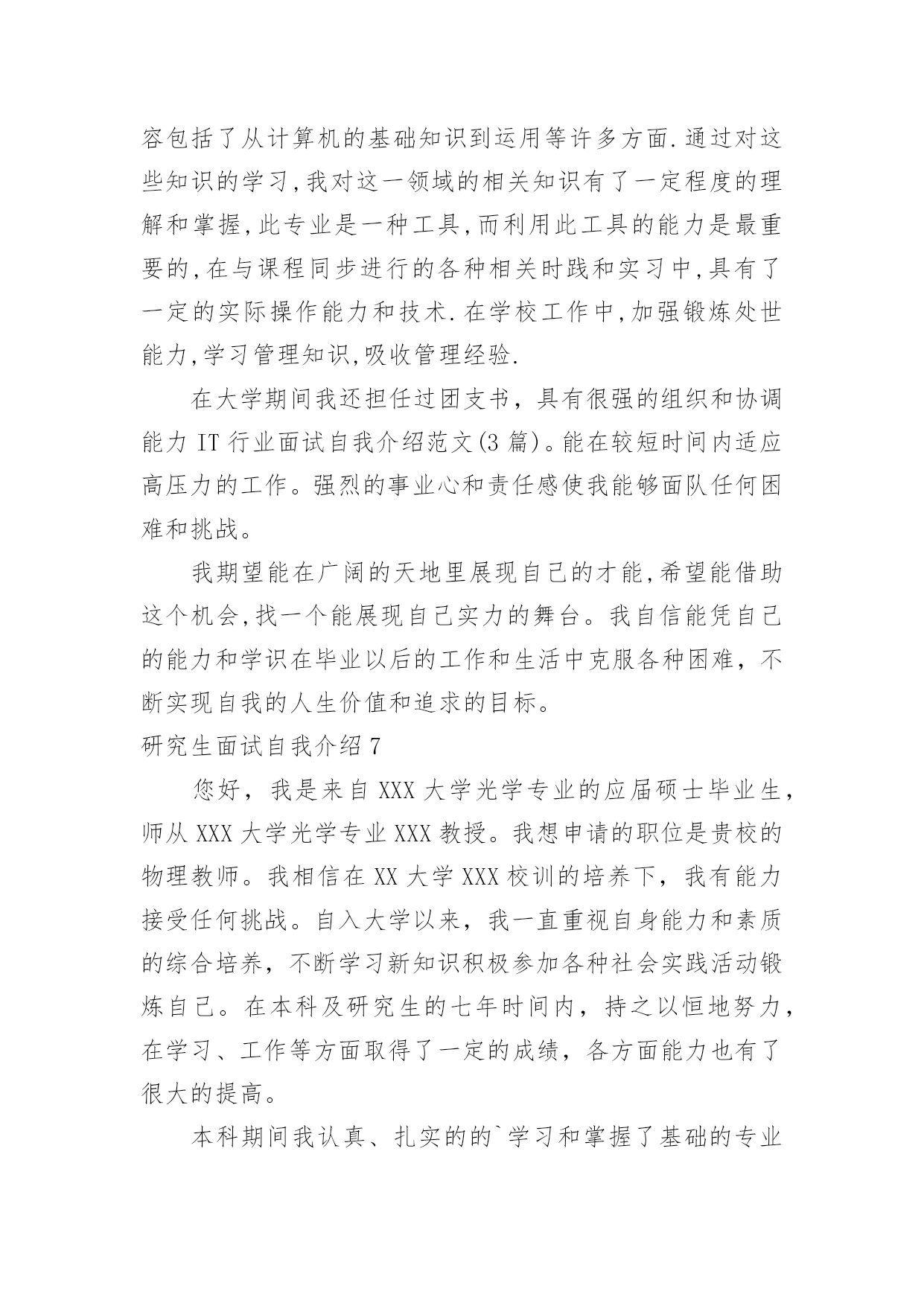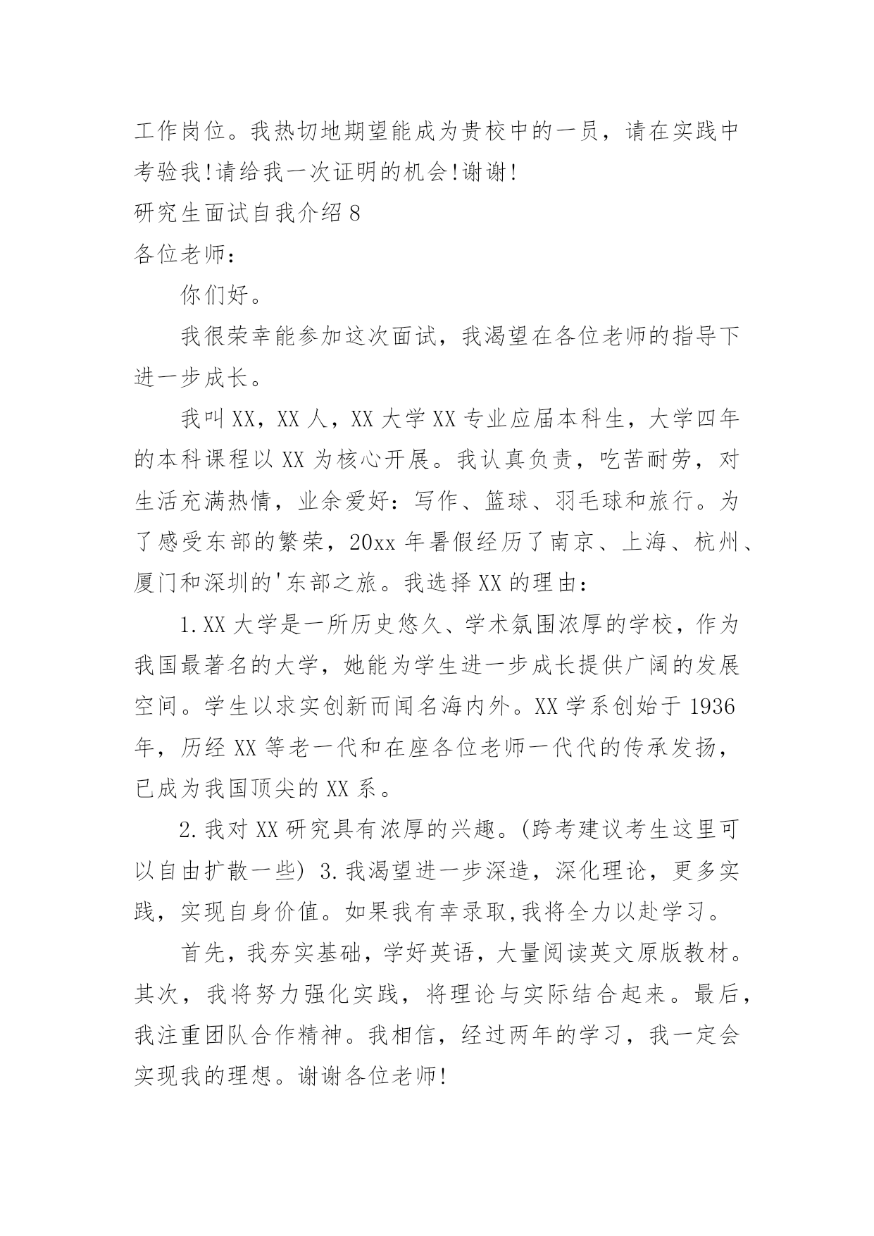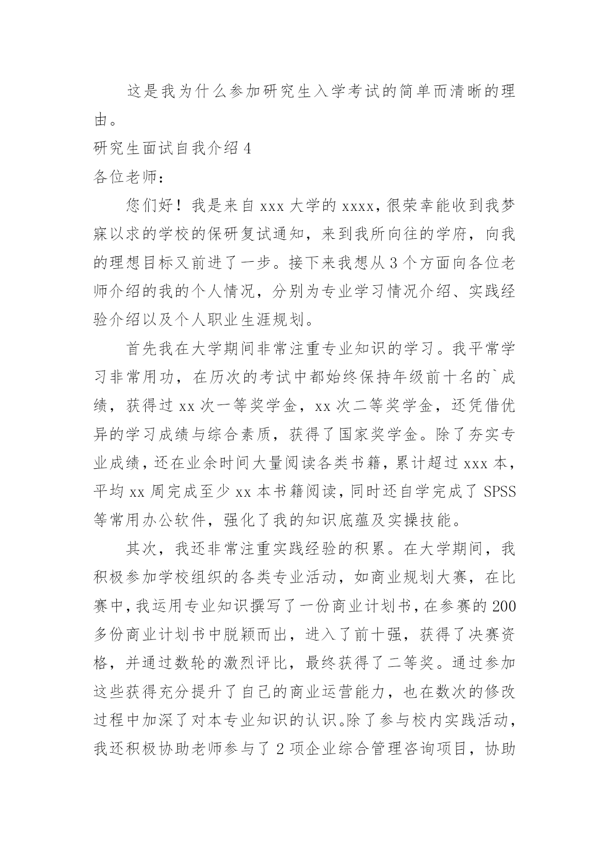 研究生面试自我介绍研究生面试自我介绍当碰到陌生人时候,我们有必要进行适当的自我介绍,自我介绍是我们重新认识自己的开始。那么我们该怎么去写自我介绍呢?以下是小编整理的研究生面试自我介绍,希望对大家有所帮助。研究生面试自我介绍1大家好,我是,来自于xxx学校,我的专业是工商管理。在大学的四年,我先后获得过xxx奖学金,校级优秀学生干部,xxx(国家、学校比赛)奖。今天我应聘的职位是xx市场类。我将主要从四个方面来以阐述:我的专业是工商管理,三年中,我主要做过的课业项目有:西安傣妹火锅店的市场满意度调查和选址分析;宜兴紫砂茶具进入英国市场的营销方案研究;陕西东岭工贸组织结构随织规模演变的'实证研究。通过理论知识的学习,利用假期及课余时间参加市场、销售方面的实习、兼职工作。XX年寒假,上海家化玉泽品牌助理实习;XX年寒假,陕西春雨文化教育有限工资咨询顾问实习以及西安海尔工贸有限公司海尔冰箱销售专员的兼职等。一直以来我对自己的要求是要想一个高速旋转的齿轮一样,所以我会提前对自己的时间做比较严密的规划,保证自己在学习之余,还可以有足够的时间享受娱乐。最后,我认为自己是个开朗、、努力上进,有责任心的女生,希望有机会和本公司结缘。研究生面试自我介绍2各位教授,下午好:很高兴有机会能参加这次面试和各位教授交流。首先,我简洁地介绍一下自己,我叫方文迪,今年26岁,来自河南商丘,20xx年毕业于河南理工大学机械与动力工程学院,所学的专业是工业设计,这一次,我想谈一下我四年的大学生活,让我学到了很多,很多的实践让我从从各个方面提高了自己,不但让我学会了如何思考,学习的方法,还让我看到了实践的重要性,作为一名学生,我深知学习机会的不易,我学习很努力,其中3年拿了学校的奖学金,我还积极地参加各种活动和设计大赛,曾在河南理工大学首届和第二届青少年科技文化节中分别荣获“摄影大赛优秀奖”和“节徽设计大赛二等奖”。在20xx年中的“张江杯”设计大赛中工业设计类中设计的笔记本电脑荣获优秀奖。在大学中我也遇到了好的老师和朋友,从他们身上我学到了很多东西,这对我能力的提高和成长起了很大的`作用。再次,我来介绍一下我的毕业之后的工作情况,我大致工作了两年的时间,第一年是在福建迪特工业设计公司,担任工业设计师,主要从事产品设计工作,曾在设计总监的带领下为参加多个设计项目—泉州佳乐集团开发的可视门铃设计和辉煌水暖08年的新产品开发设计。其中为辉煌水暖开发命名为龙的水龙头已投入生产并获得了好评。第二年是在福建文创太阳能有限公司工作,担任设计师,主要的工作为太阳能灯具和音响的产品设计,公司画册的设计;为公司的设计的多款太阳能灯具已投入生产,并受到了客户的好评,在工业设计小组共同努力下设计的太阳能音响已进入了产品的测试阶段,在公司的期间曾多次到车间深入了解材料工艺模具加工和产品生产过程,多次到广交会顺德工业设计博览会了解市场的产品信息。最后,我想谈一下,我考研的原因和研究的方向,我喜欢做设计,当看着自己的创意和产品得到别人认可的时候是一件无比兴奋的事情;还有就是两年的工作经验让我认识到我专业知识的局限,感觉在设计方面还有很多东西要学,自己的知识和能力还远远不够,特别是在经济快速发展的今天,更需要通过系统的复习来提高自己的能力,来化地实现自我价值,想通过3年的学习来对工业设计有个更加深入的了解,我很喜欢学校的感觉和体现出来的学习氛围,到处充满着青春活力,有很多的机会让你去实践和尝试,让人可以深入思考和进行学术的研究。如果我有机会在这所学校学习,我计划把自己的研究方向定为工业设计,因为我发现设计在社会的发展中发挥了越来越重要的作用,特别在国家由制造业大国转变为创新型国家的时候更是如此,虽然现在中国整个社会对设计的认可还不是很高,特别是在一些中小型企业中,但是纵观一些发达国家的发展过程,不难发现,工业设计将会在社会发展起到不可替代的作用。研究生面试自我介绍3大家早上好,很高兴来参加这次面试。首先,请允许我介绍一下自己。我的名字叫秦佳音。我出生于1981年4月23日。我是本地人。今年我将从吉林师范大学毕业。我的专业是汉语言文学,我希望我有机会在仰慕已久的吉林大学完成我硕士阶段的学习,我很自信因为我有这样的能力!我是一个热情,开朗,和有创造力的女孩。同时,我认为自己思维敏捷,做事谨慎。我期待着我的研究生学习和生活。不久我将证明你们选择我是最明智的决定。谢谢你给我这样一个宝贵的机会。参加研究生考试的原因:首先,我喜欢我的专业。汉语言文学是中国文学现代化开始的象征。这是我国人民思想现代化的重要一部分。更进一步的说,现代文学与我们的日常生活紧密相关,它将深深的`影响我们的社会模式和性质。我对大师们新颖或温和或深刻的风格非常着迷。但我不会轻易满足于这种肤浅的知识。我希望可以通过进一步学习,对现
