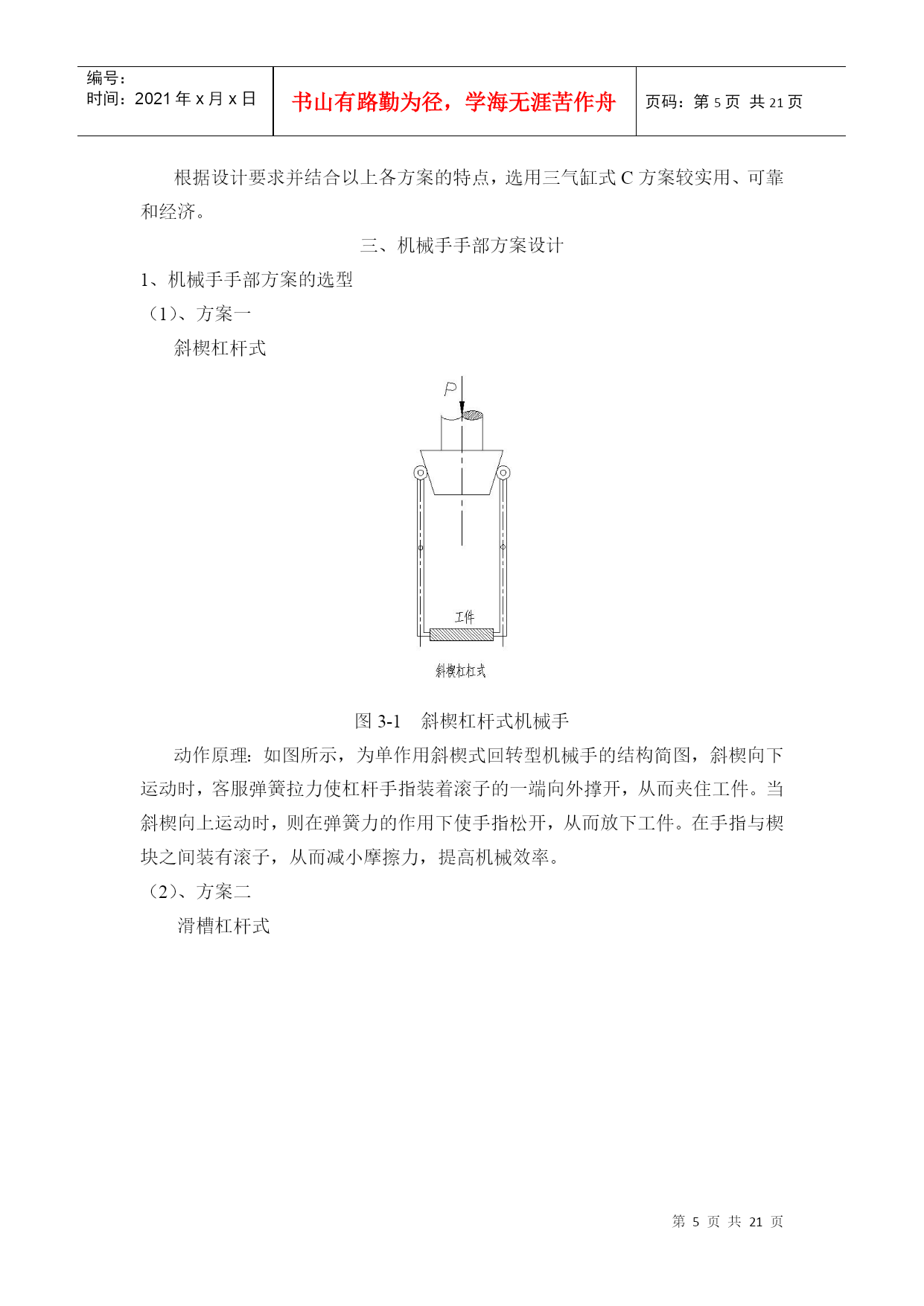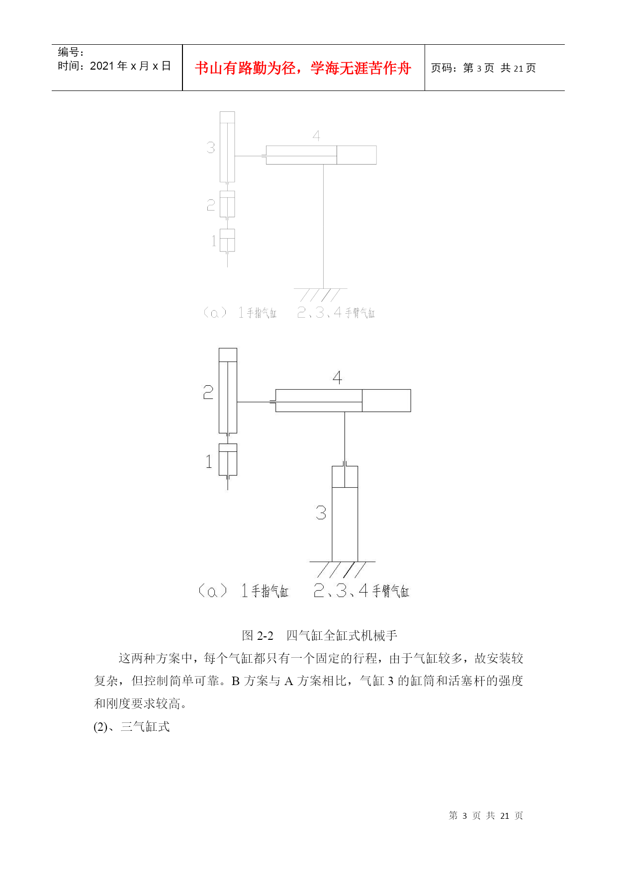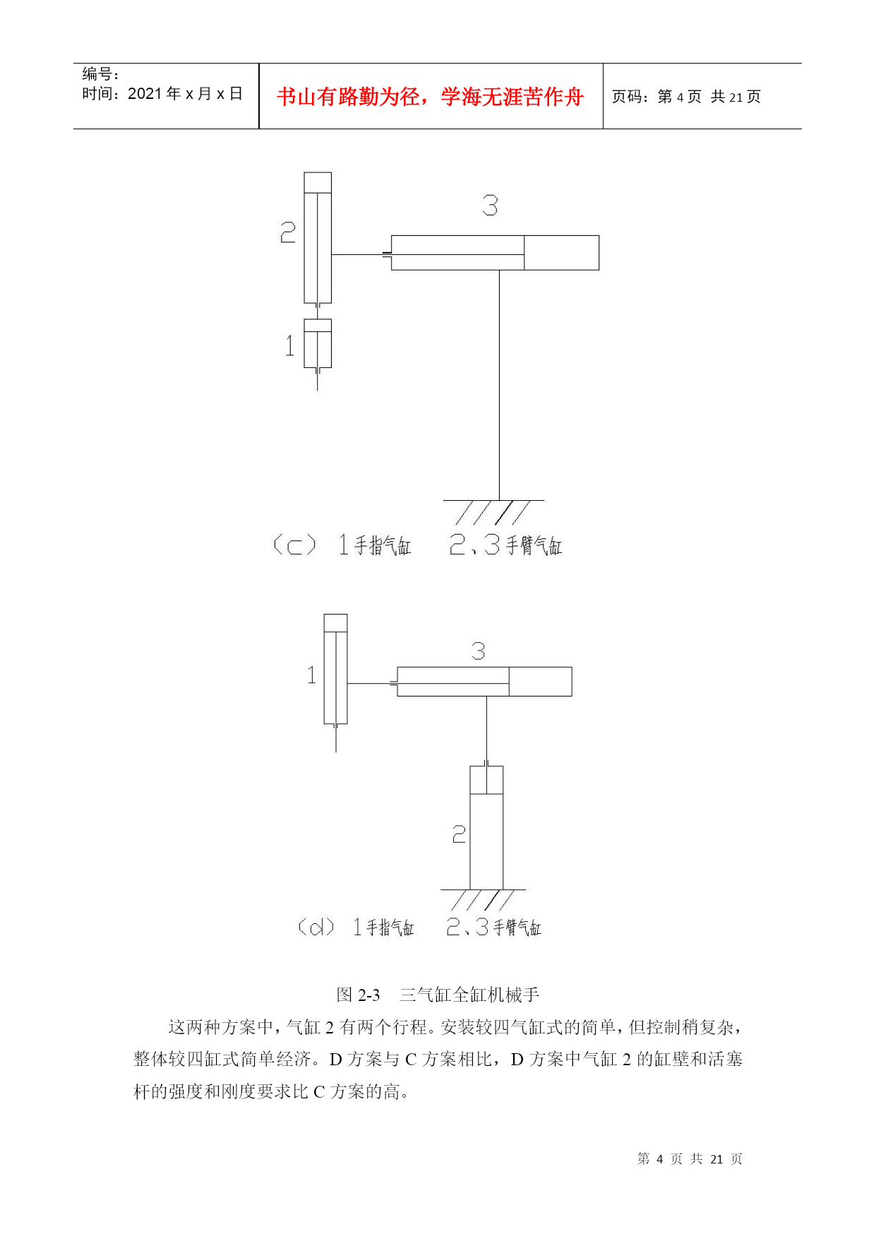 编号:时间:2021年x月x日书山有路勤为径,学海无涯苦作舟页码:第PAGE21页共NUMPAGES21页第PAGE\*MERGEFORMAT21页共NUMPAGES\*MERGEFORMAT21页第一章设计要求1、设计题目基于PLC的气动机械手设计,所实现的运动如下:材料形状尺寸提升高度平移下降尼龙圆柱体直径100*60mm80mm50mm10mm2、设计目的机电专业综合课程设计是一个重要的实际性教学环节。要求学生综合运用所学的机械、电子、计算机和自动化控制等方面的知识,独立进行设计训练。主要目的:(1)、学习机电一体化系统总评方案的拟定、分析与比较的方法。(2)、通过对机械、液压及气动的设计,掌握几种典型的传动元件与导向元件的原理、设计计算方法与选用原则。(3)、通过对控制系统的设计,掌握运用驱动元件的工作原理、参数计算、型号选用和控制方式。(4)、通过对控制系统的设计,掌握一些典型硬件电路的设计方法和控制软件的设计思路。(5)、锻炼提高学生应用手册和标准、查阅文献资料以及撰写科技论文、设计的能力。3、设计内容机械手实现的运动及所夹工件的参数如表1(单位:mm)。材料形状尺寸提升高度平移下降尼龙圆柱体805010设计任务(1)基于PLC的气动机械手设计整体装配图、气动系统原理图、PLC控制原理图和机械手首部原理装配图。(2)编写课程设计任务书。第二章机械手手臂方案设计由设计要求可知,此设计要实现的是对平面内两个固定位置的循环操作。能实现此要求的方案有:1、气缸连杆式图2-1气缸连杆式机械手该方案可通过对1、2、3、4气缸的控制实现对该平面内一定区域的任意操作。该方案由于构件较多,系统本身较重。适合运送较重的工件,且适合平面内多位置的连续操作。对于平面内简单的两位置固定循环操作和夹持搬运轻型工件此方案不够经济。2、气缸式全气缸式实现此设计要求有两大方案:一种是四气缸式,另一种是三气缸式。(1)、四气缸式按安装方式的不同,又有两种形式(见图2-2)图2-2四气缸全缸式机械手这两种方案中,每个气缸都只有一个固定的行程,由于气缸较多,故安装较复杂,但控制简单可靠。B方案与A方案相比,气缸3的缸筒和活塞杆的强度和刚度要求较高。(2)、三气缸式图2-3三气缸全缸机械手这两种方案中,气缸2有两个行程。安装较四气缸式的简单,但控制稍复杂,整体较四缸式简单经济。D方案与C方案相比,D方案中气缸2的缸壁和活塞杆的强度和刚度要求比C方案的高。根据设计要求并结合以上各方案的特点,选用三气缸式C方案较实用、可靠和经济。三、机械手手部方案设计1、机械手手部方案的选型(1)、方案一斜楔杠杆式图3-1斜楔杠杆式机械手动作原理:如图所示,为单作用斜楔式回转型机械手的结构简图,斜楔向下运动时,客服弹簧拉力使杠杆手指装着滚子的一端向外撑开,从而夹住工件。当斜楔向上运动时,则在弹簧力的作用下使手指松开,从而放下工件。在手指与楔块之间装有滚子,从而减小摩擦力,提高机械效率。(2)、方案二滑槽杠杆式图3-2滑槽杠杆式机械手动作原理:如图所示,为滑槽杠杆式杠杆双支点回转型手部的简图。杠杆形手指4的一端装有V型指5,另一端则开有长槽。驱动杆1上的圆柱销2套在滑槽内,当驱动连杆同圆柱销一起作往复运动时即可拨动两个手指各绕支点(绞销3)作相对回转运动。从而实现手指的夹紧与松开动作。滑槽杠杆式传动机构的定心精度与滑槽的制造精度有关,因活动环节较多,配合间隙的影响不可忽视。此机构依靠驱动力锁紧,机构本身无自锁性能。(3)、方案三连杆杠杆式图3-3连杆杠杆式机械手动作原理:如图所示,为双支点式回转型连杆杠杆式手部的简图。驱动杆2末端与连杆4由绞销3绞接,当驱动杆作直线往复运动时,则通过连杆推动两杠杆手指,使其各绕支点作回转运动,从而使手指夹紧或松开。(4)、方案四齿条齿轮杠杆式图3-4齿轮齿条杠杆式机械手动作原理里:如图所示,为齿条齿轮杠杆式手部结构简图。由齿条直接传动给齿轮杠杆结构,驱动杆2末端制成双面齿条,与扇形齿轮4相啮合,而扇形齿轮4与手指5相固连在一起,可绕支点回转,驱动力推动齿条作直线往复运动,即可带动扇形齿轮回转,从而实现手指的加紧与松开。比较上述四种方案,斜楔杠杆式的松开方式主要靠弹簧,由于楔块容易磨损和弹簧也容易失效,所以斜楔杠杆式并不够理想;滑槽杠杆式在工作过程中绞销与槽壁相对滑动,磨损较大,难以保证运动精度,因此对槽壁的强度、刚度和尺寸要求都较大,此方案也不够理想;对于方案四,由于结构复杂,且齿轮齿条的造价较高,故从经济上讲不够理想;方案三,结构简单,易于更换零部件,承载能力较大,且只有绞接处有磨损,其他地方几
