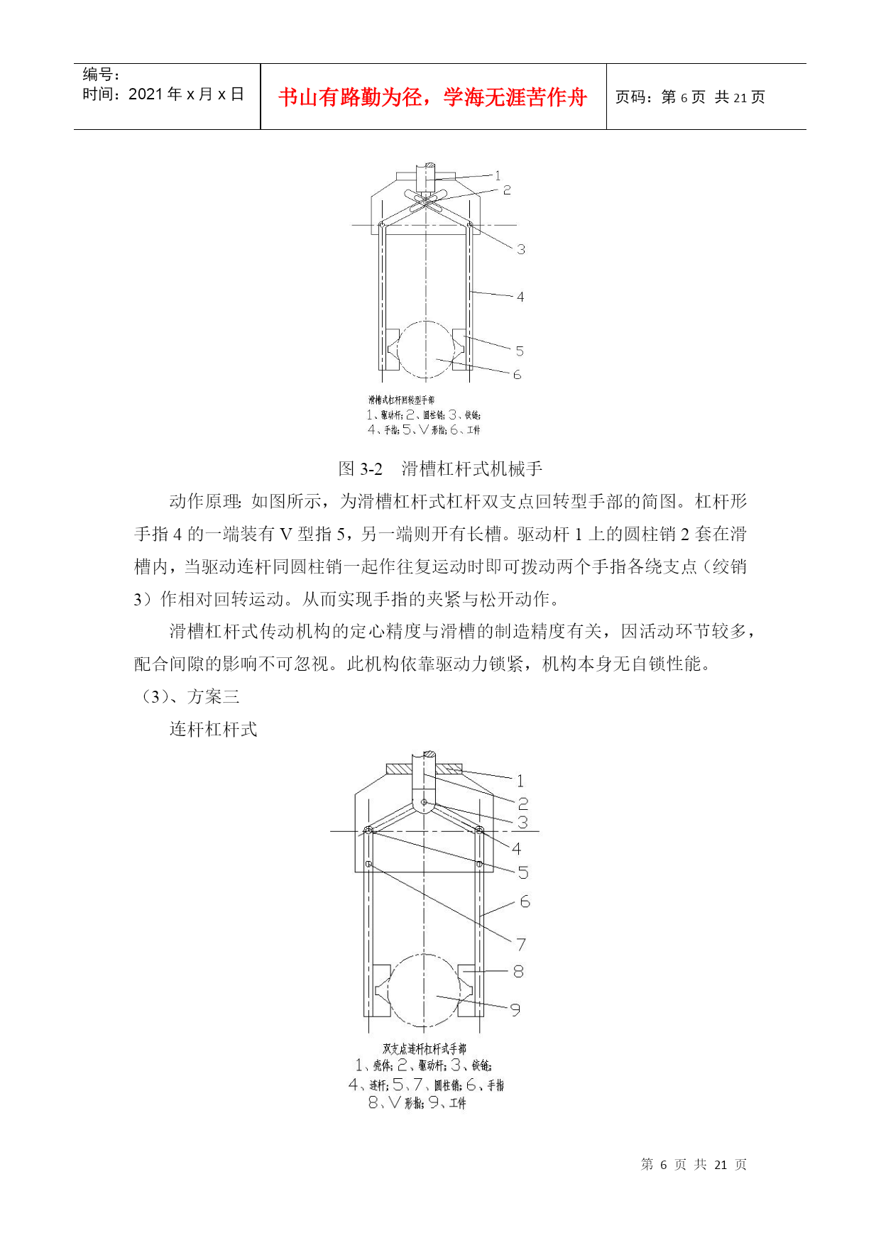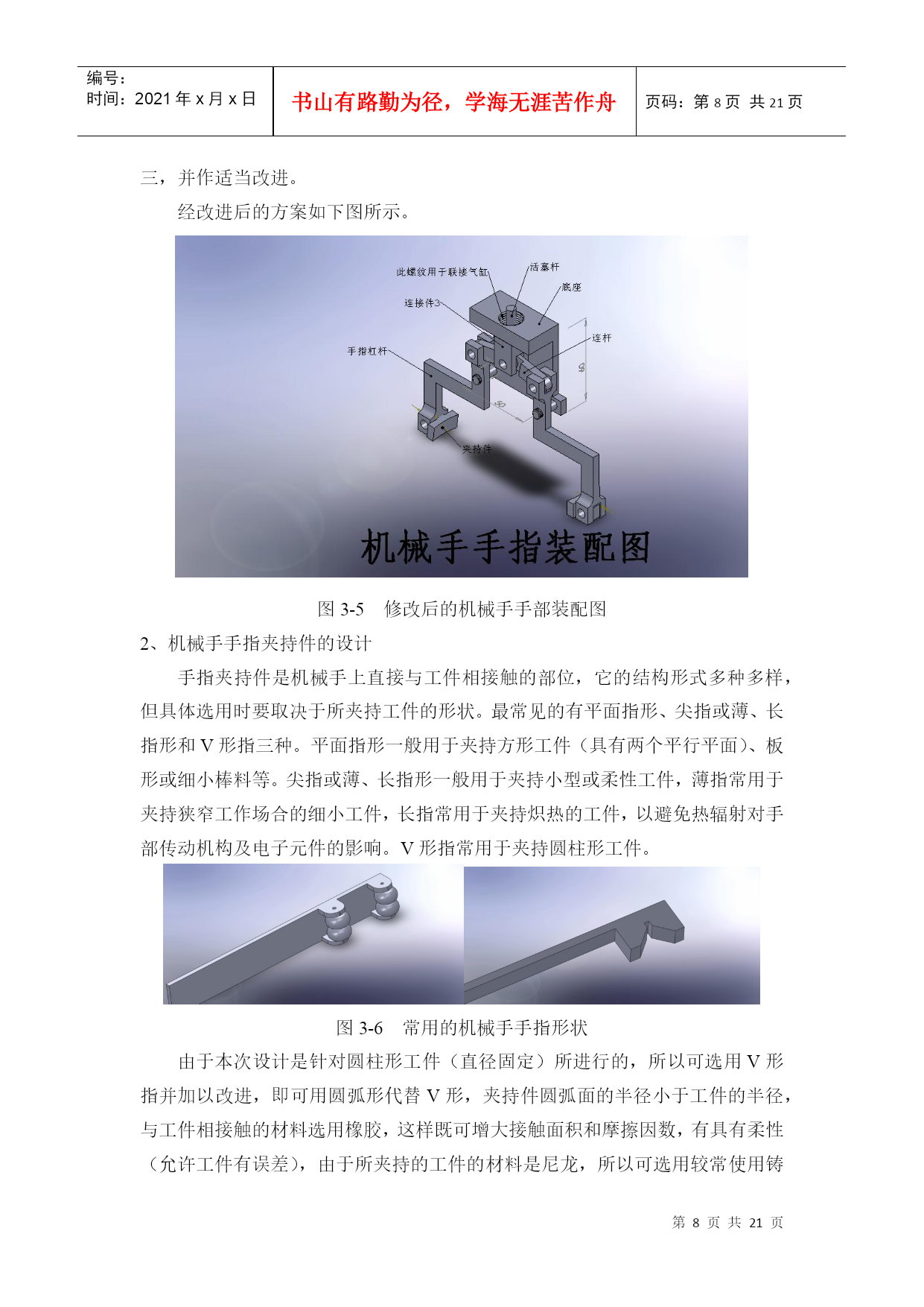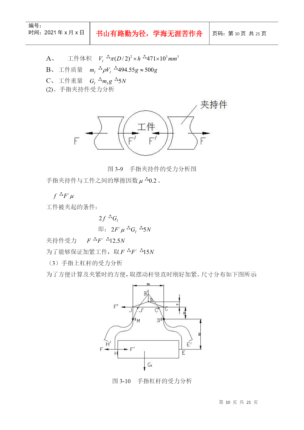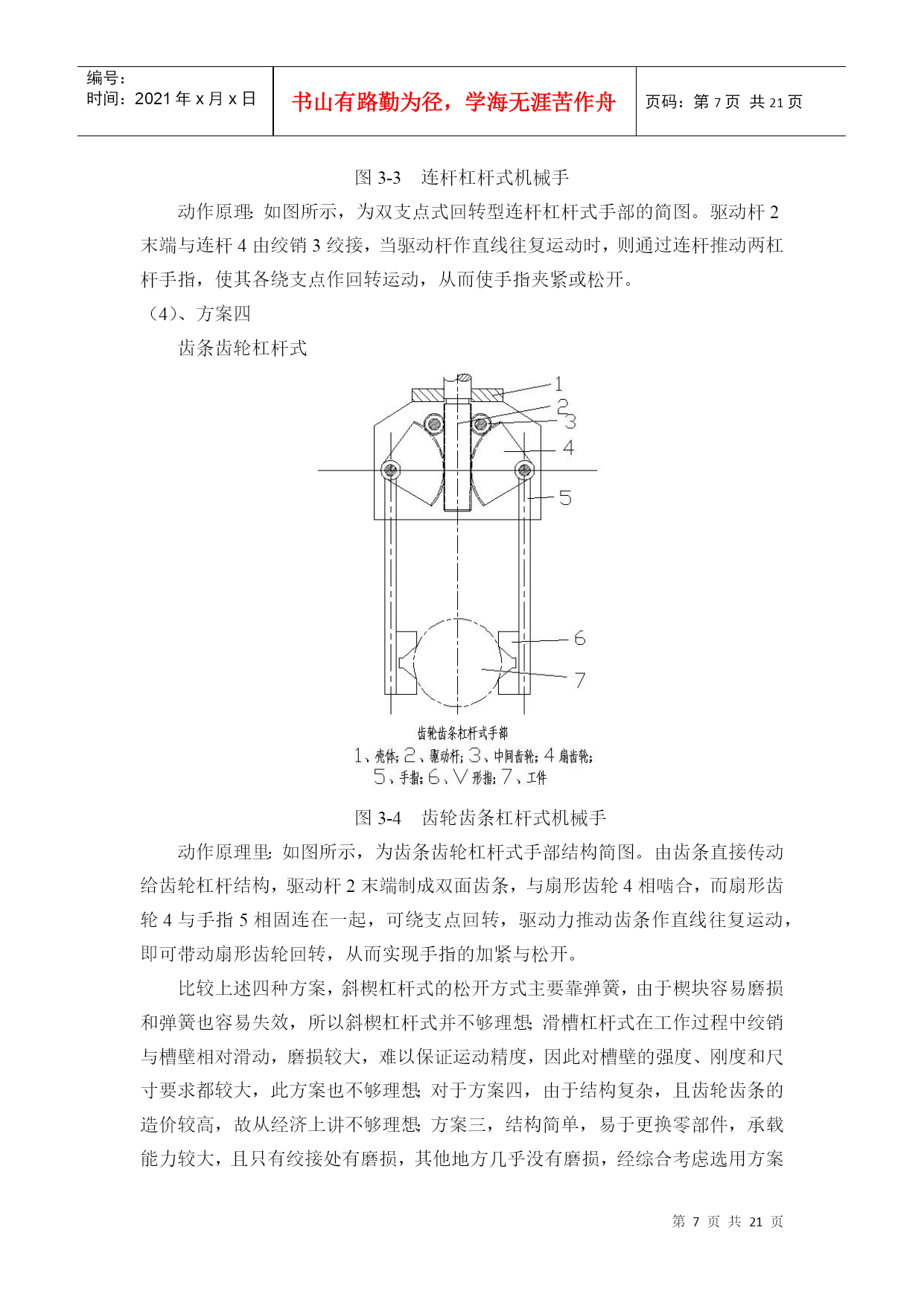 编号:时间:2021年x月x日书山有路勤为径,学海无涯苦作舟页码:第PAGE21页共NUMPAGES21页第PAGE\*MERGEFORMAT21页共NUMPAGES\*MERGEFORMAT21页第一章设计要求1、设计题目基于PLC的气动机械手设计,所实现的运动如下:材料形状尺寸提升高度平移下降尼龙圆柱体直径100*60mm80mm50mm10mm2、设计目的机电专业综合课程设计是一个重要的实际性教学环节。要求学生综合运用所学的机械、电子、计算机和自动化控制等方面的知识,独立进行设计训练。主要目的:(1)、学习机电一体化系统总评方案的拟定、分析与比较的方法。(2)、通过对机械、液压及气动的设计,掌握几种典型的传动元件与导向元件的原理、设计计算方法与选用原则。(3)、通过对控制系统的设计,掌握运用驱动元件的工作原理、参数计算、型号选用和控制方式。(4)、通过对控制系统的设计,掌握一些典型硬件电路的设计方法和控制软件的设计思路。(5)、锻炼提高学生应用手册和标准、查阅文献资料以及撰写科技论文、设计的能力。3、设计内容机械手实现的运动及所夹工件的参数如表1(单位:mm)。材料形状尺寸提升高度平移下降尼龙圆柱体805010设计任务(1)基于PLC的气动机械手设计整体装配图、气动系统原理图、PLC控制原理图和机械手首部原理装配图。(2)编写课程设计任务书。第二章机械手手臂方案设计由设计要求可知,此设计要实现的是对平面内两个固定位置的循环操作。能实现此要求的方案有:1、气缸连杆式图2-1气缸连杆式机械手该方案可通过对1、2、3、4气缸的控制实现对该平面内一定区域的任意操作。该方案由于构件较多,系统本身较重。适合运送较重的工件,且适合平面内多位置的连续操作。对于平面内简单的两位置固定循环操作和夹持搬运轻型工件此方案不够经济。2、气缸式全气缸式实现此设计要求有两大方案:一种是四气缸式,另一种是三气缸式。(1)、四气缸式按安装方式的不同,又有两种形式(见图2-2)图2-2四气缸全缸式机械手这两种方案中,每个气缸都只有一个固定的行程,由于气缸较多,故安装较复杂,但控制简单可靠。B方案与A方案相比,气缸3的缸筒和活塞杆的强度和刚度要求较高。(2)、三气缸式图2-3三气缸全缸机械手这两种方案中,气缸2有两个行程。安装较四气缸式的简单,但控制稍复杂,整体较四缸式简单经济。D方案与C方案相比,D方案中气缸2的缸壁和活塞杆的强度和刚度要求比C方案的高。根据设计要求并结合以上各方案的特点,选用三气缸式C方案较实用、可靠和经济。三、机械手手部方案设计1、机械手手部方案的选型(1)、方案一斜楔杠杆式图3-1斜楔杠杆式机械手动作原理:如图所示,为单作用斜楔式回转型机械手的结构简图,斜楔向下运动时,客服弹簧拉力使杠杆手指装着滚子的一端向外撑开,从而夹住工件。当斜楔向上运动时,则在弹簧力的作用下使手指松开,从而放下工件。在手指与楔块之间装有滚子,从而减小摩擦力,提高机械效率。(2)、方案二滑槽杠杆式图3-2滑槽杠杆式机械手动作原理:如图所示,为滑槽杠杆式杠杆双支点回转型手部的简图。杠杆形手指4的一端装有V型指5,另一端则开有长槽。驱动杆1上的圆柱销2套在滑槽内,当驱动连杆同圆柱销一起作往复运动时即可拨动两个手指各绕支点(绞销3)作相对回转运动。从而实现手指的夹紧与松开动作。滑槽杠杆式传动机构的定心精度与滑槽的制造精度有关,因活动环节较多,配合间隙的影响不可忽视。此机构依靠驱动力锁紧,机构本身无自锁性能。(3)、方案三连杆杠杆式图3-3连杆杠杆式机械手动作原理:如图所示,为双支点式回转型连杆杠杆式手部的简图。驱动杆2末端与连杆4由绞销3绞接,当驱动杆作直线往复运动时,则通过连杆推动两杠杆手指,使其各绕支点作回转运动,从而使手指夹紧或松开。(4)、方案四齿条齿轮杠杆式图3-4齿轮齿条杠杆式机械手动作原理里:如图所示,为齿条齿轮杠杆式手部结构简图。由齿条直接传动给齿轮杠杆结构,驱动杆2末端制成双面齿条,与扇形齿轮4相啮合,而扇形齿轮4与手指5相固连在一起,可绕支点回转,驱动力推动齿条作直线往复运动,即可带动扇形齿轮回转,从而实现手指的加紧与松开。比较上述四种方案,斜楔杠杆式的松开方式主要靠弹簧,由于楔块容易磨损和弹簧也容易失效,所以斜楔杠杆式并不够理想;滑槽杠杆式在工作过程中绞销与槽壁相对滑动,磨损较大,难以保证运动精度,因此对槽壁的强度、刚度和尺寸要求都较大,此方案也不够理想;对于方案四,由于结构复杂,且齿轮齿条的造价较高,故从经济上讲不够理想;方案三,结构简单,易于更换零部件,承载能力较大,且只有绞接处有磨损,其他地方几