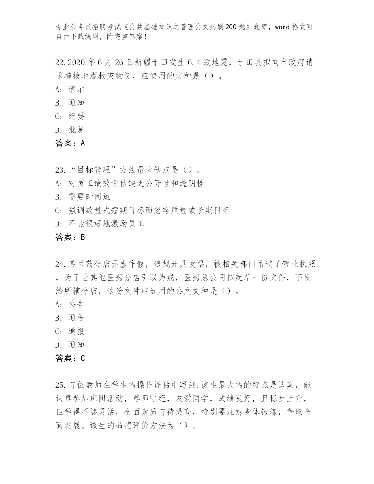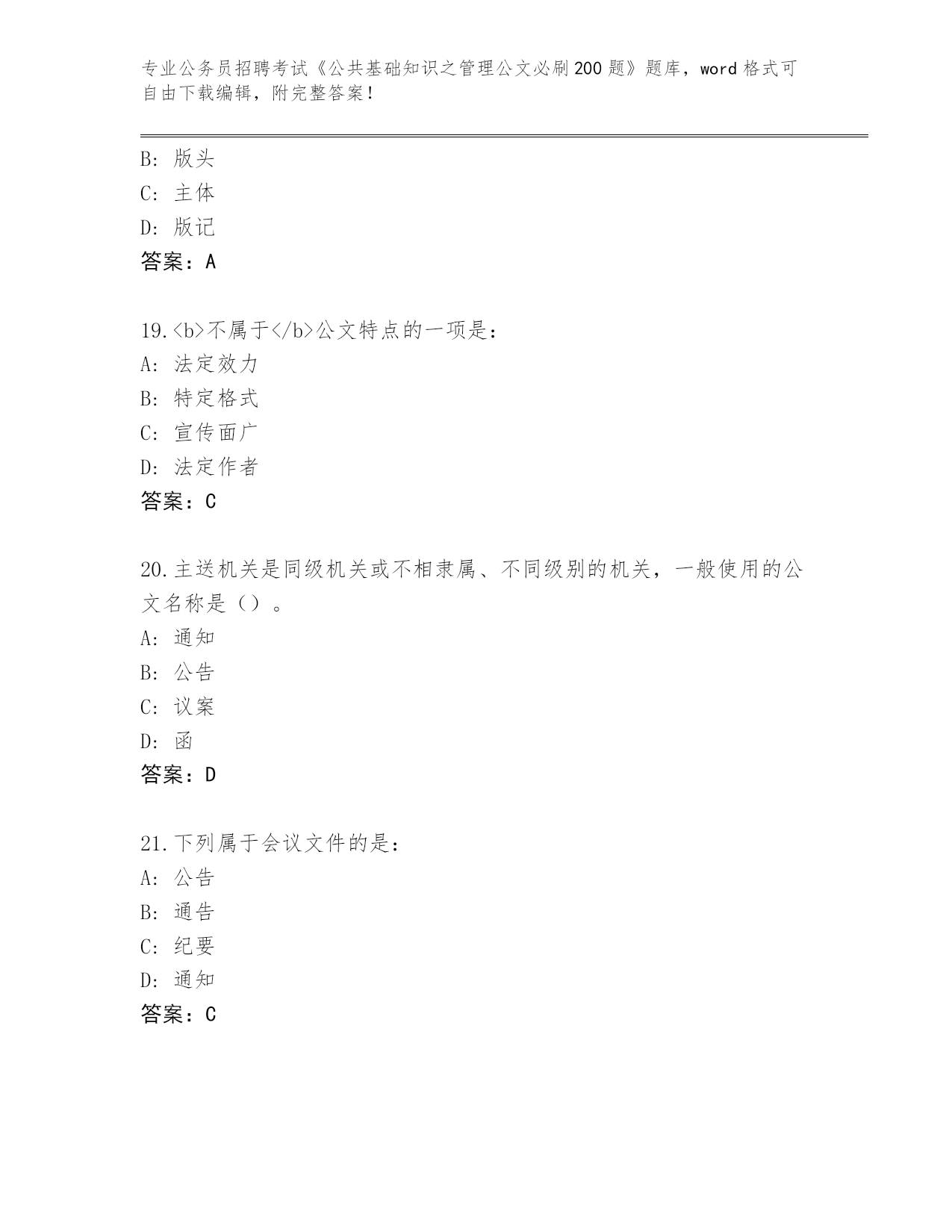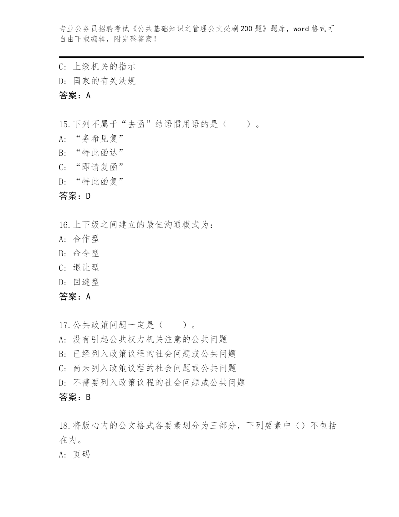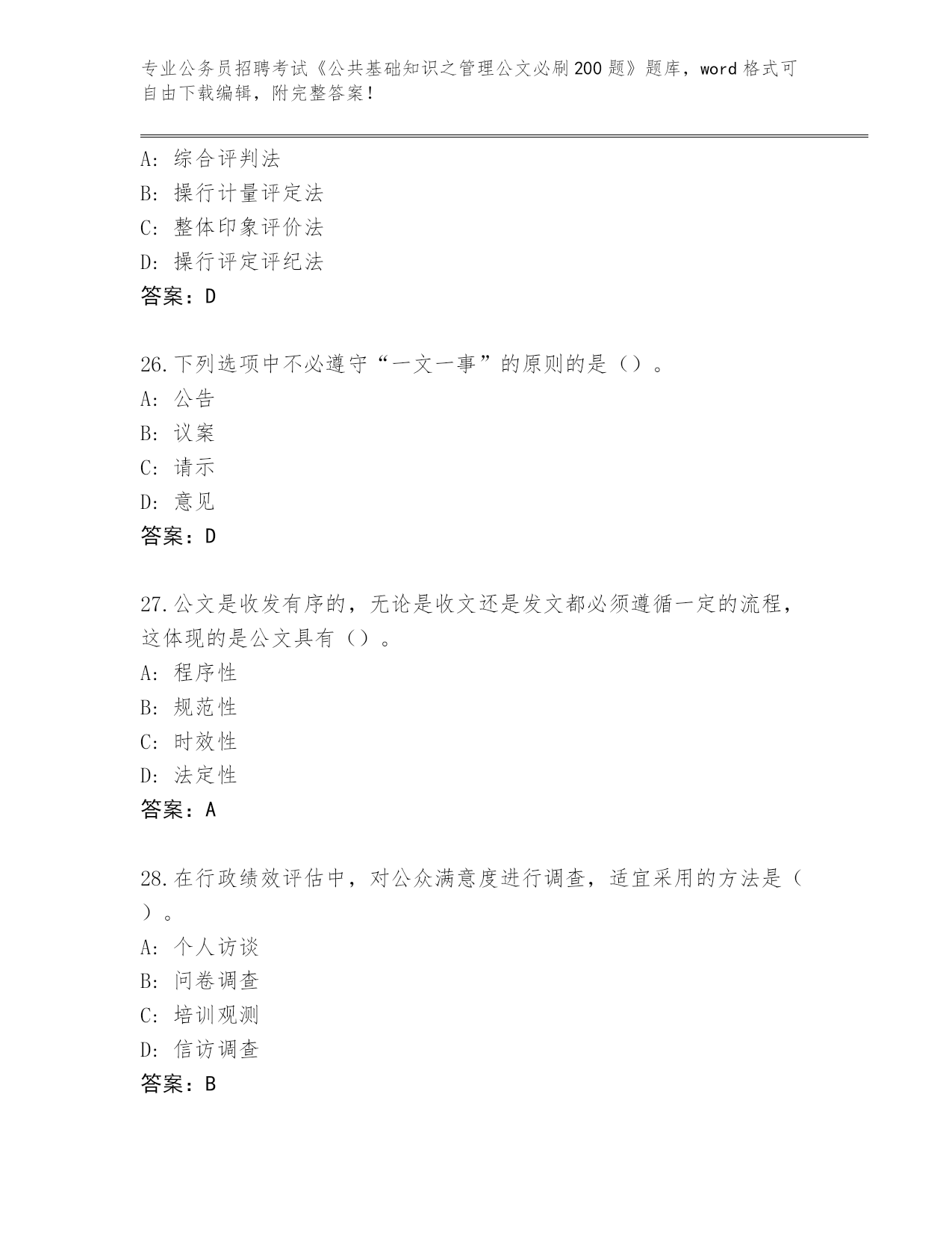 贵州省晴隆县整理公务员招聘考试《公共基础知识之管理公文必刷200题》内部题库及答案()
