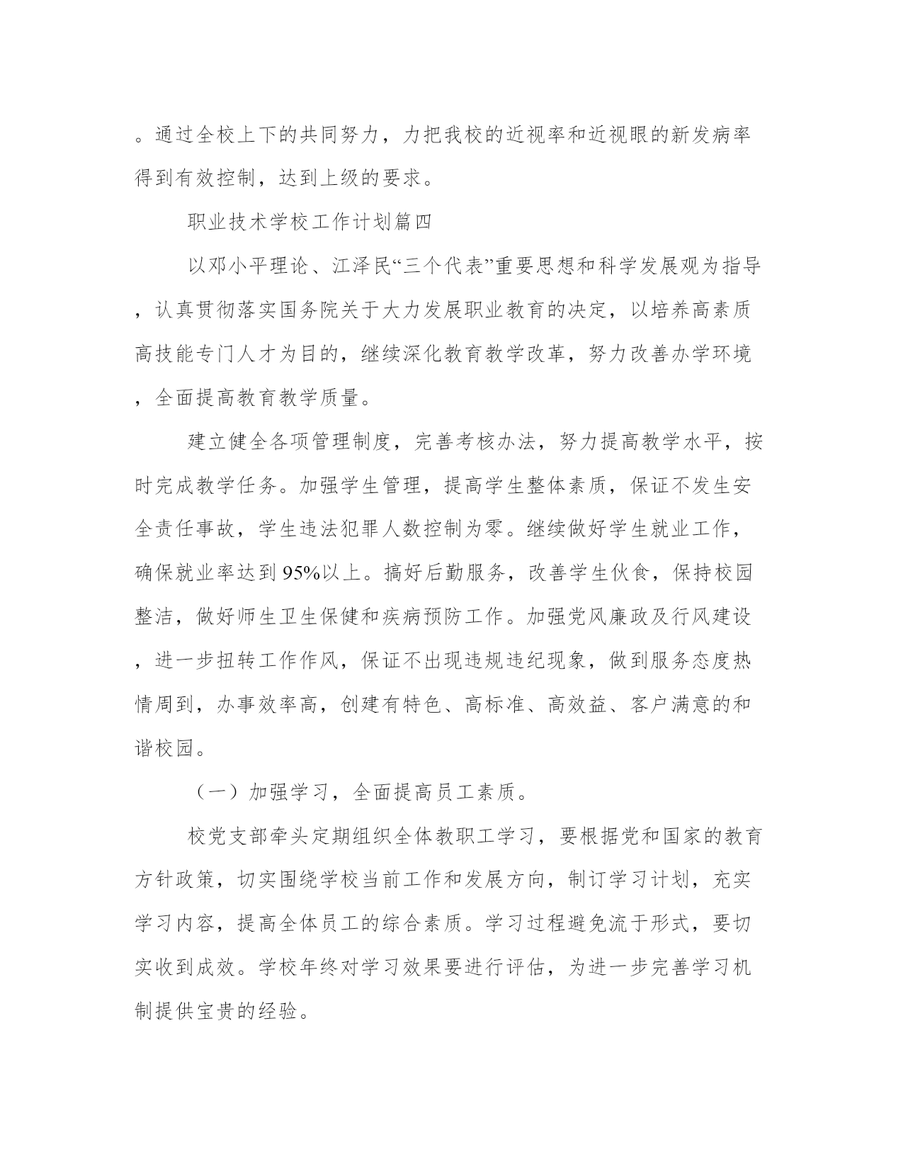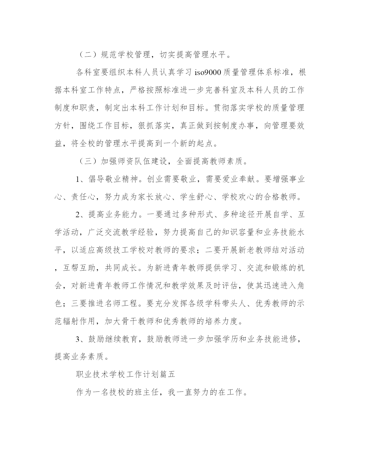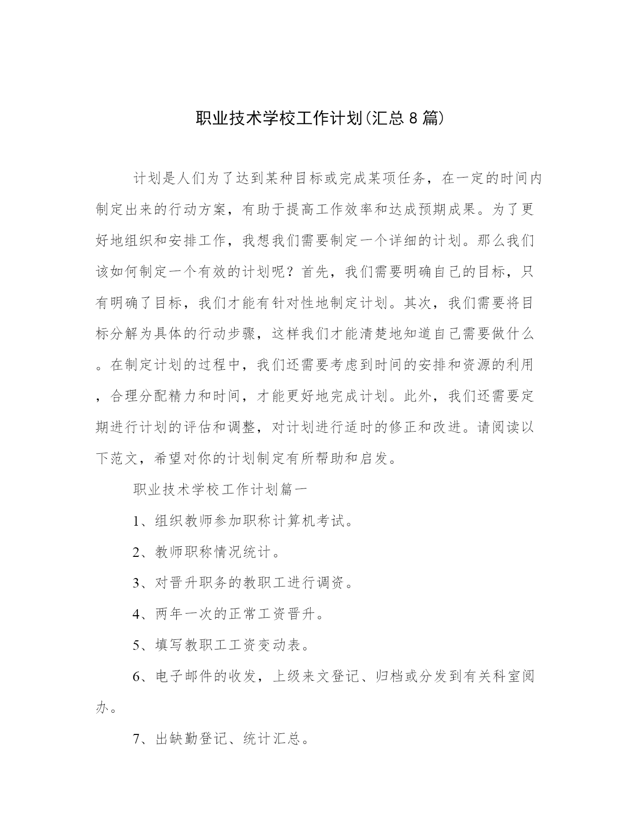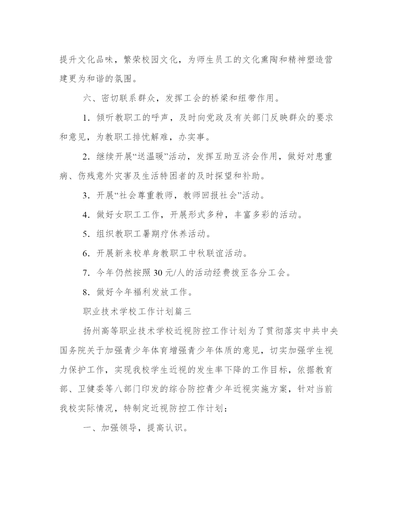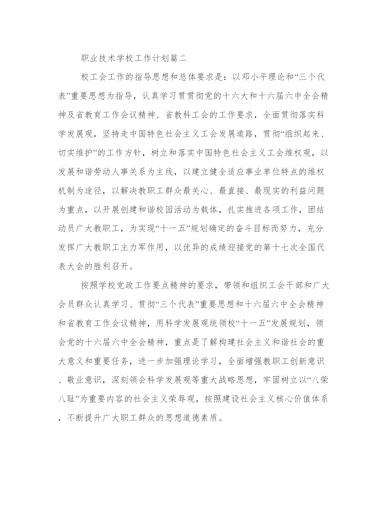 职业技术学校工作计划(汇总8篇)计划是人们为了达到某种目标或完成某项任务,在一定的时间内制定出来的行动方案,有助于提高工作效率和达成预期成果。为了更好地组织和安排工作,我想我们需要制定一个详细的计划。那么我们该如何制定一个有效的计划呢?首先,我们需要明确自己的目标,只有明确了目标,我们才能有针对性地制定计划。其次,我们需要将目标分解为具体的行动步骤,这样我们才能清楚地知道自己需要做什么。在制定计划的过程中,我们还需要考虑到时间的安排和资源的利用,合理分配精力和时间,才能更好地完成计划。此外,我们还需要定期进行计划的评估和调整,对计划进行适时的修正和改进。请阅读以下范文,希望对你的计划制定有所帮助和启发。职业技术学校工作计划篇一1、组织教师参加职称计算机考试。2、教师职称情况统计。3、对晋升职务的教职工进行调资。4、两年一次的正常工资晋升。5、填写教职工工资变动表。6、电子邮件的收发,上级来文登记、归档或分发到有关科室阅办。7、出缺勤登记、统计汇总。职业技术学校工作计划篇二校工会工作的指导思想和总体要求是:以邓小平理论和“三个代表”重要思想为指导,认真学习贯贯彻党的十六大和十六届六中全会精神及省教育工作会议精神、省教科工会的工作要求,全面贯彻落实科学发展观,坚持走中国特色社会主义工会发展道路,贯彻“组织起来、切实维护”的工作方针,树立和落实中国特色社会主义工会维权观,以发展和谐劳动人事关系为主线,以建立健全适应事业单位特点的维权机制为途径,以解决教职工群众最关心、最直接、最现实的利益问题为重点,以开展创建和谐校园活动为载体,扎实推进各项工作,团结动员广大教职工,为实现“十一五”规划确定的奋斗目标而努力,充分发挥广大教职工主力军作用,以优异的成绩迎接党的第十七次全国代表大会的胜利召开。按照学校党政工作要点精神的要求,带领和组织工会干部和广大会员群众认真学习、贯彻“三个代表”重要思想和十六届六中全会精神和省教育工作会议精神,用科学发展观统领校“十一五”发展规划,领会党的十六届六中全会精神,重点是了解构建社会主义和谐社会的重大意义和重要任务,进一步加强理论学习,全面增强教职工创新意识、敬业意识,深刻领会科学发展观等重大战略思想,牢固树立以“八荣八耻”为重要内容的社会主义荣辱观,按照建设社会主义核心价值体系,不断提升广大职工群众的思想道德素质。二、进一步加强民主政治建设,完善教代会制度,切实保障教职工的民主权利。认真学习贯彻全总关于加强协调劳动关系,切实维护教职工合法权益,推进构成社会主义和谐社会的决定精神,进一步加强维权机制建设是工会推进构建社会主义和谐社会的重要切入点,劳动关系的.和谐是社会和谐的重要基础和具体体现。发展和谐劳动关系,解决好广大教职工群众最关心、最直接、最现实的利益问题,是和谐社会建设的重要内容。要进一步树立中国特色社会主义工会维权观,加大维权工作力度,确保广大教职工享有广泛而充分的民主权利,积极落实教职工的知情权、参与权、表达权和监督权。1.按照党委要求认真做好第五届教职工代表大会暨第十届工会会员代表大会换届改选的各项筹备工作。2.在继续做好教代会的常年提案工作的同时,认真做好征集会议期间提案的工作,并要做到条条有回音,件件有着落。3.积极推进并进一步健全和完善院系二级教代会制度,认真落实教代会条例,通过专题会议、培训班、研讨会、推进会等多种形式,全面提高院系二级教代会质量。三、加强学习,提高素质,进一步提高工会工作整体水平。1.加强工会自身建设,提高工作能力,是做好新形势下工会工作的重要保证和前提。认真贯彻省总关于今年为工会建设年的要求,要以加强基层建设为重点,以改革创新的精神,努力把工会建设成为学习型、服务型、创新型的群众组织,更好地为教职工服务。2.以深化建设院系“教工之家”活动为载体,加强院系工会建设,建立和完善“会员评家”机制。全面推进院系工会群众化、民主化、规范化建设,增强吸引力和凝聚力,努力把院系工会建设成为组织健全、维权到位、工作活跃、作用明显、教工信赖的“教工之家”。3.结合学校机构调整,人员变动及今年校教代会、工代会改选的工作安排,在今年上半年各分工会按照工会法程序进行分工会的改选。同时开展评选工会先进集体和工会积极分子。四、围绕中心,服务大局,努力建功“十一五”1.继续深入开展“争创学习型组织、争当创新人才、树新时期教职工形象”主题活动。2.开展创“文明新风”家庭活动,推进建立和谐校园、和谐家庭工作的落实。3.深入开展“育人为本、热爱学生”、“以人为本、诚信育人”等多种形式的“爱生”活动,大力宣传劳模先进事迹,倡导尊重学习先进、争当先进的良好风尚,推进师德水平的提高。五、加强教职工各文体协会活动的开展,活跃校园文化氛围。结合新校区的特点积
