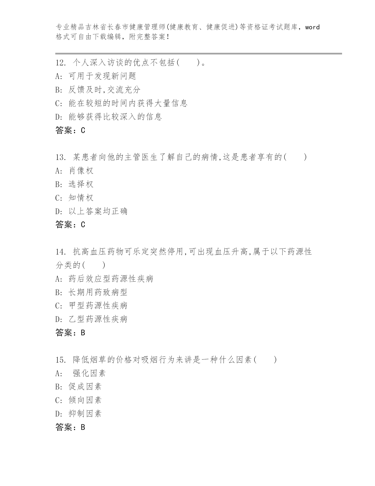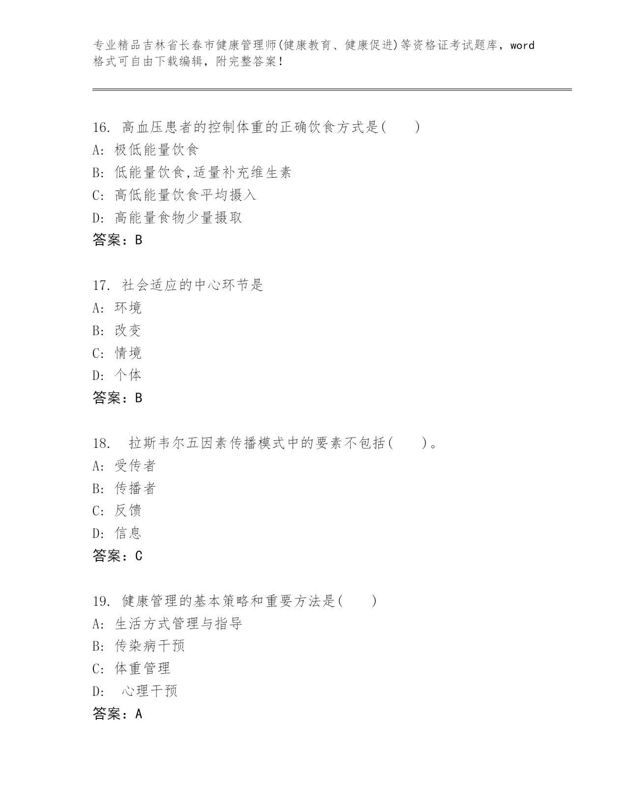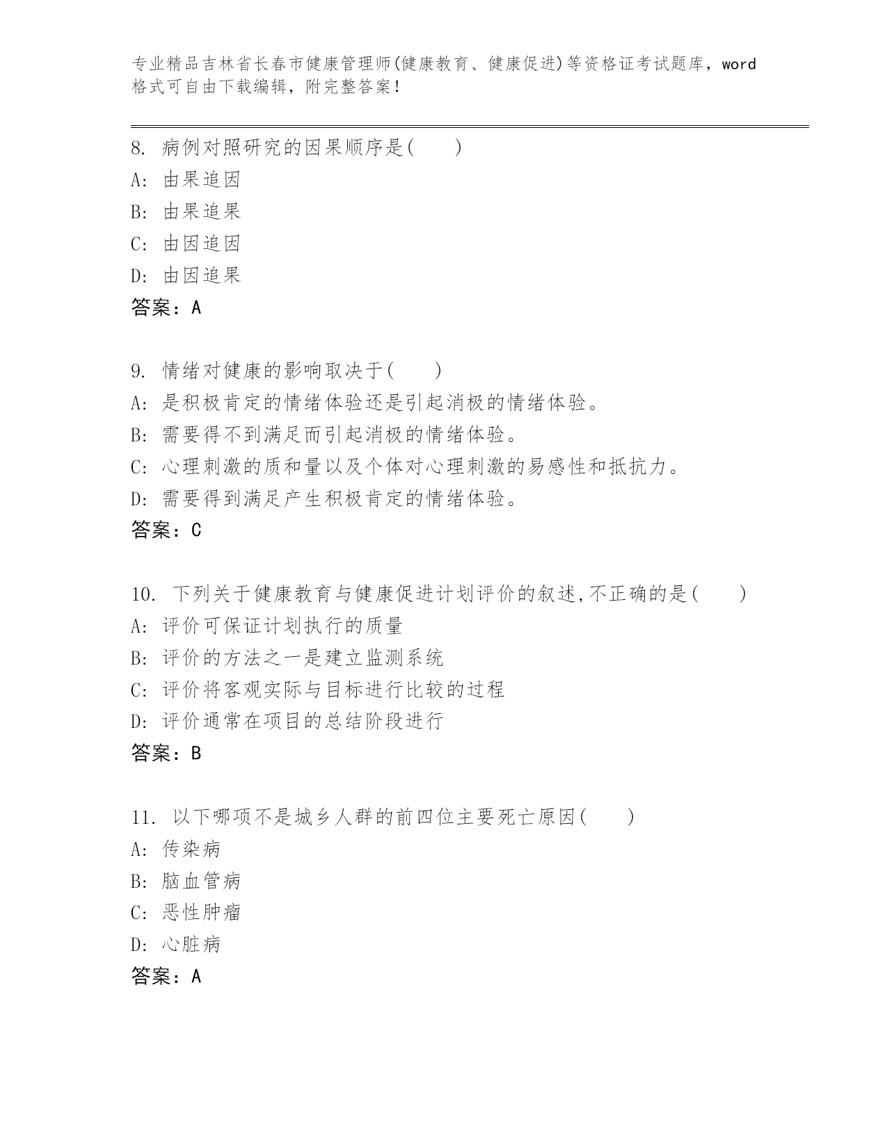 优选吉林省长春市健康管理师(健康教育、健康促进)等资格证考试通用题库及答案【精品】