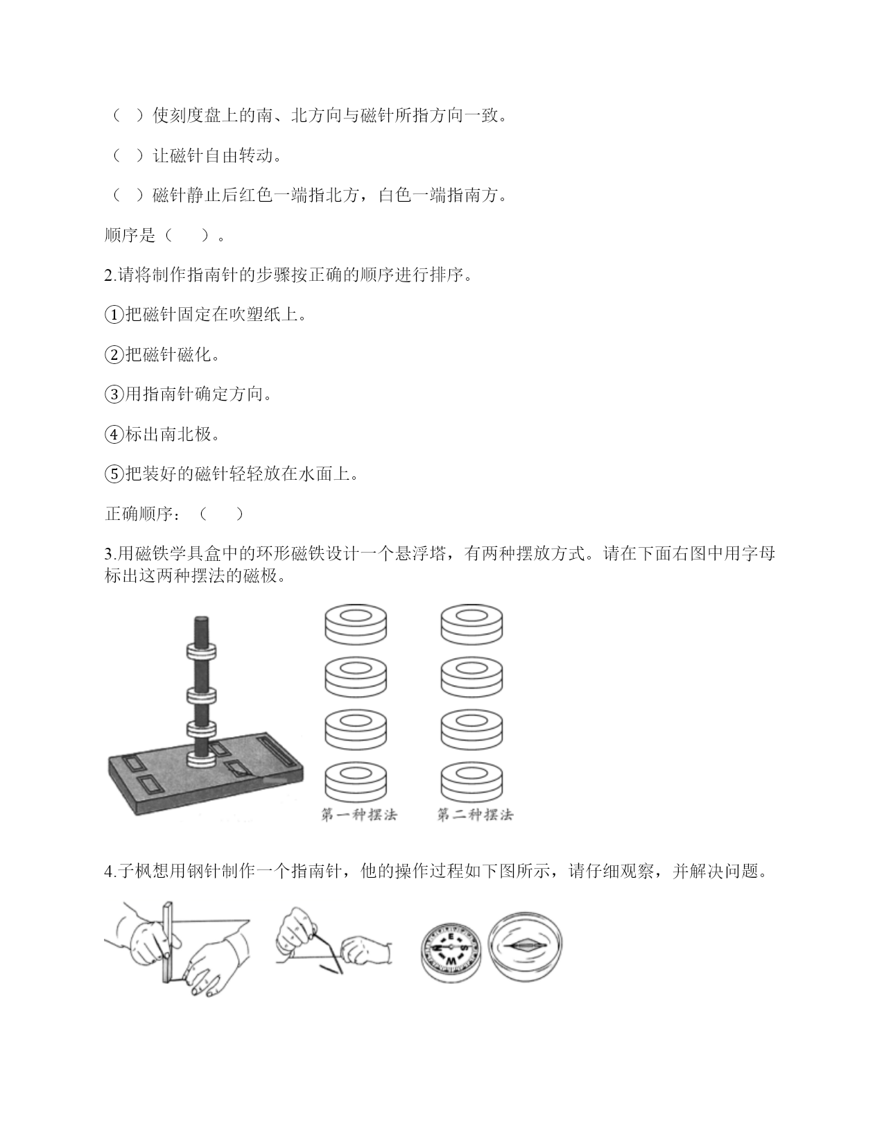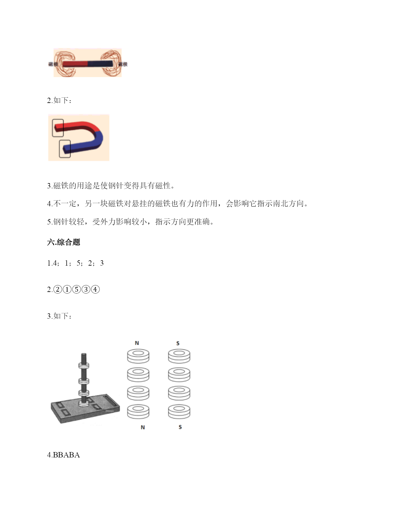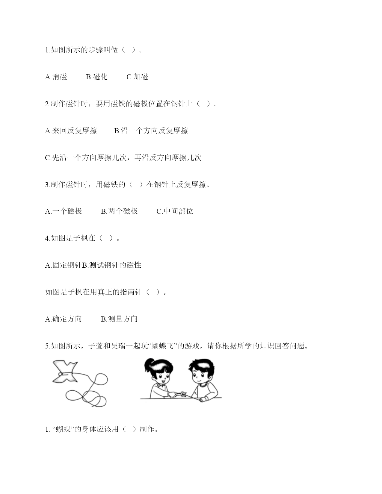 小学科学《磁铁》练习题一.选择题(共6题,共12分)1.磁铁能吸引下面的()A.回形针B.玻璃杯C.铝锅2.指南针是利用磁铁什么性质制成的?()A.磁铁能指示南北方向的特点B.隔空吸物的特点C.吸铁的特点3.磁铁上()的磁力最强。A.中间B.磁极C.外边D.里边4.()中的物品不都是制作水浮式指南针时所需要的材料。A.磁铁、指南针B.碗、A4纸C.钢针、水5.把一块条形磁铁悬挂在空中使它能自由转动等磁铁静止时我们发现——磁极的两端分别指向()。A.东、西B.东、南C.南、北D.东、北6.磁铁的磁极有()个,指南的叫南极,用字母()表示;指北的磁极叫北极,用字母()表示。A.1SNB.1NSC.2SN二.填空题(共6题,共36分)1.指南针的四种放置方法分别是()、()、()和()。2.()和()中也有磁铁,它们的作用是振动发声。3.()和()中有许多极其微小的“磁铁”,可以记录很多信息。4.()是我国古代四大发明之一。九百多年前,我国海船已使用()导航。5.磁铁能指示()方向,指南的磁极叫()极,用字母()表示;指北的磁极叫(),用字母()表示。6.我们在借助“曲别针感受条形磁铁不同部位的磁力大小”实验时,我们感受到的现象是曲别针在磁铁()时受到了更大的吸力,远离()吸力也来越小,在()的位置几乎没有感觉到吸力。三.判断题(共6题,共12分)1.磁铁都是天然形成的。()2.条形磁铁有两个极。()3.磁铁各个部分的磁性强弱相同。()4.磁铁不能隔着A4纸吸引回形针。()5.大磁铁有两个磁极,小磁铁只有一个磁极。()6.磁铁只能吸引铁和含铁的物体。()四.连线题(共1题,共4分)1.请将生活中的物品与对应的磁铁的作用连线。记录信息指示方向固定物体磁悬浮五.简答题(共5题,共25分)1.铁粉在条形磁铁上是怎样分布的?画一画,并标出磁极。2.在蹄形磁铁上用“○”标出磁极。3.在制作水浮式指南针时,我们会用到一块磁铁,请问磁铁的用途是什么?4.在悬挂的条形磁铁旁边再放上一块条形磁铁,悬挂着的条形磁铁还会指示南北吗?为什么?5.制作水浮式指南针时,我们用被磁化的钢针指示南北的。我们是因为钢针具有怎样的特点才选择它的?六.综合题(共5题,共31分)1.请将下列步骤排序。()转动指南针。()把指南针放平。()使刻度盘上的南、北方向与磁针所指方向一致。()让磁针自由转动。()磁针静止后红色一端指北方,白色一端指南方。顺序是()。2.请将制作指南针的步骤按正确的顺序进行排序。①把磁针固定在吹塑纸上。②把磁针磁化。③用指南针确定方向。④标出南北极。⑤把装好的磁针轻轻放在水面上。正确顺序:()3.用磁铁学具盒中的环形磁铁设计一个悬浮塔,有两种摆放方式。请在下面右图中用字母标出这两种摆法的磁极。4.子枫想用钢针制作一个指南针,他的操作过程如下图所示,请仔细观察,并解决问题。1.如图所示的步骤叫做()。A.消磁B.磁化C.加磁2.制作磁针时,要用磁铁的磁极位置在钢针上()。A.来回反复摩擦B.沿一个方向反复摩擦C.先沿一个方向摩擦几次,再沿反方向摩擦几次3.制作磁针时,用磁铁的()在钢针上反复摩擦。A.一个磁极B.两个磁极C.中间部位4.如图是子枫在()。A.固定钢针B.测试钢针的磁性如图是子枫在用真正的指南针()。A.确定方向B.测量方向5.如图所示,子萓和昊瑞一起玩“蝴蝶飞”的游戏,请你根据所学的知识回答问题。1.“蝴蝶”的身体应该用()制作。A.毛线B.回形针C.塑料笔帽2.“蝴蝶”能飞起来,是因为受到了()。A.拉力B.磁力C.推力3.如果在“蝴蝶”和磁铁中间放上(),“蝴蝶”就不能飞起来了。A.B.C.4.如果用条形磁铁的另一端靠近“蝴蝶”,蝴蝶()飞起来。A.能B.不能参考答案一.选择题1.A2.A3.B4.B5.C6.C二.填空题1.碗唇旋定法;指甲旋定法;悬挂法;水浮法2.耳机;扬声器3.磁条卡;磁带4.指南针;指南针5.南北;南;S;北;N6.两端;两端;中间三.判断题1.×2.√3.×4.×5.×6.×四.连线题1.如下:五.简答题1.如下:2.如下:3.磁铁的用途是使钢针变得具有磁性。4.不一定,另一块磁铁对悬挂的磁铁也有力的作用,会影响它指示南北方向。5.钢针较轻,受外力影响较小,指示方向更准确。六.综合题1.4;1;5;2;32.②①⑤③④3.如下:4.BBABA5.BBCA
