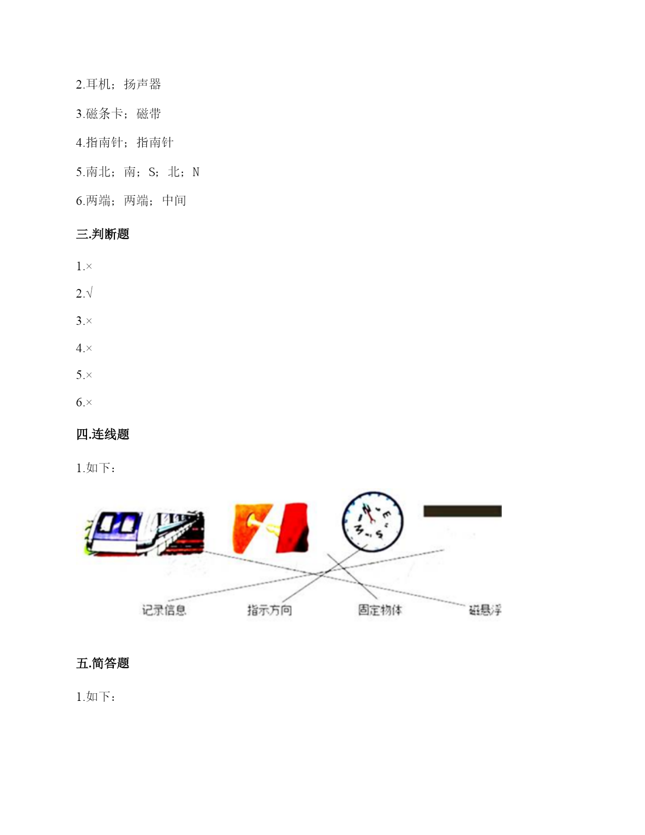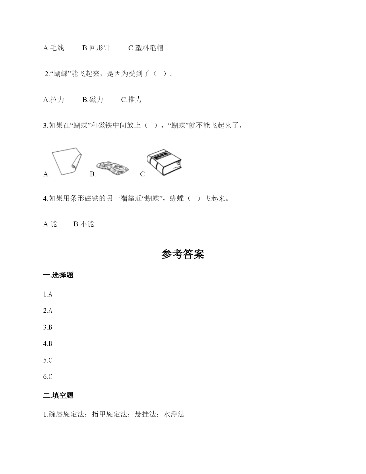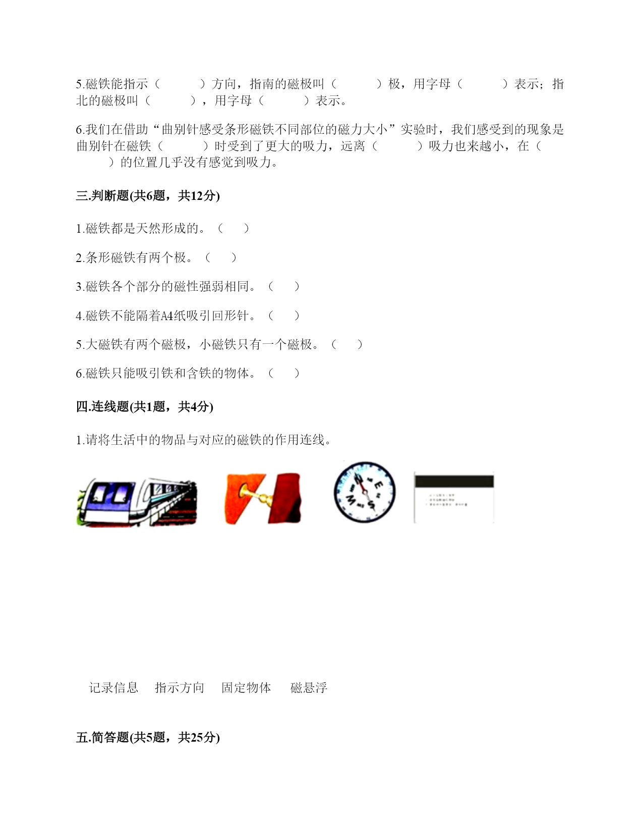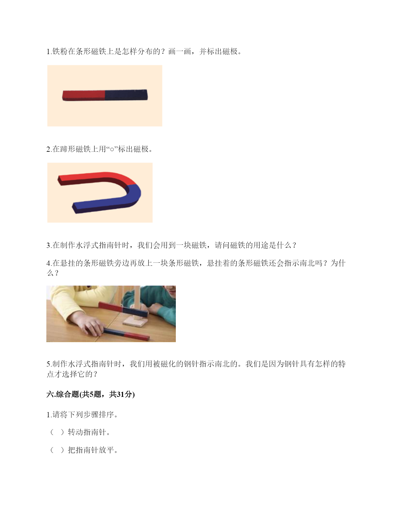 小学科学《磁铁》练习题一.选择题(共6题,共12分)1.磁铁能吸引下面的()A.回形针B.玻璃杯C.铝锅2.指南针是利用磁铁什么性质制成的?()A.磁铁能指示南北方向的特点B.隔空吸物的特点C.吸铁的特点3.磁铁上()的磁力最强。A.中间B.磁极C.外边D.里边4.()中的物品不都是制作水浮式指南针时所需要的材料。A.磁铁、指南针B.碗、A4纸C.钢针、水5.把一块条形磁铁悬挂在空中使它能自由转动等磁铁静止时我们发现——磁极的两端分别指向()。A.东、西B.东、南C.南、北D.东、北6.磁铁的磁极有()个,指南的叫南极,用字母()表示;指北的磁极叫北极,用字母()表示。A.1SNB.1NSC.2SN二.填空题(共6题,共36分)1.指南针的四种放置方法分别是()、()、()和()。2.()和()中也有磁铁,它们的作用是振动发声。3.()和()中有许多极其微小的“磁铁”,可以记录很多信息。4.()是我国古代四大发明之一。九百多年前,我国海船已使用()导航。5.磁铁能指示()方向,指南的磁极叫()极,用字母()表示;指北的磁极叫(),用字母()表示。6.我们在借助“曲别针感受条形磁铁不同部位的磁力大小”实验时,我们感受到的现象是曲别针在磁铁()时受到了更大的吸力,远离()吸力也来越小,在()的位置几乎没有感觉到吸力。三.判断题(共6题,共12分)1.磁铁都是天然形成的。()2.条形磁铁有两个极。()3.磁铁各个部分的磁性强弱相同。()4.磁铁不能隔着A4纸吸引回形针。()5.大磁铁有两个磁极,小磁铁只有一个磁极。()6.磁铁只能吸引铁和含铁的物体。()四.连线题(共1题,共4分)1.请将生活中的物品与对应的磁铁的作用连线。记录信息指示方向固定物体磁悬浮五.简答题(共5题,共25分)1.铁粉在条形磁铁上是怎样分布的?画一画,并标出磁极。2.在蹄形磁铁上用“○”标出磁极。3.在制作水浮式指南针时,我们会用到一块磁铁,请问磁铁的用途是什么?4.在悬挂的条形磁铁旁边再放上一块条形磁铁,悬挂着的条形磁铁还会指示南北吗?为什么?5.制作水浮式指南针时,我们用被磁化的钢针指示南北的。我们是因为钢针具有怎样的特点才选择它的?六.综合题(共5题,共31分)1.请将下列步骤排序。()转动指南针。()把指南针放平。()使刻度盘上的南、北方向与磁针所指方向一致。()让磁针自由转动。()磁针静止后红色一端指北方,白色一端指南方。顺序是()。2.请将制作指南针的步骤按正确的顺序进行排序。①把磁针固定在吹塑纸上。②把磁针磁化。③用指南针确定方向。④标出南北极。⑤把装好的磁针轻轻放在水面上。正确顺序:()3.用磁铁学具盒中的环形磁铁设计一个悬浮塔,有两种摆放方式。请在下面右图中用字母标出这两种摆法的磁极。4.子枫想用钢针制作一个指南针,他的操作过程如下图所示,请仔细观察,并解决问题。1.如图所示的步骤叫做()。A.消磁B.磁化C.加磁2.制作磁针时,要用磁铁的磁极位置在钢针上()。A.来回反复摩擦B.沿一个方向反复摩擦C.先沿一个方向摩擦几次,再沿反方向摩擦几次3.制作磁针时,用磁铁的()在钢针上反复摩擦。A.一个磁极B.两个磁极C.中间部位4.如图是子枫在()。A.固定钢针B.测试钢针的磁性如图是子枫在用真正的指南针()。A.确定方向B.测量方向5.如图所示,子萓和昊瑞一起玩“蝴蝶飞”的游戏,请你根据所学的知识回答问题。1.“蝴蝶”的身体应该用()制作。A.毛线B.回形针C.塑料笔帽2.“蝴蝶”能飞起来,是因为受到了()。A.拉力B.磁力C.推力3.如果在“蝴蝶”和磁铁中间放上(),“蝴蝶”就不能飞起来了。A.B.C.4.如果用条形磁铁的另一端靠近“蝴蝶”,蝴蝶()飞起来。A.能B.不能参考答案一.选择题1.A2.A3.B4.B5.C6.C二.填空题1.碗唇旋定法;指甲旋定法;悬挂法;水浮法2.耳机;扬声器3.磁条卡;磁带4.指南针;指南针5.南北;南;S;北;N6.两端;两端;中间三.判断题1.×2.√3.×4.×5.×6.×四.连线题1.如下:五.简答题1.如下:2.如下:3.磁铁的用途是使钢针变得具有磁性。4.不一定,另一块磁铁对悬挂的磁铁也有力的作用,会影响它指示南北方向。5.钢针较轻,受外力影响较小,指示方向更准确。六.综合题1.4;1;5;2;32.②①⑤③④3.如下:4.BBABA5.BBCA