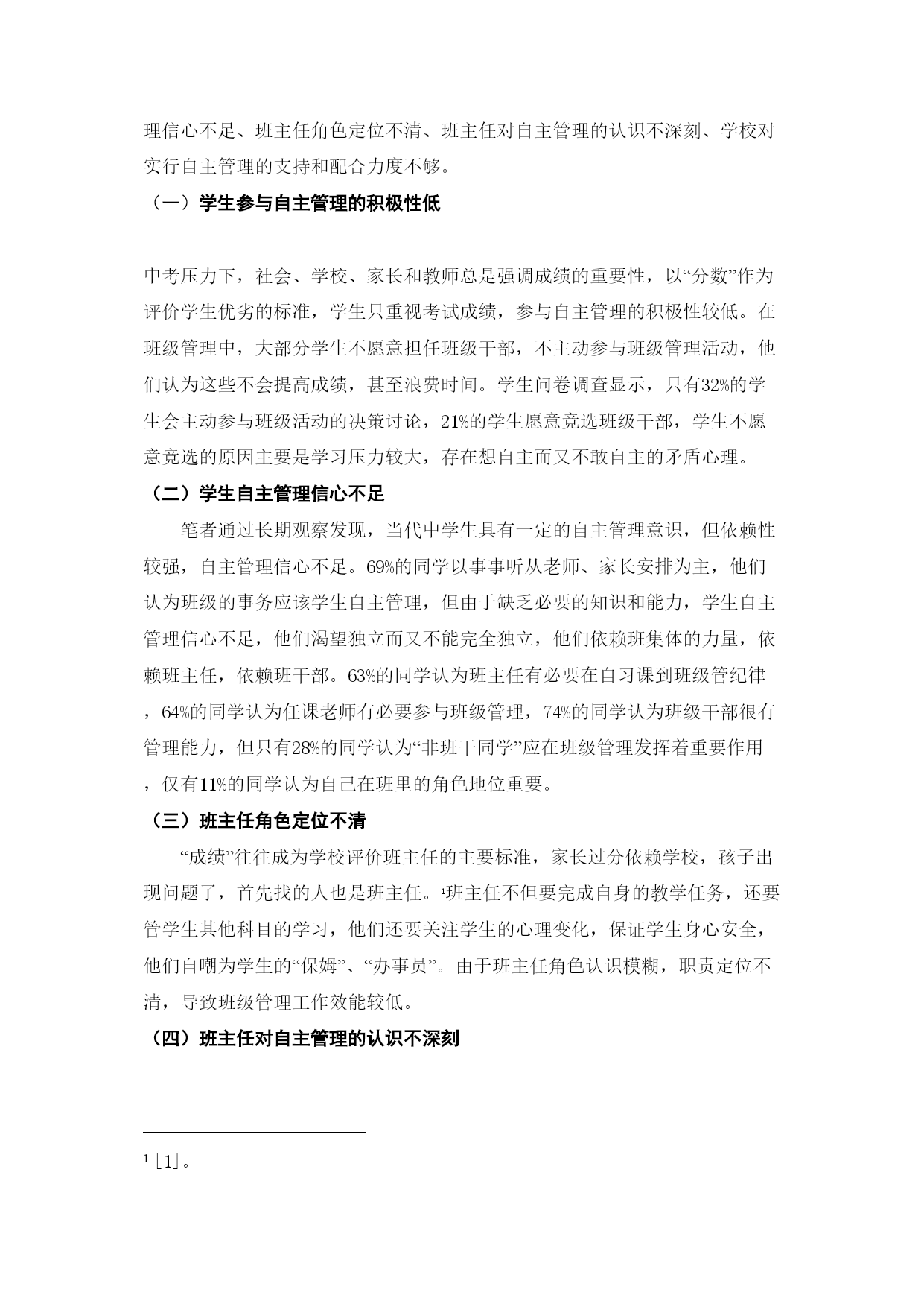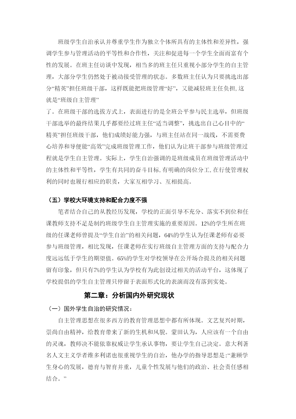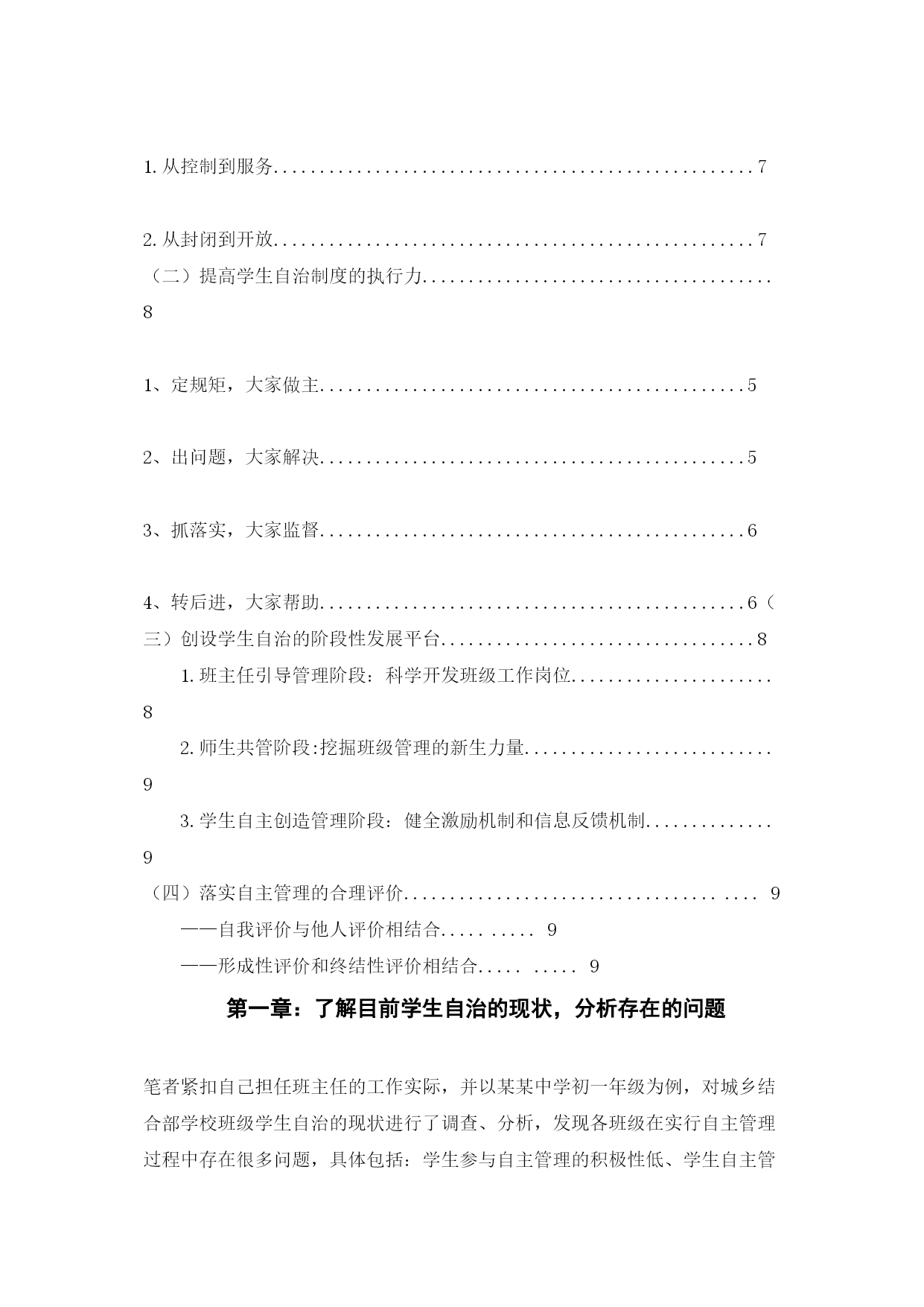 城乡结合部学校班级管理“学生自治”的行动研究摘要施行学生自治是培养民主社会的公民的重要举措。从教育的角度看,独生子女教育问题和推行素质教育是我国目前教育面临的两大难题。现在的学生中,独生子女居多。他们一方面个性强,以自我为中心;一方面依赖性又强,自立能力低,责任意识淡薄。因此,倡导学生自治有利于培养学生的自立能力和责任意识。可以说,“学生自治”是实施素质教育的有效途径之一。新课程改革的出发点是“以学生的发展为本”,班级作为推行新课程改革的基本单位,是学生学习与生活的基层组织,这要求班主任在班级管理中体现“以人为本,全面发展”的新教育观,注重学生独立性和自主性的培养,为每一个学生的健康成长创造良好的班级环境,才会使学生的自主发展得到最大程度的实现。关键词:城乡结合;学校班级管理;学生自治;行动研究Urbanandruralintegrationofschoolclassmanagementof"studentAbstractImplementationofstudentautonomyistheimportantmeasureofcultivatingcitizensofthedemocraticsociety.Fromtheperspectiveofeducation,onlychildreneducationproblemsandtoimplementqualityeducationarethetwomajorchallengesfacingtheeducationinourcountryatpresent.Today'sstudents,onlydaughterisinthemajority.Theyontheonehand,strongpersonality,self-centered;Ontheonehandanddependenceisstrong,independentabilityislow,weakconsciousnessofresponsibility.Therefore,advocatingstudentautonomyishelpfultocultivatestudents'independentabilityandresponsibilityconsciousness.Cansay,"studentautonomy"isoneoftheeffectivewaystocarryoutThestartingpointofthenewcurriculumreformis"basedonthedevelopmentofstudents",whichrequiresintheclassteacherinclassmanagement,payattentiontothecultivationofthestudents'independenceandautonomy,reflect"people-oriented,all-rounddevelopment"oftheneweducation.Classasthebasicunitofthenewcurriculumreform,istheprimaryorganizationofthestudents'learningandlifeisonly"givetheclassbacktostudents",forthehealthygrowthofeverystudent,tocreateagoodclassroomenvironment,willbetotherealizationofthemaximumoftheindependentdevelopmentofstudents.Keywords::Urbanandruralareas;Theschoolclassmanagement;Studentautonomy;Actionresearch目录第一章了解目前学生自治的现状,分析存在的问题........................1(一)学生参与自主管理的积极性低....................................1(二)学生自主管理信心不足.........................................1(三)班主任角色定位不清............................................1(四)班主任对自主管理的认识不深刻..................................2(五)学校大环境支持和配合力度不强..................................2第二章分析国内外研究现状.......