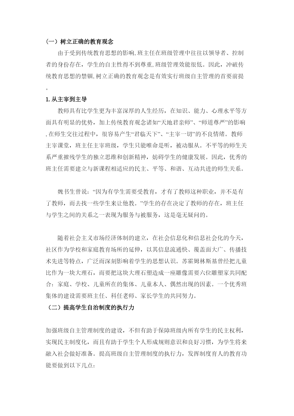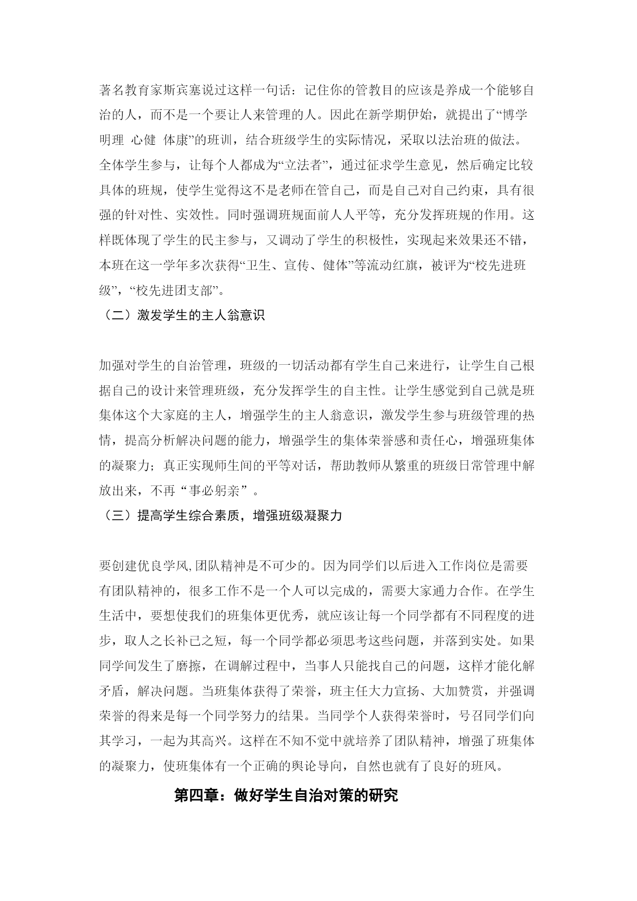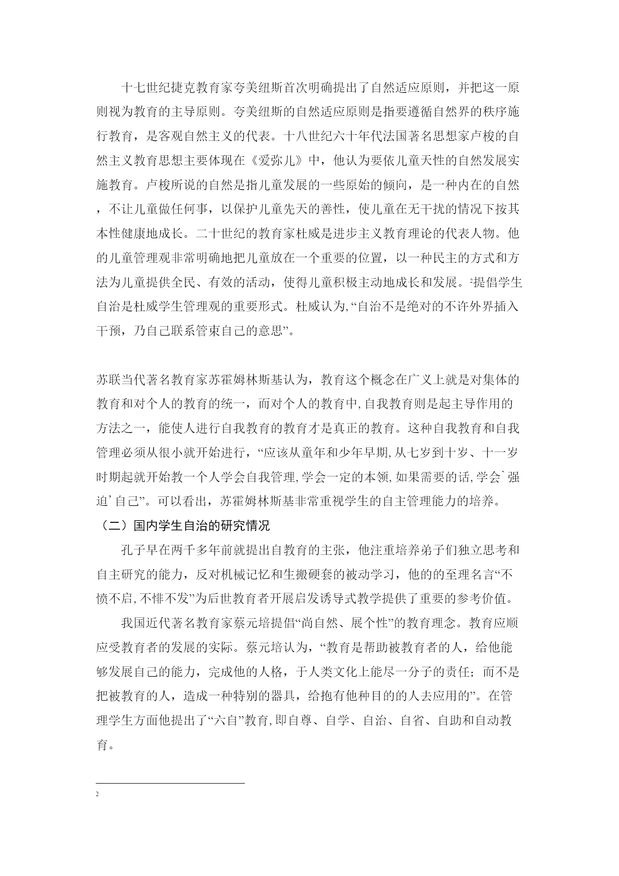 城乡结合部学校班级管理“学生自治”的行动研究摘要施行学生自治是培养民主社会的公民的重要举措。从教育的角度看,独生子女教育问题和推行素质教育是我国目前教育面临的两大难题。现在的学生中,独生子女居多。他们一方面个性强,以自我为中心;一方面依赖性又强,自立能力低,责任意识淡薄。因此,倡导学生自治有利于培养学生的自立能力和责任意识。可以说,“学生自治”是实施素质教育的有效途径之一。新课程改革的出发点是“以学生的发展为本”,班级作为推行新课程改革的基本单位,是学生学习与生活的基层组织,这要求班主任在班级管理中体现“以人为本,全面发展”的新教育观,注重学生独立性和自主性的培养,为每一个学生的健康成长创造良好的班级环境,才会使学生的自主发展得到最大程度的实现。关键词:城乡结合;学校班级管理;学生自治;行动研究Urbanandruralintegrationofschoolclassmanagementof"studentAbstractImplementationofstudentautonomyistheimportantmeasureofcultivatingcitizensofthedemocraticsociety.Fromtheperspectiveofeducation,onlychildreneducationproblemsandtoimplementqualityeducationarethetwomajorchallengesfacingtheeducationinourcountryatpresent.Today'sstudents,onlydaughterisinthemajority.Theyontheonehand,strongpersonality,self-centered;Ontheonehandanddependenceisstrong,independentabilityislow,weakconsciousnessofresponsibility.Therefore,advocatingstudentautonomyishelpfultocultivatestudents'independentabilityandresponsibilityconsciousness.Cansay,"studentautonomy"isoneoftheeffectivewaystocarryoutThestartingpointofthenewcurriculumreformis"basedonthedevelopmentofstudents",whichrequiresintheclassteacherinclassmanagement,payattentiontothecultivationofthestudents'independenceandautonomy,reflect"people-oriented,all-rounddevelopment"oftheneweducation.Classasthebasicunitofthenewcurriculumreform,istheprimaryorganizationofthestudents'learningandlifeisonly"givetheclassbacktostudents",forthehealthygrowthofeverystudent,tocreateagoodclassroomenvironment,willbetotherealizationofthemaximumoftheindependentdevelopmentofstudents.Keywords::Urbanandruralareas;Theschoolclassmanagement;Studentautonomy;Actionresearch目录第一章了解目前学生自治的现状,分析存在的问题........................1(一)学生参与自主管理的积极性低....................................1(二)学生自主管理信心不足.........................................1(三)班主任角色定位不清............................................1(四)班主任对自主管理的认识不深刻..................................2(五)学校大环境支持和配合力度不强..................................2第二章分析国内外研究现状.......