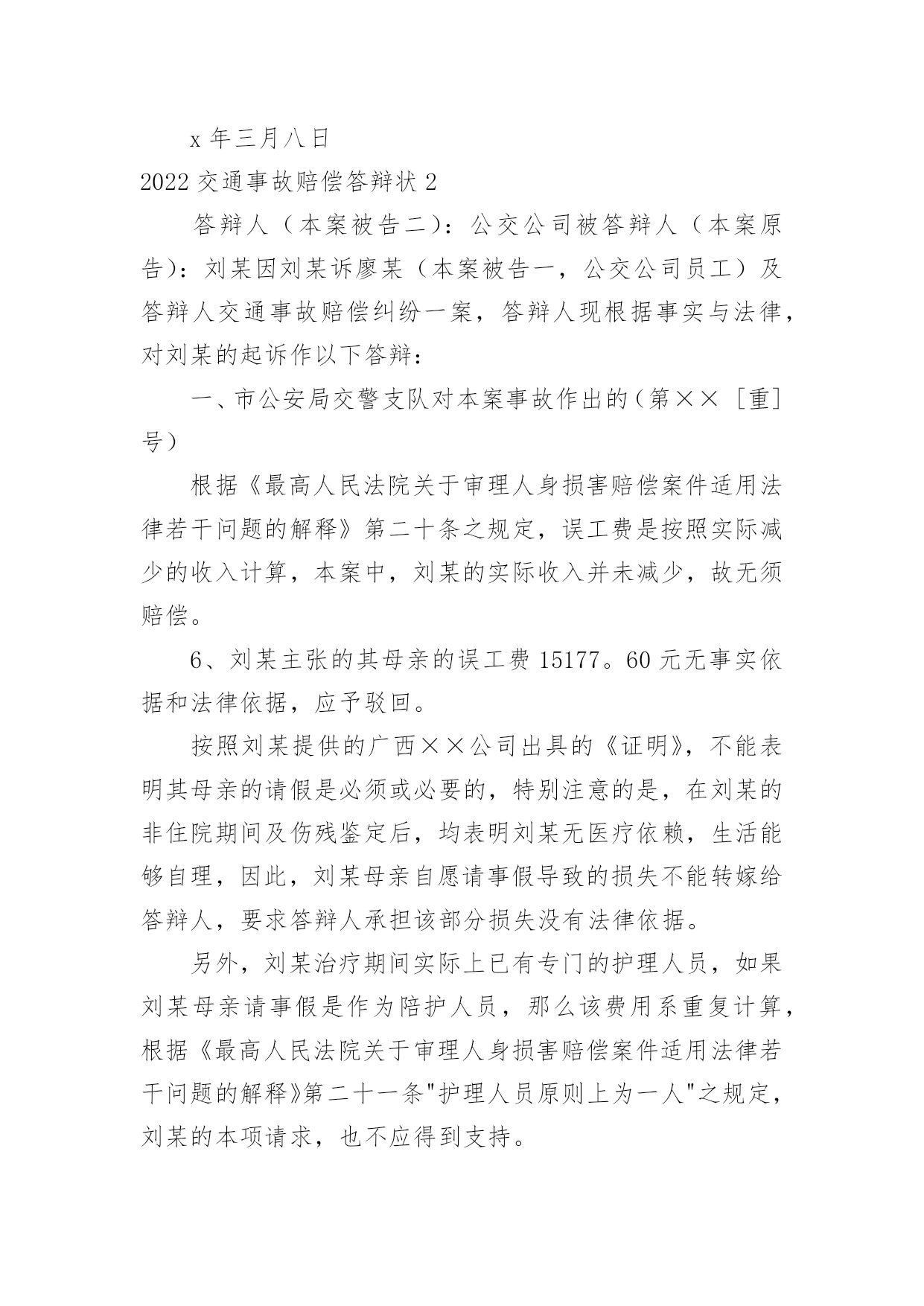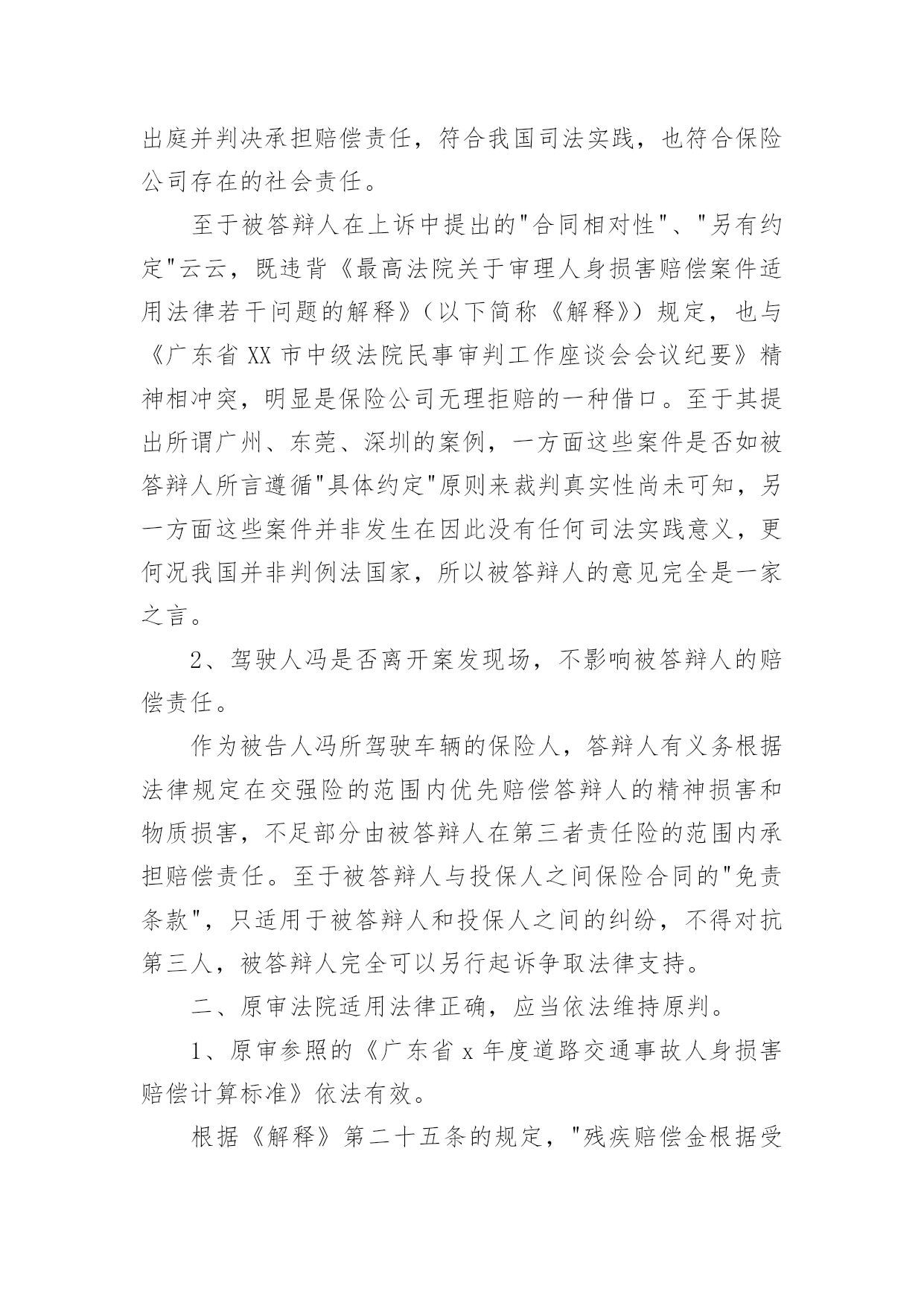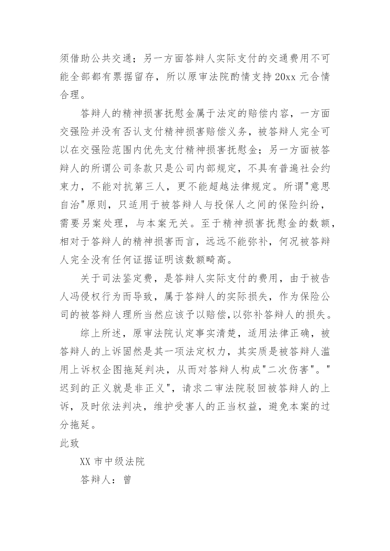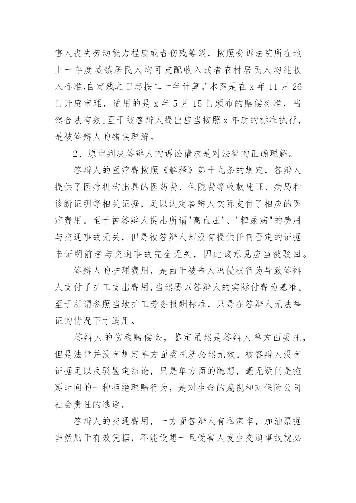 交通事故赔偿答辩状2022交通事故赔偿答辩状答辩状可以针对原告起诉状中所写的适用法律问题进行答辩。在日常生活和工作中,很多诉讼案件都要在法庭上解决,大家开庭前都会提前做好答辩状,下面是小编整理的2022交通事故赔偿答辩状,欢迎大家借鉴与参考,希望对大家有所帮助。2022交通事故赔偿答辩状1答辩人:曾,女,汉族,x年8月15日出生,现住在XX市XX区路号家园6B。被答辩人:保险股份有限公司分公司。答辩人因被答辩人上诉答辩人等交通事故人身损害赔偿一案,提出答辩意见如下:一、原审法院判决被答辩人承担人身损害赔偿责任合理合法。1、被答辩人作为被告人冯所驾驶车辆的保险人,有权依法承担被保险车辆所造成的人身损害。被答辩人根据保险合同,有义务对投保人的侵权行为承担连带责任。根据我国司法实践,交强险的保险公司是交通事故人身损害赔偿必要共同诉讼人,商业险的保险公司可以依据原告的申请列为共同被告,所以被答辩人作为原审被告出庭并判决承担赔偿责任,符合我国司法实践,也符合保险公司存在的社会责任。至于被答辩人在上诉中提出的"合同相对性"、"另有约定"云云,既违背《最高法院关于审理人身损害赔偿案件适用法律若干问题的解释》(以下简称《解释》)规定,也与《广东省XX市中级法院民事审判工作座谈会会议纪要》精神相冲突,明显是保险公司无理拒赔的一种借口。至于其提出所谓广州、东莞、深圳的案例,一方面这些案件是否如被答辩人所言遵循"具体约定"原则来裁判真实性尚未可知,另一方面这些案件并非发生在因此没有任何司法实践意义,更何况我国并非判例法国家,所以被答辩人的意见完全是一家之言。2、驾驶人冯是否离开案发现场,不影响被答辩人的赔偿责任。作为被告人冯所驾驶车辆的保险人,答辩人有义务根据法律规定在交强险的范围内优先赔偿答辩人的精神损害和物质损害,不足部分由被答辩人在第三者责任险的范围内承担赔偿责任。至于被答辩人与投保人之间保险合同的"免责条款",只适用于被答辩人和投保人之间的纠纷,不得对抗第三人,被答辩人完全可以另行起诉争取法律支持。二、原审法院适用法律正确,应当依法维持原判。1、原审参照的《广东省x年度道路交通事故人身损害赔偿计算标准》依法有效。根据《解释》第二十五条的规定,"残疾赔偿金根据受害人丧失劳动能力程度或者伤残等级,按照受诉法院所在地上一年度城镇居民人均可支配收入或者农村居民人均纯收入标准,自定残之日起按二十年计算。"本案是在x年11月26日开庭审理,适用的是x年5月15日颁布的赔偿标准,当然合法有效。至于被答辩人提出应当按照x年度的标准执行,是被答辩人的错误理解。2、原审判决答辩人的诉讼请求是对法律的正确理解。答辩人的医疗费按照《解释》第十九条的规定,答辩人提供了医疗机构出具的医药费、住院费等收款凭证、病历和诊断证明等相关证据,足以认定答辩人实际支付了相应的医疗费用。至于被答辩人提出所谓"高血压"、"糖尿病"的费用与交通事故无关,但是被答辩人却没有提供任何否定的证据来证明前者与交通事故完全无关,因此该意见应当被驳回。答辩人的护理费用,是由于被告人冯侵权行为导致答辩人支付了护工支出费用,当然要以答辩人的实际付费为基准。至于所谓参照当地护工劳务报酬标准,只是在答辩人无法举证的情况下才适用。答辩人的伤残赔偿金,鉴定虽然是答辩人单方面委托,但是法律并没有规定单方面委托就必然无效。被答辩人没有证据足以反驳鉴定结论,只是单方面的臆想,毫无疑问是拖延时间的一种拒绝理赔行为,是对生命的蔑视和对保险公司社会责任的逃避。答辩人的交通费用,一方面答辩人有私家车,加油票据当然属于有效凭据,不能设想一旦受害人发生交通事故就必须借助公共交通;另一方面答辩人实际支付的交通费用不可能全部都有票据留存,所以原审法院酌情支持20xx元合情合理。答辩人的精神损害抚慰金属于法定的赔偿内容,一方面交强险并没有否认支付精神损害赔偿义务,被答辩人完全可以在交强险范围内优先支付精神损害抚慰金;另一方面被答辩人的所谓公司条款只是公司内部规定,不具有普遍社会约束力,不能对抗第三人,更不能超越法律规定。所谓"意思自治"原则,只适用于被答辩人与投保人之间的保险纠纷,需要另案处理,与本案无关。至于精神损害抚慰金的数额,相对于答辩人的精神损害而言,远远不能弥补,何况被答辩人完全没有任何证据证明该数额畸高。关于司法鉴定费,是答辩人实际支付的费用,由于被告人冯侵权行为而导致,属于答辩人的实际损失,作为保险公司的被答辩人理所当然应该予以赔偿,以弥补答辩人的损失。综上所述,原审法院认定事实清楚,适用法律正确,被答辩人的上诉固然是其一项法定权力,其实质是被答辩人滥用上诉权企图拖延判决,从而对答辩人构成"二次伤害"。"迟到的正义就是非正义",请求二审法院驳回被答辩人的上诉,及时依法判决,维护受害人的正当权益,避免本案的过分拖延。