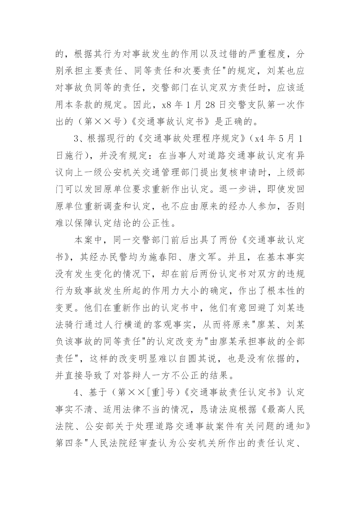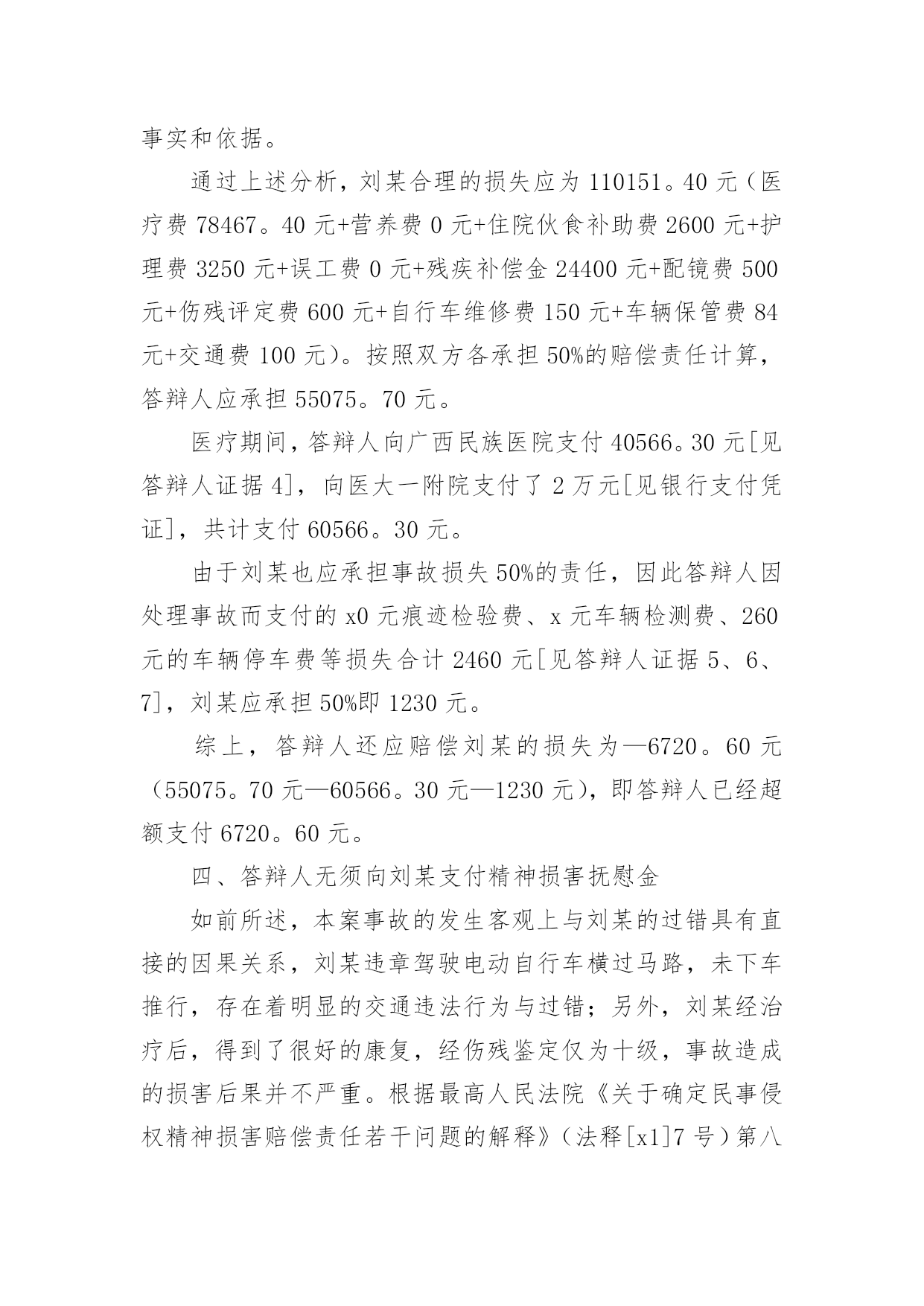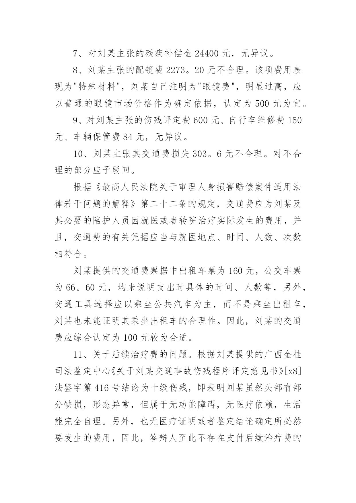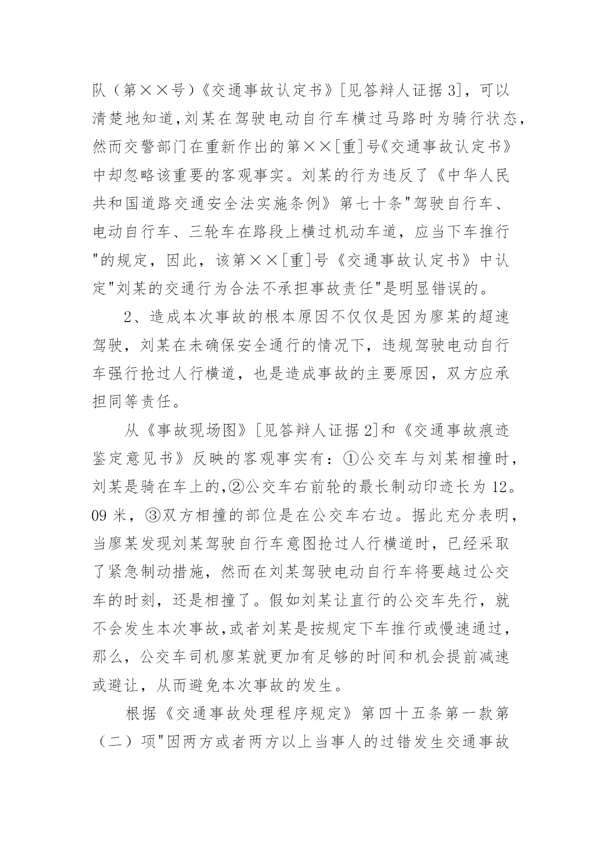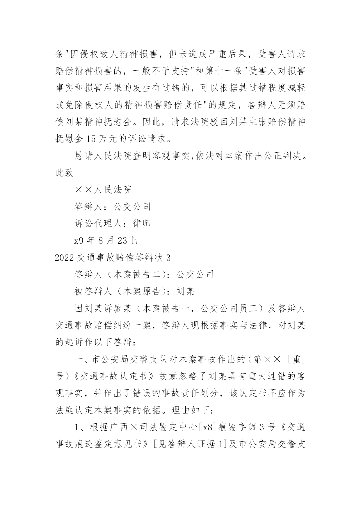 交通事故赔偿答辩状2022交通事故赔偿答辩状答辩状可以针对原告起诉状中所写的适用法律问题进行答辩。在日常生活和工作中,很多诉讼案件都要在法庭上解决,大家开庭前都会提前做好答辩状,下面是小编整理的2022交通事故赔偿答辩状,欢迎大家借鉴与参考,希望对大家有所帮助。2022交通事故赔偿答辩状1答辩人:曾,女,汉族,x年8月15日出生,现住在XX市XX区路号家园6B。被答辩人:保险股份有限公司分公司。答辩人因被答辩人上诉答辩人等交通事故人身损害赔偿一案,提出答辩意见如下:一、原审法院判决被答辩人承担人身损害赔偿责任合理合法。1、被答辩人作为被告人冯所驾驶车辆的保险人,有权依法承担被保险车辆所造成的人身损害。被答辩人根据保险合同,有义务对投保人的侵权行为承担连带责任。根据我国司法实践,交强险的保险公司是交通事故人身损害赔偿必要共同诉讼人,商业险的保险公司可以依据原告的申请列为共同被告,所以被答辩人作为原审被告出庭并判决承担赔偿责任,符合我国司法实践,也符合保险公司存在的社会责任。至于被答辩人在上诉中提出的"合同相对性"、"另有约定"云云,既违背《最高法院关于审理人身损害赔偿案件适用法律若干问题的解释》(以下简称《解释》)规定,也与《广东省XX市中级法院民事审判工作座谈会会议纪要》精神相冲突,明显是保险公司无理拒赔的一种借口。至于其提出所谓广州、东莞、深圳的案例,一方面这些案件是否如被答辩人所言遵循"具体约定"原则来裁判真实性尚未可知,另一方面这些案件并非发生在因此没有任何司法实践意义,更何况我国并非判例法国家,所以被答辩人的意见完全是一家之言。2、驾驶人冯是否离开案发现场,不影响被答辩人的赔偿责任。作为被告人冯所驾驶车辆的保险人,答辩人有义务根据法律规定在交强险的范围内优先赔偿答辩人的精神损害和物质损害,不足部分由被答辩人在第三者责任险的范围内承担赔偿责任。至于被答辩人与投保人之间保险合同的"免责条款",只适用于被答辩人和投保人之间的纠纷,不得对抗第三人,被答辩人完全可以另行起诉争取法律支持。二、原审法院适用法律正确,应当依法维持原判。1、原审参照的《广东省x年度道路交通事故人身损害赔偿计算标准》依法有效。根据《解释》第二十五条的规定,"残疾赔偿金根据受害人丧失劳动能力程度或者伤残等级,按照受诉法院所在地上一年度城镇居民人均可支配收入或者农村居民人均纯收入标准,自定残之日起按二十年计算。"本案是在x年11月26日开庭审理,适用的是x年5月15日颁布的赔偿标准,当然合法有效。至于被答辩人提出应当按照x年度的标准执行,是被答辩人的错误理解。2、原审判决答辩人的诉讼请求是对法律的正确理解。答辩人的医疗费按照《解释》第十九条的规定,答辩人提供了医疗机构出具的医药费、住院费等收款凭证、病历和诊断证明等相关证据,足以认定答辩人实际支付了相应的医疗费用。至于被答辩人提出所谓"高血压"、"糖尿病"的费用与交通事故无关,但是被答辩人却没有提供任何否定的证据来证明前者与交通事故完全无关,因此该意见应当被驳回。答辩人的护理费用,是由于被告人冯侵权行为导致答辩人支付了护工支出费用,当然要以答辩人的实际付费为基准。至于所谓参照当地护工劳务报酬标准,只是在答辩人无法举证的情况下才适用。答辩人的伤残赔偿金,鉴定虽然是答辩人单方面委托,但是法律并没有规定单方面委托就必然无效。被答辩人没有证据足以反驳鉴定结论,只是单方面的臆想,毫无疑问是拖延时间的一种拒绝理赔行为,是对生命的蔑视和对保险公司社会责任的逃避。答辩人的交通费用,一方面答辩人有私家车,加油票据当然属于有效凭据,不能设想一旦受害人发生交通事故就必须借助公共交通;另一方面答辩人实际支付的交通费用不可能全部都有票据留存,所以原审法院酌情支持20xx元合情合理。答辩人的精神损害抚慰金属于法定的赔偿内容,一方面交强险并没有否认支付精神损害赔偿义务,被答辩人完全可以在交强险范围内优先支付精神损害抚慰金;另一方面被答辩人的所谓公司条款只是公司内部规定,不具有普遍社会约束力,不能对抗第三人,更不能超越法律规定。所谓"意思自治"原则,只适用于被答辩人与投保人之间的保险纠纷,需要另案处理,与本案无关。至于精神损害抚慰金的数额,相对于答辩人的精神损害而言,远远不能弥补,何况被答辩人完全没有任何证据证明该数额畸高。关于司法鉴定费,是答辩人实际支付的费用,由于被告人冯侵权行为而导致,属于答辩人的实际损失,作为保险公司的被答辩人理所当然应该予以赔偿,以弥补答辩人的损失。综上所述,原审法院认定事实清楚,适用法律正确,被答辩人的上诉固然是其一项法定权力,其实质是被答辩人滥用上诉权企图拖延判决,从而对答辩人构成"二次伤害"。"迟到的正义就是非正义",请求二审法院驳回被答辩人的上诉,及时依法判决,维护受害人的正当权益,避免本案的过分拖延。