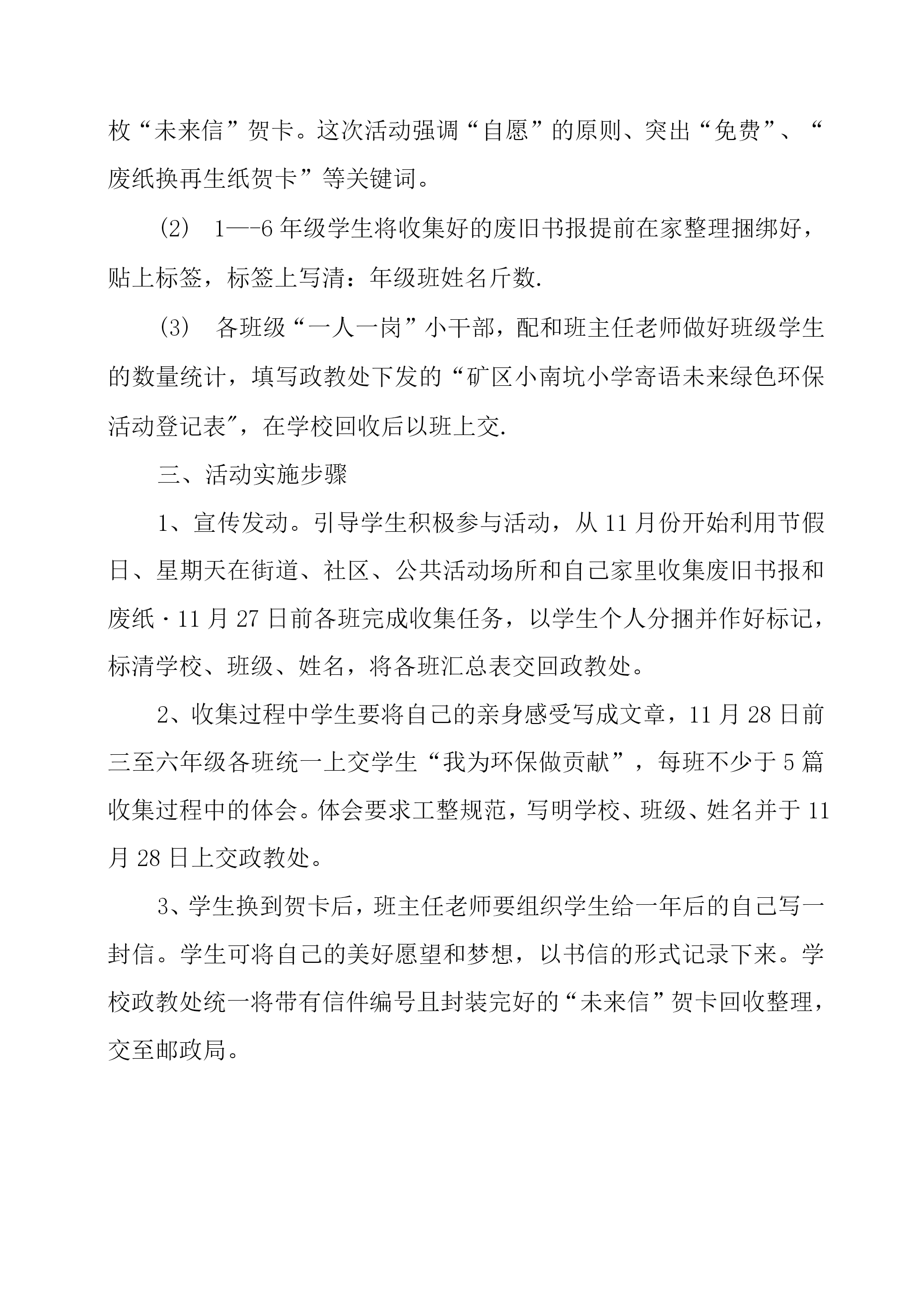 绿色环保主题活动方案为了进一步加强环境保护宣传教育工作,增强广大青少年学生的环境保护意识,努力培养学生养成良好的行为习惯,为我市建成国家级环保模范城市贡献力量,根据市教育局的统一安排,教育局在全区中小学生中开展“寄语未来”绿色环保主题教育活动。接到文件通知后,我校也积极响应上级号召,召开了年级组长会,认真安排落实,配合上级主管部门在全体学生中开展了“寄语未来”绿色环保主题教育活动。一、活动对象及范围:一至六年级学生二、活动时间、形式及要求1、活动时间:2017年3月2、活动形式:利用双休日,由学生自己动手,通过多种渠道积极回收废旧图书和报纸来换取中国邮政发行的“未来信”贺卡,将自己对一年后的目标,对一年后的畅想,对一年后的希望写入“未来信”。邮政局将为此活动特别开设“未来邮局",将孩子们的美好愿望统一封存,“未来邮局”将在一年后统一将学生们写给自己未来的信邮寄回每个学生手中。3、活动要求:每个学生每收集至少2、5公斤废旧书报、图书即可换取一枚“未来信”贺卡。这次活动强调“自愿”的原则、突出“免费”、“废纸换再生纸贺卡”等关键词。1—-6年级学生将收集好的废旧书报提前在家整理捆绑好,贴上标签,标签上写清:年级班姓名斤数.各班级“一人一岗”小干部,配和班主任老师做好班级学生的数量统计,填写政教处下发的“矿区小南坑小学寄语未来绿色环保活动登记表",在学校回收后以班上交.三、活动实施步骤1、宣传发动。引导学生积极参与活动,从11月份开始利用节假日、星期天在街道、社区、公共活动场所和自己家里收集废旧书报和废纸・11月27日前各班完成收集任务,以学生个人分捆并作好标记,标清学校、班级、姓名,将各班汇总表交回政教处。2、收集过程中学生要将自己的亲身感受写成文章,11月28日前三至六年级各班统一上交学生“我为环保做贡献”,每班不少于5篇收集过程中的体会。体会要求工整规范,写明学校、班级、姓名并于11月28日上交政教处。3、学生换到贺卡后,班主任老师要组织学生给一年后的自己写一封信。学生可将自己的美好愿望和梦想,以书信的形式记录下来。学校政教处统一将带有信件编号且封装完好的“未来信”贺卡回收整理,交至邮政局。