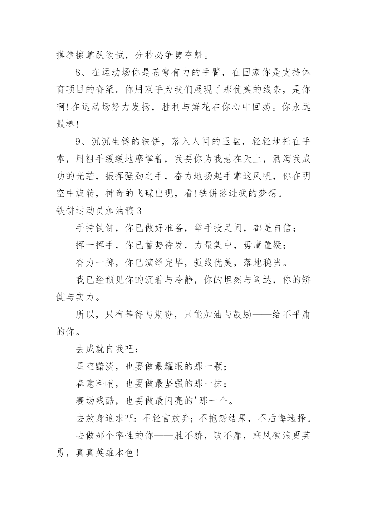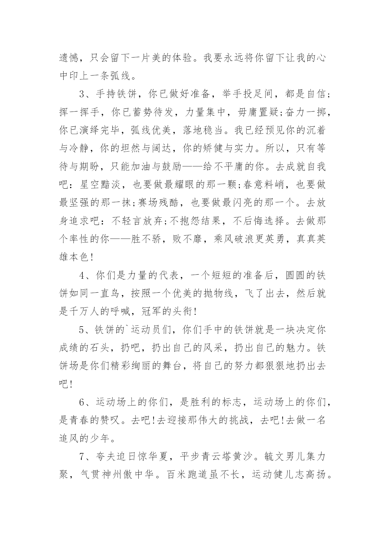 铁饼运动员加油稿铁饼运动员加油稿3篇在现实社会中,需要使用加油稿的场合越来越多,加油稿是用于给别人加油鼓气,提升别人气势的文稿。如何写一份恰当的加油稿呢?下面是小编收集整理的铁饼运动员加油稿,希望能够帮助到大家。铁饼运动员加油稿1一道优美的弧线划过眼前,我不禁浮想连篇,这精彩的`弧线啊,凝结着多少辛勤的汗水,无伦的弧线啊,寄托着多少热切的期盼。它是这般自然,又是如此完美,没有什么遗憾,只会留下一片美的体验。我要永远将你留下让我的心中印上一条弧线铁饼运动员加油稿21、你如古代雕塑般的沉着,你又如闪电划过般的敏捷,当铁饼在空中画出优美的弧线时,你那汗水与欢笑清晰的镌刻在上面,加油,铁饼运动员,展现你那力与美的结合,当铁饼落地那一瞬间即成永远。2、一道优美的弧线划过眼前,我不禁浮想连篇,这精彩的弧线啊,凝结着多少辛勤的汗水无伦的弧线啊,寄托着多少热切的期盼。它是这般自然,又是如此完美,没有什么遗憾,只会留下一片美的体验。我要永远将你留下让我的心中印上一条弧线。3、手持铁饼,你已做好准备,举手投足间,都是自信;挥一挥手,你已蓄势待发,力量集中,毋庸置疑;奋力一掷,你已演绎完毕,弧线优美,落地稳当。我已经预见你的沉着与冷静,你的坦然与阔达,你的矫健与实力。所以,只有等待与期盼,只能加油与鼓励——给不平庸的你。去成就自我吧:星空黯淡,也要做最耀眼的那一颗;春意料峭,也要做最坚强的那一抹;赛场残酷,也要做最闪亮的那一个。去放身追求吧:不轻言放弃;不抱怨结果,不后悔选择。去做那个率性的你——胜不骄,败不靡,乘风破浪更英勇,真真英雄本色!4、你们是力量的代表,一个短短的准备后,圆圆的铁饼如同一直鸟,按照一个优美的抛物线,飞了出去,然后就是千万人的呼喊,冠军的头衔!5、铁饼的`运动员们,你们手中的铁饼就是一块决定你成绩的石头,扔吧,扔出自己的风采,扔出自己的魅力。铁饼场是你们精彩绚丽的舞台,将自己的努力都狠狠地扔出去吧!6、运动场上的你们,是胜利的标志,运动场上的你们,是青春的赞叹。去吧!去迎接那伟大的挑战,去吧!去做一名追风的少年。7、夸夫迫日惊华夏,平步青云塔黄沙。毓文男儿集力聚,气贯神州傲中华。百米跑道虽不长,运动健儿志高扬。摸拳擦掌跃欲试,分秒必争勇夺魁。8、在运动场你是苍穹有力的手臂,在国家你是支持体育项目的脊梁。你用双手为我们展现了那优美的线条,是你啊!在运动场努力发扬,胜利与鲜花在你心中回荡。你永远最棒!9、沉沉生锈的铁饼,落入人间的玉盘,轻轻地托在手掌,用粗手缓缓地摩挲着,我要你为我悬在天上,洒泻我成功的光茫,振挥强劲之手,奋力地扬起手掌这风帆,你在明空中旋转,神奇的飞碟出现,看!铁饼落进我的梦想。铁饼运动员加油稿3手持铁饼,你已做好准备,举手投足间,都是自信;挥一挥手,你已蓄势待发,力量集中,毋庸置疑;奋力一掷,你已演绎完毕,弧线优美,落地稳当。我已经预见你的沉着与冷静,你的坦然与阔达,你的矫健与实力。所以,只有等待与期盼,只能加油与鼓励——给不平庸的你。去成就自我吧:星空黯淡,也要做最耀眼的那一颗;春意料峭,也要做最坚强的那一抹;赛场残酷,也要做最闪亮的'那一个。去放身追求吧:不轻言放弃;不抱怨结果,不后悔选择。去做那个率性的你——胜不骄,败不靡,乘风破浪更英勇,真真英雄本色!