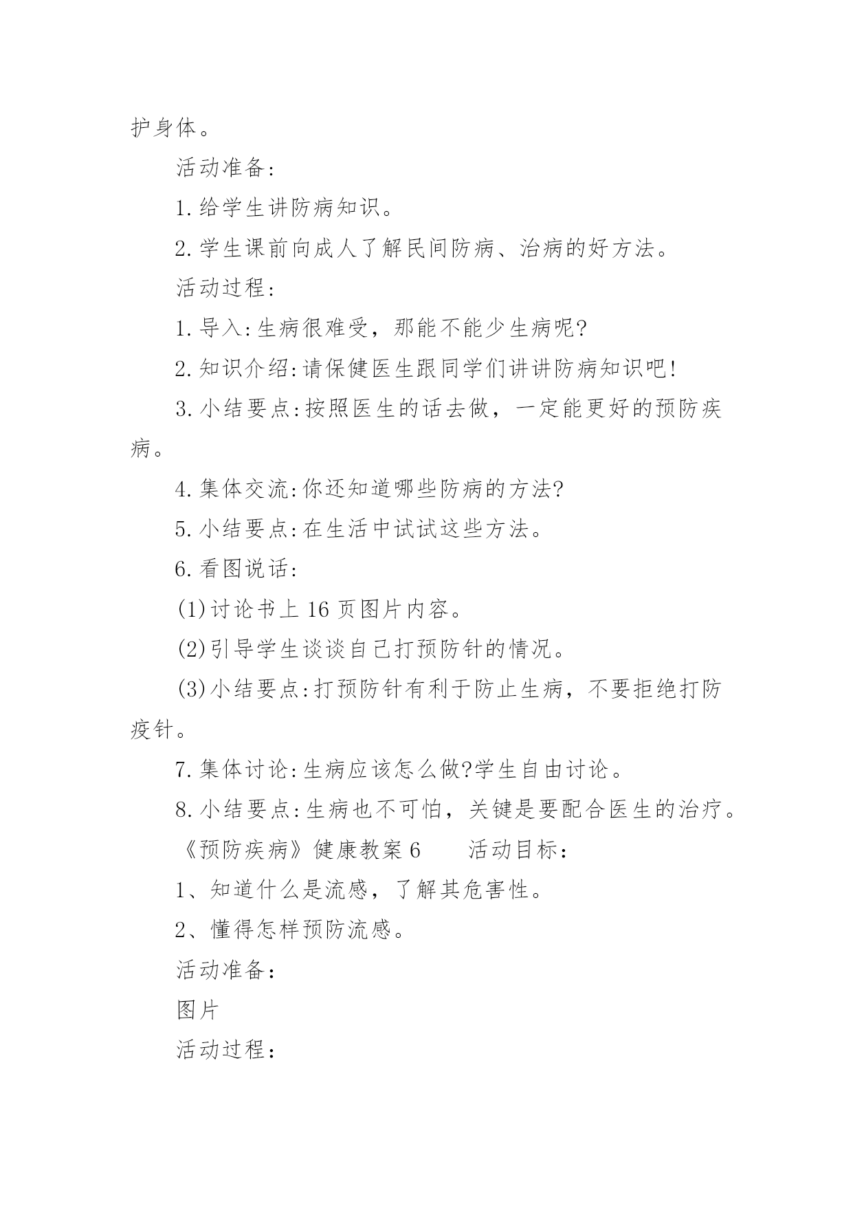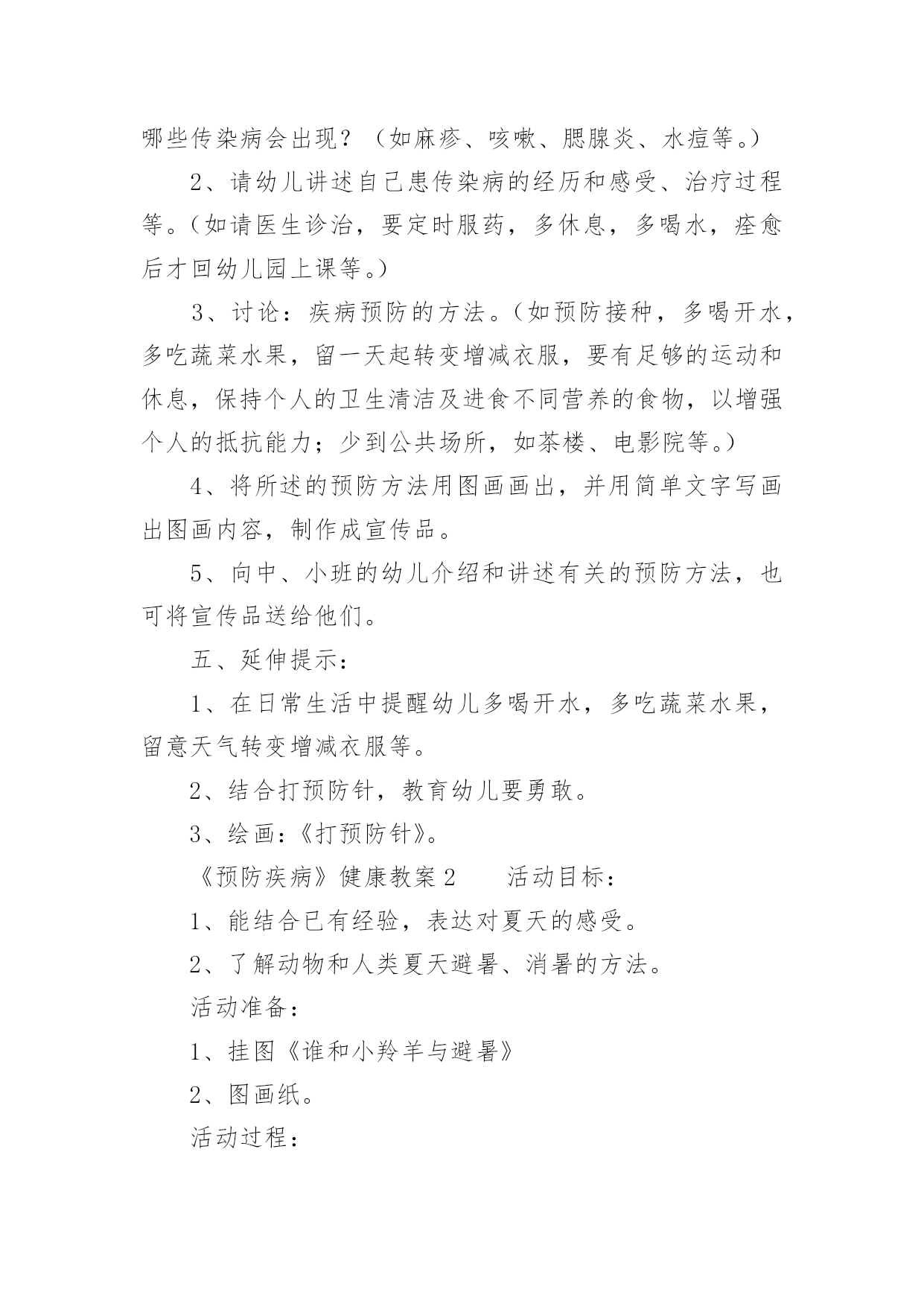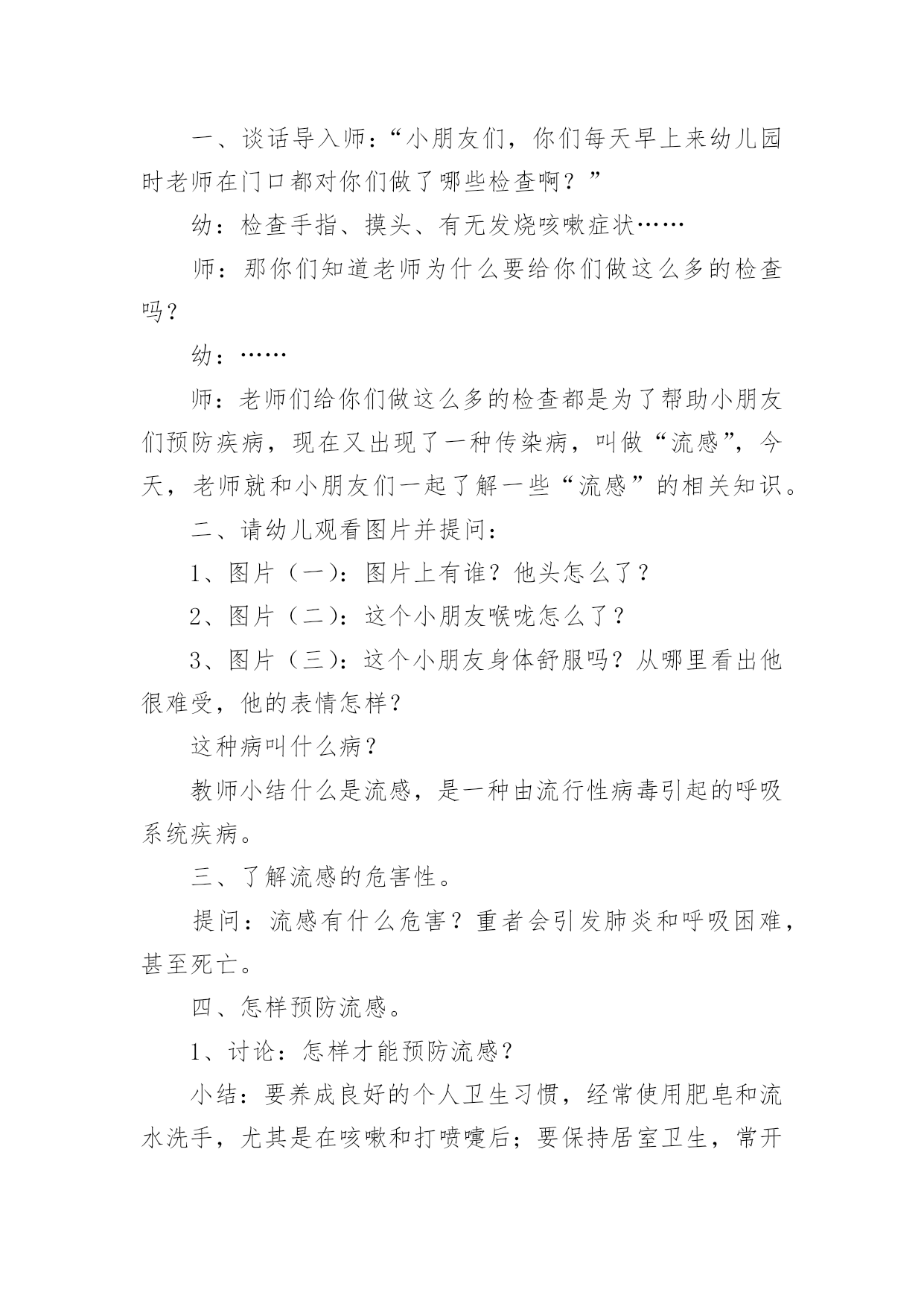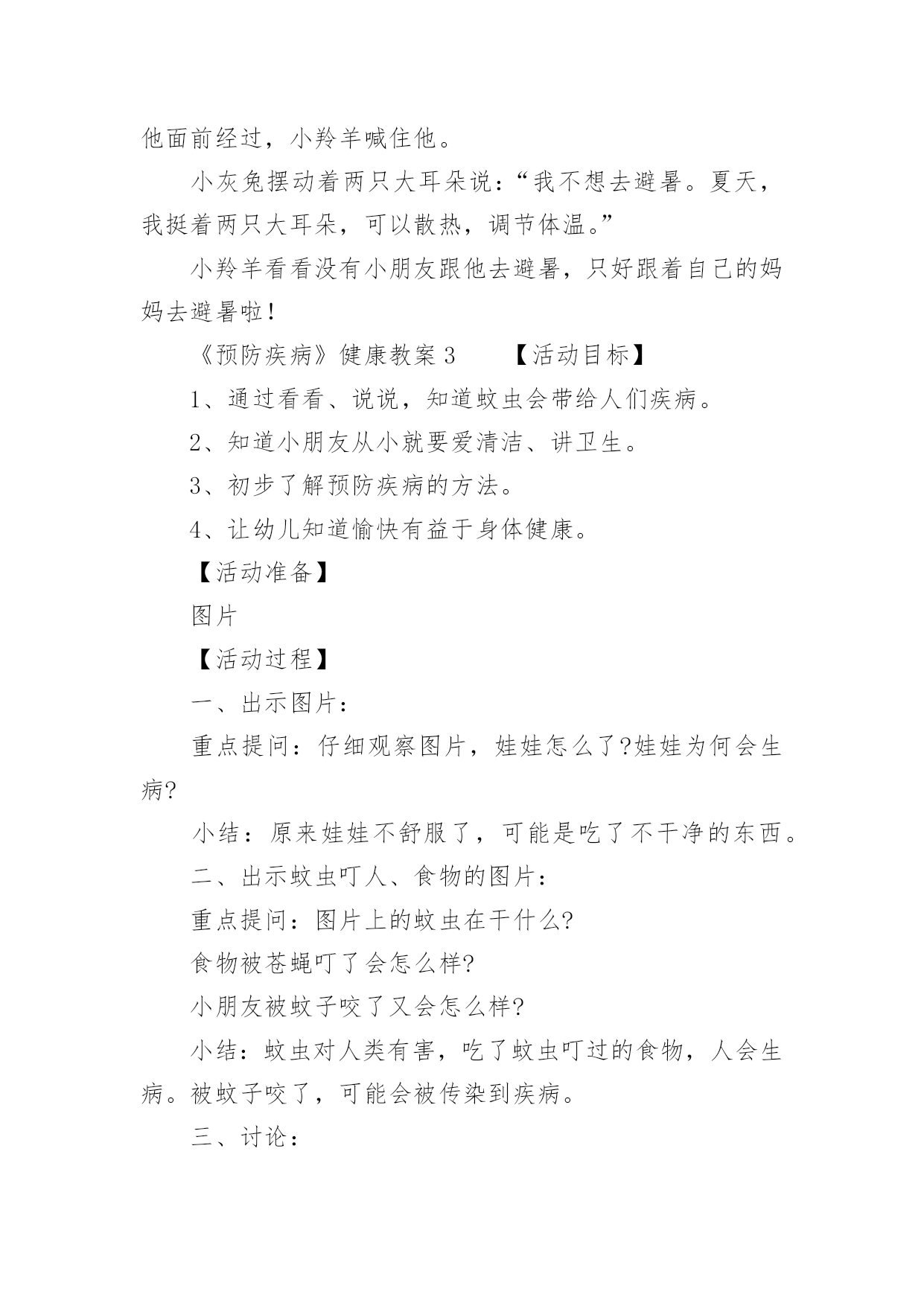 《预防疾病》健康教案《预防疾病》健康教案(精选7篇)作为一名辛苦耕耘的教育工作者,编写教案是必不可少的,编写教案有利于我们科学、合理地支配课堂时间。那么应当如何写教案呢?以下是小编帮大家整理的《预防疾病》健康教案(精选7篇),欢迎阅读与收藏。《预防疾病》健康教案1一、设计意图:春天是各种传染病流行的季节,有的孩子已有一些患传染病的体验,如水痘、腮腺炎等,所有的孩子都有大雨方针的经验。此活动旨在结合季节和孩子的生活经验,让幼儿了解有关传染病的.预防方法,增强幼儿预防疾病的意识。二、活动目标:1、了解有关春天传染病的情况,说出及画出预防疾病的方法。2、培养幼儿的表达能力。3、增强幼儿预防疾病的意识。三、活动准备:1、收集有关传染病的资料。2、张贴卫生部门有关传染病的宣传资料。3、准备材料:宣传品、纸、笔。四、过程建议:1、讨论:春天气候乍暖还寒,春雨绵绵,潮湿多雾,哪些传染病会出现?(如麻疹、咳嗽、腮腺炎、水痘等。)2、请幼儿讲述自己患传染病的经历和感受、治疗过程等。(如请医生诊治,要定时服药,多休息,多喝水,痊愈后才回幼儿园上课等。)3、讨论:疾病预防的方法。(如预防接种,多喝开水,多吃蔬菜水果,留一天起转变增减衣服,要有足够的运动和休息,保持个人的卫生清洁及进食不同营养的食物,以增强个人的抵抗能力;少到公共场所,如茶楼、电影院等。)4、将所述的预防方法用图画画出,并用简单文字写画出图画内容,制作成宣传品。5、向中、小班的幼儿介绍和讲述有关的预防方法,也可将宣传品送给他们。五、延伸提示:1、在日常生活中提醒幼儿多喝开水,多吃蔬菜水果,留意天气转变增减衣服等。2、结合打预防针,教育幼儿要勇敢。3、绘画:《打预防针》。《预防疾病》健康教案2活动目标:1、能结合已有经验,表达对夏天的感受。2、了解动物和人类夏天避暑、消暑的方法。活动准备:1、挂图《谁和小羚羊与避暑》2、图画纸。活动过程:1、和幼儿一起讨论:天气非常炎热时,我们会有什么感觉?2、结合挂图,讲夏天动物避暑的故事《谁跟小羚羊去避暑》,帮助幼儿了解小动物是怎样避暑的。3、请幼儿讲讲我们人类是通过什么方式避暑的,帮助幼儿掌握夏天保护自己不中暑的方法,体会人类的聪明和智慧。4、制作消暑妙方海报。教师将讨论结果记录在图画纸上,制作消暑妙方的'海报。如:(1)穿什么样的服装比较凉快?(裙子、短衣、短裤、凉鞋等)(2)可以到哪里去玩?(海边、游泳池、树阴下等)(3)有什么好方法可以待在室内不会热?(扇扇子、开空调、吹点扇、洗澡等)(4)有什么清凉的食物?(冰棒、冰水、水果等)活动延伸:1、将动物避暑的图片放在科学区,以便幼儿操作。2、小制作:消暑工具——扇子(团扇:将卡纸剪成想要的形状,画上图案,后面粘上雪糕棍即可。折扇:卡纸来回折叠即可。)3、惊醒夏季食品品尝会。每人带一种适合夏天吃的食品来园,幼儿一起品尝。活动过程中请幼儿边吃边说说这些食品为什么适合在夏天吃,了解夏季食品的特点。附:故事《谁和小羚羊去避暑》炎热的夏天到了,小羚羊的妈妈要带孩子到高山地带去避暑。小羚羊想,还有许多小伙伴一定热得难受,得约大家一起去。“谁和我去避暑?”她一面走,一面喊。一匹小马奔跑过来,对小羚羊说:“我不去,我一出汗就像洗了冷水澡一样凉快了。”原来他身上有许多汗腺,热了就出许多汗来调节体温,防止中暑,不需要避暑。小羚羊想:听说小黑狗身上没有汗腺,一定热得受不了,去约他避暑吧。这时,小黑狗正趴在一间屋檐下,张着嘴,伸出长长的舌头,直喘气。“黑狗弟弟,高山地带凉快极了,你跟我一起去避暑,好吗?”小羚羊对他说。“谢谢你!”小黑狗摆摆尾巴继续说:“我身上没有汗腺,可舌头上有许多汗腺呢。我伸出舌头,就用它排汗,调节体温呀。”小羚羊说声“再见”,走到一棵大树旁,看见小黄鸡躺在树下的沙土里,两脚搔着沙土,还不断地打着滚儿。“你躺在沙土里玩,多热呀!”小羚羊摇摇头说。小黄鸡“咯咯咯”地笑了,他说:“我热得直喘气,在沙土里躺躺,浑身凉嗖嗖的,可舒服了。”小黄鸡不需要避暑,小羚羊多失望呀!他又走进林子里去约小松鼠。“我不用避暑。”小松鼠在树枝间蹦来跳去,回答说,“夏天到来之前,我就脱掉了冬天的厚皮毛衣,换上了薄薄的夏装啦。”再去找谁呢?小羚羊正犹豫着,小灰兔忙忙从他面前经过,小羚羊喊住他。小灰兔摆动着两只大耳朵说:“我不想去避暑。夏天,我挺着两只大耳朵,可以散热,调节体温。”小羚羊看看没有小朋友跟他去避暑,只好跟着自己的妈妈去避暑啦!《预防疾病》健康教案3【活动目标】1、通过看看、说说,知道蚊虫会带给人们疾病。2、知道小朋友从小就要爱清洁、讲卫生。3、初步了解预防疾病的方法。4、让幼儿知道愉快有益于身体健康。【活动准备】图片【活动过程】一、出示图片:重点提问:仔细观察图片,娃娃怎么了?娃娃为何会生病?小结:原来娃娃不舒