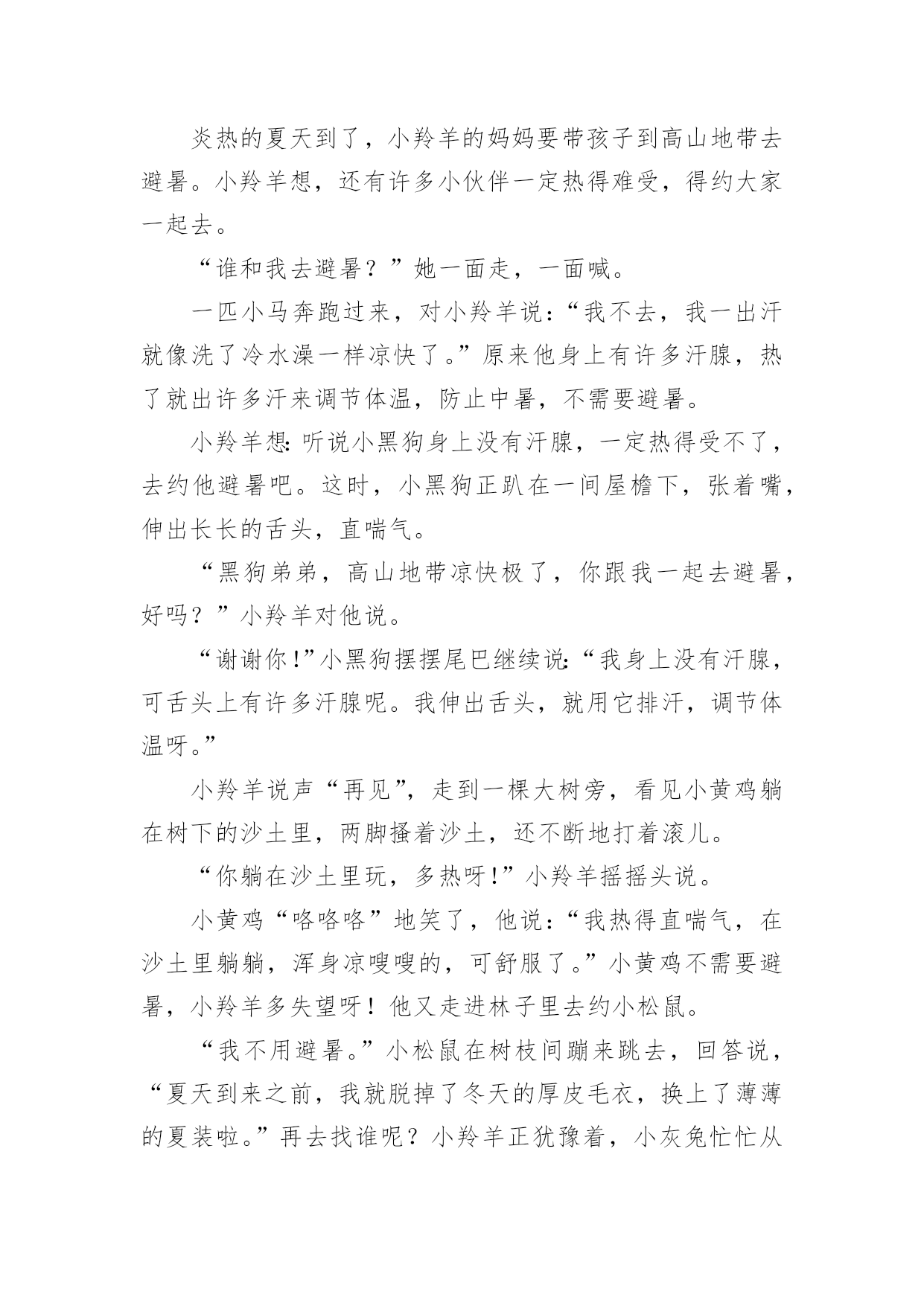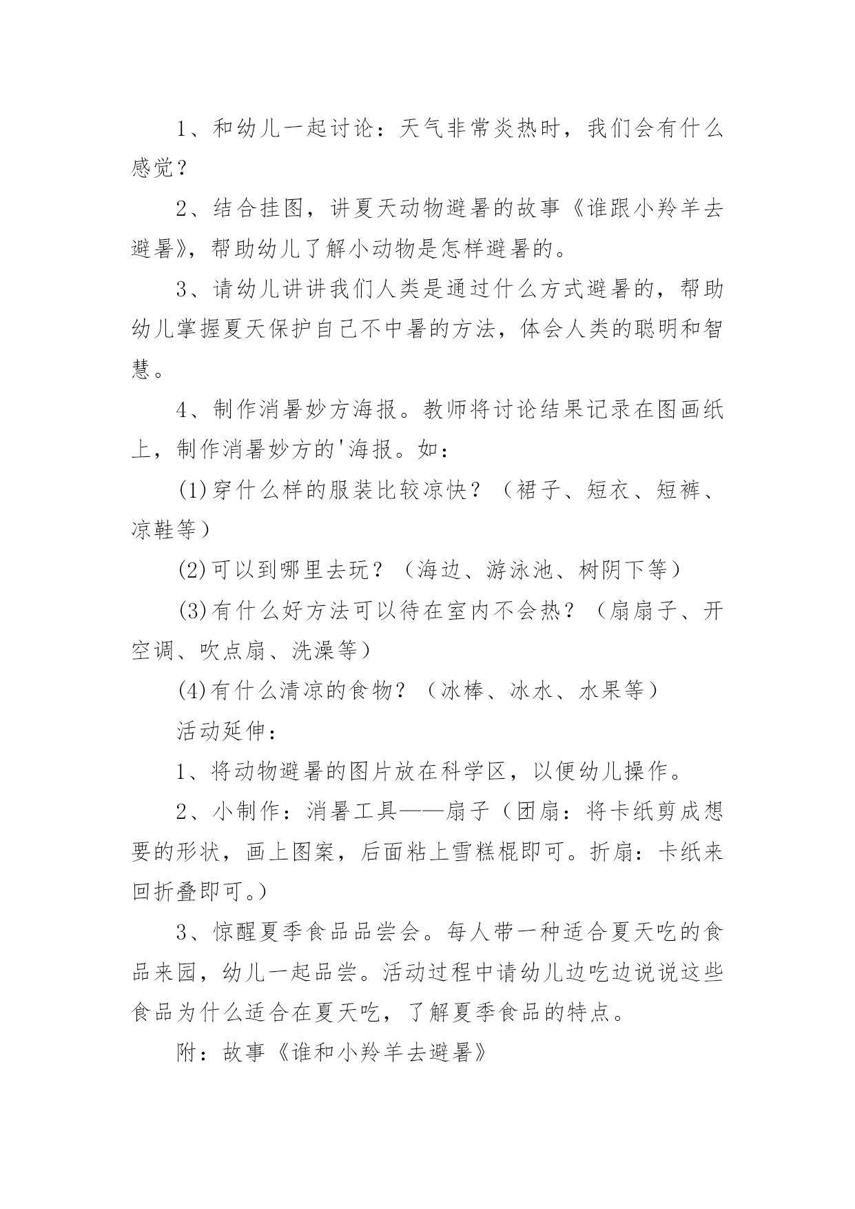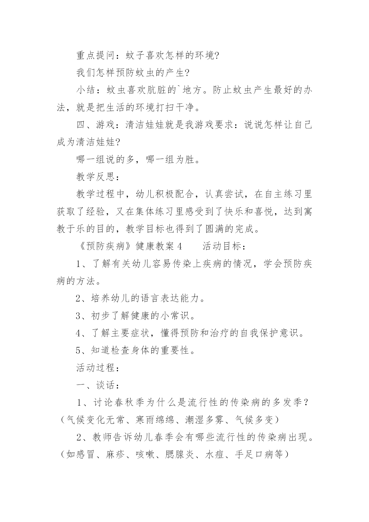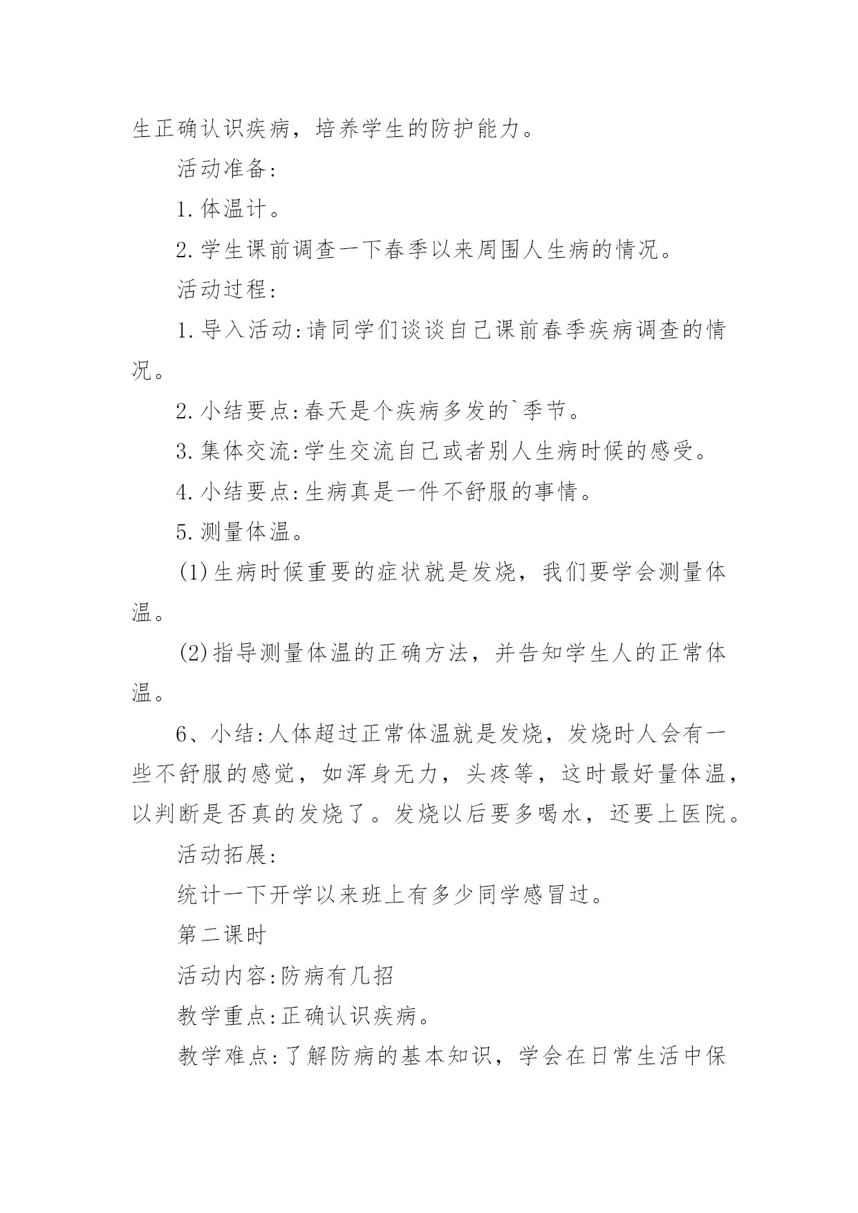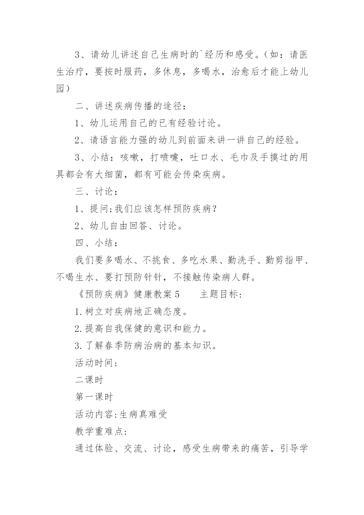 《预防疾病》健康教案《预防疾病》健康教案(精选7篇)作为一名辛苦耕耘的教育工作者,编写教案是必不可少的,编写教案有利于我们科学、合理地支配课堂时间。那么应当如何写教案呢?以下是小编帮大家整理的《预防疾病》健康教案(精选7篇),欢迎阅读与收藏。《预防疾病》健康教案1一、设计意图:春天是各种传染病流行的季节,有的孩子已有一些患传染病的体验,如水痘、腮腺炎等,所有的孩子都有大雨方针的经验。此活动旨在结合季节和孩子的生活经验,让幼儿了解有关传染病的.预防方法,增强幼儿预防疾病的意识。二、活动目标:1、了解有关春天传染病的情况,说出及画出预防疾病的方法。2、培养幼儿的表达能力。3、增强幼儿预防疾病的意识。三、活动准备:1、收集有关传染病的资料。2、张贴卫生部门有关传染病的宣传资料。3、准备材料:宣传品、纸、笔。四、过程建议:1、讨论:春天气候乍暖还寒,春雨绵绵,潮湿多雾,哪些传染病会出现?(如麻疹、咳嗽、腮腺炎、水痘等。)2、请幼儿讲述自己患传染病的经历和感受、治疗过程等。(如请医生诊治,要定时服药,多休息,多喝水,痊愈后才回幼儿园上课等。)3、讨论:疾病预防的方法。(如预防接种,多喝开水,多吃蔬菜水果,留一天起转变增减衣服,要有足够的运动和休息,保持个人的卫生清洁及进食不同营养的食物,以增强个人的抵抗能力;少到公共场所,如茶楼、电影院等。)4、将所述的预防方法用图画画出,并用简单文字写画出图画内容,制作成宣传品。5、向中、小班的幼儿介绍和讲述有关的预防方法,也可将宣传品送给他们。五、延伸提示:1、在日常生活中提醒幼儿多喝开水,多吃蔬菜水果,留意天气转变增减衣服等。2、结合打预防针,教育幼儿要勇敢。3、绘画:《打预防针》。《预防疾病》健康教案2活动目标:1、能结合已有经验,表达对夏天的感受。2、了解动物和人类夏天避暑、消暑的方法。活动准备:1、挂图《谁和小羚羊与避暑》2、图画纸。活动过程:1、和幼儿一起讨论:天气非常炎热时,我们会有什么感觉?2、结合挂图,讲夏天动物避暑的故事《谁跟小羚羊去避暑》,帮助幼儿了解小动物是怎样避暑的。3、请幼儿讲讲我们人类是通过什么方式避暑的,帮助幼儿掌握夏天保护自己不中暑的方法,体会人类的聪明和智慧。4、制作消暑妙方海报。教师将讨论结果记录在图画纸上,制作消暑妙方的'海报。如:(1)穿什么样的服装比较凉快?(裙子、短衣、短裤、凉鞋等)(2)可以到哪里去玩?(海边、游泳池、树阴下等)(3)有什么好方法可以待在室内不会热?(扇扇子、开空调、吹点扇、洗澡等)(4)有什么清凉的食物?(冰棒、冰水、水果等)活动延伸:1、将动物避暑的图片放在科学区,以便幼儿操作。2、小制作:消暑工具——扇子(团扇:将卡纸剪成想要的形状,画上图案,后面粘上雪糕棍即可。折扇:卡纸来回折叠即可。)3、惊醒夏季食品品尝会。每人带一种适合夏天吃的食品来园,幼儿一起品尝。活动过程中请幼儿边吃边说说这些食品为什么适合在夏天吃,了解夏季食品的特点。附:故事《谁和小羚羊去避暑》炎热的夏天到了,小羚羊的妈妈要带孩子到高山地带去避暑。小羚羊想,还有许多小伙伴一定热得难受,得约大家一起去。“谁和我去避暑?”她一面走,一面喊。一匹小马奔跑过来,对小羚羊说:“我不去,我一出汗就像洗了冷水澡一样凉快了。”原来他身上有许多汗腺,热了就出许多汗来调节体温,防止中暑,不需要避暑。小羚羊想:听说小黑狗身上没有汗腺,一定热得受不了,去约他避暑吧。这时,小黑狗正趴在一间屋檐下,张着嘴,伸出长长的舌头,直喘气。“黑狗弟弟,高山地带凉快极了,你跟我一起去避暑,好吗?”小羚羊对他说。“谢谢你!”小黑狗摆摆尾巴继续说:“我身上没有汗腺,可舌头上有许多汗腺呢。我伸出舌头,就用它排汗,调节体温呀。”小羚羊说声“再见”,走到一棵大树旁,看见小黄鸡躺在树下的沙土里,两脚搔着沙土,还不断地打着滚儿。“你躺在沙土里玩,多热呀!”小羚羊摇摇头说。小黄鸡“咯咯咯”地笑了,他说:“我热得直喘气,在沙土里躺躺,浑身凉嗖嗖的,可舒服了。”小黄鸡不需要避暑,小羚羊多失望呀!他又走进林子里去约小松鼠。“我不用避暑。”小松鼠在树枝间蹦来跳去,回答说,“夏天到来之前,我就脱掉了冬天的厚皮毛衣,换上了薄薄的夏装啦。”再去找谁呢?小羚羊正犹豫着,小灰兔忙忙从他面前经过,小羚羊喊住他。小灰兔摆动着两只大耳朵说:“我不想去避暑。夏天,我挺着两只大耳朵,可以散热,调节体温。”小羚羊看看没有小朋友跟他去避暑,只好跟着自己的妈妈去避暑啦!《预防疾病》健康教案3【活动目标】1、通过看看、说说,知道蚊虫会带给人们疾病。2、知道小朋友从小就要爱清洁、讲卫生。3、初步了解预防疾病的方法。4、让幼儿知道愉快有益于身体健康。【活动准备】图片【活动过程】一、出示图片:重点提问:仔细观察图片,娃娃怎么了?娃娃为何会生病?小结:原来娃娃不舒