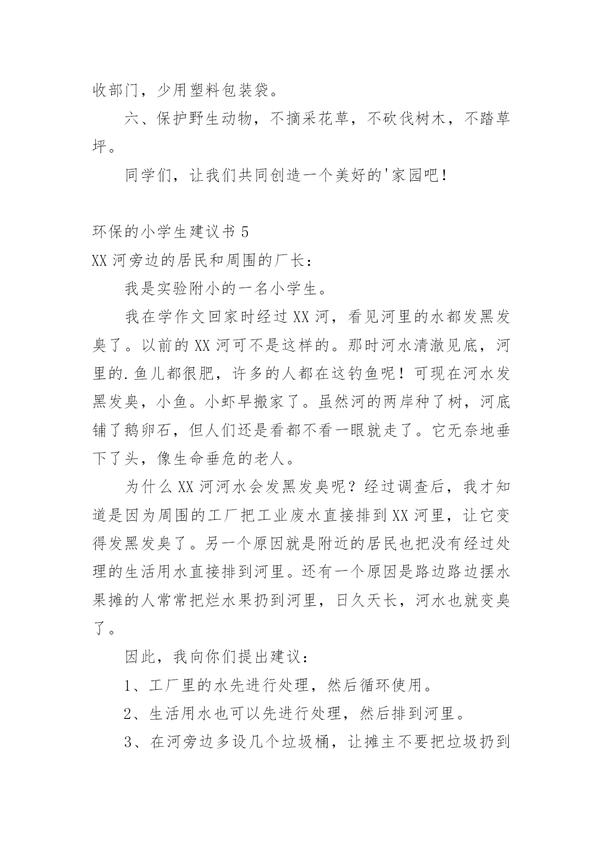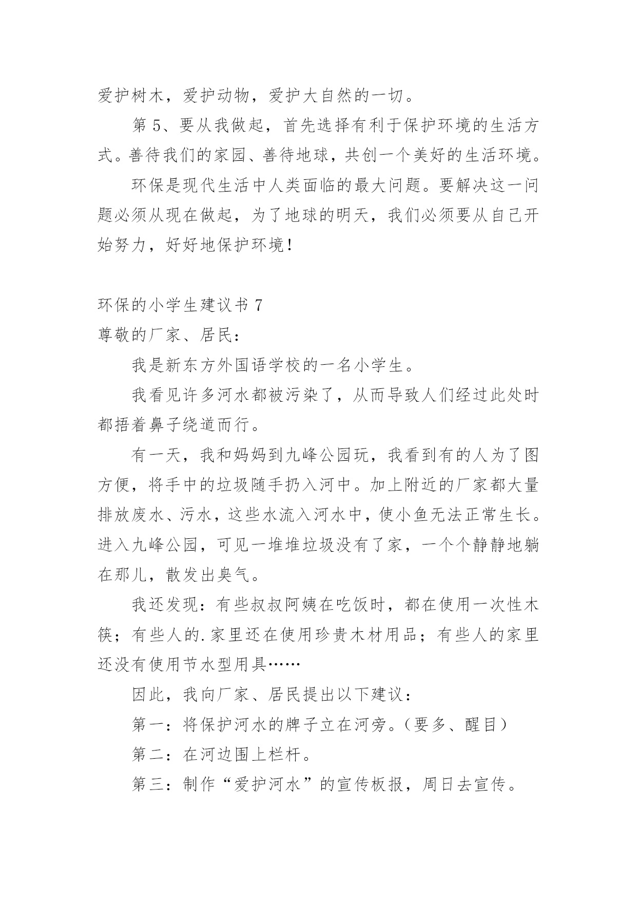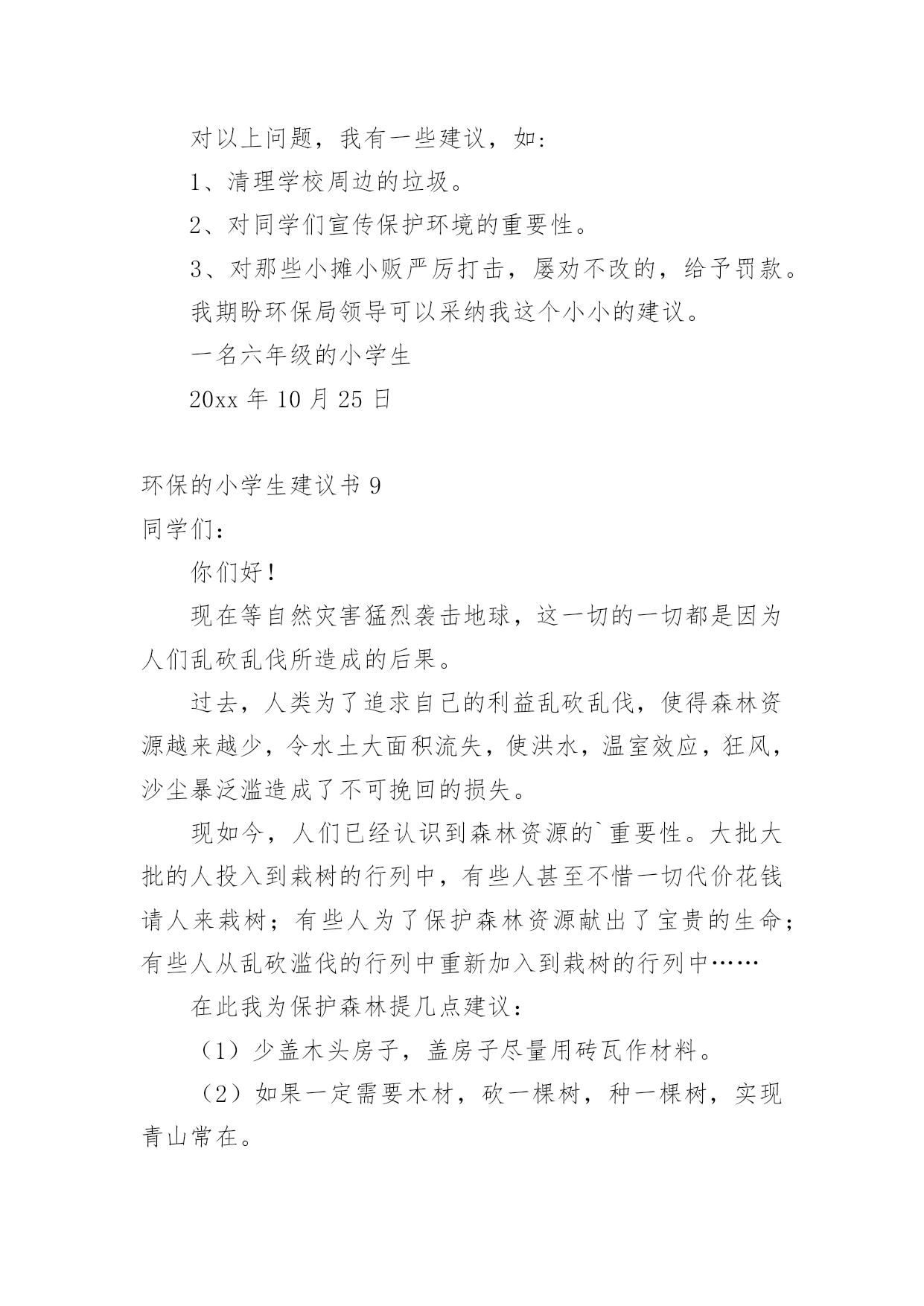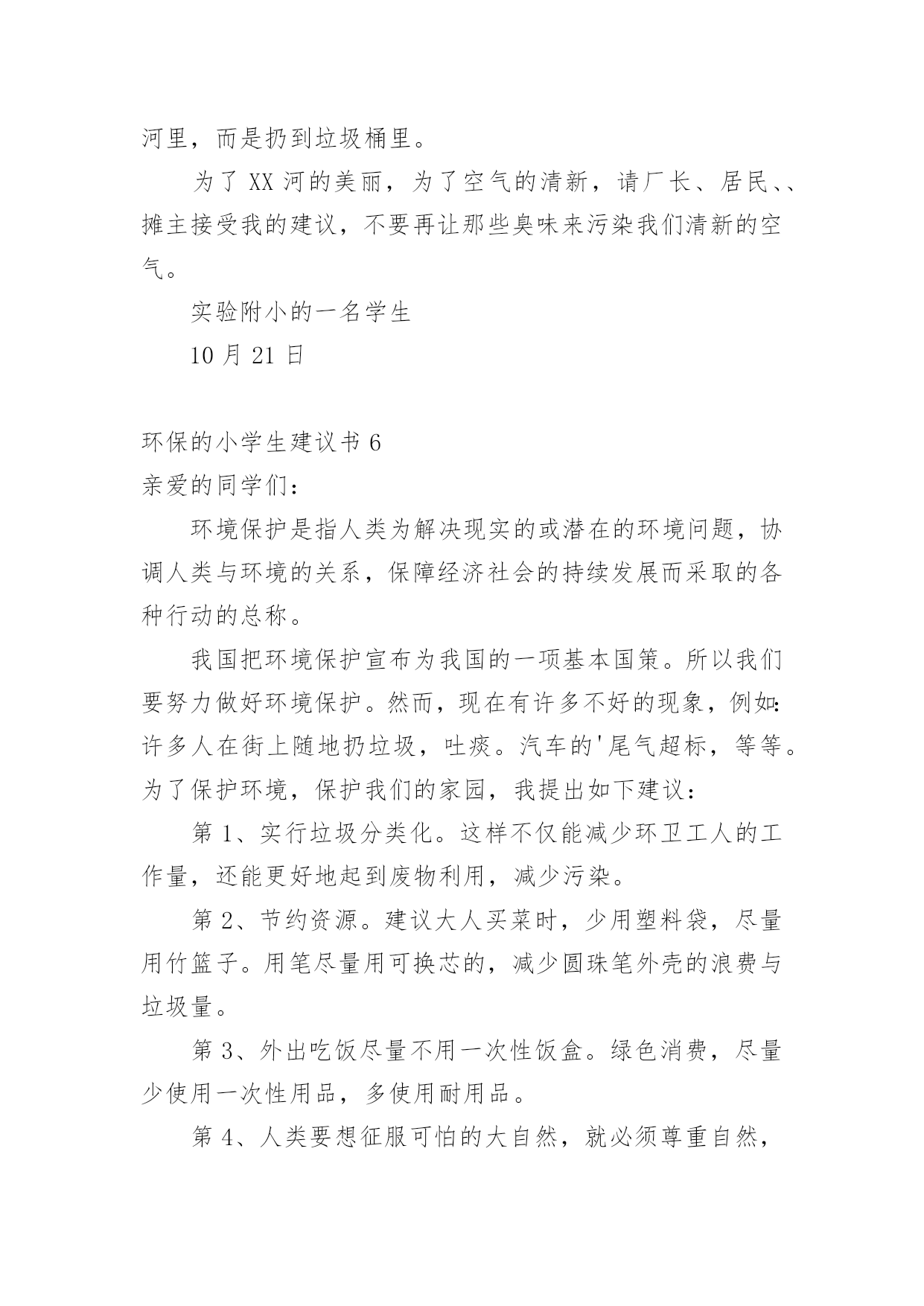 环保的小学生建议书在生活中,很多地方都会使用到建议书,建议书是个人或团体,对整体发展或某项工作,向组织提出具体建议时使用的一种书信。在写之前,可以先参考范文,以下是小编为大家整理的环保的小学生建议书,供大家参考借鉴,希望可以帮助到有需要的朋友。环保的小学生建议书1环保局的叔叔、阿姨们:您们好!我是一名六年级的学生,我和我的朋友们都渴望在一个美丽洁净的环境中生活、学习、玩耍,可是我们在现实的生活中还有一些人的环保意识不够强,给我们的`环境遭成了许多危害,比如:人们在一些公共场所中随地乱丢饮料瓶、包装袋、果皮等。一些小区不到指定的地点倒垃圾、饭店和早餐店的生活污水,心安理得的泼酒在马路……我和我的朋友们认为是大家对保护环境的重要性还不完全的充分、了解和认识环保常识,还有是环保局的工作还应要再次加大力度,因此我想给叔叔、阿姨们提几条建议:1、在小区内部增加一些垃圾桶,让我们可以随时把垃圾丢到垃圾桶内。2、制定各法规制定责令工厂处理好工业“三废”问题对不法行为的打击力度一定再加强,因为这是我们对环境的污染的罪魁祸首。3、在社区里搞一些关于保护环境的义务活动和多搞搞宣传之内的活动。环保局的叔、阿姨们拯救地球就是拯救未来,这也是我们大家共同的责任,我们会永远做人类母亲的地球,地球一定会重新换发青春!此致敬礼!环保的小学生建议书2环保局的叔叔阿姨们:你们好!我是一名小学生,我和我的小伙伴都渴望在一个美丽洁净的环境中生活、学习、玩耍。可是现实的环境,还有人们的环境意识都有很多不尽人意的地方,如:新世纪广场上人们随意丢弃饮料瓶,雪糕纸;菜市场也没有环保措施,常年发出鱼腥虾臭味;沿河工厂还是肆无忌惮的向河排放工业废水……我们生活在地球上,是地球的主人!我们有责任和义务保护地球的环境!因此我想给你们提几条建议:1.加强环境宣传,增强人们的忧患意识。2.环保是一项功在当今,造福子孙的事业,叔叔阿姨们要加强管理力度,不仅是个警示牌,挂幅标语了事!3.责令工厂处理好工业三废问题,这个力度一定很强,这是我们环境污染的最大杀手!环保局的.叔叔阿姨,保护地球,提高我们的生存质量。地球,我们这位人类的母亲会永远散发美丽,青春的!保护环境,人人有责!环保的小学生建议书3环保局的叔叔阿姨们;你们好!我是一名六年级的小学生,我和我的朋友们都渴望在一个美丽的环境下生活、学习。可是,现在的环境,已经算是被污染了。所以,环保局的叔叔阿姨们,能采纳我的建议让我们把它变得更美丽吧!地发货好地球是我们的母亲,是生命的摇篮。我们“善待地球就是善待自己”现在有许多的人破坏了环境,例如;河水中到处都是白色垃圾;大量未经处理的污水被排放到江河中;还有一点更是重要的,如果人们把碗个摔碎了,就直接扔进了垃圾桶,如果有人去清理垃圾桶时一不小心就会把手给划破了,这样会对人们带来危害的,我的建议是一但摔碎了就要捡起来用透明胶包起来,这样就不会受伤了……环保局的叔叔阿姨们;针对有些人不爱护环境的'问题,我想对您们提出以下几条建议:一、及时找人清除街道垃圾;二、街道、小巷多设些垃圾桶、垃圾车;三、要改善空气指数和人们的生活环境;四、在醒目的地方贴些标语:比如“保护环境、人人有责。地球是我家,保护靠大家。”等字样。我希望环保局的叔叔阿姨们能采纳我一点小小的建议。最后我真诚地希望污染不再走进我们的生活,让绿色永远停留在这个县城。珍惜资源、保护环境。让我们把这个县城变得更美丽吧!环保的小学生建议书4全体少先队员们:我们的地球已经伤痕累累,我们应该行动起来,保护地球。如今:大气污染、温室效应、臭氧层破坏、土地沙漠化、水污染、海洋生态危机、物种濒危、垃圾难题、人口增长等各种难题让我们困绕。所以我们应该保护环境。我提出以下意见:一、学习有关环境保护知识,收听、收看广播保护节目,阅读环境知识读物、报纸,与同学、朋友和家长讨论环境保护知识,与破坏环境的现象作斗争。二、不浪费纸张,不浪费粮食,节约用水,节约用电,节约燃料。共同节约我们有限的资源。三、把损坏的物品修理好再用,延长使用期,多用可循环再利用的物品,不用或少用一次性纸制品和木制品。四、购买有“环境标志”和“绿色标志”的物品,不吸烟,不随地吐痰,不使用还有破坏臭氧层的物品(如发胶)。五、不向下水道排放污油、丢垃圾,不向海洋、湖泊、江河,分类处理垃圾,把旧书本、报纸、饮料罐卖给废品回收部门,少用塑料包装袋。六、保护野生动物,不摘采花草,不砍伐树木,不踏草坪。同学们,让我们共同创造一个美好的'家园吧!环保的小学生建议书5XX河旁边的居民和周围的厂长:我是实验附小的一名小学生。我在学作文回家时经过XX河,看见河里的水都发黑发臭了。以前的XX河可不是这样的。那时河水清澈见底,河里的.鱼儿都很肥,许多的人都在这钓鱼呢!可现在河水发黑发臭,小鱼。小虾早搬家了。虽然河的两