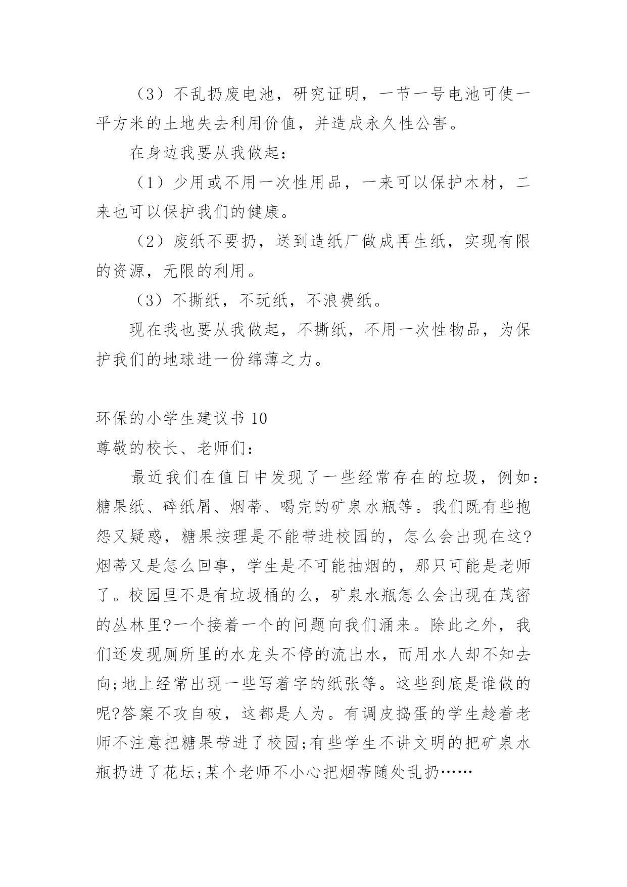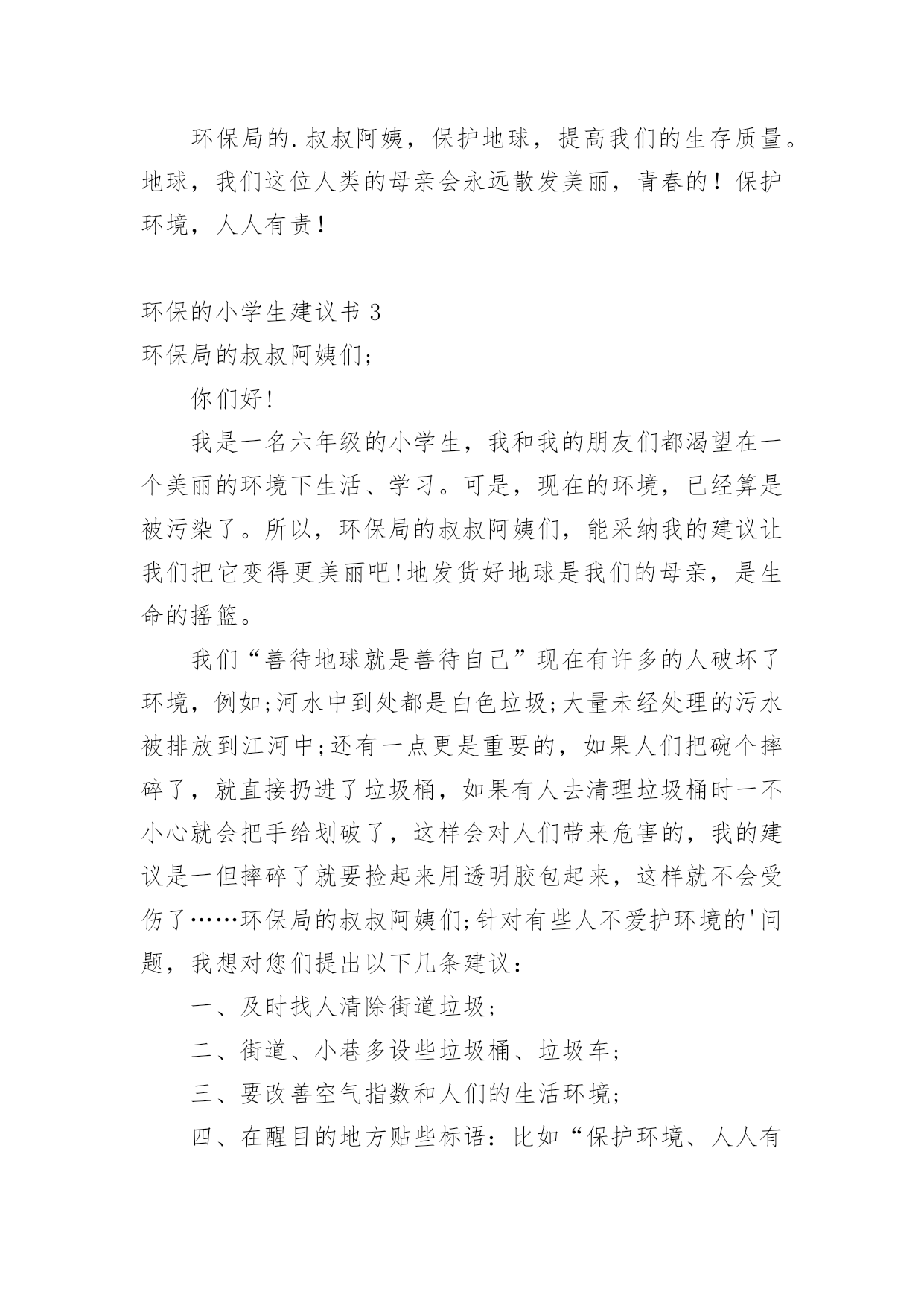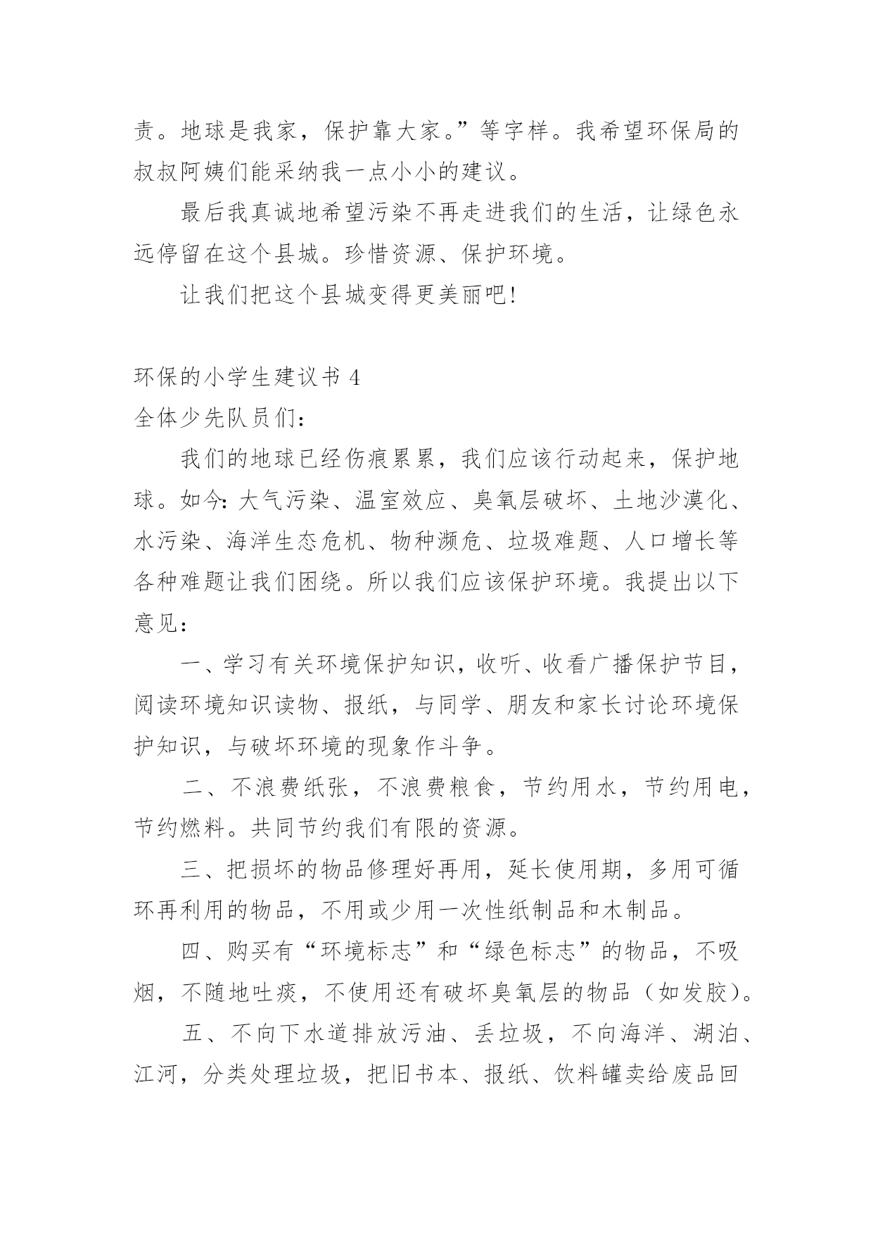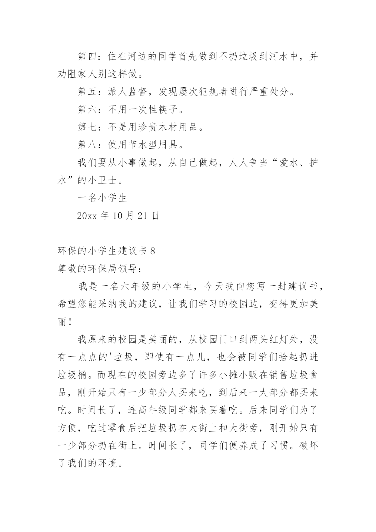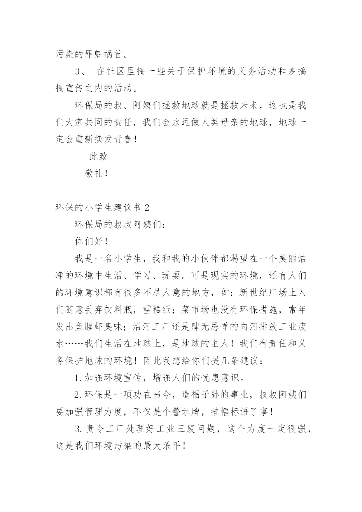 环保的小学生建议书在生活中,很多地方都会使用到建议书,建议书是个人或团体,对整体发展或某项工作,向组织提出具体建议时使用的一种书信。在写之前,可以先参考范文,以下是小编为大家整理的环保的小学生建议书,供大家参考借鉴,希望可以帮助到有需要的朋友。环保的小学生建议书1环保局的叔叔、阿姨们:您们好!我是一名六年级的学生,我和我的朋友们都渴望在一个美丽洁净的环境中生活、学习、玩耍,可是我们在现实的生活中还有一些人的环保意识不够强,给我们的`环境遭成了许多危害,比如:人们在一些公共场所中随地乱丢饮料瓶、包装袋、果皮等。一些小区不到指定的地点倒垃圾、饭店和早餐店的生活污水,心安理得的泼酒在马路……我和我的朋友们认为是大家对保护环境的重要性还不完全的充分、了解和认识环保常识,还有是环保局的工作还应要再次加大力度,因此我想给叔叔、阿姨们提几条建议:1、在小区内部增加一些垃圾桶,让我们可以随时把垃圾丢到垃圾桶内。2、制定各法规制定责令工厂处理好工业“三废”问题对不法行为的打击力度一定再加强,因为这是我们对环境的污染的罪魁祸首。3、在社区里搞一些关于保护环境的义务活动和多搞搞宣传之内的活动。环保局的叔、阿姨们拯救地球就是拯救未来,这也是我们大家共同的责任,我们会永远做人类母亲的地球,地球一定会重新换发青春!此致敬礼!环保的小学生建议书2环保局的叔叔阿姨们:你们好!我是一名小学生,我和我的小伙伴都渴望在一个美丽洁净的环境中生活、学习、玩耍。可是现实的环境,还有人们的环境意识都有很多不尽人意的地方,如:新世纪广场上人们随意丢弃饮料瓶,雪糕纸;菜市场也没有环保措施,常年发出鱼腥虾臭味;沿河工厂还是肆无忌惮的向河排放工业废水……我们生活在地球上,是地球的主人!我们有责任和义务保护地球的环境!因此我想给你们提几条建议:1.加强环境宣传,增强人们的忧患意识。2.环保是一项功在当今,造福子孙的事业,叔叔阿姨们要加强管理力度,不仅是个警示牌,挂幅标语了事!3.责令工厂处理好工业三废问题,这个力度一定很强,这是我们环境污染的最大杀手!环保局的.叔叔阿姨,保护地球,提高我们的生存质量。地球,我们这位人类的母亲会永远散发美丽,青春的!保护环境,人人有责!环保的小学生建议书3环保局的叔叔阿姨们;你们好!我是一名六年级的小学生,我和我的朋友们都渴望在一个美丽的环境下生活、学习。可是,现在的环境,已经算是被污染了。所以,环保局的叔叔阿姨们,能采纳我的建议让我们把它变得更美丽吧!地发货好地球是我们的母亲,是生命的摇篮。我们“善待地球就是善待自己”现在有许多的人破坏了环境,例如;河水中到处都是白色垃圾;大量未经处理的污水被排放到江河中;还有一点更是重要的,如果人们把碗个摔碎了,就直接扔进了垃圾桶,如果有人去清理垃圾桶时一不小心就会把手给划破了,这样会对人们带来危害的,我的建议是一但摔碎了就要捡起来用透明胶包起来,这样就不会受伤了……环保局的叔叔阿姨们;针对有些人不爱护环境的'问题,我想对您们提出以下几条建议:一、及时找人清除街道垃圾;二、街道、小巷多设些垃圾桶、垃圾车;三、要改善空气指数和人们的生活环境;四、在醒目的地方贴些标语:比如“保护环境、人人有责。地球是我家,保护靠大家。”等字样。我希望环保局的叔叔阿姨们能采纳我一点小小的建议。最后我真诚地希望污染不再走进我们的生活,让绿色永远停留在这个县城。珍惜资源、保护环境。让我们把这个县城变得更美丽吧!环保的小学生建议书4全体少先队员们:我们的地球已经伤痕累累,我们应该行动起来,保护地球。如今:大气污染、温室效应、臭氧层破坏、土地沙漠化、水污染、海洋生态危机、物种濒危、垃圾难题、人口增长等各种难题让我们困绕。所以我们应该保护环境。我提出以下意见:一、学习有关环境保护知识,收听、收看广播保护节目,阅读环境知识读物、报纸,与同学、朋友和家长讨论环境保护知识,与破坏环境的现象作斗争。二、不浪费纸张,不浪费粮食,节约用水,节约用电,节约燃料。共同节约我们有限的资源。三、把损坏的物品修理好再用,延长使用期,多用可循环再利用的物品,不用或少用一次性纸制品和木制品。四、购买有“环境标志”和“绿色标志”的物品,不吸烟,不随地吐痰,不使用还有破坏臭氧层的物品(如发胶)。五、不向下水道排放污油、丢垃圾,不向海洋、湖泊、江河,分类处理垃圾,把旧书本、报纸、饮料罐卖给废品回收部门,少用塑料包装袋。六、保护野生动物,不摘采花草,不砍伐树木,不踏草坪。同学们,让我们共同创造一个美好的'家园吧!环保的小学生建议书5XX河旁边的居民和周围的厂长:我是实验附小的一名小学生。我在学作文回家时经过XX河,看见河里的水都发黑发臭了。以前的XX河可不是这样的。那时河水清澈见底,河里的.鱼儿都很肥,许多的人都在这钓鱼呢!可现在河水发黑发臭,小鱼。小虾早搬家了。虽然河的两