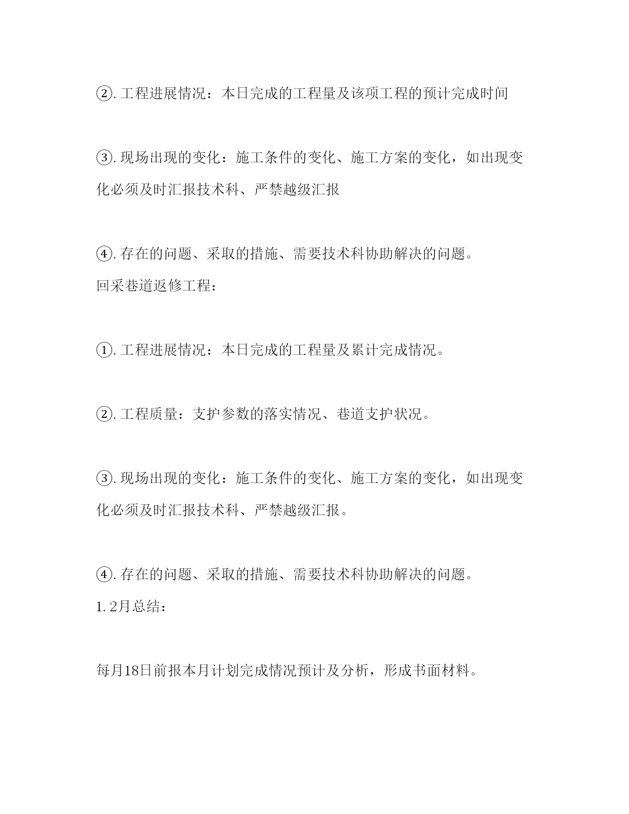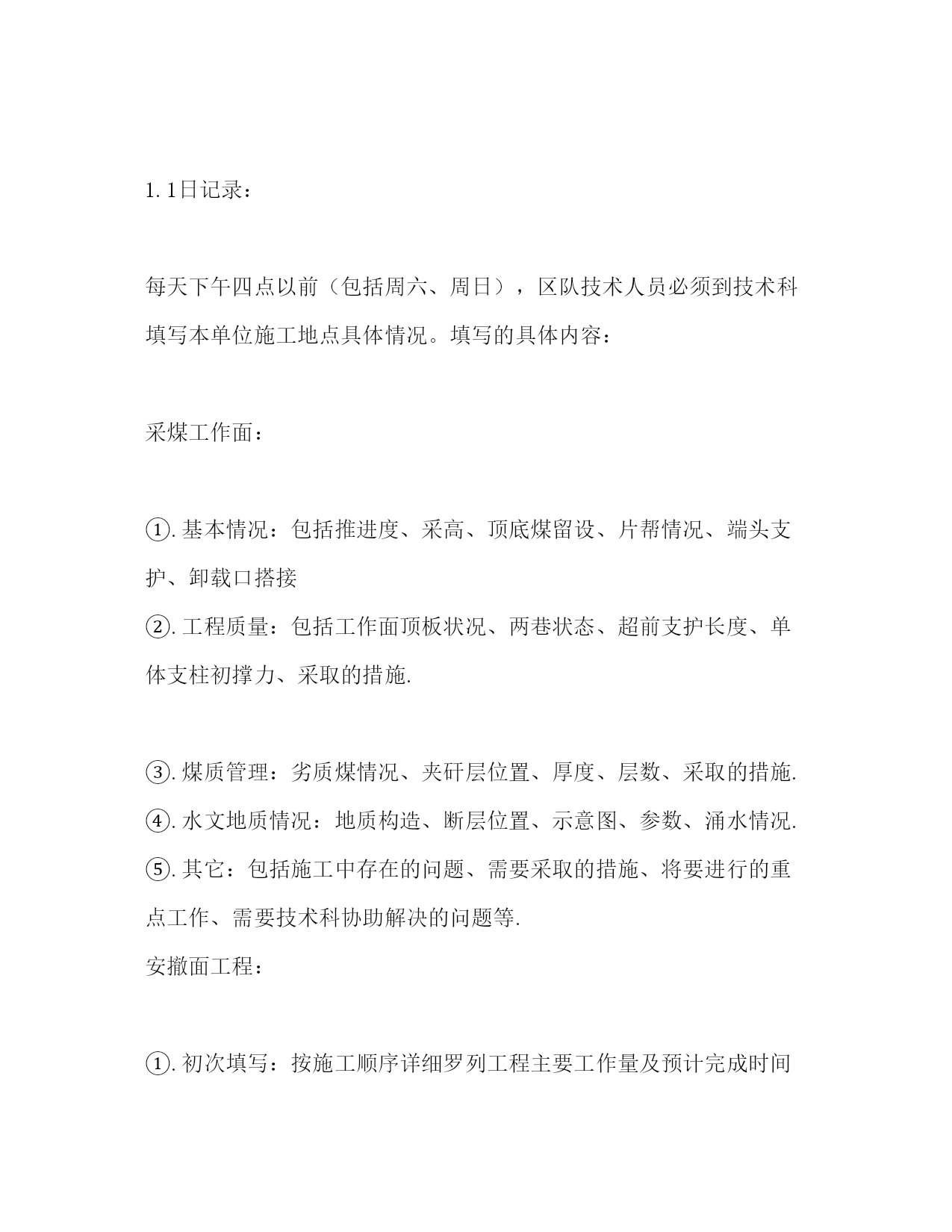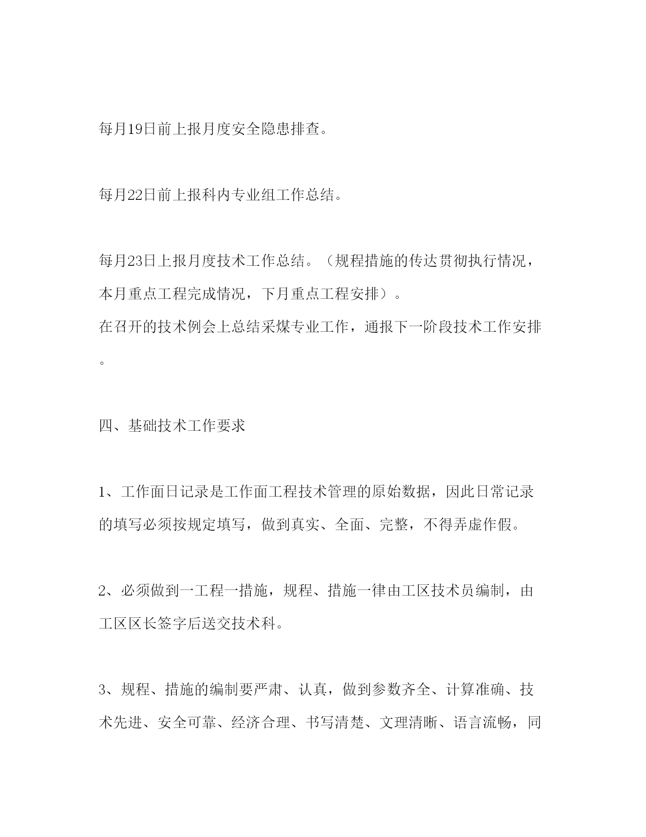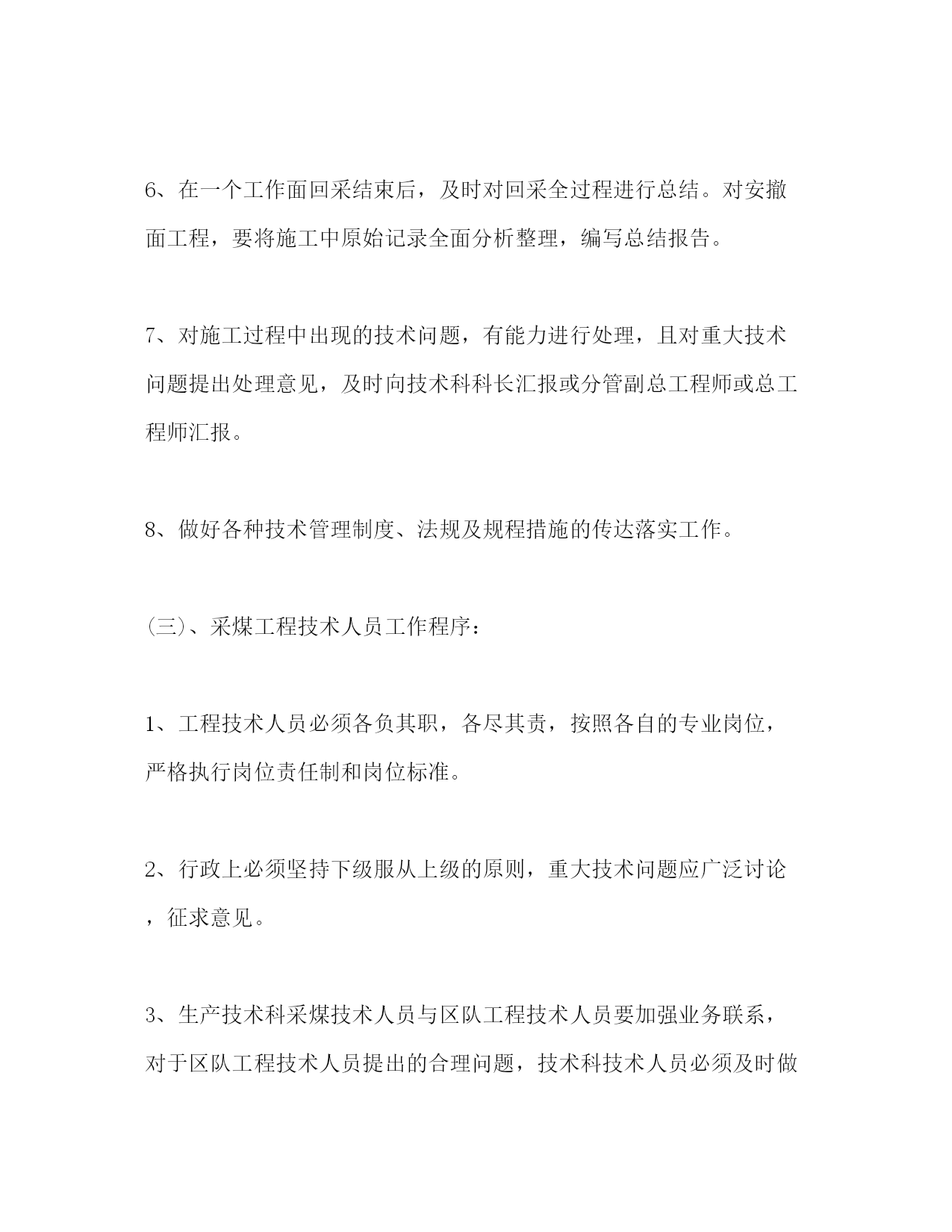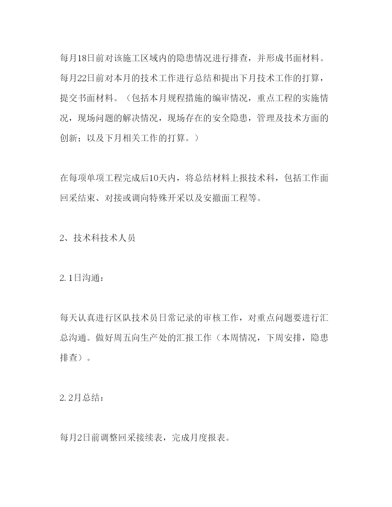 PAGE此资料由网络收集而来,如有侵权请告知上传者立即删除。资料共分享,我们负责传递知识。采煤专业技术工作总结(精选多篇)第一篇:采煤专业技术工作管理规定采煤专业技术工作管理规定一、总体工作思路为进一步完善采煤专业各项技术管理制度,加强生产技术管理,提高工程技术人员的业务水平,发挥工程技术人员的现场施工及理论指导作用,一丝不苟抓好技术工作的现场落实,培养工程技术人员的高度事业心和责任感,发挥工程技术人员独立自主的工作能力和超前的工作分析能力,使我矿的采煤技术管理水平再上一个新台阶,切实发挥出技术先导作用,经研究决定,特修改完善采煤专业工程技术员管理规定。二、工程技术人员的职责范围(一)、生产技术科采煤工程技术人员职责范围:1、参与编制矿井年、季、月度生产计划的编排,参与月末作业计划分析。2、熟悉并掌握工作面的地质情况、矿压特征,并了解掌握设计意图、工艺参数,参加对现场施工技术指导。3、掌握规程、措施的内容,督促区队对规程、措施的贯彻传达,并监督规程、措施在现场的贯彻执行,及时发现存在的问题和解决生产技术问题。4、牵头组织对矿各施工地点的作业规程与措施进行复查、审批,并及时了解各工程的进展情况,掌握重点工程各环节施工情况,超前分析,并与工区技术员落实特殊地段的技术措施。5、牵头组织对各施工地点的工程量及技术问题进行实测,制定技术方案。6、抓好新技术、新材料、新设备、新工艺的推广使用。7、及时反馈信息给矿领导,切实抓好本专业的安全技术生产。8、对矿领导下达的计划任务,及时布置实施。9、向煤业公司分月、季、年度上报采煤报表。10、负责工作面安装、撤除方案的制定、工程排队编排并绘制工作面设备安装、撤面布置图。11、牵头组织对回采作业规程的编审和各种补充措施的方案制定和审批。12、负责提出工作面对接、调面、改造等技术方案,并指导或组织施工。13、参与各类安全检查及质量标准化检查及检查之前的一些资料的准备工作。14、经常深入现场,对发现的各类异常情况,向领导汇报并提出技术方案,并在矿领导与区队之间上情下达或下情上报。15、各类规程、措施及图纸的分类保存及一些技术资料的收集保存。(二)、区队工程技术人员职责范围:1、区队工程技术人员业务上必须服从生产技术科管理,以切实做好技术指导生产;在行政上要服从区队管理,协助区队长搞好正常生产管理,在工作安排上,当技术工作与生产发生冲突时,生产要服从技术。2、熟悉并掌握回采工作面的地质情况、矿压特征,并了解掌握设计意图、1工艺参数,生产计划安排情况,并要超前考虑施工中将要遇到的问题及解决办法,切实做好现场的施工技术指导。3、掌握施工动态及工程各环节施工情况,超前分析,及时发现施工中存在的主要问题,能根据实际情况及时提出设计修改及规程措施。4、负责回采作业规程、措施的编制,掌握规程、措施内容,并做好作业规程、措施的传达、贯彻工作。5、经常深入现场及时发现存在问题和解决生产技术问题,对于现场出现的技术问题,应及时向技术科反映,共同协商解决。6、在一个工作面回采结束后,及时对回采全过程进行总结。对安撤面工程,要将施工中原始记录全面分析整理,编写总结报告。7、对施工过程中出现的技术问题,有能力进行处理,且对重大技术问题提出处理意见,及时向技术科科长汇报或分管副总工程师或总工程师汇报。8、做好各种技术管理制度、法规及规程措施的传达落实工作。(三)、采煤工程技术人员工作程序:1、工程技术人员必须各负其职,各尽其责,按照各自的专业岗位,严格执行岗位责任制和岗位标准。2、行政上必须坚持下级服从上级的原则,重大技术问题应广泛讨论,征求意见。3、生产技术科采煤技术人员与区队工程技术人员要加强业务联系,对于区队工程技术人员提出的合理问题,技术科技术人员必须及时做出反映。4、工作上遇到新情况、新问题,必须及时制定方案,限期解决,解决不了的要及时逐级汇报。5、区队工程技术人员,必须掌握主管业务范围内的有关参数并及时汇报,若发现区队有不符合要求、“三违”现象,生产技术科必须及时劝告、制止,提出处理意见,并逐级汇报。6、必须建立起原始记录本、业务联系记录本等,必须有记录图表,工程技术人员每人都必须建立并填写工作日记。三、工作内容及标准总体上要求各技术人员都按照“单位管点、部门管线、专业管面”的分工干好各自分管工作。部门技术员要发挥好职能管理和服务的作用,区队技术员要承担起能够根据现场变化及时采取有效解决措施的义务,今后对于解决现场问题的措施,要以区队技术员的先决意见作为基础来研究。1、区队技术人员1.1日记录:每天下午四点以前(包括周六、周日),区队技术人员必