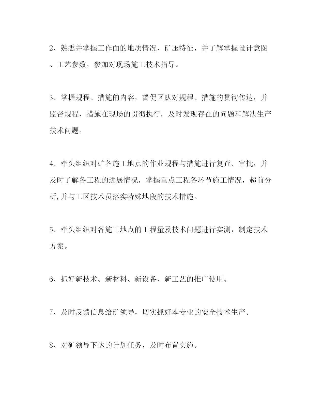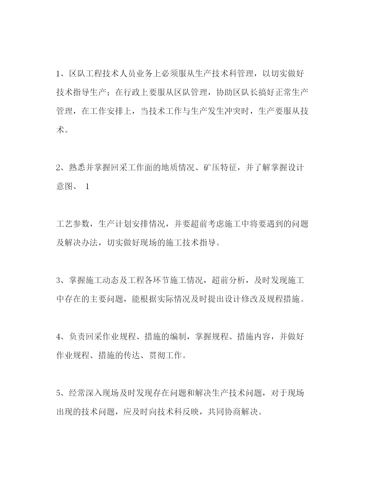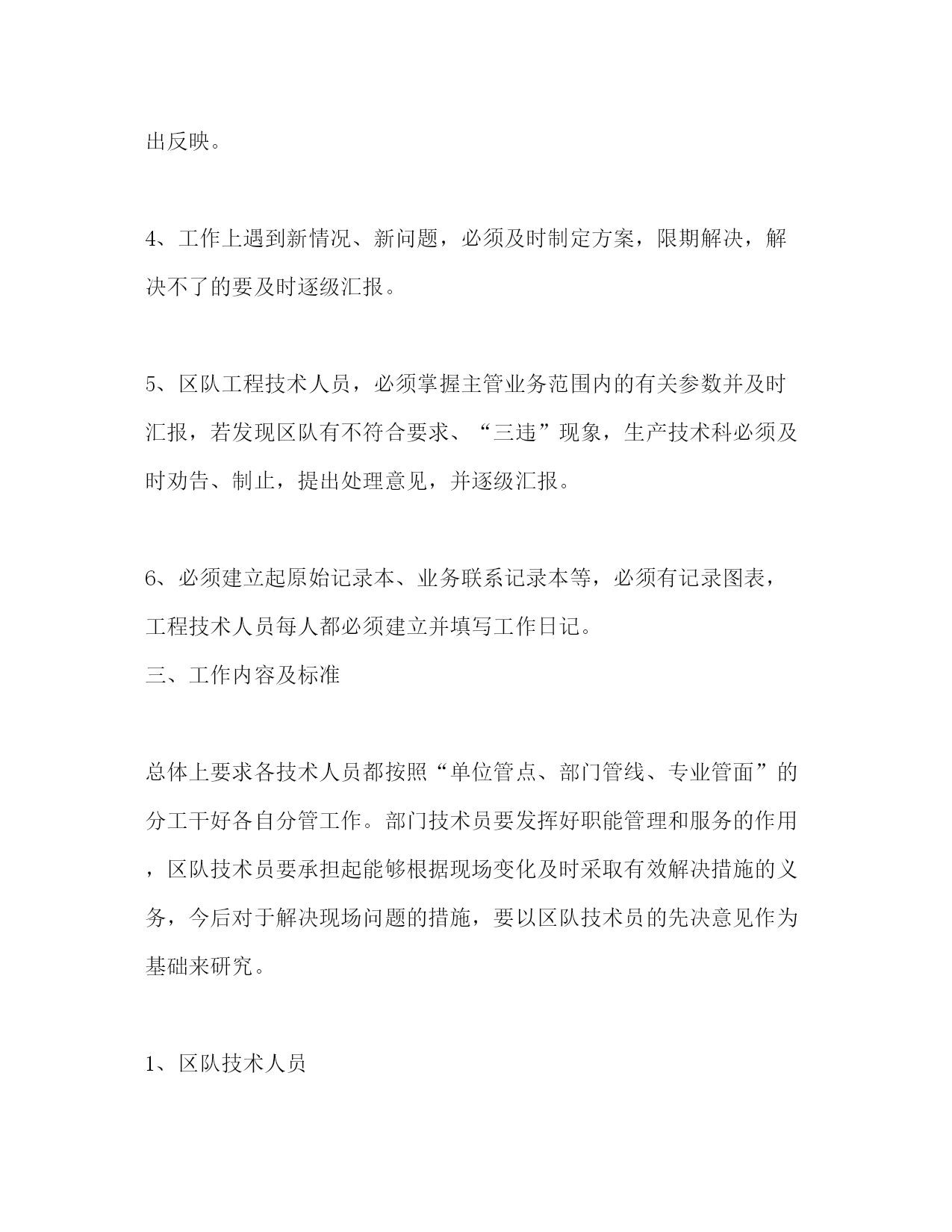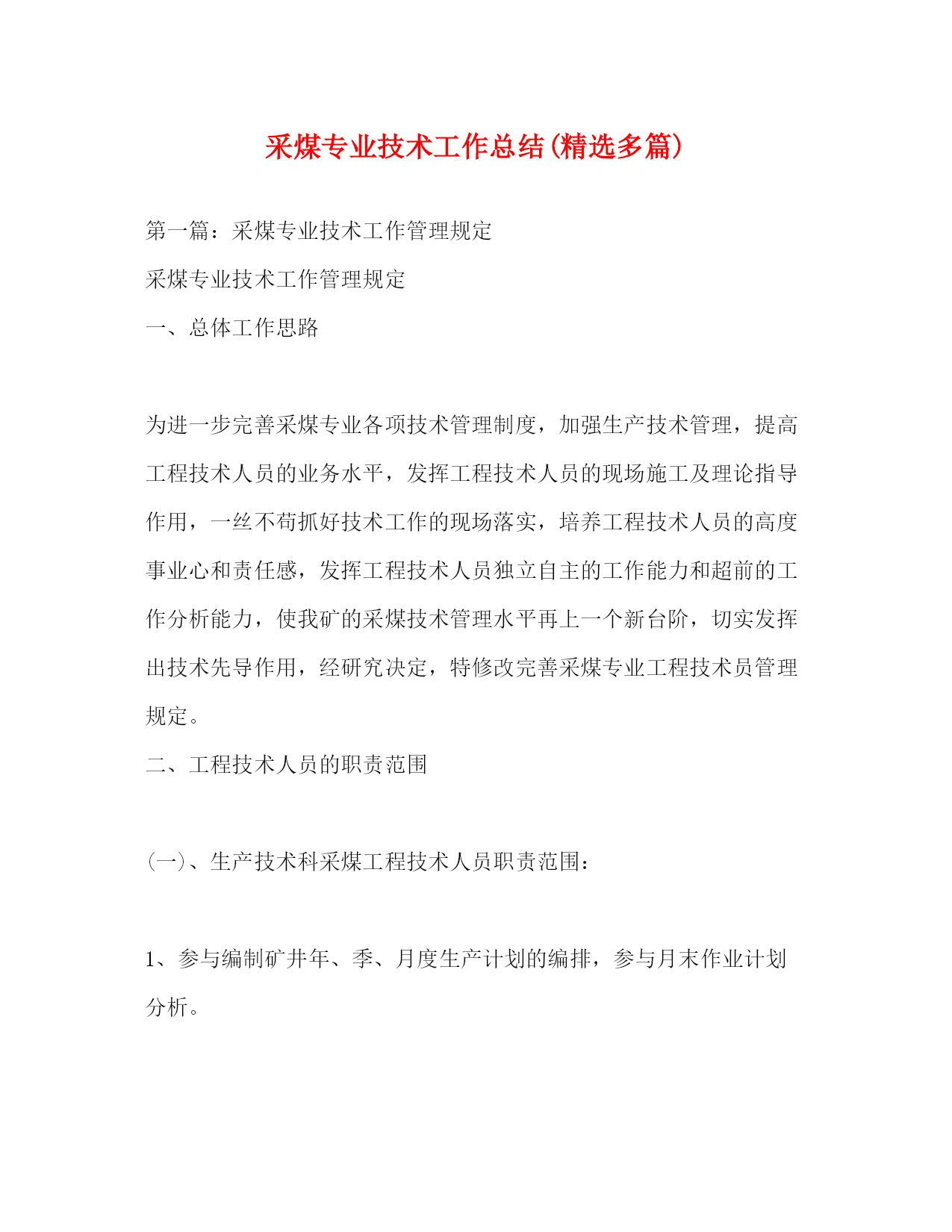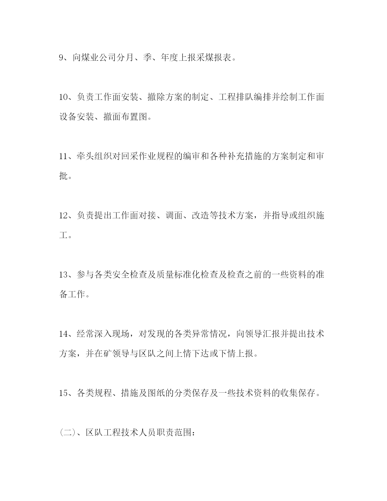 PAGE此资料由网络收集而来,如有侵权请告知上传者立即删除。资料共分享,我们负责传递知识。采煤专业技术工作总结(精选多篇)第一篇:采煤专业技术工作管理规定采煤专业技术工作管理规定一、总体工作思路为进一步完善采煤专业各项技术管理制度,加强生产技术管理,提高工程技术人员的业务水平,发挥工程技术人员的现场施工及理论指导作用,一丝不苟抓好技术工作的现场落实,培养工程技术人员的高度事业心和责任感,发挥工程技术人员独立自主的工作能力和超前的工作分析能力,使我矿的采煤技术管理水平再上一个新台阶,切实发挥出技术先导作用,经研究决定,特修改完善采煤专业工程技术员管理规定。二、工程技术人员的职责范围(一)、生产技术科采煤工程技术人员职责范围:1、参与编制矿井年、季、月度生产计划的编排,参与月末作业计划分析。2、熟悉并掌握工作面的地质情况、矿压特征,并了解掌握设计意图、工艺参数,参加对现场施工技术指导。3、掌握规程、措施的内容,督促区队对规程、措施的贯彻传达,并监督规程、措施在现场的贯彻执行,及时发现存在的问题和解决生产技术问题。4、牵头组织对矿各施工地点的作业规程与措施进行复查、审批,并及时了解各工程的进展情况,掌握重点工程各环节施工情况,超前分析,并与工区技术员落实特殊地段的技术措施。5、牵头组织对各施工地点的工程量及技术问题进行实测,制定技术方案。6、抓好新技术、新材料、新设备、新工艺的推广使用。7、及时反馈信息给矿领导,切实抓好本专业的安全技术生产。8、对矿领导下达的计划任务,及时布置实施。9、向煤业公司分月、季、年度上报采煤报表。10、负责工作面安装、撤除方案的制定、工程排队编排并绘制工作面设备安装、撤面布置图。11、牵头组织对回采作业规程的编审和各种补充措施的方案制定和审批。12、负责提出工作面对接、调面、改造等技术方案,并指导或组织施工。13、参与各类安全检查及质量标准化检查及检查之前的一些资料的准备工作。14、经常深入现场,对发现的各类异常情况,向领导汇报并提出技术方案,并在矿领导与区队之间上情下达或下情上报。15、各类规程、措施及图纸的分类保存及一些技术资料的收集保存。(二)、区队工程技术人员职责范围:1、区队工程技术人员业务上必须服从生产技术科管理,以切实做好技术指导生产;在行政上要服从区队管理,协助区队长搞好正常生产管理,在工作安排上,当技术工作与生产发生冲突时,生产要服从技术。2、熟悉并掌握回采工作面的地质情况、矿压特征,并了解掌握设计意图、1工艺参数,生产计划安排情况,并要超前考虑施工中将要遇到的问题及解决办法,切实做好现场的施工技术指导。3、掌握施工动态及工程各环节施工情况,超前分析,及时发现施工中存在的主要问题,能根据实际情况及时提出设计修改及规程措施。4、负责回采作业规程、措施的编制,掌握规程、措施内容,并做好作业规程、措施的传达、贯彻工作。5、经常深入现场及时发现存在问题和解决生产技术问题,对于现场出现的技术问题,应及时向技术科反映,共同协商解决。6、在一个工作面回采结束后,及时对回采全过程进行总结。对安撤面工程,要将施工中原始记录全面分析整理,编写总结报告。7、对施工过程中出现的技术问题,有能力进行处理,且对重大技术问题提出处理意见,及时向技术科科长汇报或分管副总工程师或总工程师汇报。8、做好各种技术管理制度、法规及规程措施的传达落实工作。(三)、采煤工程技术人员工作程序:1、工程技术人员必须各负其职,各尽其责,按照各自的专业岗位,严格执行岗位责任制和岗位标准。2、行政上必须坚持下级服从上级的原则,重大技术问题应广泛讨论,征求意见。3、生产技术科采煤技术人员与区队工程技术人员要加强业务联系,对于区队工程技术人员提出的合理问题,技术科技术人员必须及时做出反映。4、工作上遇到新情况、新问题,必须及时制定方案,限期解决,解决不了的要及时逐级汇报。5、区队工程技术人员,必须掌握主管业务范围内的有关参数并及时汇报,若发现区队有不符合要求、“三违”现象,生产技术科必须及时劝告、制止,提出处理意见,并逐级汇报。6、必须建立起原始记录本、业务联系记录本等,必须有记录图表,工程技术人员每人都必须建立并填写工作日记。三、工作内容及标准总体上要求各技术人员都按照“单位管点、部门管线、专业管面”的分工干好各自分管工作。部门技术员要发挥好职能管理和服务的作用,区队技术员要承担起能够根据现场变化及时采取有效解决措施的义务,今后对于解决现场问题的措施,要以区队技术员的先决意见作为基础来研究。1、区队技术人员1.1日记录:每天下午四点以前(包括周六、周日),区队技术人员必