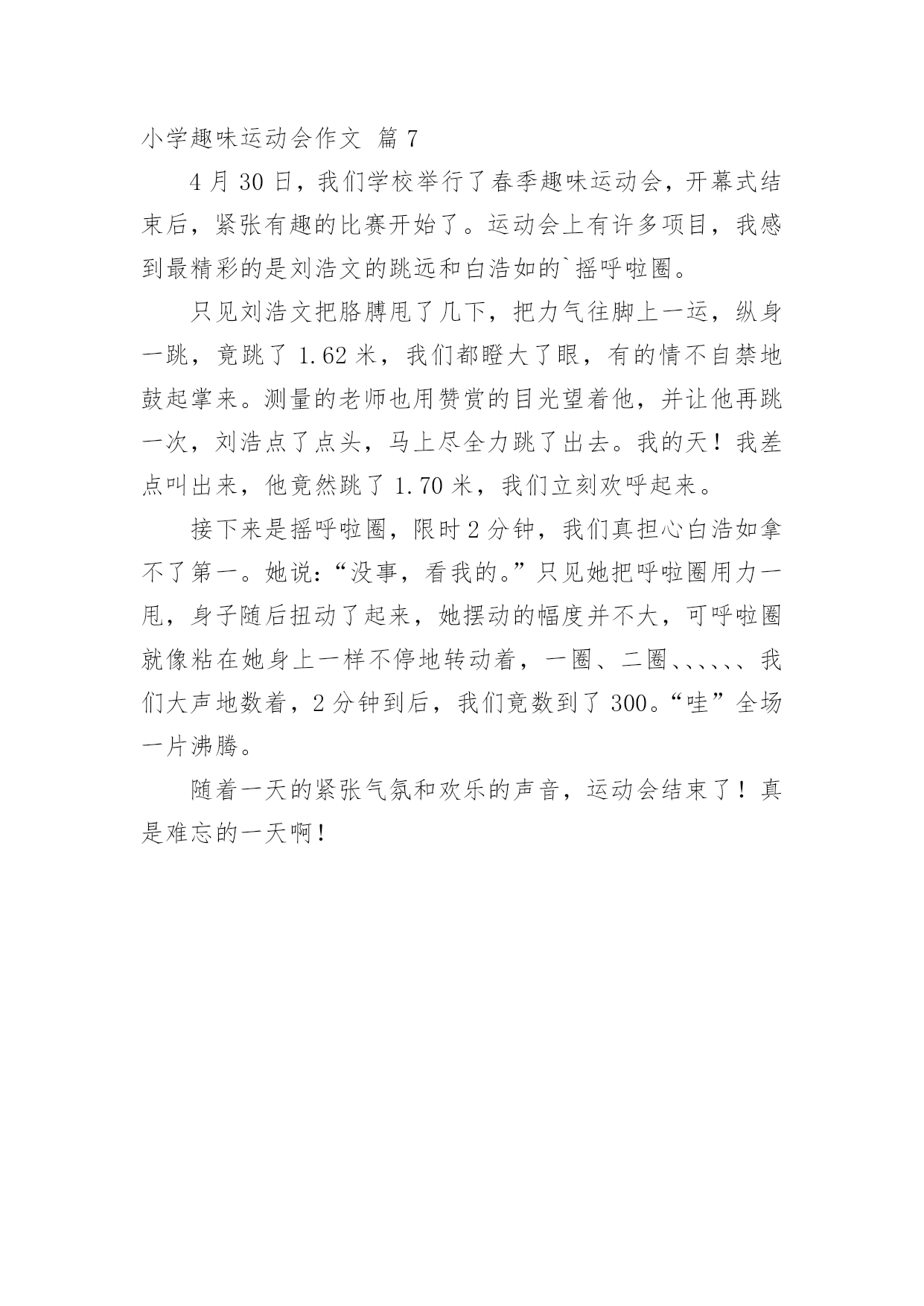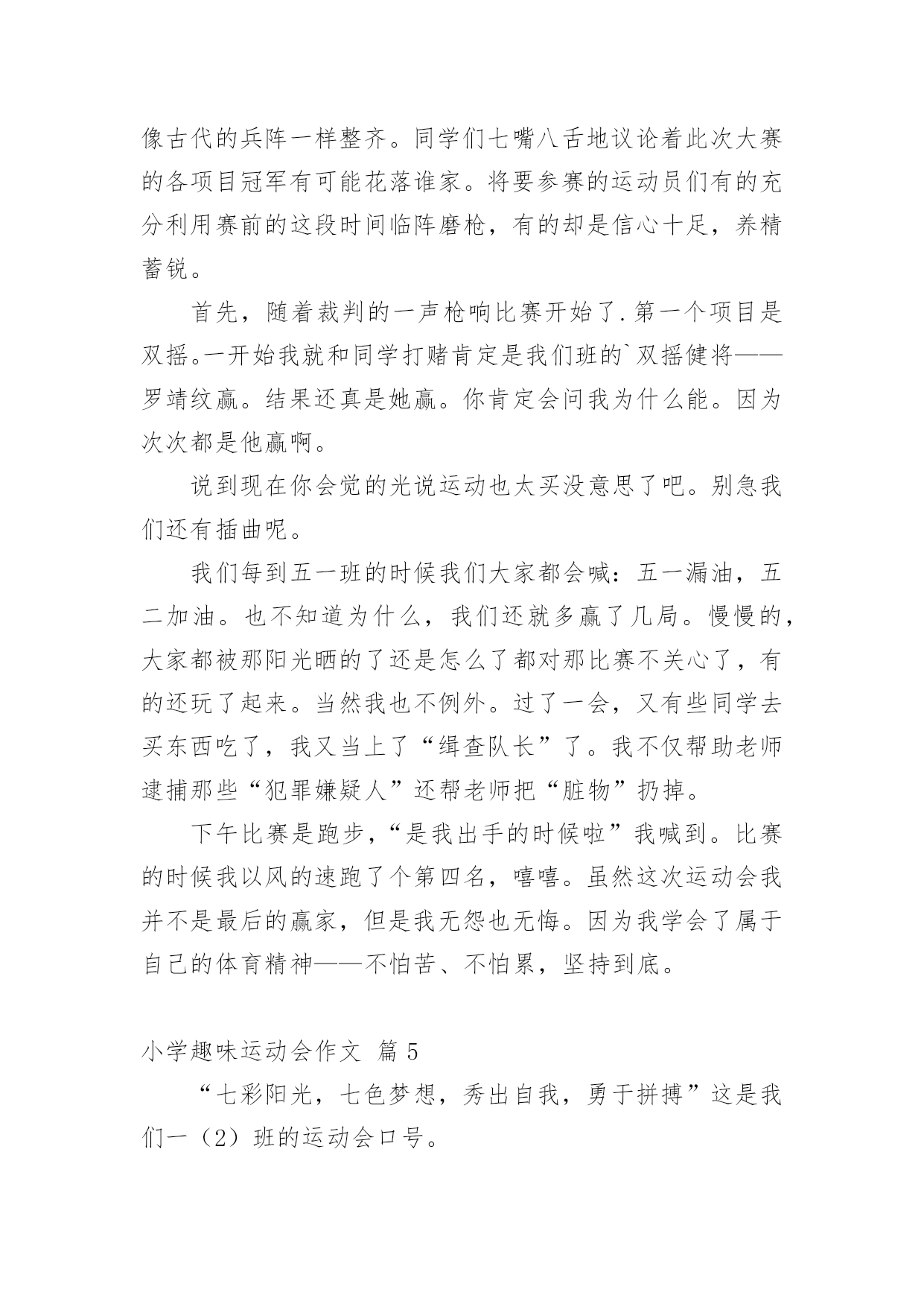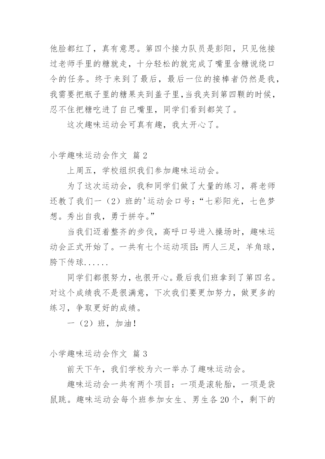 小学趣味运动会作文【精选】小学趣味运动会作文锦集7篇无论是身处学校还是步入社会,大家都尝试过写作文吧,作文是经过人的思想考虑和语言组织,通过文字来表达一个主题意义的记叙方法。还是对作文一筹莫展吗?以下是小编为大家整理的小学趣味运动会作文7篇,希望能够帮助到大家。小学趣味运动会作文篇1今天,老师说我们班要举行了一场趣味运动会。我们都十分好奇,也十分兴奋,想看看这个趣味运动会到底是怎么玩的。老师把游戏规则讲解完后,便把我们班同学分成了两组让我们来比拼,首先上场的是我们组。老师先让我在教室后面原地转了6圈,然后我便脑袋晕晕的按着组员的.指示走到教室前面去剥桂圆。我赶忙拿起了桂圆用力的剥,但是桂圆好像在跟我作对一样偏不破壳,正当我急得不知怎么办的时候,突然有人在旁边喊“用脚踩!用脚踩!”我连忙把桂圆丢到地上用力地踩,几秒钟就把桂圆都踩扁了。我连忙又去接力下一位组员,第二个出发的是彭锦豪,他负责运乒乓球,他不知道是紧张还是怎么,总是把乒乓球掉下去,浪费了很多时间。到了第三棒,我们组的李长江也需要和我一样完成剥坚果的任务,他学着我之前的样子,十分用劲,我看他脸都红了,真有意思。第四个接力队员是彭阳,只见他接过老师手里的糖就走,十分轻松的就完成了嘴里含糖说绕口令的任务。终于来到了最后,最后一位的接棒者仍然是我,我需要把瓶子里的糖果夹到盖子里,当我夹到第四颗的时候,忍不住把糖吃进了自己嘴里,同学们看到都笑了。这次趣味运动会可真有趣,我太开心了。小学趣味运动会作文篇2上周五,学校组织我们参加趣味运动会。为了这次运动会,我和同学们做了大量的练习,蒋老师还教了我们一(2)班的'运动会口号:“七彩阳光,七色梦想。秀出自我,勇于拼夺。”当我们迈着整齐的步伐,高呼口号进入操场时,趣味运动会正式开始了。一共有七个运动项目:两人三足,羊角球,胯下传球......同学们都很努力,也很开心。最后我们班拿到了第四名。对这个成绩我不是很满意,下次我们要更加努力,做更多的练习,争取更好的成绩。一(2)班,加油!小学趣味运动会作文篇3前天下午,我们学校为六一举办了趣味运动会。趣味运动会一共有两个项目:一项是滚轮胎,一项是袋鼠跳。趣味运动会每个班参加女生、男生各20个,剩下的人就成了给我们加油的拉拉队了。首先比赛的项目是滚轮胎。哨声一响,第一个队员就滚起轮胎向前奔,我们后面的队员与拉拉队也扯着嗓子喊“加油、加油”。可能是因为受我们的影响,第一个队员顺利地将轮胎滚到了对面的男生队里。轮到肖瑶上场时,肖瑶不知怎么的,把轮胎滚得越来越斜,那轮胎就像一个调皮的小男孩,跑出了十万八千里,差点都跑到最边上了,肖瑶连忙与(接应的)男生一起把轮胎拉回正确的轨道上。轮到乔一冉了,一开始她滚得一点也不斜,我们都为她高兴。可是,到中间的时候,她的轮胎扭来扭去,好像在跳芭蕾舞,她想把它摆正,可来不及了,轮胎还是倒在了地上,就像一个赖皮的孩子躺在地上不起来,她连忙把它扶起来,继续往前走。轮到我了,我看到前面的队员有的把轮胎弄倒,有的把轮胎滚斜,我心里不禁有些紧张。我小心翼翼地向前滚着轮胎,生怕把它弄倒或弄斜。一开始,我滚得很顺利,可是后来,我渐渐也斜了一点。(这时)正好三四班有一个男生也滚斜了,正对着向我滚来。眼看我俩就要撞上了,我用尽身上所有的力气想让轮胎减速,可还是撞上了。他的轮胎在地上蹦了一下,便昏倒在地上了,我的轮胎呢,因为我及时减速,所以安然无恙。我赶紧滚着轮胎继续往前走。接下来比赛的是袋鼠跳。比赛之前,我们隐隐约约听到了广播说:“麻袋……跳……”我们不禁有些担心:如果拿着麻袋跳的话,那么不是很容易摔倒吗?我的'心里面突然蹦出了一个奇妙的想法:会不会是在麻袋里装了一只真袋鼠宝宝,系在我们的腰上,让我们当一次袋鼠妈妈呢?到了比赛开始时我们才知道,这个项目是用麻袋般的东西套着自己的双腿,双手拉着那个“麻袋”的边缘,靠双脚蹦到终点。轮到高瞻航时,他蹦着蹦着摔倒了。但他坚强地爬起来,继续往前蹦。他那种精神值得我们学习,我们不仅没有嘲笑他,反而把掌声鼓得更激烈了。轮到我的时候,我本以为很容易。一开始,由于我把“麻袋”拉得太用力,所以又紧又难受,一点也不容易。我把它松了一点,才不那么难受了。我好不容易到了终点,可那“麻袋”却不想离开我的腿,我费了好大的劲才把它弄下来。其实,(当我与那个男孩撞在一起的时候,)我本想把那个跟我撞上的男孩吵一顿,可我转念一想,友谊第一,比赛第二,何必怪他呢?还是算了吧。通过我们班同学们的共同努力,滚轮胎我们得了第一名,袋鼠跳我们得了第三名,我真为我们班而感到自豪啊!这真是一次难忘的趣味运动会啊!小学趣味运动会作文篇4你知道吗?今天,我们学校举行了一场别开生面的运动会,没想到运动会还可以有这样有趣。运动会还没开始,操场上的观众已是人山人海,而且还像古代的兵阵一样整齐。同