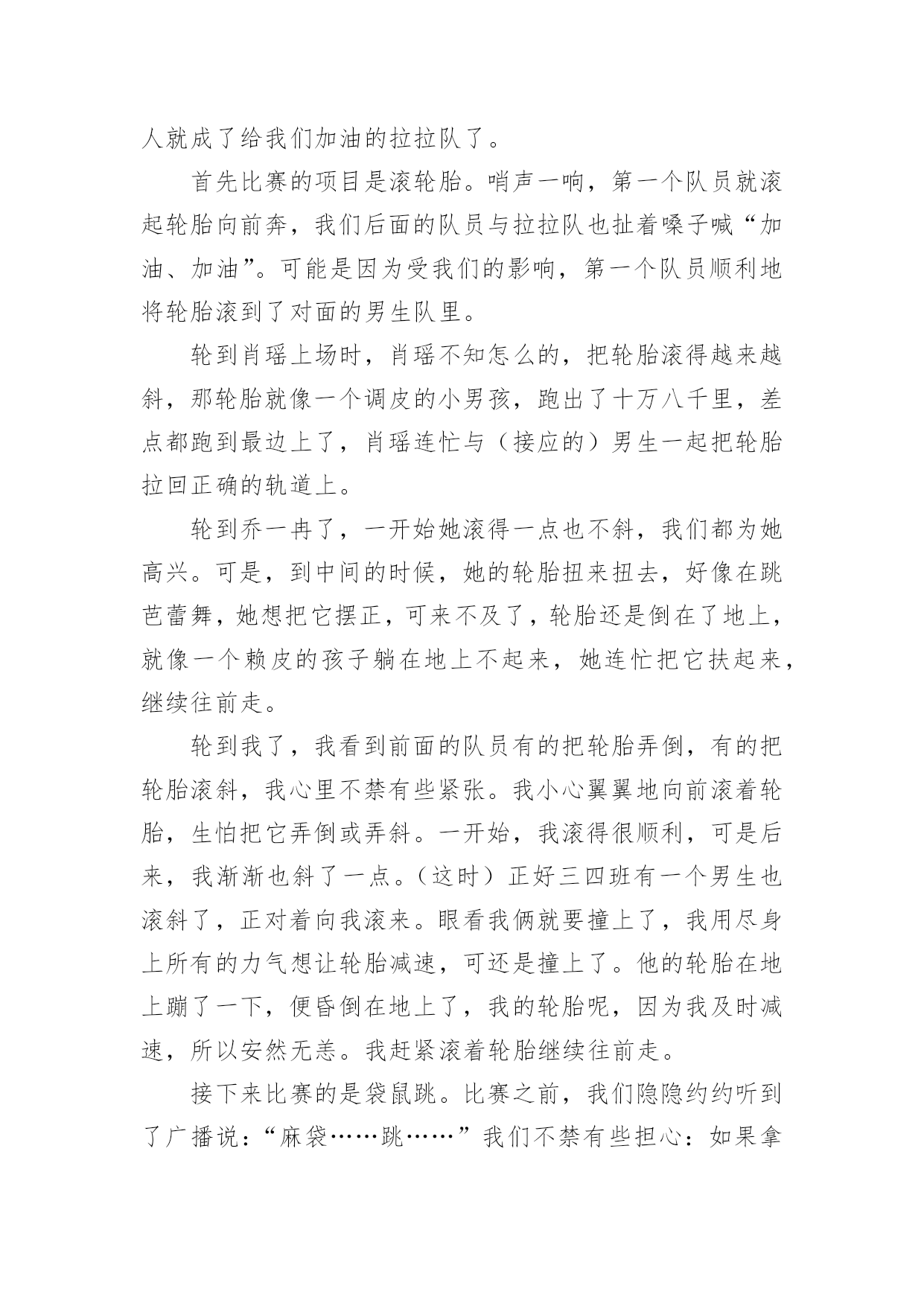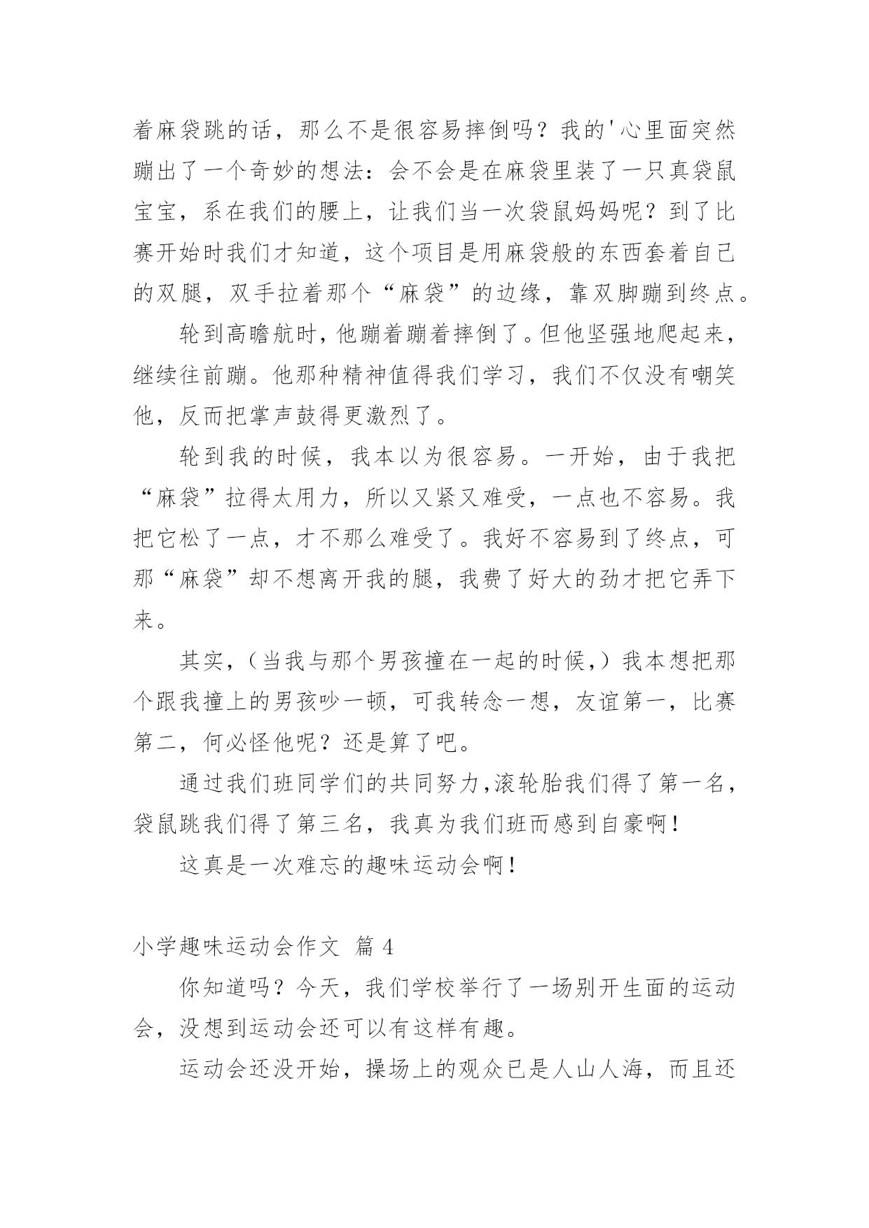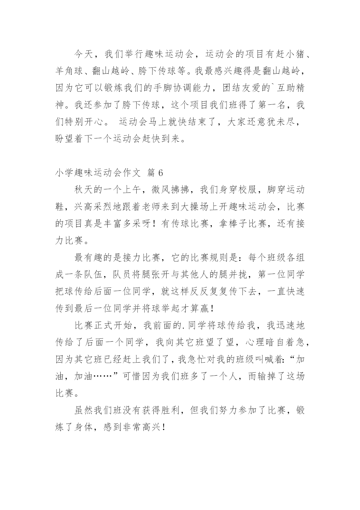小学趣味运动会作文【精选】小学趣味运动会作文锦集7篇无论是身处学校还是步入社会,大家都尝试过写作文吧,作文是经过人的思想考虑和语言组织,通过文字来表达一个主题意义的记叙方法。还是对作文一筹莫展吗?以下是小编为大家整理的小学趣味运动会作文7篇,希望能够帮助到大家。小学趣味运动会作文篇1今天,老师说我们班要举行了一场趣味运动会。我们都十分好奇,也十分兴奋,想看看这个趣味运动会到底是怎么玩的。老师把游戏规则讲解完后,便把我们班同学分成了两组让我们来比拼,首先上场的是我们组。老师先让我在教室后面原地转了6圈,然后我便脑袋晕晕的按着组员的.指示走到教室前面去剥桂圆。我赶忙拿起了桂圆用力的剥,但是桂圆好像在跟我作对一样偏不破壳,正当我急得不知怎么办的时候,突然有人在旁边喊“用脚踩!用脚踩!”我连忙把桂圆丢到地上用力地踩,几秒钟就把桂圆都踩扁了。我连忙又去接力下一位组员,第二个出发的是彭锦豪,他负责运乒乓球,他不知道是紧张还是怎么,总是把乒乓球掉下去,浪费了很多时间。到了第三棒,我们组的李长江也需要和我一样完成剥坚果的任务,他学着我之前的样子,十分用劲,我看他脸都红了,真有意思。第四个接力队员是彭阳,只见他接过老师手里的糖就走,十分轻松的就完成了嘴里含糖说绕口令的任务。终于来到了最后,最后一位的接棒者仍然是我,我需要把瓶子里的糖果夹到盖子里,当我夹到第四颗的时候,忍不住把糖吃进了自己嘴里,同学们看到都笑了。这次趣味运动会可真有趣,我太开心了。小学趣味运动会作文篇2上周五,学校组织我们参加趣味运动会。为了这次运动会,我和同学们做了大量的练习,蒋老师还教了我们一(2)班的'运动会口号:“七彩阳光,七色梦想。秀出自我,勇于拼夺。”当我们迈着整齐的步伐,高呼口号进入操场时,趣味运动会正式开始了。一共有七个运动项目:两人三足,羊角球,胯下传球......同学们都很努力,也很开心。最后我们班拿到了第四名。对这个成绩我不是很满意,下次我们要更加努力,做更多的练习,争取更好的成绩。一(2)班,加油!小学趣味运动会作文篇3前天下午,我们学校为六一举办了趣味运动会。趣味运动会一共有两个项目:一项是滚轮胎,一项是袋鼠跳。趣味运动会每个班参加女生、男生各20个,剩下的人就成了给我们加油的拉拉队了。首先比赛的项目是滚轮胎。哨声一响,第一个队员就滚起轮胎向前奔,我们后面的队员与拉拉队也扯着嗓子喊“加油、加油”。可能是因为受我们的影响,第一个队员顺利地将轮胎滚到了对面的男生队里。轮到肖瑶上场时,肖瑶不知怎么的,把轮胎滚得越来越斜,那轮胎就像一个调皮的小男孩,跑出了十万八千里,差点都跑到最边上了,肖瑶连忙与(接应的)男生一起把轮胎拉回正确的轨道上。轮到乔一冉了,一开始她滚得一点也不斜,我们都为她高兴。可是,到中间的时候,她的轮胎扭来扭去,好像在跳芭蕾舞,她想把它摆正,可来不及了,轮胎还是倒在了地上,就像一个赖皮的孩子躺在地上不起来,她连忙把它扶起来,继续往前走。轮到我了,我看到前面的队员有的把轮胎弄倒,有的把轮胎滚斜,我心里不禁有些紧张。我小心翼翼地向前滚着轮胎,生怕把它弄倒或弄斜。一开始,我滚得很顺利,可是后来,我渐渐也斜了一点。(这时)正好三四班有一个男生也滚斜了,正对着向我滚来。眼看我俩就要撞上了,我用尽身上所有的力气想让轮胎减速,可还是撞上了。他的轮胎在地上蹦了一下,便昏倒在地上了,我的轮胎呢,因为我及时减速,所以安然无恙。我赶紧滚着轮胎继续往前走。接下来比赛的是袋鼠跳。比赛之前,我们隐隐约约听到了广播说:“麻袋……跳……”我们不禁有些担心:如果拿着麻袋跳的话,那么不是很容易摔倒吗?我的'心里面突然蹦出了一个奇妙的想法:会不会是在麻袋里装了一只真袋鼠宝宝,系在我们的腰上,让我们当一次袋鼠妈妈呢?到了比赛开始时我们才知道,这个项目是用麻袋般的东西套着自己的双腿,双手拉着那个“麻袋”的边缘,靠双脚蹦到终点。轮到高瞻航时,他蹦着蹦着摔倒了。但他坚强地爬起来,继续往前蹦。他那种精神值得我们学习,我们不仅没有嘲笑他,反而把掌声鼓得更激烈了。轮到我的时候,我本以为很容易。一开始,由于我把“麻袋”拉得太用力,所以又紧又难受,一点也不容易。我把它松了一点,才不那么难受了。我好不容易到了终点,可那“麻袋”却不想离开我的腿,我费了好大的劲才把它弄下来。其实,(当我与那个男孩撞在一起的时候,)我本想把那个跟我撞上的男孩吵一顿,可我转念一想,友谊第一,比赛第二,何必怪他呢?还是算了吧。通过我们班同学们的共同努力,滚轮胎我们得了第一名,袋鼠跳我们得了第三名,我真为我们班而感到自豪啊!这真是一次难忘的趣味运动会啊!小学趣味运动会作文篇4你知道吗?今天,我们学校举行了一场别开生面的运动会,没想到运动会还可以有这样有趣。运动会还没开始,操场上的观众已是人山人海,而且还像古代的兵阵一样整齐。同