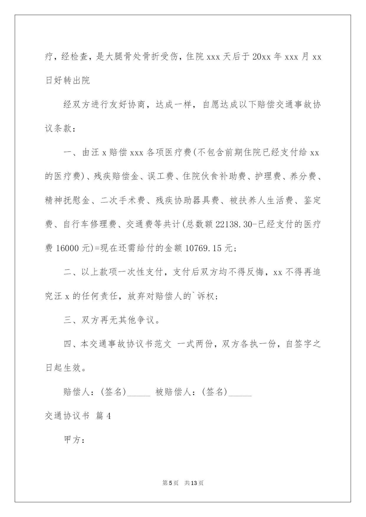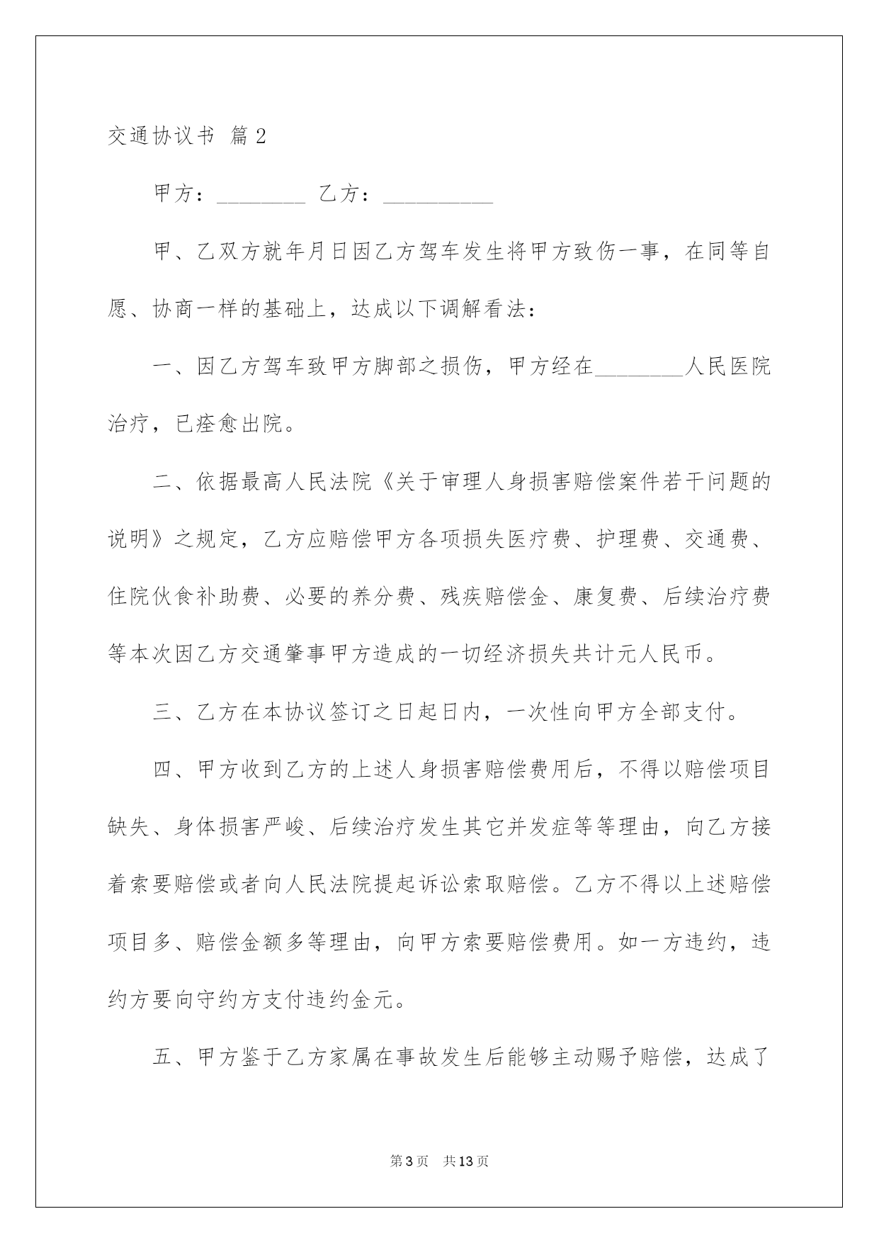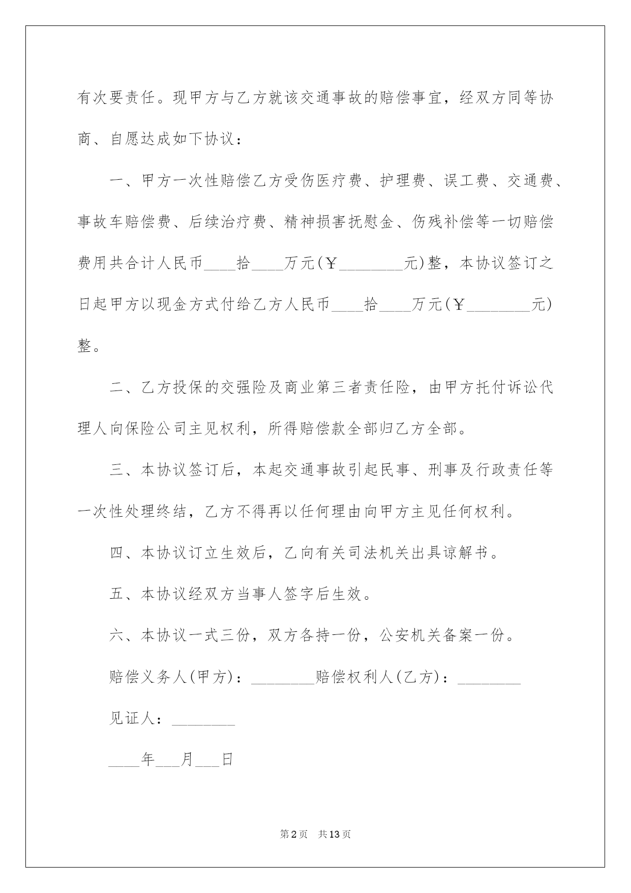 第PAGE\*Arabic\*MERGEFORMAT13页共NUMPAGES\*Arabic\*MERGEFORMAT13页第PAGE\*MERGEFORMAT13页共NUMPAGES\*MERGEFORMAT13页第PAGE\*MERGEFORMAT13页共NUMPAGES\*MERGEFORMAT13页第PAGE\*MERGEFORMAT13页共NUMPAGES\*MERGEFORMAT13页第PAGE\*MERGEFORMAT13页共NUMPAGES\*MERGEFORMAT13页第PAGE\*MERGEFORMAT13页共NUMPAGES\*MERGEFORMAT13页第PAGE\*MERGEFORMAT13页共NUMPAGES\*MERGEFORMAT13页第PAGE\*MERGEFORMAT13页共NUMPAGES\*MERGEFORMAT13页第PAGE\*MERGEFORMAT13页共NUMPAGES\*MERGEFORMAT13页第PAGE\*MERGEFORMAT13页共NUMPAGES\*MERGEFORMAT13页第PAGE\*MERGEFORMAT13页共NUMPAGES\*MERGEFORMAT13页2022交通协议书交通协议书汇总8篇现如今,许多状况下我们须要用到协议,签订协议是提高经济效益的手段。一起来参考协议是怎么写的吧,以下是我收集整理的交通协议书8篇,欢迎大家共享。交通协议书篇1赔偿义务人(甲方):张_,身份证号:________赔偿权利人(乙方):李_,身份证号:________全权托付代理人:_______,身份证号:________(与乙方直系亲属关系)。20__年_月_日_时_分,乙方李_驾驶二轮轻巧摩托车在________镇________路段与甲方张_驾驶的正三轮货运摩托车发生碰撞,导致乙方受伤住院治疗。对此交通事故,_县公安局交通警察大队《交通事故认定书》认定,张_对过错行为负此事故的主要责任,李_对过错事实负有次要责任。现甲方与乙方就该交通事故的赔偿事宜,经双方同等协商、自愿达成如下协议:一、甲方一次性赔偿乙方受伤医疗费、护理费、误工费、交通费、事故车赔偿费、后续治疗费、精神损害抚慰金、伤残补偿等一切赔偿费用共合计人民币____拾____万元(¥________元)整,本协议签订之日起甲方以现金方式付给乙方人民币____拾____万元(¥________元)整。二、乙方投保的交强险及商业第三者责任险,由甲方托付诉讼代理人向保险公司主见权利,所得赔偿款全部归乙方全部。三、本协议签订后,本起交通事故引起民事、刑事及行政责任等一次性处理终结,乙方不得再以任何理由向甲方主见任何权利。四、本协议订立生效后,乙向有关司法机关出具谅解书。五、本协议经双方当事人签字后生效。六、本协议一式三份,双方各持一份,公安机关备案一份。赔偿义务人(甲方):________赔偿权利人(乙方):________见证人:____________年___月___日交通协议书篇2甲方:________乙方:__________甲、乙双方就年月日因乙方驾车发生将甲方致伤一事,在同等自愿、协商一样的基础上,达成以下调解看法:一、因乙方驾车致甲方脚部之损伤,甲方经在________人民医院治疗,已痊愈出院。二、依据最高人民法院《关于审理人身损害赔偿案件若干问题的说明》之规定,乙方应赔偿甲方各项损失医疗费、护理费、交通费、住院伙食补助费、必要的养分费、残疾赔偿金、康复费、后续治疗费等本次因乙方交通肇事甲方造成的一切经济损失共计元人民币。三、乙方在本协议签订之日起日内,一次性向甲方全部支付。四、甲方收到乙方的上述人身损害赔偿费用后,不得以赔偿项目缺失、身体损害严峻、后续治疗发生其它并发症等等理由,向乙方接着索要赔偿或者向人民法院提起诉讼索取赔偿。乙方不得以上述赔偿项目多、赔偿金额多等理由,向甲方索要赔偿费用。如一方违约,违约方要向守约方支付违约金元。五、甲方鉴于乙方家属在事故发生后能够主动赐予赔偿,达成了本调解协议。故对乙方应担当的刑事责任赐予谅解,恳求人民法院对乙方应付的刑事责任赐予从轻、减轻惩罚,对可能判处的缓刑惩罚不提出任何异议。六、为保证乙方交通肇事案件的顺当进行,甲方保证在公安机关、检察机关及法院审理过程中的须要,赐予主动的支持和协作。通讯地址,联系电话。七、本协议自签订之日起生效。本协议一式五份,双方当事人各一份,公安局、检察院、法院各一份。甲方:________乙方:_____________年____月____日____年____月____日交通协议