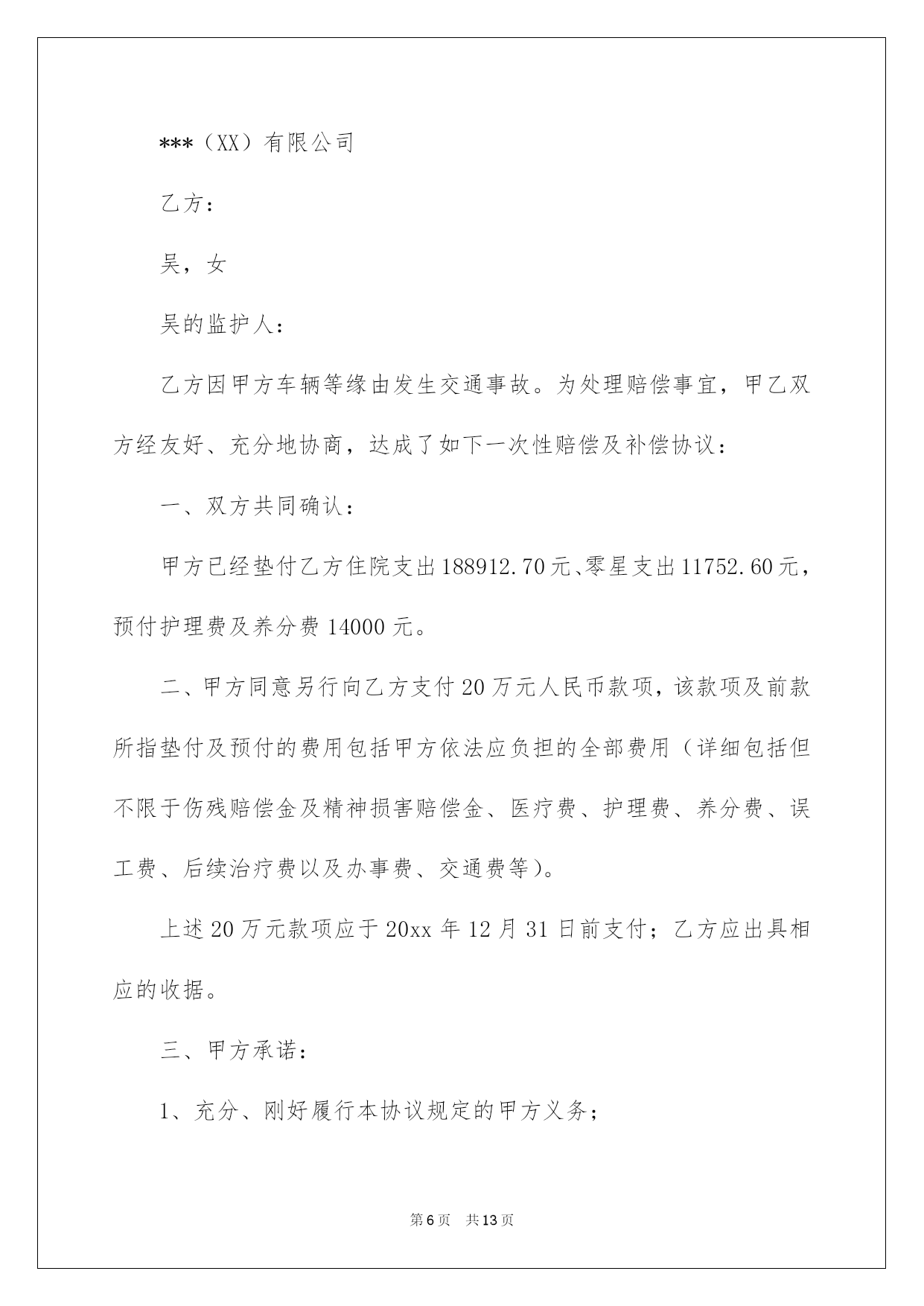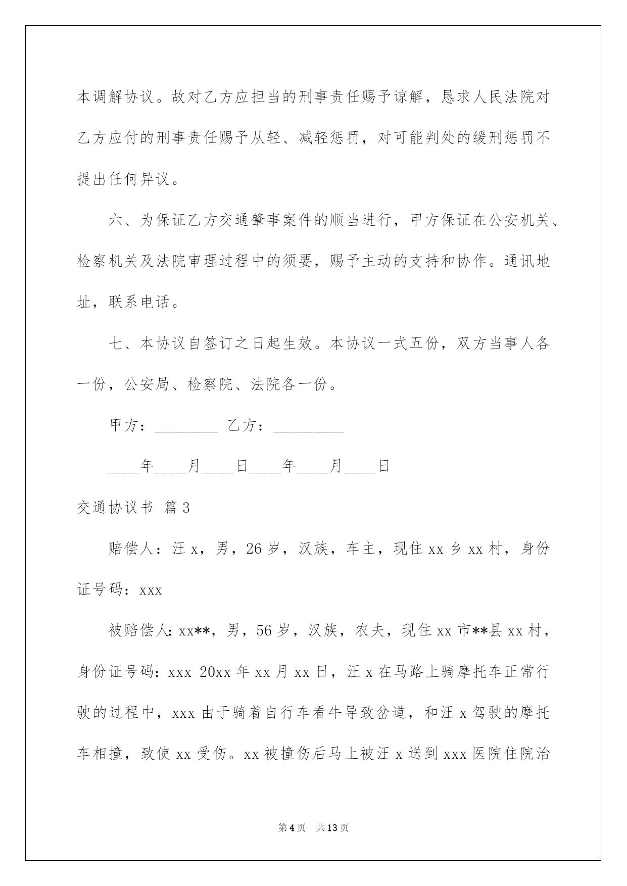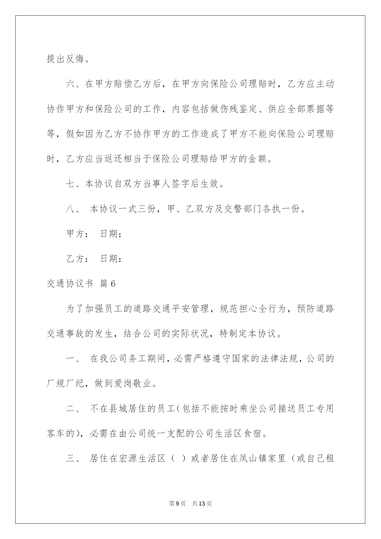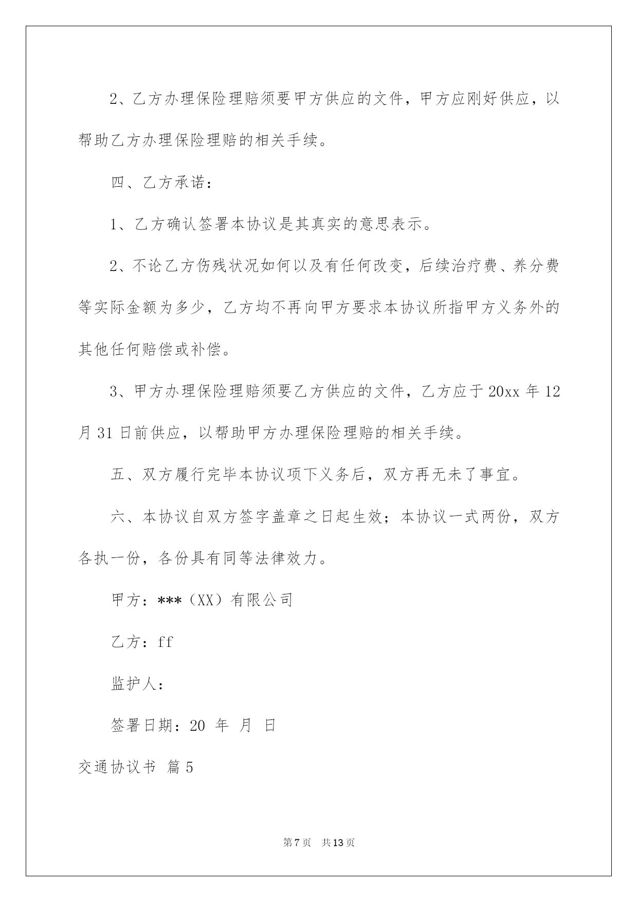 第PAGE\*Arabic\*MERGEFORMAT13页共NUMPAGES\*Arabic\*MERGEFORMAT13页第PAGE\*MERGEFORMAT13页共NUMPAGES\*MERGEFORMAT13页第PAGE\*MERGEFORMAT13页共NUMPAGES\*MERGEFORMAT13页第PAGE\*MERGEFORMAT13页共NUMPAGES\*MERGEFORMAT13页第PAGE\*MERGEFORMAT13页共NUMPAGES\*MERGEFORMAT13页第PAGE\*MERGEFORMAT13页共NUMPAGES\*MERGEFORMAT13页第PAGE\*MERGEFORMAT13页共NUMPAGES\*MERGEFORMAT13页第PAGE\*MERGEFORMAT13页共NUMPAGES\*MERGEFORMAT13页第PAGE\*MERGEFORMAT13页共NUMPAGES\*MERGEFORMAT13页第PAGE\*MERGEFORMAT13页共NUMPAGES\*MERGEFORMAT13页第PAGE\*MERGEFORMAT13页共NUMPAGES\*MERGEFORMAT13页2022交通协议书交通协议书汇总8篇现如今,许多状况下我们须要用到协议,签订协议是提高经济效益的手段。一起来参考协议是怎么写的吧,以下是我收集整理的交通协议书8篇,欢迎大家共享。交通协议书篇1赔偿义务人(甲方):张_,身份证号:________赔偿权利人(乙方):李_,身份证号:________全权托付代理人:_______,身份证号:________(与乙方直系亲属关系)。20__年_月_日_时_分,乙方李_驾驶二轮轻巧摩托车在________镇________路段与甲方张_驾驶的正三轮货运摩托车发生碰撞,导致乙方受伤住院治疗。对此交通事故,_县公安局交通警察大队《交通事故认定书》认定,张_对过错行为负此事故的主要责任,李_对过错事实负有次要责任。现甲方与乙方就该交通事故的赔偿事宜,经双方同等协商、自愿达成如下协议:一、甲方一次性赔偿乙方受伤医疗费、护理费、误工费、交通费、事故车赔偿费、后续治疗费、精神损害抚慰金、伤残补偿等一切赔偿费用共合计人民币____拾____万元(¥________元)整,本协议签订之日起甲方以现金方式付给乙方人民币____拾____万元(¥________元)整。二、乙方投保的交强险及商业第三者责任险,由甲方托付诉讼代理人向保险公司主见权利,所得赔偿款全部归乙方全部。三、本协议签订后,本起交通事故引起民事、刑事及行政责任等一次性处理终结,乙方不得再以任何理由向甲方主见任何权利。四、本协议订立生效后,乙向有关司法机关出具谅解书。五、本协议经双方当事人签字后生效。六、本协议一式三份,双方各持一份,公安机关备案一份。赔偿义务人(甲方):________赔偿权利人(乙方):________见证人:____________年___月___日交通协议书篇2甲方:________乙方:__________甲、乙双方就年月日因乙方驾车发生将甲方致伤一事,在同等自愿、协商一样的基础上,达成以下调解看法:一、因乙方驾车致甲方脚部之损伤,甲方经在________人民医院治疗,已痊愈出院。二、依据最高人民法院《关于审理人身损害赔偿案件若干问题的说明》之规定,乙方应赔偿甲方各项损失医疗费、护理费、交通费、住院伙食补助费、必要的养分费、残疾赔偿金、康复费、后续治疗费等本次因乙方交通肇事甲方造成的一切经济损失共计元人民币。三、乙方在本协议签订之日起日内,一次性向甲方全部支付。四、甲方收到乙方的上述人身损害赔偿费用后,不得以赔偿项目缺失、身体损害严峻、后续治疗发生其它并发症等等理由,向乙方接着索要赔偿或者向人民法院提起诉讼索取赔偿。乙方不得以上述赔偿项目多、赔偿金额多等理由,向甲方索要赔偿费用。如一方违约,违约方要向守约方支付违约金元。五、甲方鉴于乙方家属在事故发生后能够主动赐予赔偿,达成了本调解协议。故对乙方应担当的刑事责任赐予谅解,恳求人民法院对乙方应付的刑事责任赐予从轻、减轻惩罚,对可能判处的缓刑惩罚不提出任何异议。六、为保证乙方交通肇事案件的顺当进行,甲方保证在公安机关、检察机关及法院审理过程中的须要,赐予主动的支持和协作。通讯地址,联系电话。七、本协议自签订之日起生效。本协议一式五份,双方当事人各一份,公安局、检察院、法院各一份。甲方:________乙方:_____________年____月____日____年____月____日交通协议