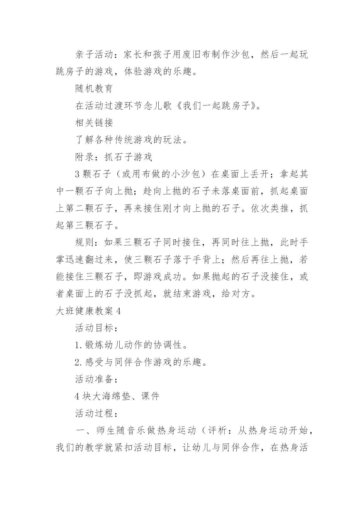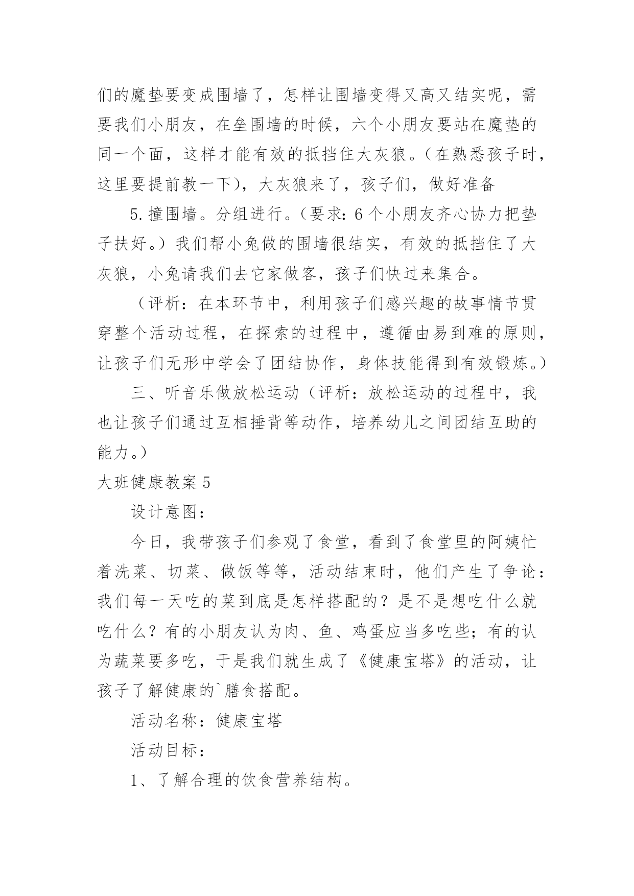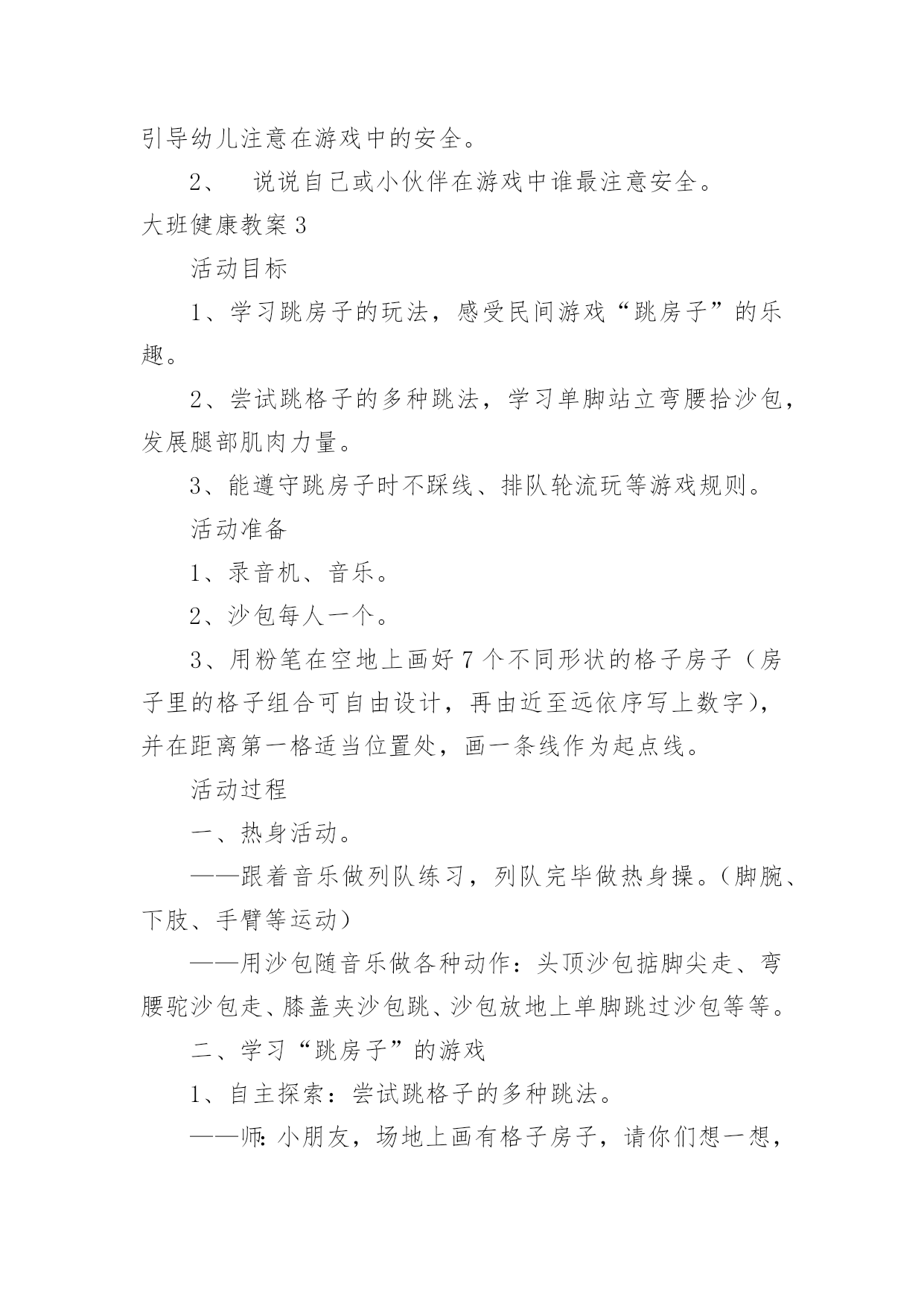 大班健康教案大班健康教案在教学工作者开展教学活动前,通常会被要求编写教案,编写教案助于积累教学经验,不断提高教学质量。那么问题来了,教案应该怎么写?以下是小编精心整理的大班健康教案,希望能够帮助到大家。大班健康教案1活动目标1、知道天天刷牙是保护牙齿的好方法。2、认识保护牙齿的工具和使用方法。3、学习养成天天刷牙的好习惯。4、初步养成良好的卫生习惯。5、了解主要症状,懂得预防和治疗的自我保护意识。活动准备1、"社会万花筒":《牙医阿姨请问你》。2、学习单:《护牙行动》。3、参观牙医的海报,海报:"今天我们刷过牙"及牙刷纸型。4、保护牙齿的相关工具,如牙刷、牙线、漱口杯和水等。活动过程一、讨论如何保护牙齿。1、说说自己平时是怎样保护牙齿的。2、结合拜访牙医的讨论海报以及社会万花筒《牙医阿姨请问你》中的问题与回答,说说有哪些保护牙齿的'方法,什么情况下必须看牙医。二、认识保护牙齿的工具。1、出示各种保护牙齿的工具,提问幼儿:平时你是用哪一种工具保护牙齿的?2、你知道这些工具是怎么使用的吗?3、教师示范使用牙刷刷牙的正确方法。4、请个别幼儿尝试使用正确的方法刷牙。三、我爱刷牙。1、提问:今天刷过牙了吗?并与幼儿讨论:什么时候该刷牙?2、出示"今天我们刷过牙"的海报与牙刷纸型。3、告诉幼儿海报会贴在教室里,每天刷过牙的幼儿就把自己的牙刷纸型挂在海报上,提醒自己天天刷牙。活动反思本活动的目标主要是让幼儿养成良好的卫生习惯,学习正确的刷牙方法。尝试沿着一条线段自上而下地画短线,学习正确的握笔姿势。牙刷,本就是生活中最常见物品,可以引起幼儿创作的欲望。大班健康教案2教育活动目标:1、知道哪些是危险的游戏,懂得在游戏注意安全。2、积累安全生活经验,有一定的自我意识。活动准备1、教师结合(过程中的内容)准备相关的情景图片或照片。2、平时注意观察幼儿游戏情况,找出几个不注意安全的`实例。3、采笔。活动过程一、这么做安全不?1、结合日常生活经验,观看下列图片,让幼儿讨论:这样做好吗?为什么?(1)户外活动奔跑时相互碰撞。(2)玩大型运动器时,头朝下滑滑梯、追逐、打闹。(3)区、角活动时,用剪刀、木棍对着别人或者打闹。(4)玩碎玻璃或尖锐的物品。(5)把一些好看、好闻的东西放进嘴里。二、怎样做安全?1、分组谈话:在游戏中应该怎样注意安全?比如提球、玩沙包、做操、上下楼梯时等等。2、指导幼儿看《健康》第6~7页:请幼儿结合自己的实际情况,说一说在游戏中应该注意避免哪些危险动作。三、游戏中的安全。1、带幼儿到户外活动,观察幼儿游戏的情况。适时引导幼儿注意在游戏中的安全。2、说说自己或小伙伴在游戏中谁最注意安全。大班健康教案3活动目标1、学习跳房子的玩法,感受民间游戏“跳房子”的乐趣。2、尝试跳格子的多种跳法,学习单脚站立弯腰拾沙包,发展腿部肌肉力量。3、能遵守跳房子时不踩线、排队轮流玩等游戏规则。活动准备1、录音机、音乐。2、沙包每人一个。3、用粉笔在空地上画好7个不同形状的格子房子(房子里的格子组合可自由设计,再由近至远依序写上数字),并在距离第一格适当位置处,画一条线作为起点线。活动过程一、热身活动。——跟着音乐做列队练习,列队完毕做热身操。(脚腕、下肢、手臂等运动)——用沙包随音乐做各种动作:头顶沙包掂脚尖走、弯腰驼沙包走、膝盖夹沙包跳、沙包放地上单脚跳过沙包等等。二、学习“跳房子”的游戏1、自主探索:尝试跳格子的多种跳法。——师:小朋友,场地上画有格子房子,请你们想一想,怎样玩这些不同形状的格子房子?——请几个幼儿示范创意玩法。——幼儿5人一组,分组练习跳房子的不同跳法(连续单脚跳、连续双脚跳、跨跳、单双脚交替跳等),教师巡回指导。提示幼儿在起点线后面排队轮流玩,要按照格子里的数字顺序来跳,脚不能踩线。2、重点突破:学习单脚站立弯腰拾沙包。——教师示范单脚站立弯腰拾沙包的技巧:单脚站立,慢慢弯腰拾起沙包,注意保持身体的平衡。——幼儿找空地自由练习。教师巡回指导,鼓励幼儿不怕困难,勇于挑战。3、趣味游戏:丢沙包跳房子。4、(1)教师介绍游戏方法。幼儿站在房子底线上,将沙包投到数字1的格子里,然后单脚按1到10的顺序跳,再以单脚跳方式从10到1的顺序跳到沙包所在层前一格,用手拎起沙包并跳出房子(途中如果经过并排横列的格子以及10的格子时,可以双脚着地休息)。接着再将沙包丢向数字2的格子里,丢进了就反复第一次的动作,若没丢准或是犯规就换下一个人玩,以此类推,从近及远,依次向前。(2)游戏规则:沙包投出格子外或投到线上则换下一个人玩;跳的过程中脚不可以落地,脚也不能压到线,否则算失误,换另一人继续游戏,等又轮到自己时,再从失误的格子继续跳下去。幼儿自由组合,每5人一组,依次轮流玩,丢得格子数字最大的幼儿获胜。5、幼儿5人一组进行跳房子游戏,教师巡回指