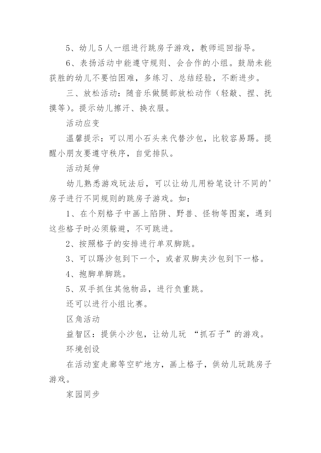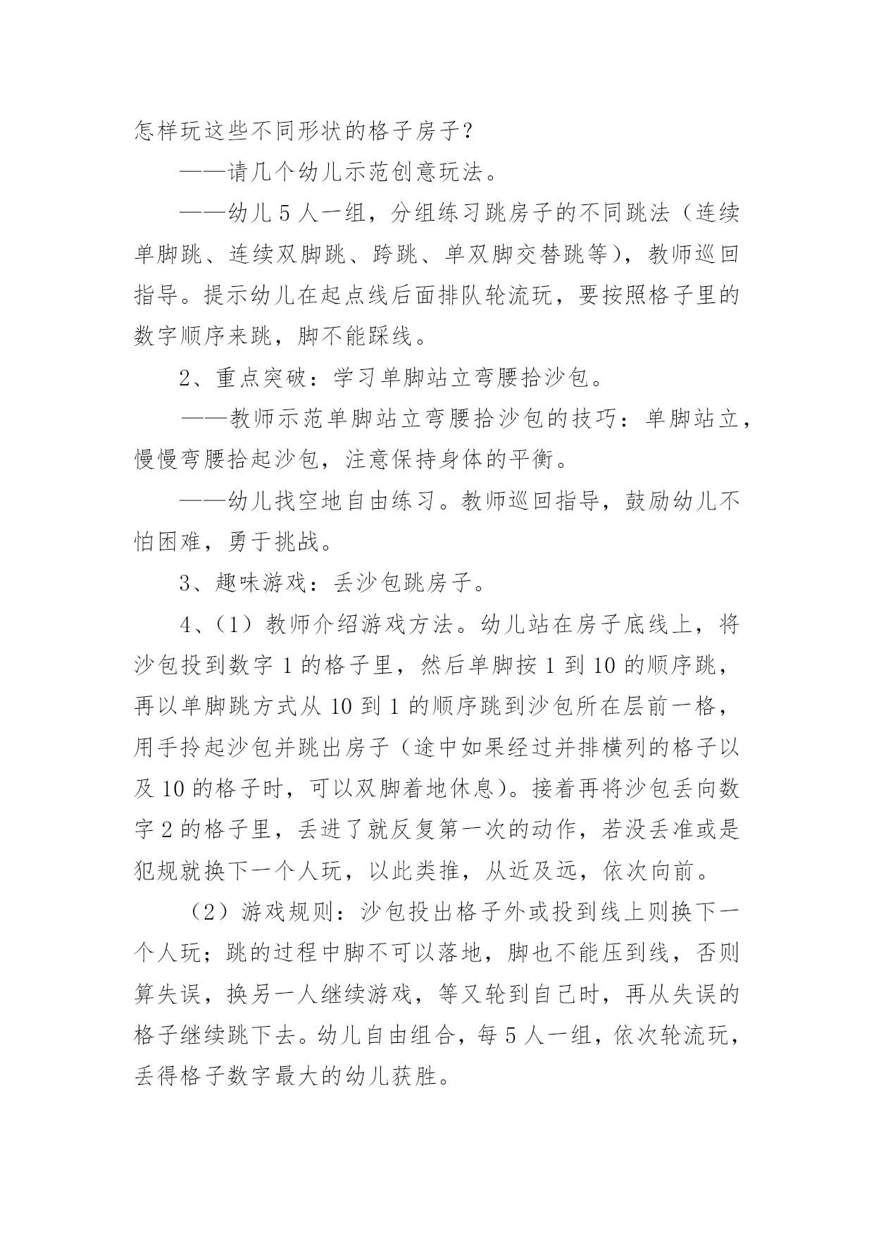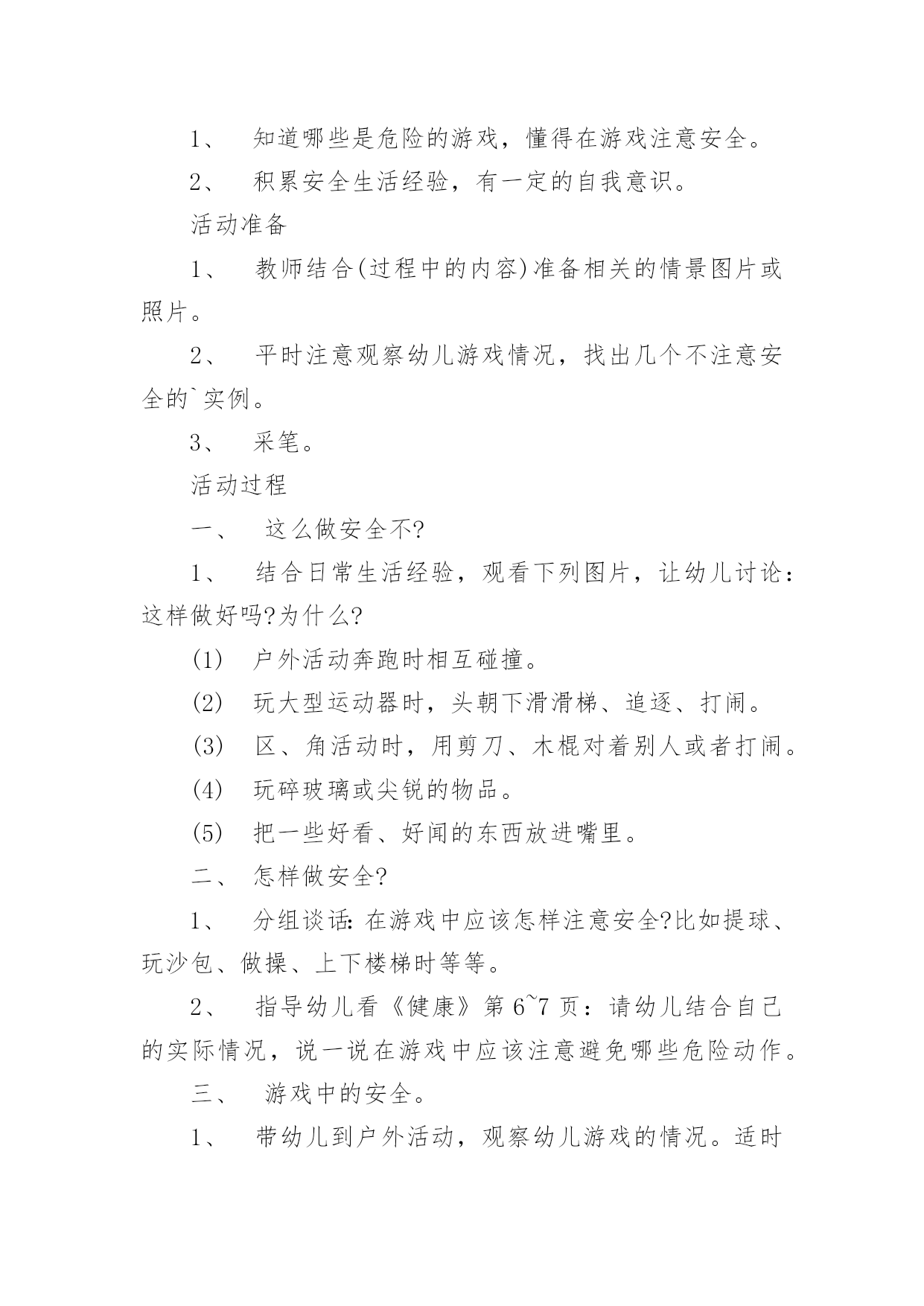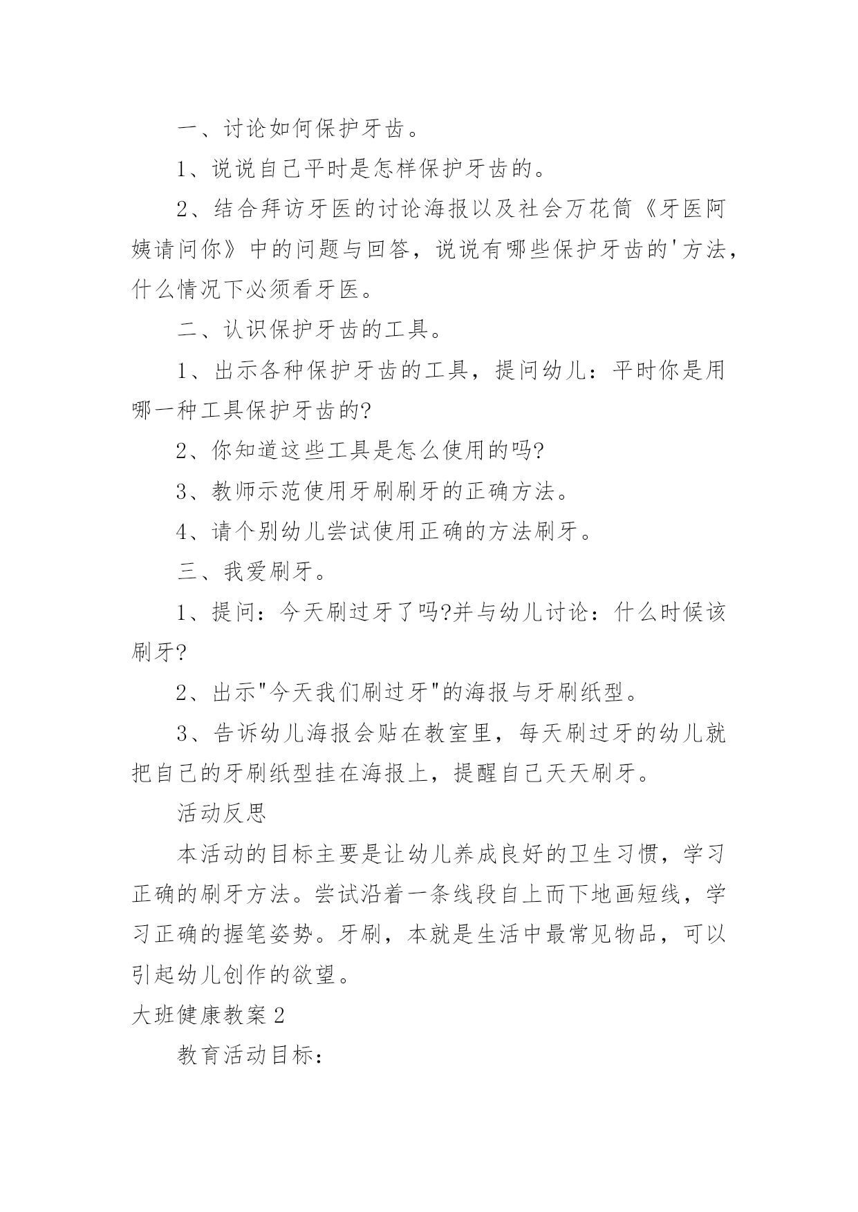 大班健康教案大班健康教案在教学工作者开展教学活动前,通常会被要求编写教案,编写教案助于积累教学经验,不断提高教学质量。那么问题来了,教案应该怎么写?以下是小编精心整理的大班健康教案,希望能够帮助到大家。大班健康教案1活动目标1、知道天天刷牙是保护牙齿的好方法。2、认识保护牙齿的工具和使用方法。3、学习养成天天刷牙的好习惯。4、初步养成良好的卫生习惯。5、了解主要症状,懂得预防和治疗的自我保护意识。活动准备1、"社会万花筒":《牙医阿姨请问你》。2、学习单:《护牙行动》。3、参观牙医的海报,海报:"今天我们刷过牙"及牙刷纸型。4、保护牙齿的相关工具,如牙刷、牙线、漱口杯和水等。活动过程一、讨论如何保护牙齿。1、说说自己平时是怎样保护牙齿的。2、结合拜访牙医的讨论海报以及社会万花筒《牙医阿姨请问你》中的问题与回答,说说有哪些保护牙齿的'方法,什么情况下必须看牙医。二、认识保护牙齿的工具。1、出示各种保护牙齿的工具,提问幼儿:平时你是用哪一种工具保护牙齿的?2、你知道这些工具是怎么使用的吗?3、教师示范使用牙刷刷牙的正确方法。4、请个别幼儿尝试使用正确的方法刷牙。三、我爱刷牙。1、提问:今天刷过牙了吗?并与幼儿讨论:什么时候该刷牙?2、出示"今天我们刷过牙"的海报与牙刷纸型。3、告诉幼儿海报会贴在教室里,每天刷过牙的幼儿就把自己的牙刷纸型挂在海报上,提醒自己天天刷牙。活动反思本活动的目标主要是让幼儿养成良好的卫生习惯,学习正确的刷牙方法。尝试沿着一条线段自上而下地画短线,学习正确的握笔姿势。牙刷,本就是生活中最常见物品,可以引起幼儿创作的欲望。大班健康教案2教育活动目标:1、知道哪些是危险的游戏,懂得在游戏注意安全。2、积累安全生活经验,有一定的自我意识。活动准备1、教师结合(过程中的内容)准备相关的情景图片或照片。2、平时注意观察幼儿游戏情况,找出几个不注意安全的`实例。3、采笔。活动过程一、这么做安全不?1、结合日常生活经验,观看下列图片,让幼儿讨论:这样做好吗?为什么?(1)户外活动奔跑时相互碰撞。(2)玩大型运动器时,头朝下滑滑梯、追逐、打闹。(3)区、角活动时,用剪刀、木棍对着别人或者打闹。(4)玩碎玻璃或尖锐的物品。(5)把一些好看、好闻的东西放进嘴里。二、怎样做安全?1、分组谈话:在游戏中应该怎样注意安全?比如提球、玩沙包、做操、上下楼梯时等等。2、指导幼儿看《健康》第6~7页:请幼儿结合自己的实际情况,说一说在游戏中应该注意避免哪些危险动作。三、游戏中的安全。1、带幼儿到户外活动,观察幼儿游戏的情况。适时引导幼儿注意在游戏中的安全。2、说说自己或小伙伴在游戏中谁最注意安全。大班健康教案3活动目标1、学习跳房子的玩法,感受民间游戏“跳房子”的乐趣。2、尝试跳格子的多种跳法,学习单脚站立弯腰拾沙包,发展腿部肌肉力量。3、能遵守跳房子时不踩线、排队轮流玩等游戏规则。活动准备1、录音机、音乐。2、沙包每人一个。3、用粉笔在空地上画好7个不同形状的格子房子(房子里的格子组合可自由设计,再由近至远依序写上数字),并在距离第一格适当位置处,画一条线作为起点线。活动过程一、热身活动。——跟着音乐做列队练习,列队完毕做热身操。(脚腕、下肢、手臂等运动)——用沙包随音乐做各种动作:头顶沙包掂脚尖走、弯腰驼沙包走、膝盖夹沙包跳、沙包放地上单脚跳过沙包等等。二、学习“跳房子”的游戏1、自主探索:尝试跳格子的多种跳法。——师:小朋友,场地上画有格子房子,请你们想一想,怎样玩这些不同形状的格子房子?——请几个幼儿示范创意玩法。——幼儿5人一组,分组练习跳房子的不同跳法(连续单脚跳、连续双脚跳、跨跳、单双脚交替跳等),教师巡回指导。提示幼儿在起点线后面排队轮流玩,要按照格子里的数字顺序来跳,脚不能踩线。2、重点突破:学习单脚站立弯腰拾沙包。——教师示范单脚站立弯腰拾沙包的技巧:单脚站立,慢慢弯腰拾起沙包,注意保持身体的平衡。——幼儿找空地自由练习。教师巡回指导,鼓励幼儿不怕困难,勇于挑战。3、趣味游戏:丢沙包跳房子。4、(1)教师介绍游戏方法。幼儿站在房子底线上,将沙包投到数字1的格子里,然后单脚按1到10的顺序跳,再以单脚跳方式从10到1的顺序跳到沙包所在层前一格,用手拎起沙包并跳出房子(途中如果经过并排横列的格子以及10的格子时,可以双脚着地休息)。接着再将沙包丢向数字2的格子里,丢进了就反复第一次的动作,若没丢准或是犯规就换下一个人玩,以此类推,从近及远,依次向前。(2)游戏规则:沙包投出格子外或投到线上则换下一个人玩;跳的过程中脚不可以落地,脚也不能压到线,否则算失误,换另一人继续游戏,等又轮到自己时,再从失误的格子继续跳下去。幼儿自由组合,每5人一组,依次轮流玩,丢得格子数字最大的幼儿获胜。5、幼儿5人一组进行跳房子游戏,教师巡回指