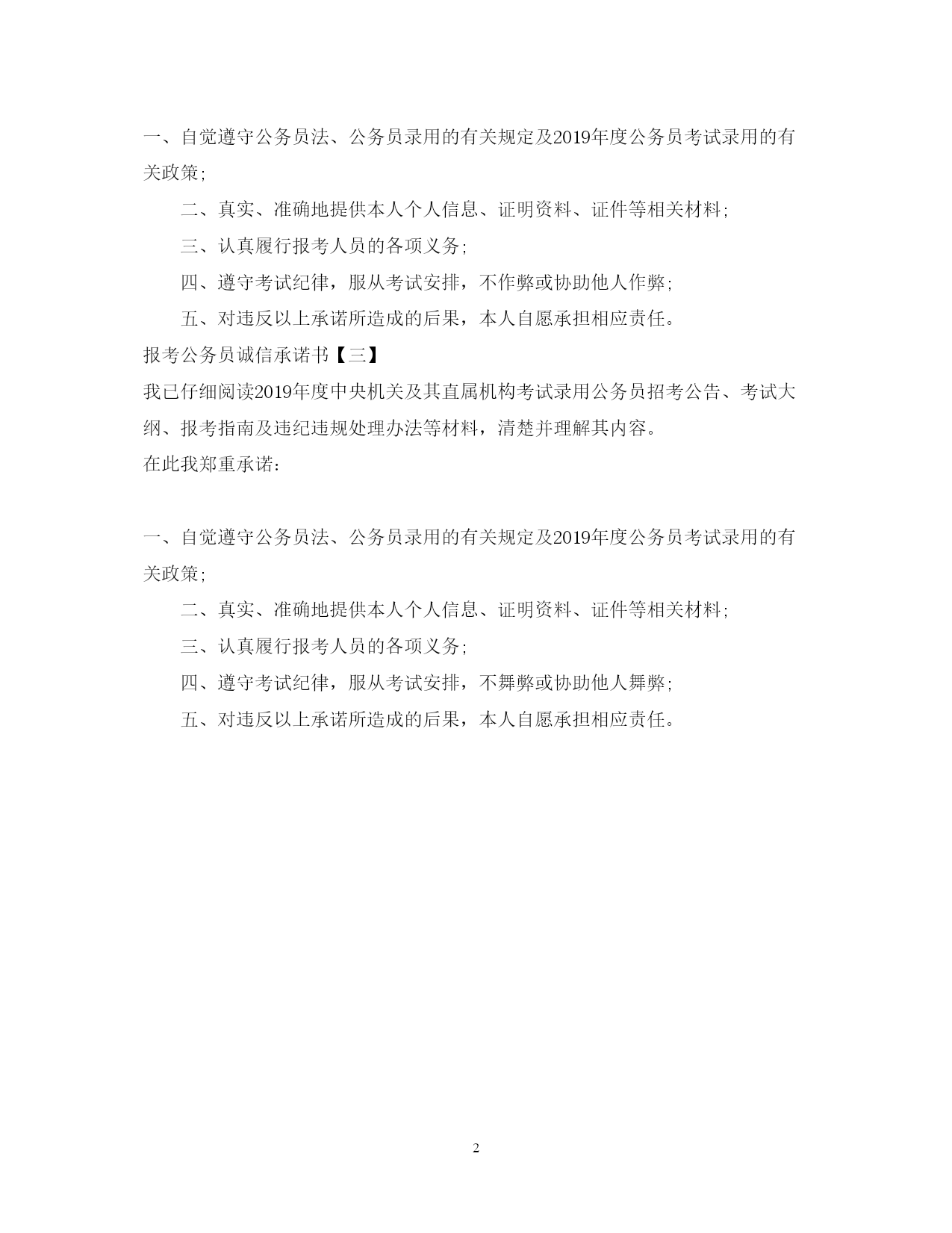 此资料由网络收集而来,如有侵权请告知上传者立即删除。资料共分享,我们负责传递知识。PAGEPAGE22020报考公务员诚信承诺书引导语:报考公司员的你们注意了,下面小编为你们准备了报考公务员诚信承诺书范例,供你们参考,希望对你们有帮助。报考公务员诚信承诺书【一】我郑重承诺:一、我已仔细阅读公告及相关文件,理解且认可其内容,遵守考试纪律,服从考试安排,并将按规定完成相关程序。二、不舞弊也不协助他人舞弊。三、认同雷同卷鉴定结果。四、不弄虚作假,真实、准确地填写及核对个人信息,提供真实有效的证明资料。五、保证在考试及录用期间联系方式畅通。六、对于报名系统自动生成并提供给个人的信息(如报名序号)及报考人员自己设定的用户名、密码等信息,自行妥善保管。七、不故意浪费考录资源。八、保证符合报名及录用资格条件。报考公务员诚信承诺书【二】对违反以上承诺所造成的后果,本人自愿承担相应责任。我已仔细阅读2019年度中央机关及其直属机构考试录用公务员招考公告、考试大纲、报考指南及违纪违规处理办法等材料,清楚并理解其内容。在此我郑重承诺:一、自觉遵守公务员法、公务员录用的有关规定及2019年度公务员考试录用的有关政策;二、真实、准确地提供本人个人信息、证明资料、证件等相关材料;三、认真履行报考人员的各项义务;四、遵守考试纪律,服从考试安排,不作弊或协助他人作弊;五、对违反以上承诺所造成的后果,本人自愿承担相应责任。报考公务员诚信承诺书【三】我已仔细阅读2019年度中央机关及其直属机构考试录用公务员招考公告、考试大纲、报考指南及违纪违规处理办法等材料,清楚并理解其内容。在此我郑重承诺:一、自觉遵守公务员法、公务员录用的有关规定及2019年度公务员考试录用的有关政策;二、真实、准确地提供本人个人信息、证明资料、证件等相关材料;三、认真履行报考人员的各项义务;四、遵守考试纪律,服从考试安排,不舞弊或协助他人舞弊;五、对违反以上承诺所造成的后果,本人自愿承担相应责任。