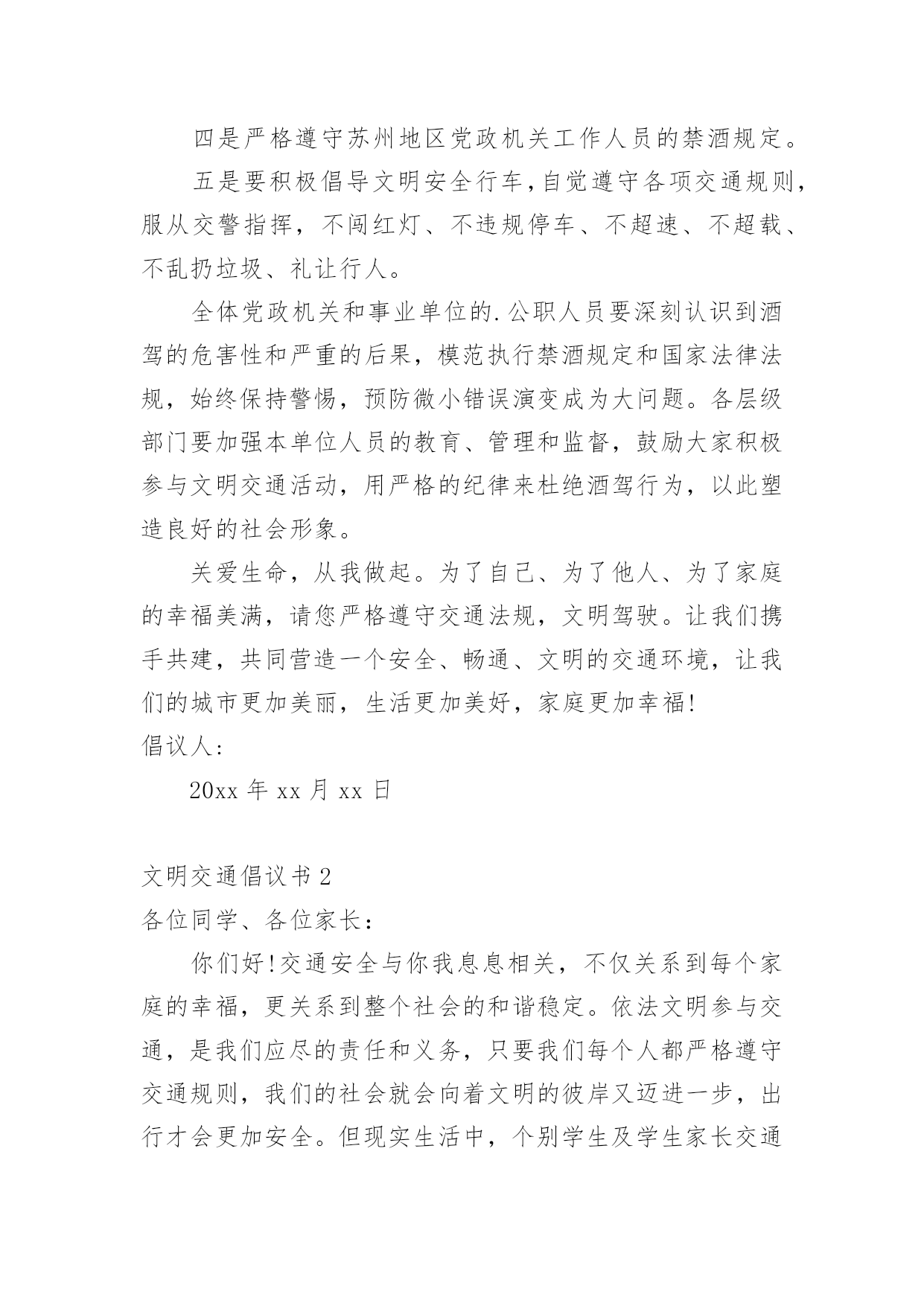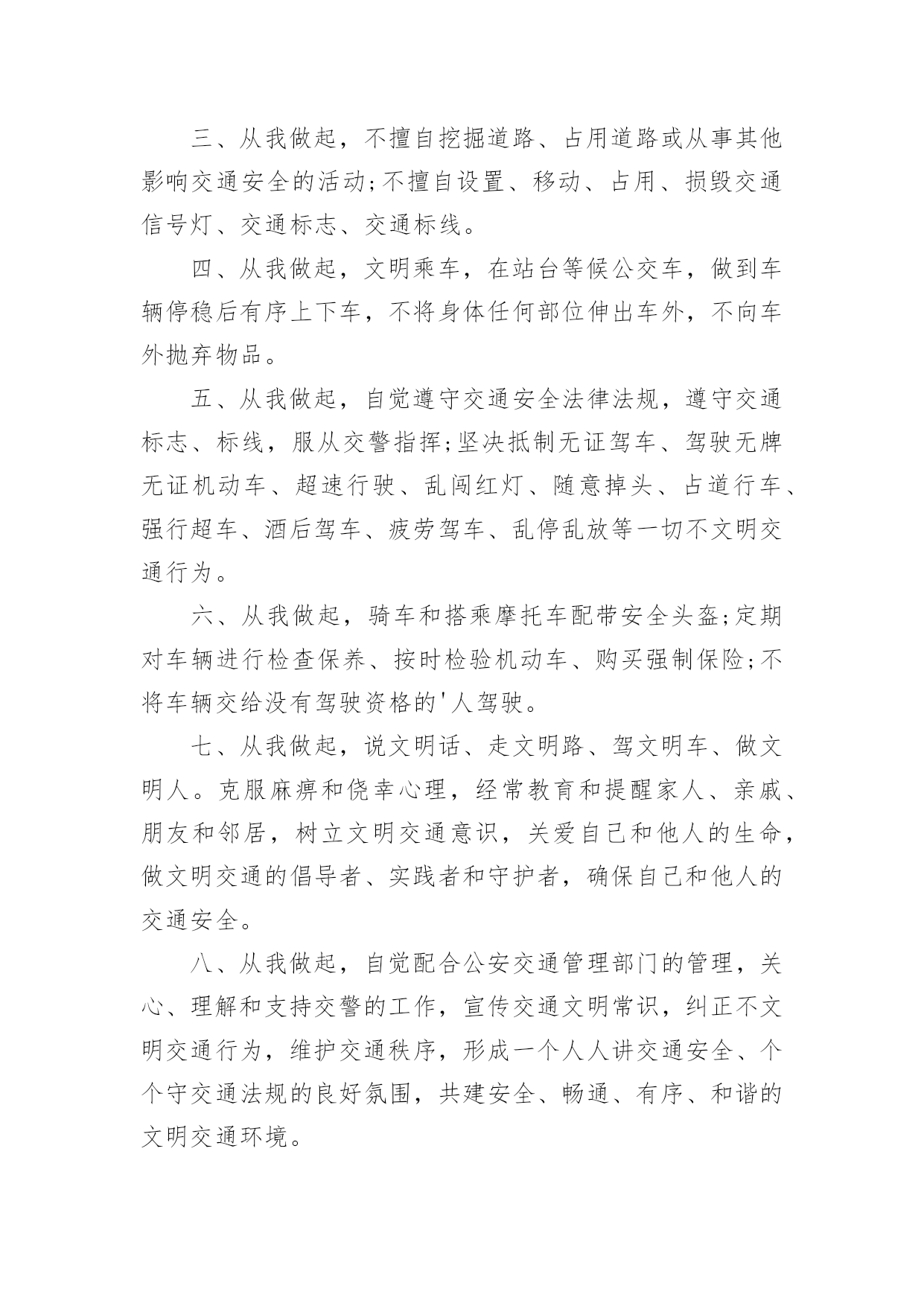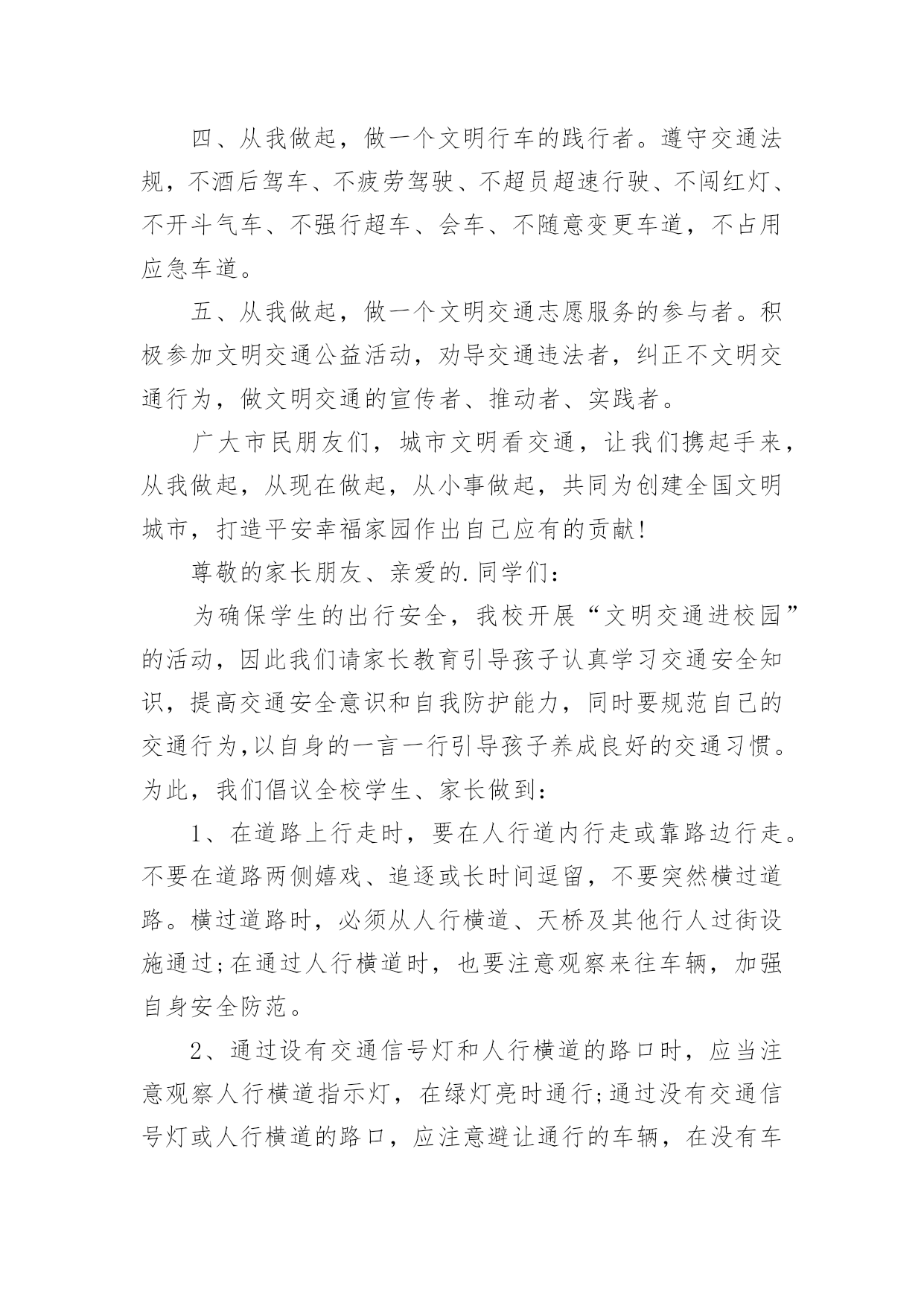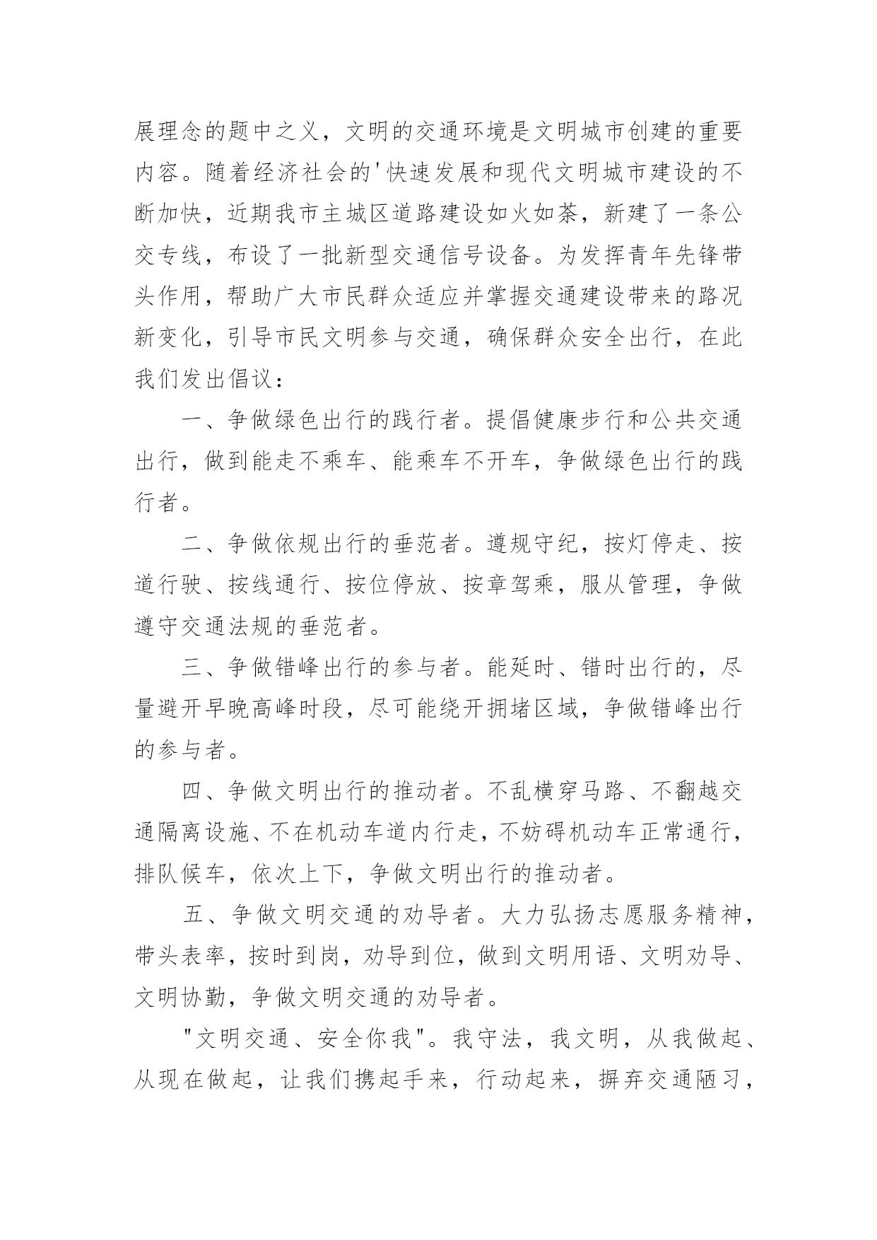 文明交通倡议书在社会一步步向前发展的今天,用到倡议书的地方越来越多,通过倡议书可以激起更多的人响应,在最大的范围内引人们起共鸣。如何写一份恰当的倡议书呢?以下是小编精心整理的文明交通倡议书,欢迎大家分享。文明交通倡议书1尊敬的全市党政机关、事业单位公职人员:自5月1日起,修订后的《中华人民共和国道路交通安全法》正式实施,对酒驾行为加大了惩罚力度,对于因酒驾造成重大事故且涉及犯罪的行为将依法追责。同时,《刑法》也规定,在道路上醉酒驾驶机动车将会被处以拘役并罚款。为全面贯彻新修订的《中华人民共和国道路交通安全法》,我们在此向全市党政机关、事业单位公职人员发出如下倡议:一是要深入学习和执行国家法律法规,提升法制意识与纪律观念,坚决抵制酒后驾车行为,以身作则,推动交通安全的发展。二是要注重自身行为规范,提高自制力,确保“喝酒不开车,开车不喝酒”,并且在与驾驶员共事时,不劝酒、不敬酒,并时刻提醒其切勿酒后驾车。三是若遇到他人酒后驾车的情况,要及时规劝阻止,绝对不能乘坐酒驾车辆。四是严格遵守苏州地区党政机关工作人员的禁酒规定。五是要积极倡导文明安全行车,自觉遵守各项交通规则,服从交警指挥,不闯红灯、不违规停车、不超速、不超载、不乱扔垃圾、礼让行人。全体党政机关和事业单位的.公职人员要深刻认识到酒驾的危害性和严重的后果,模范执行禁酒规定和国家法律法规,始终保持警惕,预防微小错误演变成为大问题。各层级部门要加强本单位人员的教育、管理和监督,鼓励大家积极参与文明交通活动,用严格的纪律来杜绝酒驾行为,以此塑造良好的社会形象。关爱生命,从我做起。为了自己、为了他人、为了家庭的幸福美满,请您严格遵守交通法规,文明驾驶。让我们携手共建,共同营造一个安全、畅通、文明的交通环境,让我们的城市更加美丽,生活更加美好,家庭更加幸福!倡议人:20xx年xx月xx日文明交通倡议书2各位同学、各位家长:你们好!交通安全与你我息息相关,不仅关系到每个家庭的幸福,更关系到整个社会的和谐稳定。依法文明参与交通,是我们应尽的责任和义务,只要我们每个人都严格遵守交通规则,我们的社会就会向着文明的彼岸又迈进一步,出行才会更加安全。但现实生活中,个别学生及学生家长交通安全意识薄弱,交通违法行为和交通不文明现象时有发生,交通事故仍然是在校学生非正常死亡的主要原因,为了你我的生命安全,在此我们郑重倡议:1.驾乘二轮摩托车时要戴安全头盔,并系好安全扣带;前座不能载人,后座只能附载满12周岁以上学生;乘坐人只能正面骑坐,不能侧坐或反坐。驾驶摩托车时不准闯红灯、逆向行驶、争道抢行或突然掉头、急刹或急转弯,不驾驶未经年检的摩托车。2.驾驶非机动车要走非机动车道,没有非机动车道的要靠路边右侧顺行。转弯前要减速慢行,伸手示意,不能突然猛拐。要定期对自行车进行检修,避免因车闸失灵等原因而引发交通事故。自行车、电动自行车不准载乘12周岁以上学生。驾驶电动自行车时不准闯红灯、逆向行驶,遇红灯时不越线停车。3.学生家长要带头并要教育自己的孩子不乘坐无营运资质的客车、无牌无证及由无证人员驾驶的`机动车、电瓶三轮车、拖拉机及车况差、超员的车辆。同时,不得把自行车交给未满12周岁的学生骑行、把电动自行车交给未满16周岁的学生驾驶。4.每一个学生要自觉学习道路交通安全法律法规知识,学会如何保护自己,避免交通意外的伤害,自觉遵守交通安全法律法规,并劝告家长文明参与交通,不酒后驾驶、不超速、不违法超车、不超员、不违反规定车道行驶、不疲劳驾驶、不无证驾驶、不闯红灯、不违法停车、骑乘二轮摩托车要戴安全头盔。生命只有一次,一个完整的家庭对家长、对孩子都十分重要。遵守交通规则从我做起,从小事做起,从今天做起,让我们携起手来,为共同营造文明和谐安全畅通的交通环境而共同努力!学生签名:xxx家长签名:xxx20xx年x月x日文明交通倡议书3公司全体干部职工及家属:随着**的发展,公路客流和物流不断增大,交通事故、道路拥堵时有发生,给交通管理和安全出行带来很大压力,影响了**正常的生产和工作生活秩序。为贯彻安全第一的方针,为**生产建设和发展创建一个良好的交通环境,自觉学习和遵守道路交通安全法律法规,我们责无旁贷。为此,公司文明委向**广大干部职工家属及社会各界发出以下倡议:一、从我做起,树立安全第一的意识,认真学习《中华人民共和国道路交通安全法》,增强交通安全意识,提高自我保护能力,做遵守交通法规的模范。二、从我做起,走人行道、人行天桥,自行车上路紧靠道路右侧行驶。不在马路上追逐、嬉戏、打闹;不穿越、倚坐在马路边的护栏、花池上;不在路口急拐猛跑;穿越道路要仔细看清来往车辆,安全穿行。三、从我做起,不擅自挖掘道路、占用道路或从事其他影响交通安全的活动;不擅自设置、移动、占用、损毁交通信号灯、交通标志、交通标线。四、从我做起,