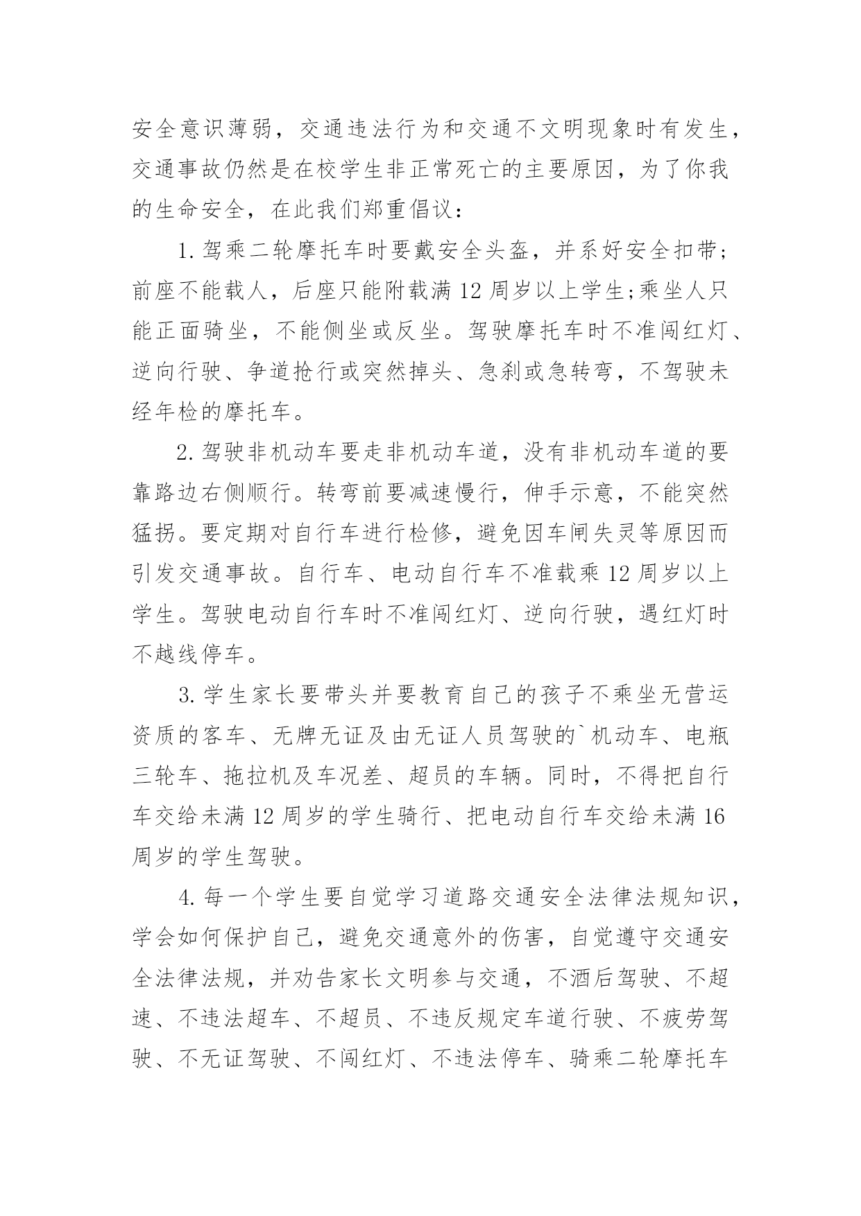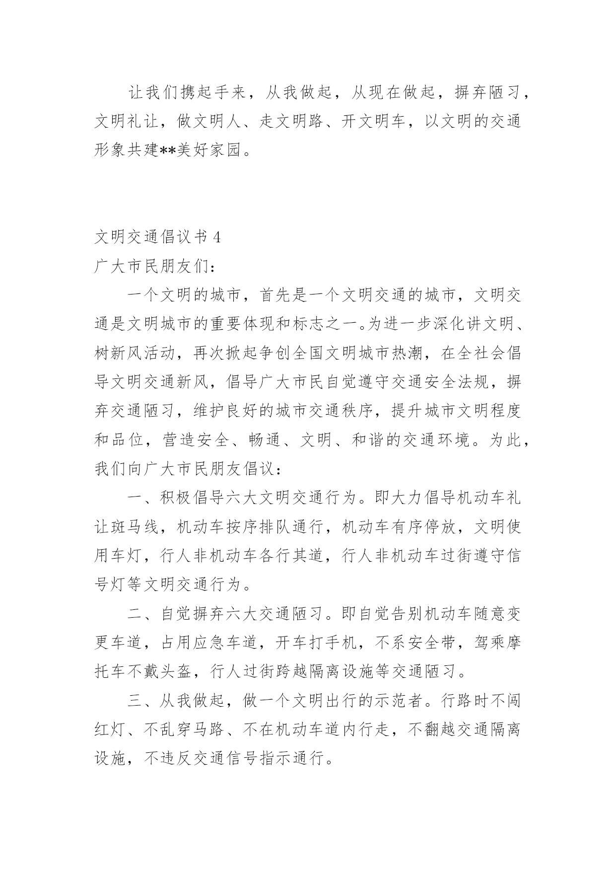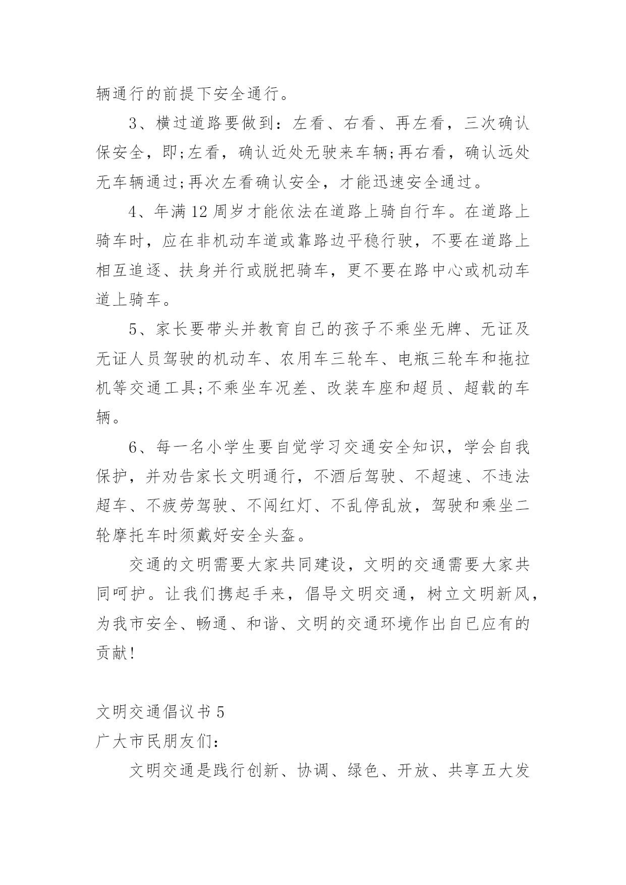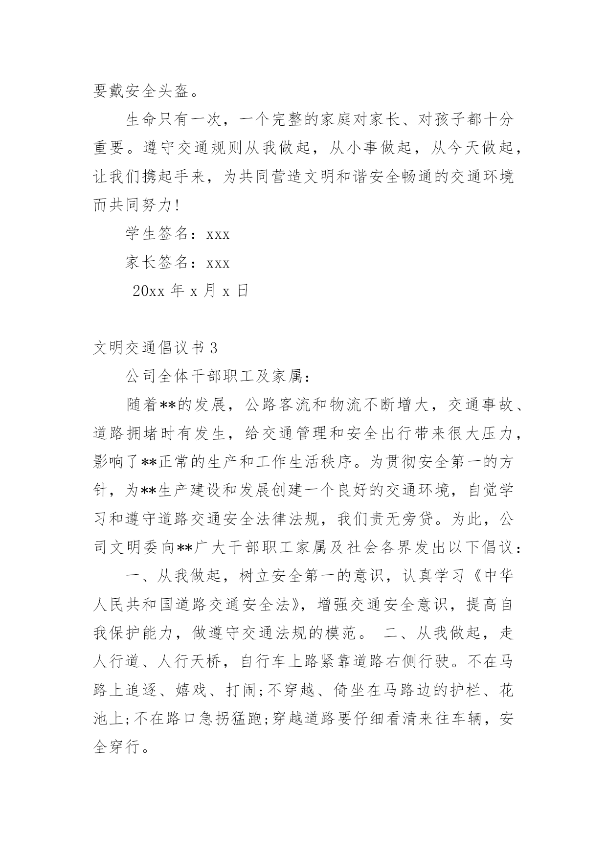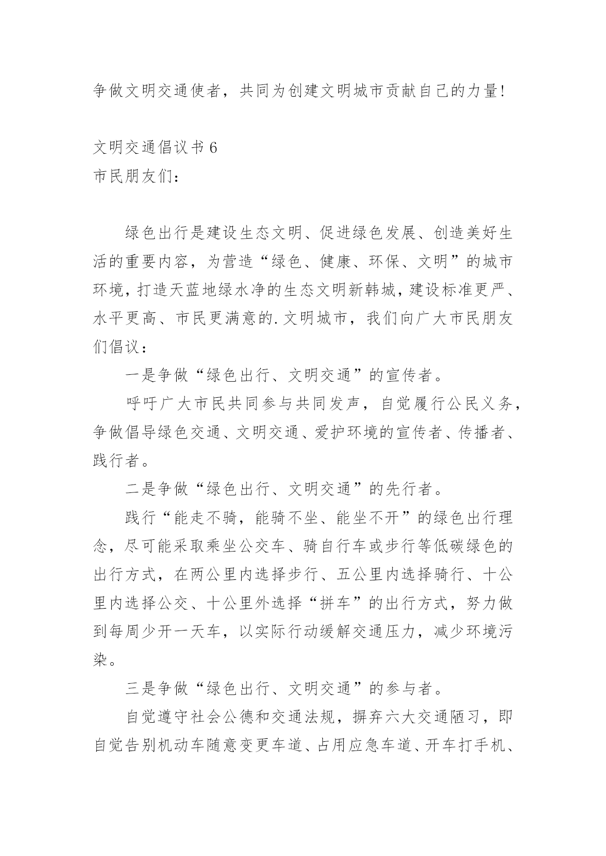 文明交通倡议书在社会一步步向前发展的今天,用到倡议书的地方越来越多,通过倡议书可以激起更多的人响应,在最大的范围内引人们起共鸣。如何写一份恰当的倡议书呢?以下是小编精心整理的文明交通倡议书,欢迎大家分享。文明交通倡议书1尊敬的全市党政机关、事业单位公职人员:自5月1日起,修订后的《中华人民共和国道路交通安全法》正式实施,对酒驾行为加大了惩罚力度,对于因酒驾造成重大事故且涉及犯罪的行为将依法追责。同时,《刑法》也规定,在道路上醉酒驾驶机动车将会被处以拘役并罚款。为全面贯彻新修订的《中华人民共和国道路交通安全法》,我们在此向全市党政机关、事业单位公职人员发出如下倡议:一是要深入学习和执行国家法律法规,提升法制意识与纪律观念,坚决抵制酒后驾车行为,以身作则,推动交通安全的发展。二是要注重自身行为规范,提高自制力,确保“喝酒不开车,开车不喝酒”,并且在与驾驶员共事时,不劝酒、不敬酒,并时刻提醒其切勿酒后驾车。三是若遇到他人酒后驾车的情况,要及时规劝阻止,绝对不能乘坐酒驾车辆。四是严格遵守苏州地区党政机关工作人员的禁酒规定。五是要积极倡导文明安全行车,自觉遵守各项交通规则,服从交警指挥,不闯红灯、不违规停车、不超速、不超载、不乱扔垃圾、礼让行人。全体党政机关和事业单位的.公职人员要深刻认识到酒驾的危害性和严重的后果,模范执行禁酒规定和国家法律法规,始终保持警惕,预防微小错误演变成为大问题。各层级部门要加强本单位人员的教育、管理和监督,鼓励大家积极参与文明交通活动,用严格的纪律来杜绝酒驾行为,以此塑造良好的社会形象。关爱生命,从我做起。为了自己、为了他人、为了家庭的幸福美满,请您严格遵守交通法规,文明驾驶。让我们携手共建,共同营造一个安全、畅通、文明的交通环境,让我们的城市更加美丽,生活更加美好,家庭更加幸福!倡议人:20xx年xx月xx日文明交通倡议书2各位同学、各位家长:你们好!交通安全与你我息息相关,不仅关系到每个家庭的幸福,更关系到整个社会的和谐稳定。依法文明参与交通,是我们应尽的责任和义务,只要我们每个人都严格遵守交通规则,我们的社会就会向着文明的彼岸又迈进一步,出行才会更加安全。但现实生活中,个别学生及学生家长交通安全意识薄弱,交通违法行为和交通不文明现象时有发生,交通事故仍然是在校学生非正常死亡的主要原因,为了你我的生命安全,在此我们郑重倡议:1.驾乘二轮摩托车时要戴安全头盔,并系好安全扣带;前座不能载人,后座只能附载满12周岁以上学生;乘坐人只能正面骑坐,不能侧坐或反坐。驾驶摩托车时不准闯红灯、逆向行驶、争道抢行或突然掉头、急刹或急转弯,不驾驶未经年检的摩托车。2.驾驶非机动车要走非机动车道,没有非机动车道的要靠路边右侧顺行。转弯前要减速慢行,伸手示意,不能突然猛拐。要定期对自行车进行检修,避免因车闸失灵等原因而引发交通事故。自行车、电动自行车不准载乘12周岁以上学生。驾驶电动自行车时不准闯红灯、逆向行驶,遇红灯时不越线停车。3.学生家长要带头并要教育自己的孩子不乘坐无营运资质的客车、无牌无证及由无证人员驾驶的`机动车、电瓶三轮车、拖拉机及车况差、超员的车辆。同时,不得把自行车交给未满12周岁的学生骑行、把电动自行车交给未满16周岁的学生驾驶。4.每一个学生要自觉学习道路交通安全法律法规知识,学会如何保护自己,避免交通意外的伤害,自觉遵守交通安全法律法规,并劝告家长文明参与交通,不酒后驾驶、不超速、不违法超车、不超员、不违反规定车道行驶、不疲劳驾驶、不无证驾驶、不闯红灯、不违法停车、骑乘二轮摩托车要戴安全头盔。生命只有一次,一个完整的家庭对家长、对孩子都十分重要。遵守交通规则从我做起,从小事做起,从今天做起,让我们携起手来,为共同营造文明和谐安全畅通的交通环境而共同努力!学生签名:xxx家长签名:xxx20xx年x月x日文明交通倡议书3公司全体干部职工及家属:随着**的发展,公路客流和物流不断增大,交通事故、道路拥堵时有发生,给交通管理和安全出行带来很大压力,影响了**正常的生产和工作生活秩序。为贯彻安全第一的方针,为**生产建设和发展创建一个良好的交通环境,自觉学习和遵守道路交通安全法律法规,我们责无旁贷。为此,公司文明委向**广大干部职工家属及社会各界发出以下倡议:一、从我做起,树立安全第一的意识,认真学习《中华人民共和国道路交通安全法》,增强交通安全意识,提高自我保护能力,做遵守交通法规的模范。二、从我做起,走人行道、人行天桥,自行车上路紧靠道路右侧行驶。不在马路上追逐、嬉戏、打闹;不穿越、倚坐在马路边的护栏、花池上;不在路口急拐猛跑;穿越道路要仔细看清来往车辆,安全穿行。三、从我做起,不擅自挖掘道路、占用道路或从事其他影响交通安全的活动;不擅自设置、移动、占用、损毁交通信号灯、交通标志、交通标线。四、从我做起,