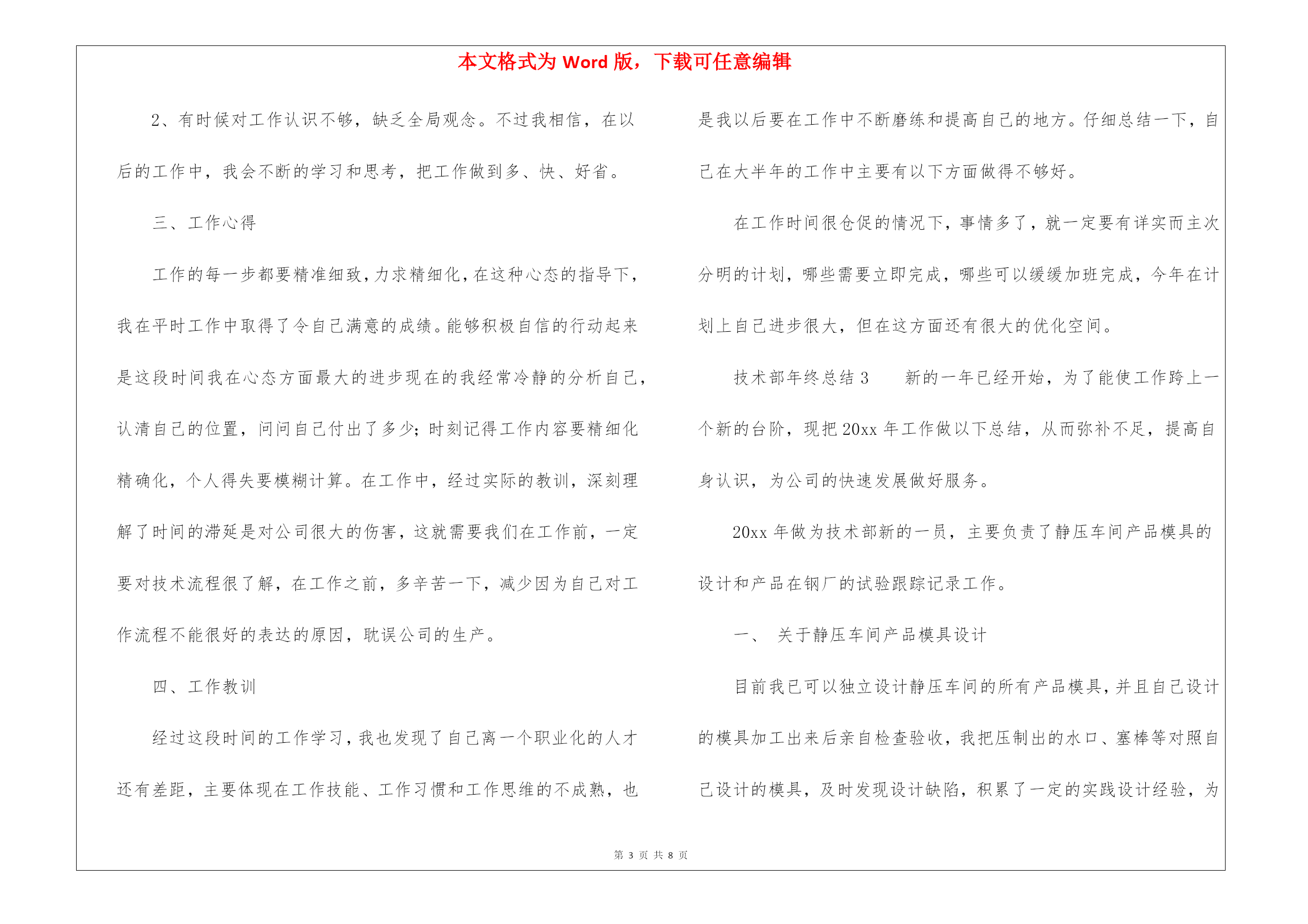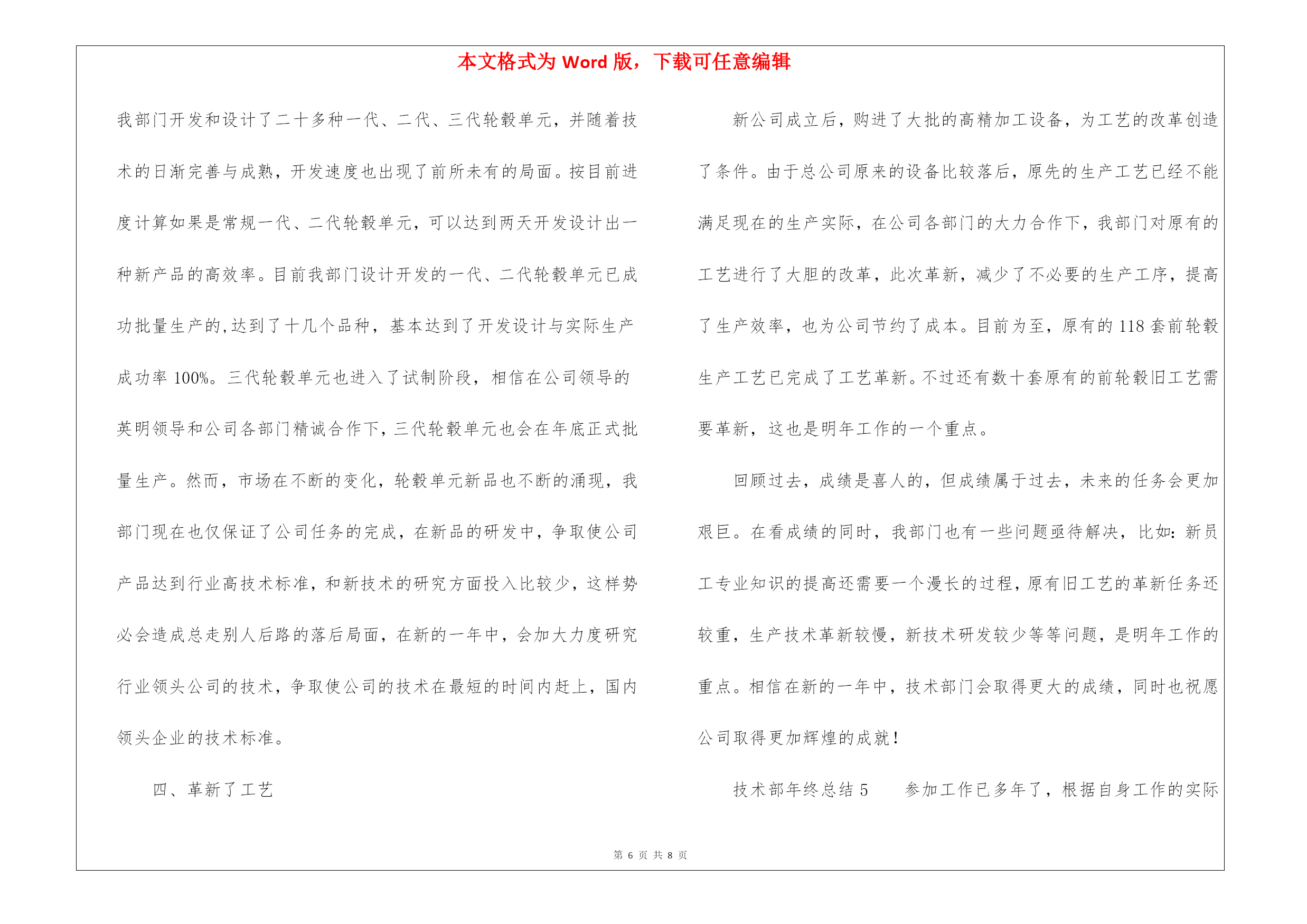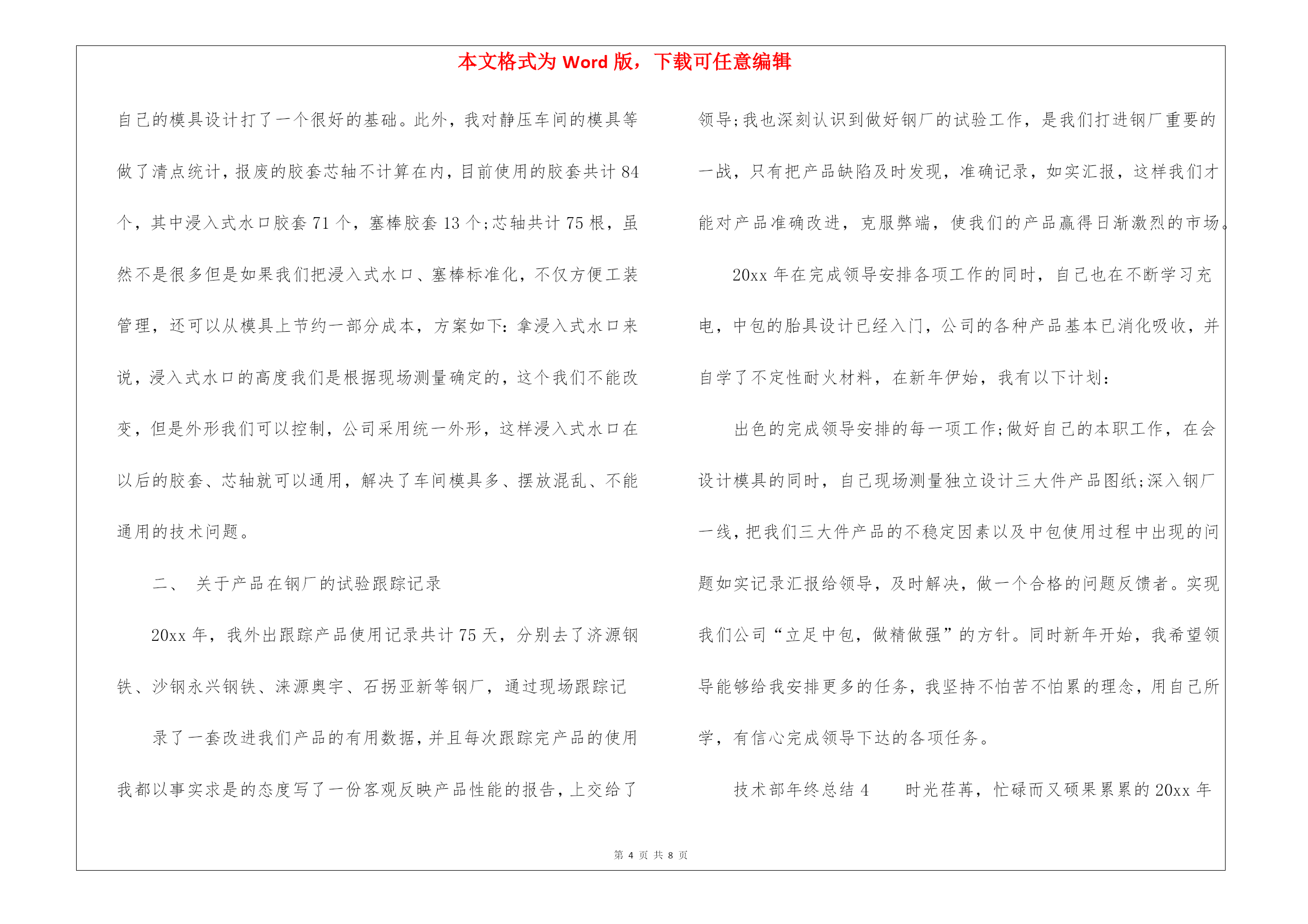 本文格式为Word版,下载可任意编辑第PAGE\*MERGEFORMAT8页共NUMPAGES\*MERGEFORMAT8页2021技术部年终总结(通用5篇)2021技术部年终总结(通用5篇)日子如同白驹过隙,不经意间,一年的工作即将收尾,回顾过去一年的工作,一定有很多需要梳理的事情,不能光会埋头苦干哦,写一份年终总结,为来年工作做准备吧!想必许多人都在为如何写好年终总结而烦恼吧,以下是我为大家整理的2021技术部年终总结(通用5篇),欢迎阅读与收藏。技术部年终总结1一年来的工作结束了,感激这一年来遇到的所有事情,我部门在过去一年来的工作当中也是取得去不错的成绩我感激公司给我们部门的机会,过去的一年到处都是充满着挑战,我感觉有很多事情都应该要保持好的态度才是,在工作当中不断的积累工作经验,把细节的事情处理好,这些都有必要的,我们技术部门的工作的非常的忙,这一点让所有人都有在认真的踏实的做好的相关的工作,过去的一年虽然已经结束了,但是在工作当中应该时刻保持着好端正的态度,我部门依然是整装待发,就过去一年的工作也来总结一下。首先我们严格执行公司的各项规定,不违反的工作制度,按照上级的指示做好每一件事情,技术部门虽然日常的工作很多但是我们每一个人都对自己的工作很上心,这一点是没有任何质疑的,虽然一年的工作结束,但是那颗积极的心态一直都没有舍弃,在工作上面我知道大家都是非常用心的,我也一直都在努力着,做好本职的事情,踏踏实实的去工作,在工作当中不走捷径,技术工作的是需要时间思考的,这一年来大家都非常的努力,我也相信大家会在下一阶段的工作当中做到更好,这是一定的。回顾一年来的工作技术部门都是矜矜业业,做好自己的本职工作,不敢忘记了自己的职责所在,现在包括未来都是这样,在工作面前需要有一个好的习惯,这是我们每一个员工应该去想的事情,虽然一年的工作一节结束了,但是那颗心一直都没有听下,技术的部门一定会做的更好,在新的一年当中会把这些事情继续处好完善好,工作是一个很有必要做好的事情,无论是在什么时候都是这样,只有不断的积累工作经验,这些才能够做的更好。不足之处就是跟各部门之间配合度不够,从过去一年的工作就能够看出来,这些都是值得提倡的,在工作当中一定要重视这些,不管是什么事情其实都有一个过程,不足之处就应该积极纠正,我部门存在的一些问题,还是有的,很多时候只要把这些都处理好了才是一个值得提倡的事情,在新一年的当中一定跟各部么加强沟通,保持好的默契度,让工作效率更高,这是心得一年需要做好,落实好的事情,虽然取得了一些成绩,但是还需再接再厉,为公司艰苦奋斗。技术部年终总结2不知不觉间,来到咱们公司已经有大半年时间了,在工作中,经历了很多酸甜苦辣,认识了很多良师益友获得了很多经验教训,感谢领导给了我成长的空间、勇气和信心。在这断时间里,通过自身的不懈努力,在工作上取得了一定的成果,但也存在了诸多不足。回顾过去的一年,现将工作总结如下:一、工作总结1、前期主要从事二次控制柜的安装、接线等方面工作。虽然不难,但是还是得细心去做。我也从中学到了不少东西,基本能按图正确施工。2、紧接着又在技术部从事二次控制柜的设计工作。由于领导教导有佳,基本能够独立设计并把二次接线图及材料清单做好。3、有时也会学习一些一次方面的知识,在一旁帮忙做调试。这涉及到了很多实际问题,真是受益良多啊!二、在工作中主要存在的问题有1、在工作中,有很多新的技术问题,但是深知发现问题、解决问题的过程,同时也是学习的过程,通过不断的学习和总结,遇到的问题都得到了很好的解决。2、有时候对工作认识不够,缺乏全局观念。不过我相信,在以后的工作中,我会不断的学习和思考,把工作做到多、快、好省。三、工作心得工作的每一步都要精准细致,力求精细化,在这种心态的指导下,我在平时工作中取得了令自己满意的成绩。能够积极自信的行动起来是这段时间我在心态方面最大的进步现在的我经常冷静的分析自己,认清自己的位置,问问自己付出了多少;时刻记得工作内容要精细化精确化,个人得失要模糊计算。在工作中,经过实际的教训,深刻理解了时间的滞延是对公司很大的伤害,这就需要我们在工作前,一定要对技术流程很了解,在工作之前,多辛苦一下,减少因为自己对工作流程不能很好的表达的原因,耽误公司的生产。四、工作教训经过这段时间的工作学习,我也发现了自己离一个职业化的人才还有差距,主要体现在工作技能、工作习惯和工作思维的不成熟,也是我以后要在工作中不断磨练和提高自己的地方。仔细总结一下,自己在大半年的工作中主要有以下方面做得不够好。在工作时间很仓促的情况下,事情多了,就一定要有详实而主次分明的计划,哪些需要立即完成,哪些可以缓缓加班完成,今年在计划上自己进步很大,但在这方面还有很大的优化空间。技术部年终总结3新的一年已经开始