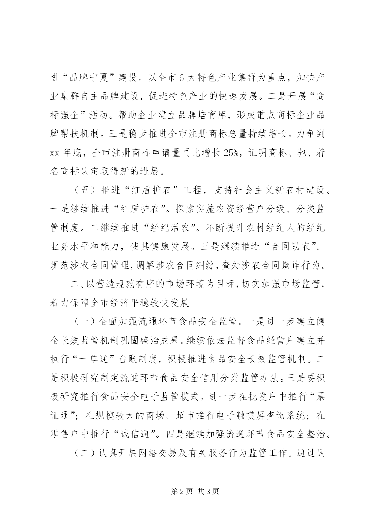 第PAGE\*Arabic\*MERGEFORMAT3页共NUMPAGES\*MERGEFORMAT3页XX年工商局工作计划一、以支持地方经济发展为重点,不断加大服务力度,全面提升服务发展的层次和效果(一)强力推行12315“五进”工作,促进社会和谐发展。科学整合12315网络,实现维权服务网络的全覆盖,以保护社区居民、农村村民、学校学生等弱势群体消费权益为重点,突出抓好消费维权教育“进校园、进社区、进农村、进超市、进企业”工作,以全新的面貌迎接全国消费维权“五进”工作现场会的召开。(二)建立健全服务制度,为促进地方经济的发展出谋划策。一是建立“工商顾问制度”。向企业提出有针对性、可操作性的政策建议。二是进一步完善市场主体登记发布制度。为推进经济结构调整和增长方式转变搞好服务。三是进一步发挥工商联络员作用。拓宽“绿色通道”,对企业进行行政指导,帮助解决企业在组建和发展过程中遇到的问题。(三)制定具体措施,为促进地方经济的发展创造条件。一是继续细化我局制定的42条措施,围绕推进民营经济发展和招商引资工作搞好服务。二是关注社会就业问题。做到培养一家,发展一家,壮大一家,形成“数质并举”的民营经济发展导向。三是大力支持xx市工业园区建设、招商引资项目和新农村建设。(四)认真实施商标战略,支持企业做大做强。一是大力推进“品牌宁夏”建设。以全市6大特色产业集群为重点,加快产业集群自主品牌建设,促进特色产业的快速发展。二是开展“商标强企”活动。帮助企业建立品牌培育库,形成重点商标企业品牌帮扶机制。三是稳步推进全市注册商标总量持续增长。力争到xx年底,全市注册商标申请量同比增长25%,证明商标、驰、着名商标认定取得新的进展。(五)推进“红盾护农”工程,支持社会主义新农村建设。一是继续推进“红盾护农”。探索实施农资经营户分级、分类监管制度。二继续推进“经纪活农”。不断提升农村经纪人的经纪业务水平和能力,使其健康发展。三是继续推进“合同助农”。规范涉农合同管理,调解涉农合同纠纷,查处涉农合同欺诈行为。二、以营造规范有序的市场环境为目标,切实加强市场监管,着力保障全市经济平稳较快发展(一)全面加强流通环节食品安全监管。一是进一步建立健全长效监管机制巩固整治成果。继续依法监督食品经营户建立并执行“一单通”台账制度,积极推进食品安全长效监管机制。二是积极研究制定流通环节食品安全信用分类监管办法。三是要积极研究推行食品安全电子监管模式。进一步在批发户中推行“票证通”;在规模较大的商场、超市推行电子触摸屏查询系统;在零售户中推行“诚信通”。四是继续加强流通环节食品安全整治。(二)认真开展网络交易及有关服务行为监管工作。通过调研排查,建立起网络交易市场监管机制;通过行政指导,引导从事网络商品交易经营者依法经营;通过网络监管,规范网络商品交易市场的经营行为。