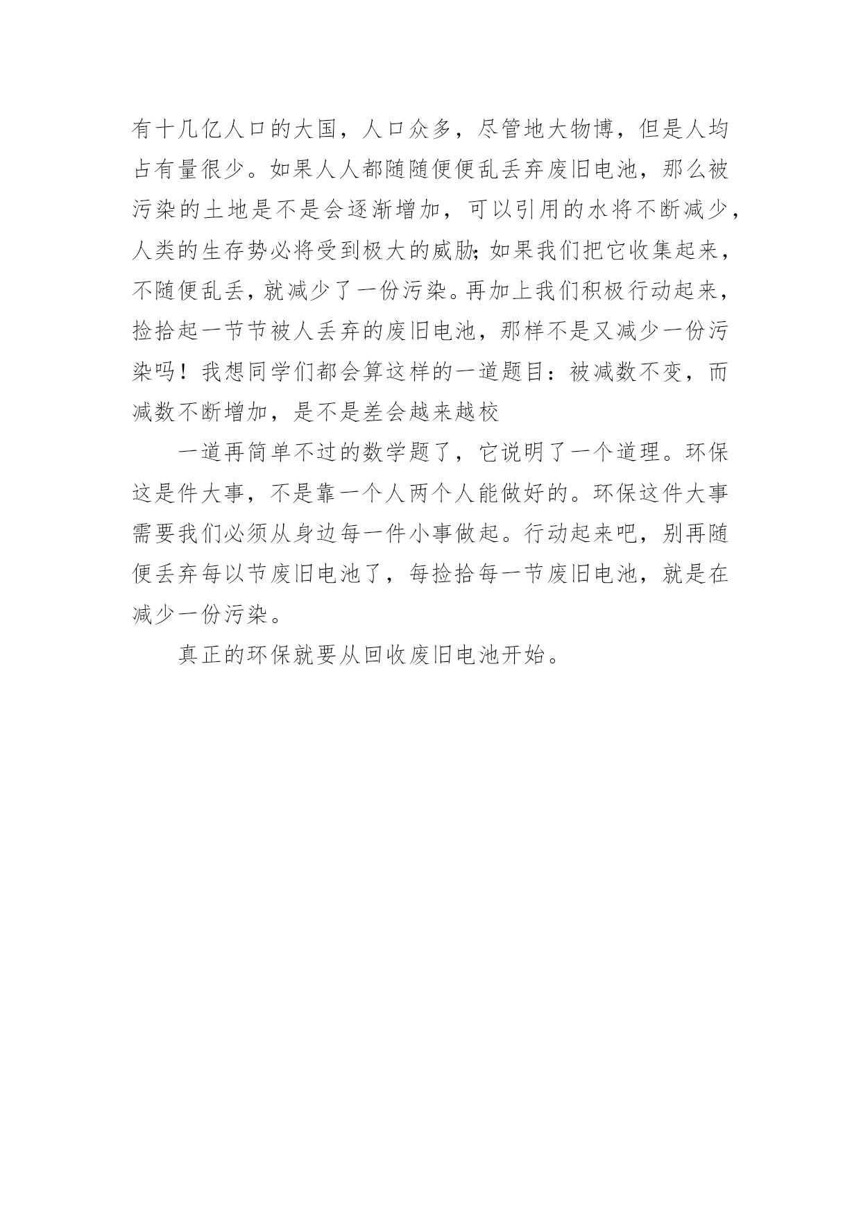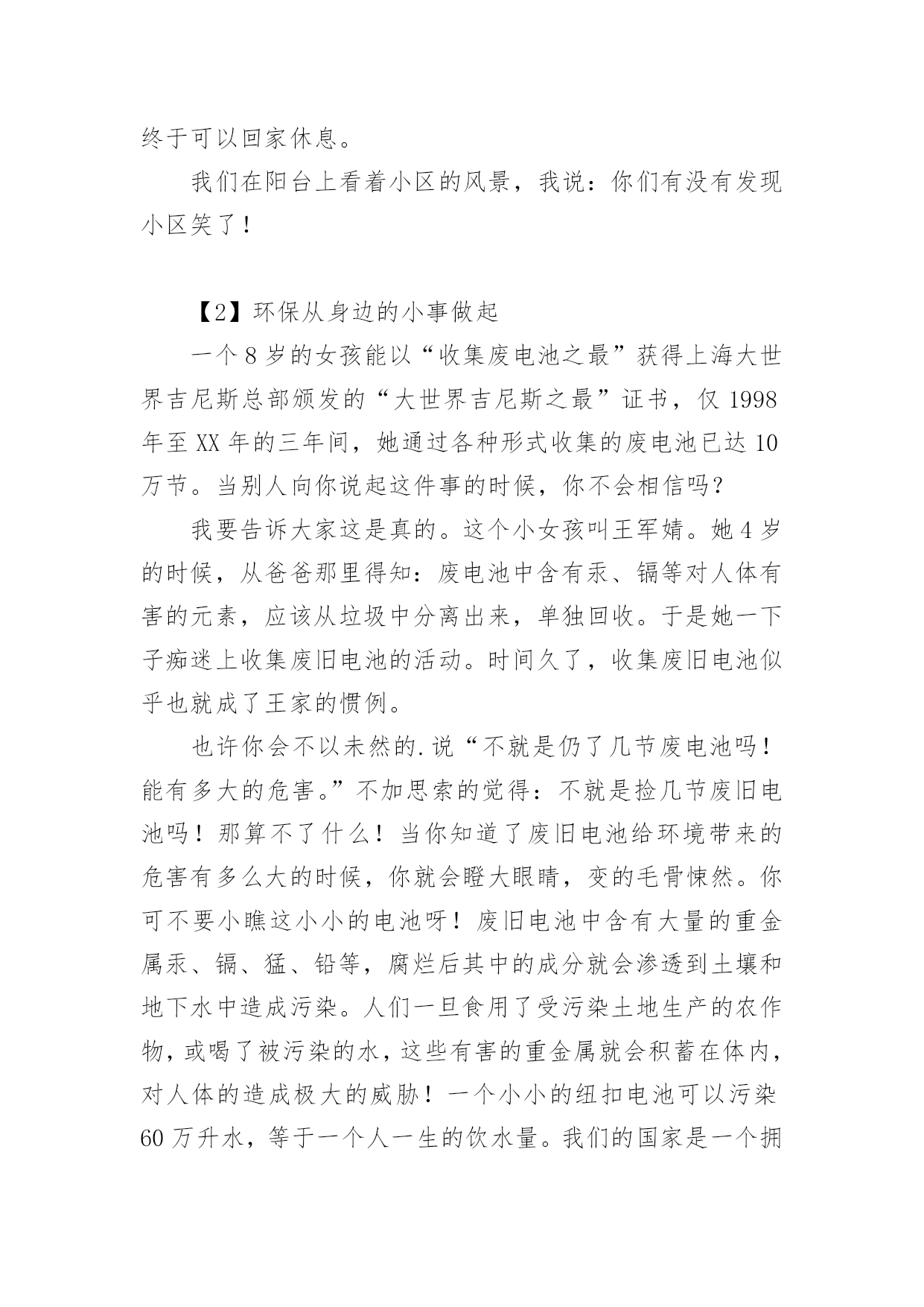 环保应从身边的小事做起作文环保,全称环境保护,是指人类为解决现实的或潜在的环境问题,协调人类与环境的关系,保障经济社会的持续发展而采取的各种行动的总称。下面小编为大家整理了两篇关于环保的学生作文,欢迎大家阅读借鉴!【1】环保从身边的小事做起在我们的生活中,我们太需要环保这个词了。因为我发现。我们身边还有太多不环保的人了。而这些不环保的人也没意识到自己的错误,比如摘花,踩草,乱砍树。因为太多人不环保了!也影响到到了我们小区。那迷人可爱的小花越来越少,青绿挺拔的小草渐渐暗黄,高大健壮的树木个个都弯了腰,垃圾满地,到处都有人在吐痰。所以我和我的小伙伴准备保护我们的小区。所以我第二天就和小伙伴相约在小区的运动场所里。我们几个就想,我们应该捡起所有在小区内的矿泉水瓶。我们行动了!各自都在忙活着打扫小区。经过半个多小时的.努力小区干净了!但我发现我们的小区还是存在着很多问题。比如树的叶子黄了腰也弯了。花也少了,草也枯了。所有我又找到了小伙伴们。我和他们说了我的心思后,大家都同意了。我们要开始环保了!我们在小区里看到树弯了就把它推上去变直,看它叶子黄了就在水池边接水给它浇水。忙活了一天的我们终于可以回家休息。我们在阳台上看着小区的风景,我说:你们有没有发现小区笑了!【2】环保从身边的小事做起一个8岁的女孩能以“收集废电池之最”获得上海大世界吉尼斯总部颁发的“大世界吉尼斯之最”证书,仅1998年至XX年的三年间,她通过各种形式收集的废电池已达10万节。当别人向你说起这件事的时候,你不会相信吗?我要告诉大家这是真的。这个小女孩叫王军婧。她4岁的时候,从爸爸那里得知:废电池中含有汞、镉等对人体有害的元素,应该从垃圾中分离出来,单独回收。于是她一下子痴迷上收集废旧电池的活动。时间久了,收集废旧电池似乎也就成了王家的惯例。也许你会不以未然的.说“不就是仍了几节废电池吗!能有多大的危害。”不加思索的觉得:不就是捡几节废旧电池吗!那算不了什么!当你知道了废旧电池给环境带来的危害有多么大的时候,你就会瞪大眼睛,变的毛骨悚然。你可不要小瞧这小小的电池呀!废旧电池中含有大量的重金属汞、镉、猛、铅等,腐烂后其中的成分就会渗透到土壤和地下水中造成污染。人们一旦食用了受污染土地生产的农作物,或喝了被污染的水,这些有害的重金属就会积蓄在体内,对人体的造成极大的威胁!一个小小的纽扣电池可以污染60万升水,等于一个人一生的饮水量。我们的国家是一个拥有十几亿人口的大国,人口众多,尽管地大物博,但是人均占有量很少。如果人人都随随便便乱丢弃废旧电池,那么被污染的土地是不是会逐渐增加,可以引用的水将不断减少,人类的生存势必将受到极大的威胁;如果我们把它收集起来,不随便乱丢,就减少了一份污染。再加上我们积极行动起来,捡拾起一节节被人丢弃的废旧电池,那样不是又减少一份污染吗!我想同学们都会算这样的一道题目:被减数不变,而减数不断增加,是不是差会越来越校一道再简单不过的数学题了,它说明了一个道理。环保这是件大事,不是靠一个人两个人能做好的。环保这件大事需要我们必须从身边每一件小事做起。行动起来吧,别再随便丢弃每以节废旧电池了,每捡拾每一节废旧电池,就是在减少一份污染。真正的环保就要从回收废旧电池开始。