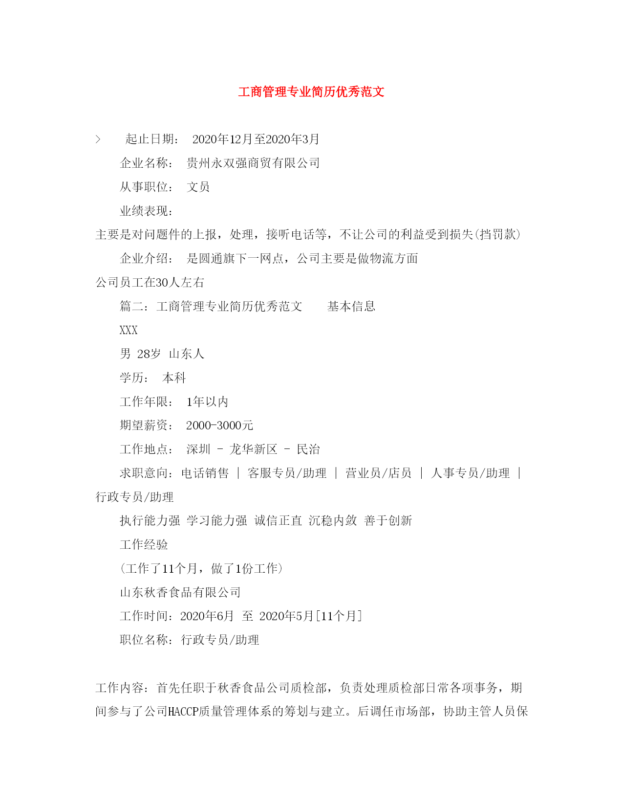 此资料由网络收集而来,如有侵权请告知上传者立即删除。资料共分享,我们负责传递知识。工商管理专业简历优秀范文>起止日期:2020年12月至2020年3月企业名称:贵州永双强商贸有限公司从事职位:文员业绩表现:主要是对问题件的上报,处理,接听电话等,不让公司的利益受到损失(挡罚款)企业介绍:是圆通旗下一网点,公司主要是做物流方面公司员工在30人左右篇二:工商管理专业简历优秀范文基本信息XXX男28岁山东人学历:本科工作年限:1年以内期望薪资:2000-3000元工作地点:深圳-龙华新区-民治求职意向:电话销售|客服专员/助理|营业员/店员|人事专员/助理|行政专员/助理执行能力强学习能力强诚信正直沉稳内敛善于创新工作经验(工作了11个月,做了1份工作)山东秋香食品有限公司工作时间:2020年6月至2020年5月[11个月]职位名称:行政专员/助理工作内容:首先任职于秋香食品公司质检部,负责处理质检部日常各项事务,期间参与了公司HACCP质量管理体系的筹划与建立。后调任市场部,协助主管人员保持同本地各超市的联络沟通,协同各部门在超市设立秋香食品专柜,收集市场数据,并依据顾客反馈对产品加以改进。教育经历2020年6月毕业齐齐哈尔大学工商管理语言技能普通话:较好证书奖项证书名称:大学英语四级颁发时间:2020年12月颁发机构:大学四六级考试委员会自我描述处事沉稳、为人谦和,与他人相处融洽。业务能力强,学习速度快。善于钻研,即使对于陌生业务,也能较快掌握。做事细心,工作态度踏实,富有热情。我会努力为公司创造价值,同时实现自身的发展。