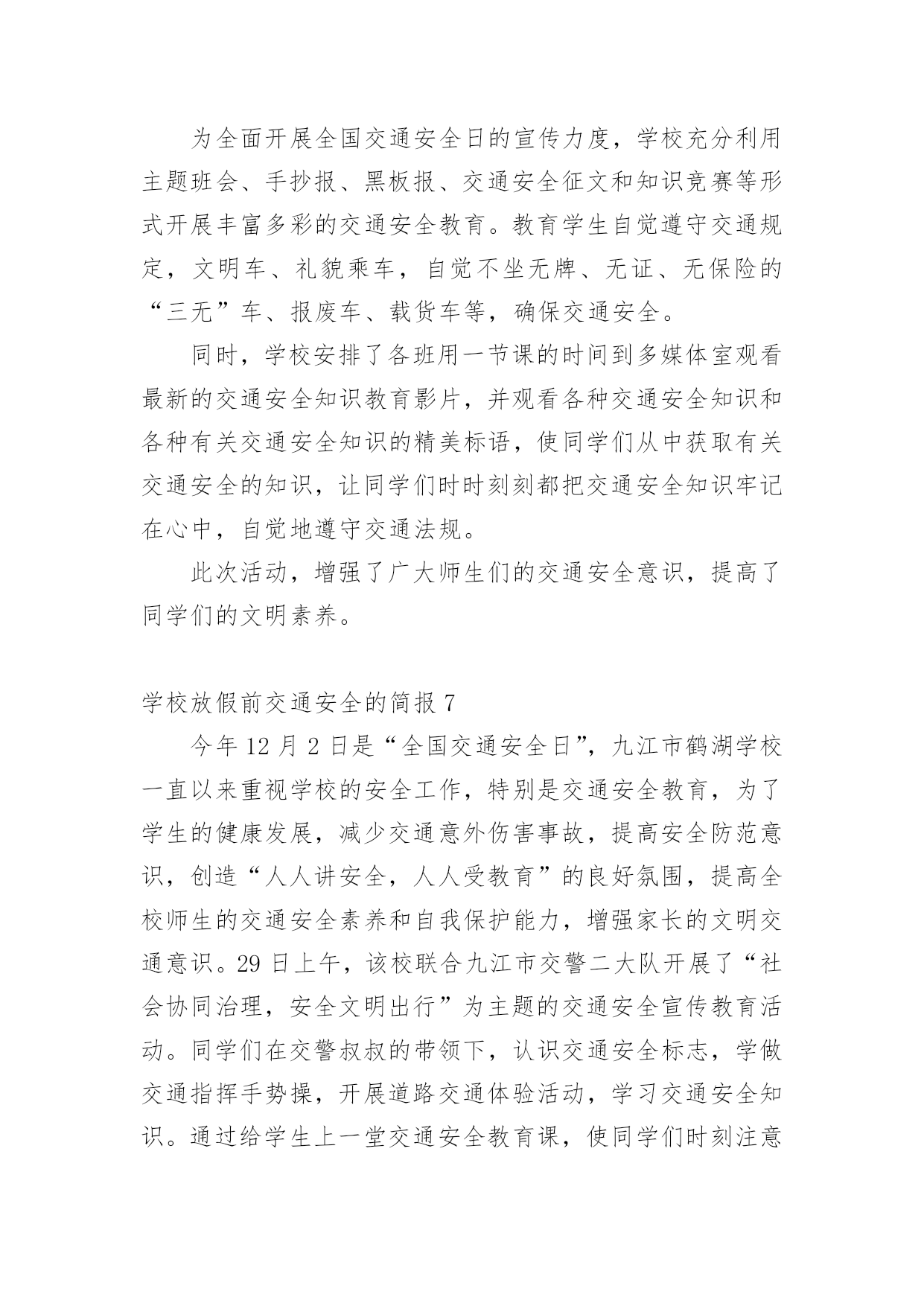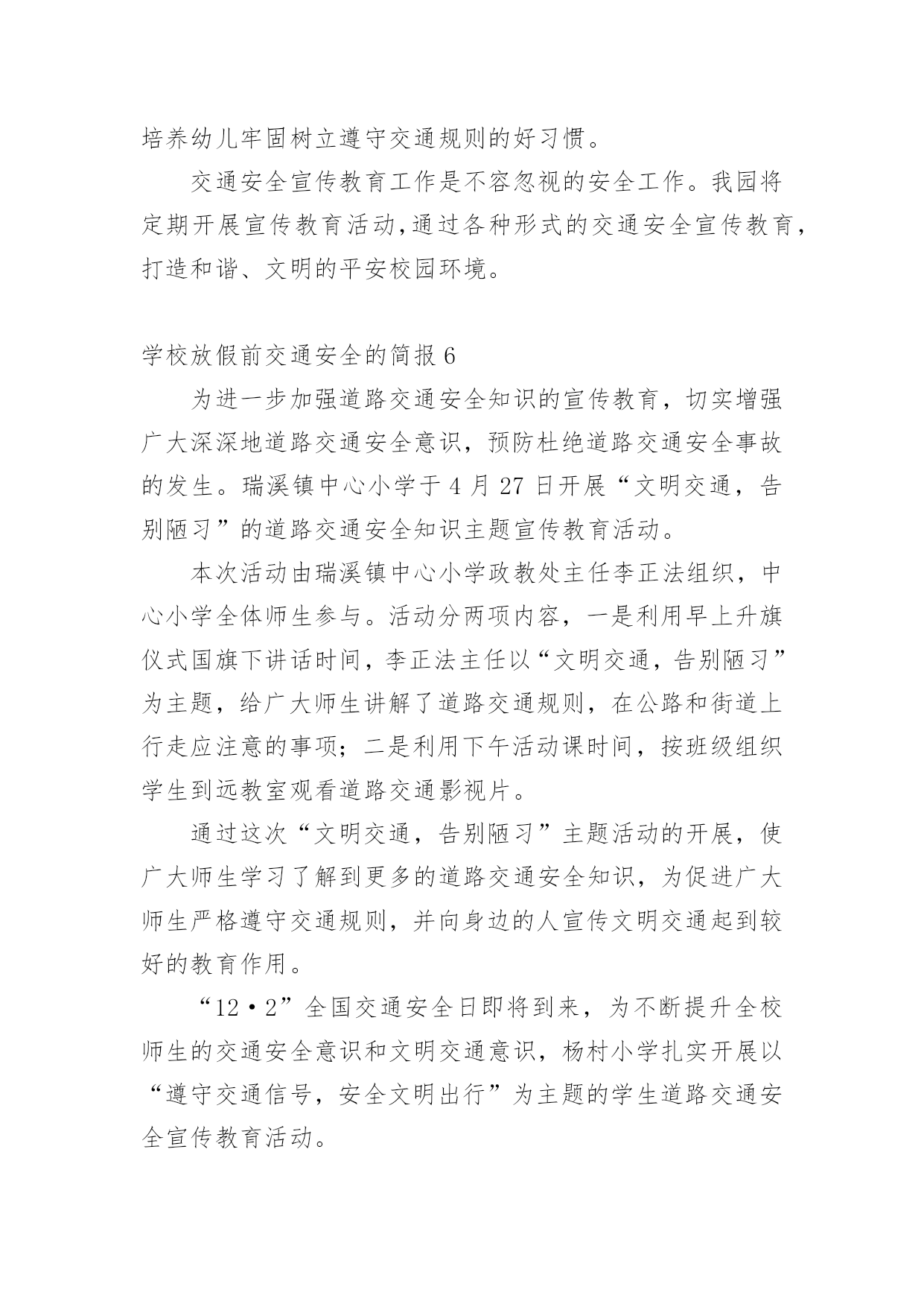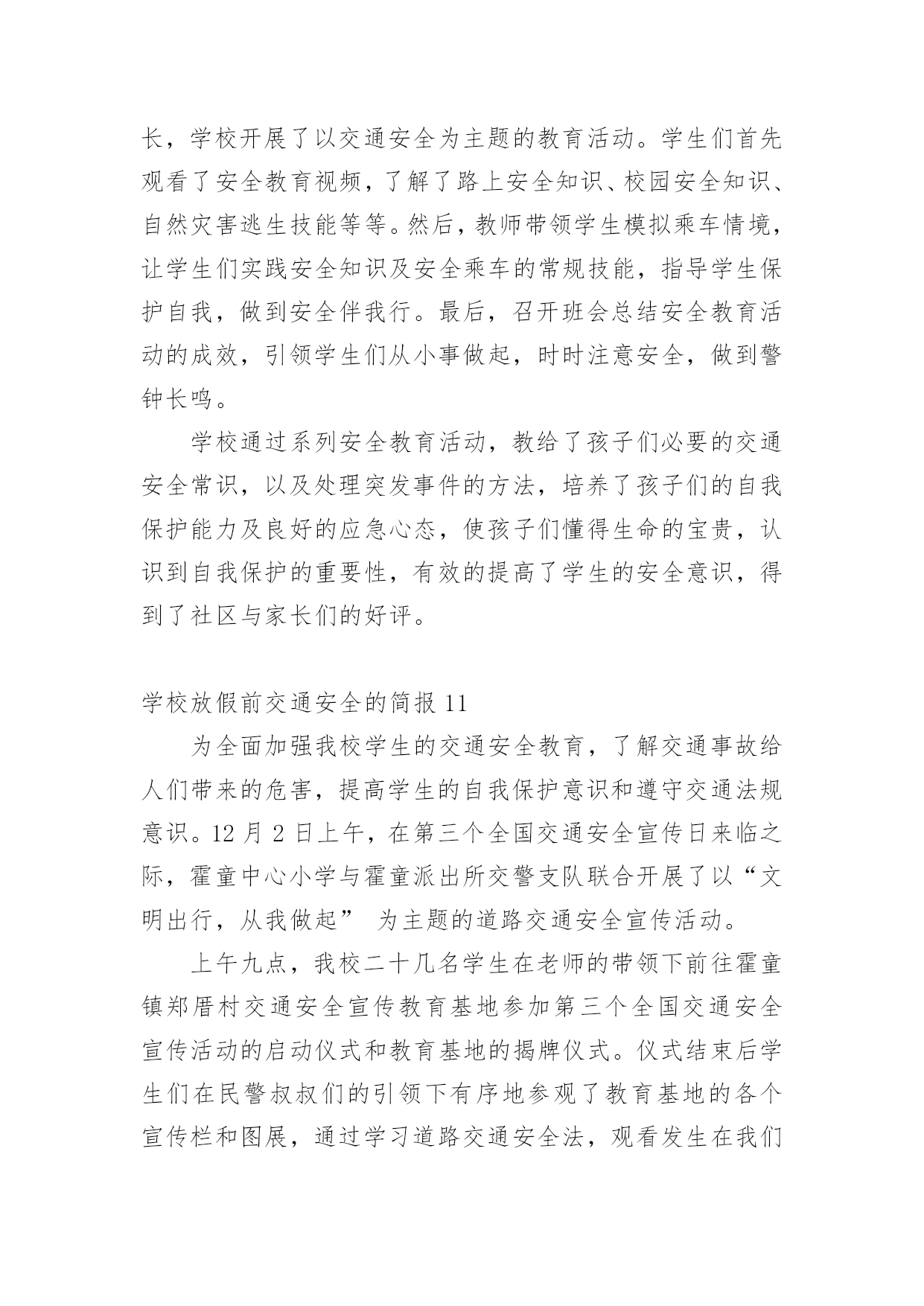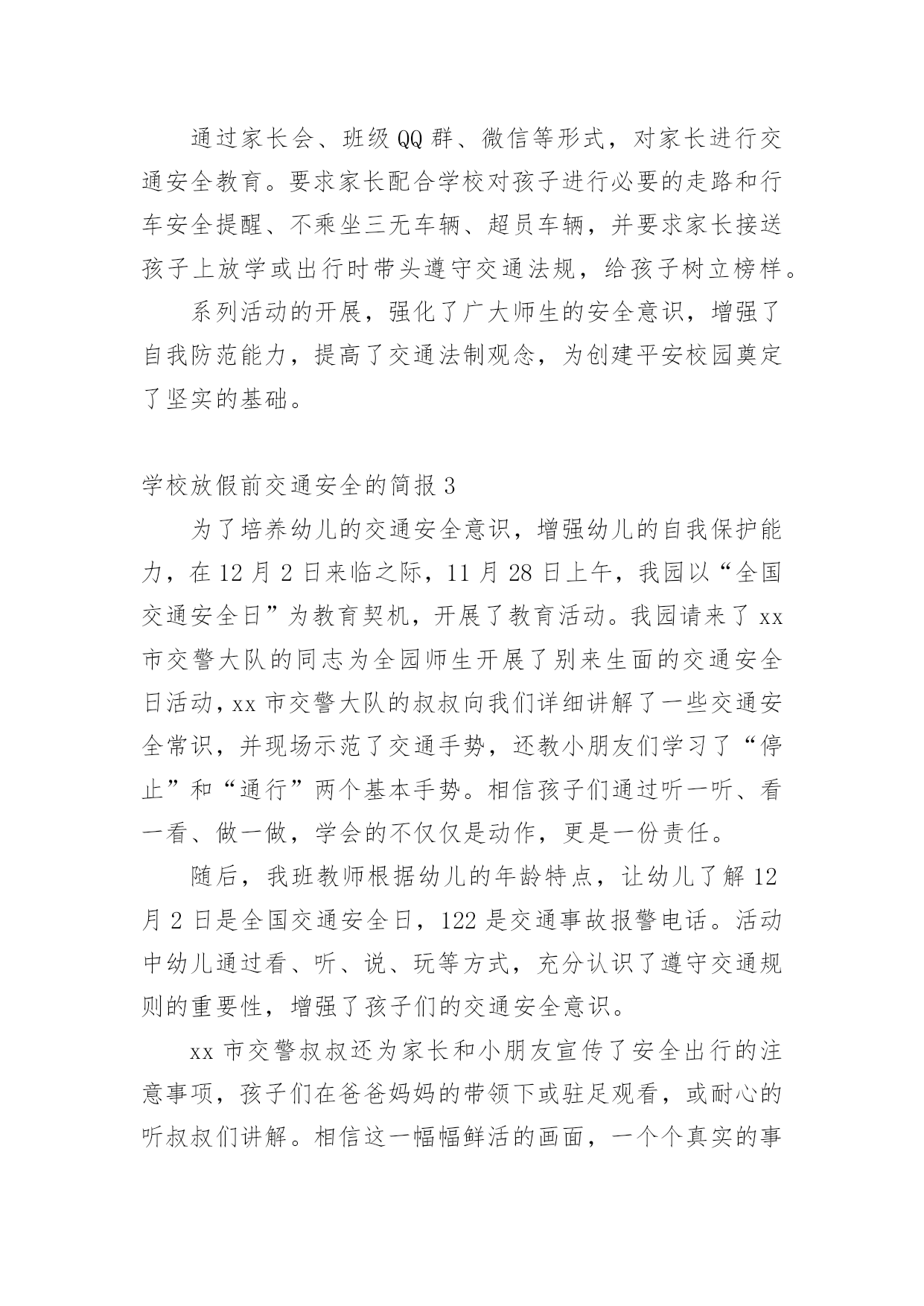 学校放假前交通安全的简报学校放假前交通安全的简报范文(通用14篇)在快速变化和不断变革的新时代,很多情况下我们都会接触到简报,简报是单位领导对一些问题做出决策的参考依据之一,也是单位推动工作的一个重要手段。究竟什么样的简报才是好的简报呢?以下是小编为大家收集的学校放假前交通安全的简报范文(通用14篇),仅供参考,欢迎大家阅读。学校放假前交通安全的简报1为了进一步提高漩小学生交通安全意识和自我安全防护意识,维护广大师生生命财产安全。近日,漩口小学开展了以“关爱学生,平安出行”为主题的道路交通安全宣传活动。大队辅导员为学生们上了交通安全知识讲座课,在为学生讲解交通安全法律法规的基础上,结合交通安全管理工作的实际情况,仔细为学生们强调过马路应注意的细节,并纠正小学生在参与交通过程中常犯的几种错误。为了强化宣传效果,增强宣传实效,大队辅导员还组织学生观看了交通安全宣传警示光碟和交通安全知识展板、分发了交通安全知识资料,对在校学生进行交通安全教育,力争把宣传教育的内容融入到小学生的法制教育和社会实践活动当中。还通过开展“小手拉大手”活动,以自身为宣传源,积极向爸爸妈妈、爷爷奶奶和亲戚朋友宣传交通安全知识,让更多的人了解交通安全知识,文明参与交通,为创造畅通、和谐的交通秩序做贡献。交通安全知识宣传活动的开展,使学生们更好地掌握了交通安全常识,增强了自我保护意识,与此同时,我校大队部科学部署,责任到班,做好学生日常自我保护意识的工作,使我校学生上下学道路交通,安全、有序、畅通。学校放假前交通安全的简报2今年12月2日是国务院批准设立的第xx个“全国交通安全日”,为提升学生交通安全意识、法治意识和文明意识,南江县元潭镇小学开展了一系列宣传教育活动。利用周一的国旗下讲话使全校师生知晓12月2日是“全国交通安全日”。利用学校LED显示屏进行滚动式播放各种交通宣传标语、全国交通安全宣传日的主题和精神。利用班班通设备组织学生观看了交通安全事故案例视频,并到下两派出所索取有关交通安全的图片资料、交通法律、法规、交通标志牌和事故案例图片在学校操场上进行展览。印制、发放了交通安全知识宣传单,采用小手拉大手,让学生把学到的交通安全知识讲给家长听,努力形成全社会共建共享文明交通的良好风尚。把低年级学生带到公路上,现场指导如何横穿公路,如何在公路上列队行走。通过亲身感受锻炼学生的实际能力,让学生感受“遵守交通法规,珍惜生命”的重要性。通过家长会、班级QQ群、微信等形式,对家长进行交通安全教育。要求家长配合学校对孩子进行必要的走路和行车安全提醒、不乘坐三无车辆、超员车辆,并要求家长接送孩子上放学或出行时带头遵守交通法规,给孩子树立榜样。系列活动的开展,强化了广大师生的安全意识,增强了自我防范能力,提高了交通法制观念,为创建平安校园奠定了坚实的基础。学校放假前交通安全的简报3为了培养幼儿的交通安全意识,增强幼儿的自我保护能力,在12月2日来临之际,11月28日上午,我园以“全国交通安全日”为教育契机,开展了教育活动。我园请来了xx市交警大队的同志为全园师生开展了别来生面的交通安全日活动,xx市交警大队的叔叔向我们详细讲解了一些交通安全常识,并现场示范了交通手势,还教小朋友们学习了“停止”和“通行”两个基本手势。相信孩子们通过听一听、看一看、做一做,学会的不仅仅是动作,更是一份责任。随后,我班教师根据幼儿的年龄特点,让幼儿了解12月2日是全国交通安全日,122是交通事故报警电话。活动中幼儿通过看、听、说、玩等方式,充分认识了遵守交通规则的重要性,增强了孩子们的交通安全意识。xx市交警叔叔还为家长和小朋友宣传了安全出行的注意事项,孩子们在爸爸妈妈的带领下或驻足观看,或耐心的听叔叔们讲解。相信这一幅幅鲜活的画面,一个个真实的事例,一定会给大家带来警醒,为大家的“安全文明出行”打下坚实的基础。通过此次活动,家长和孩子们进一步了解了交通安全常识,树立了遵守交通规则的意识,培养了文明出行的良好习惯。幼儿认识了常见的交通标志,了解了交通标志的作用和特征,认识到交通知识的重要性,加强了幼儿的安全意识,提高了幼儿自我保护的能力,让幼儿从小树立“文明出行、珍惜生命”的'意识,让安全伴随每一位幼儿健康茁壮成长!学校放假前交通安全的简报4为了更好营造安全、有序、文明的校园周边交通环境,培养师生良好的交通安全意识,教育学生关爱生命、拒绝违章,严防道路交通事故,提高自我保护能力。为此,养正中心小学特邀晋江市公安局交警大队蔡忠警官一行来校给三年段1—4年级的学生作了交通安全主题宣教活动。讲座中,晋江市公安局交警大队李警官就同学们面临的交通环境、事故发生原因、交通法规、事故后怎么做等几个方面进行讲述,通报了近几年我县交通事故死伤和损失情况。讲座结合生活中的`交通违规案例进行分析,用血的事实深入