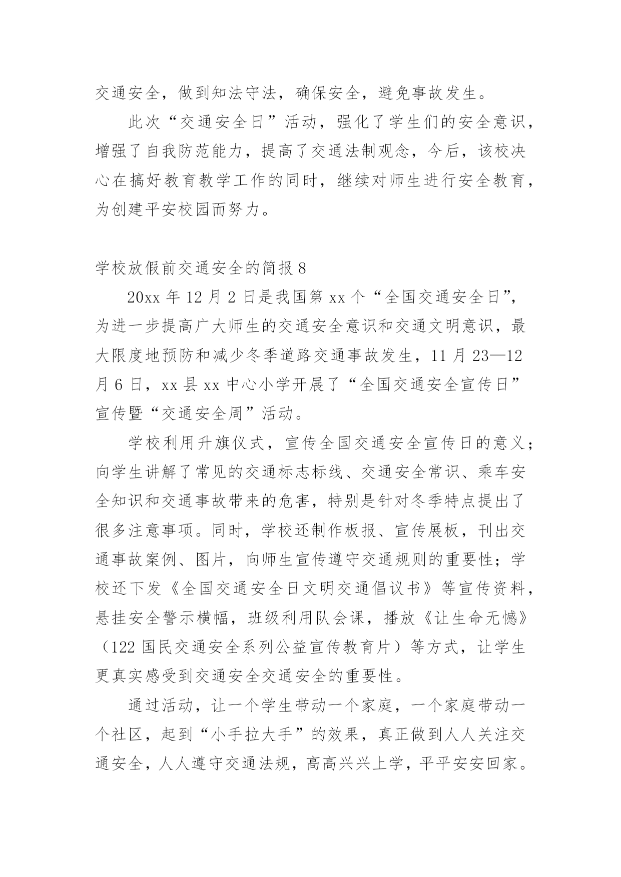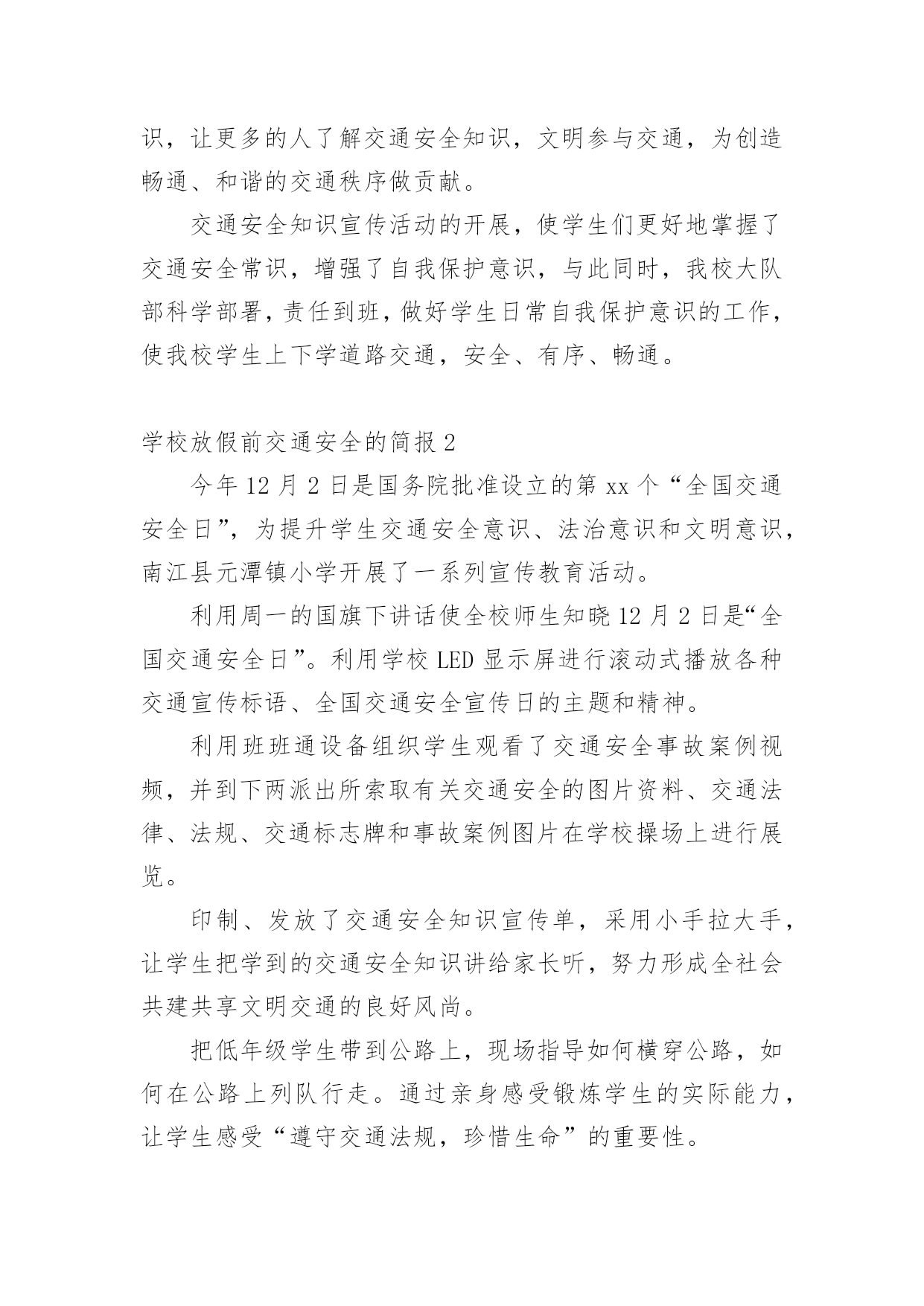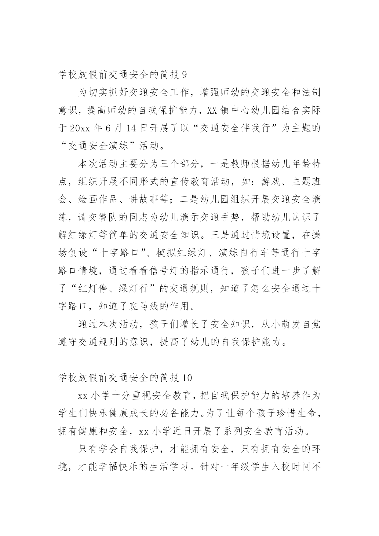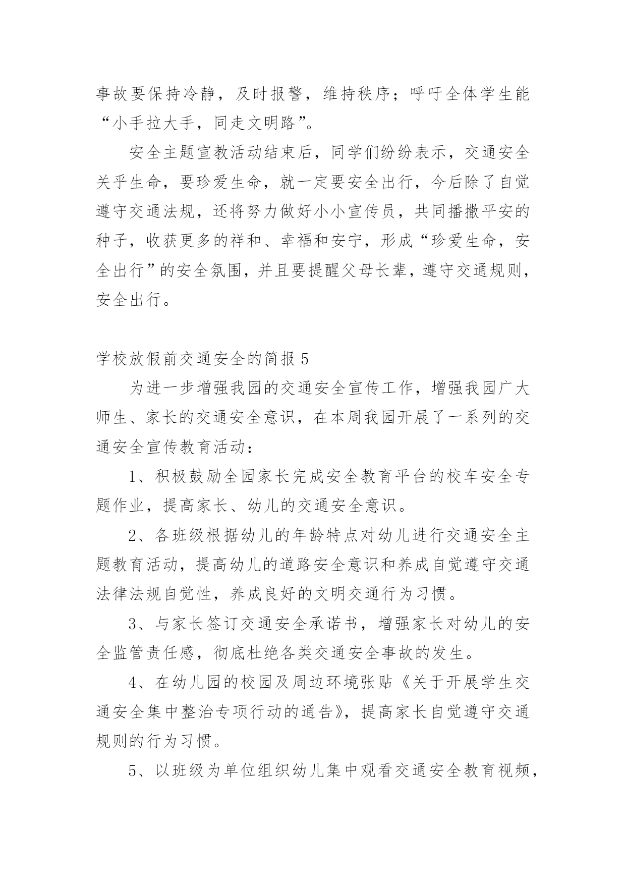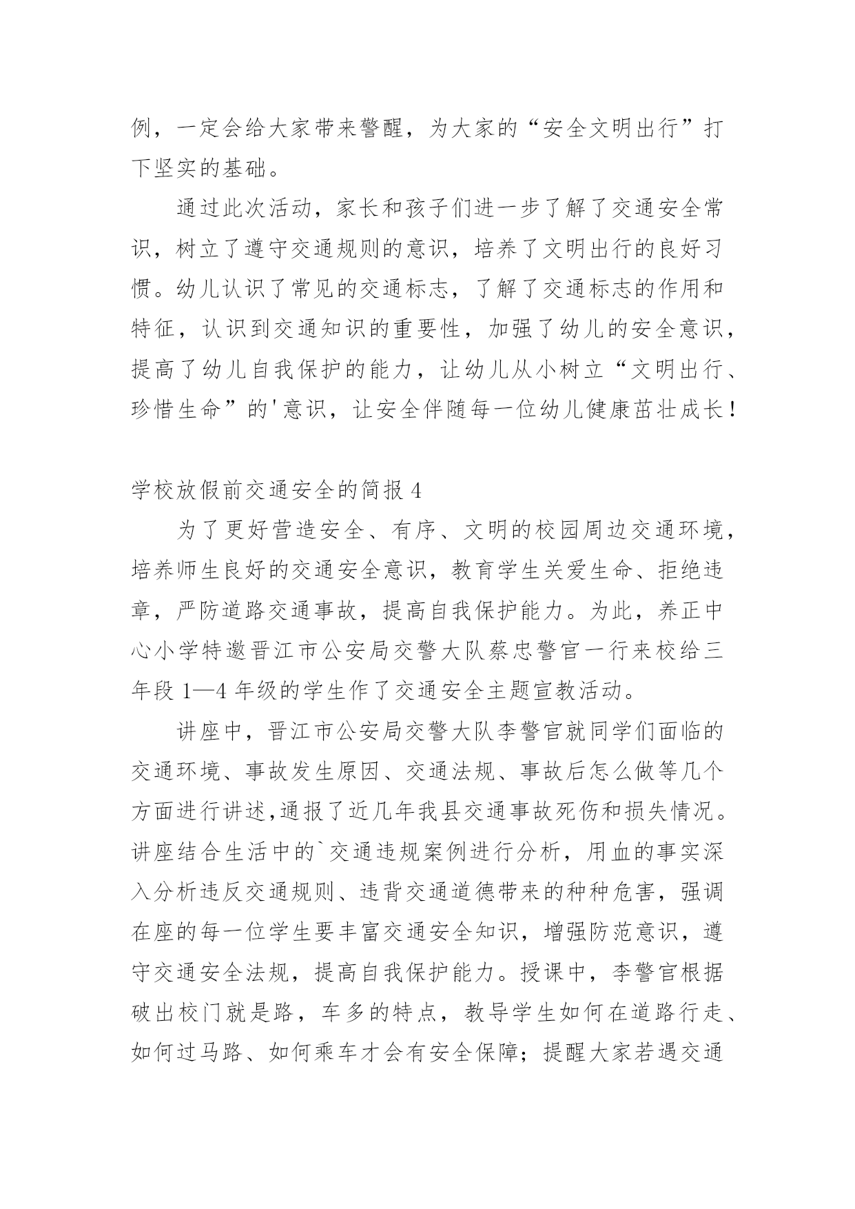 学校放假前交通安全的简报学校放假前交通安全的简报范文(通用14篇)在快速变化和不断变革的新时代,很多情况下我们都会接触到简报,简报是单位领导对一些问题做出决策的参考依据之一,也是单位推动工作的一个重要手段。究竟什么样的简报才是好的简报呢?以下是小编为大家收集的学校放假前交通安全的简报范文(通用14篇),仅供参考,欢迎大家阅读。学校放假前交通安全的简报1为了进一步提高漩小学生交通安全意识和自我安全防护意识,维护广大师生生命财产安全。近日,漩口小学开展了以“关爱学生,平安出行”为主题的道路交通安全宣传活动。大队辅导员为学生们上了交通安全知识讲座课,在为学生讲解交通安全法律法规的基础上,结合交通安全管理工作的实际情况,仔细为学生们强调过马路应注意的细节,并纠正小学生在参与交通过程中常犯的几种错误。为了强化宣传效果,增强宣传实效,大队辅导员还组织学生观看了交通安全宣传警示光碟和交通安全知识展板、分发了交通安全知识资料,对在校学生进行交通安全教育,力争把宣传教育的内容融入到小学生的法制教育和社会实践活动当中。还通过开展“小手拉大手”活动,以自身为宣传源,积极向爸爸妈妈、爷爷奶奶和亲戚朋友宣传交通安全知识,让更多的人了解交通安全知识,文明参与交通,为创造畅通、和谐的交通秩序做贡献。交通安全知识宣传活动的开展,使学生们更好地掌握了交通安全常识,增强了自我保护意识,与此同时,我校大队部科学部署,责任到班,做好学生日常自我保护意识的工作,使我校学生上下学道路交通,安全、有序、畅通。学校放假前交通安全的简报2今年12月2日是国务院批准设立的第xx个“全国交通安全日”,为提升学生交通安全意识、法治意识和文明意识,南江县元潭镇小学开展了一系列宣传教育活动。利用周一的国旗下讲话使全校师生知晓12月2日是“全国交通安全日”。利用学校LED显示屏进行滚动式播放各种交通宣传标语、全国交通安全宣传日的主题和精神。利用班班通设备组织学生观看了交通安全事故案例视频,并到下两派出所索取有关交通安全的图片资料、交通法律、法规、交通标志牌和事故案例图片在学校操场上进行展览。印制、发放了交通安全知识宣传单,采用小手拉大手,让学生把学到的交通安全知识讲给家长听,努力形成全社会共建共享文明交通的良好风尚。把低年级学生带到公路上,现场指导如何横穿公路,如何在公路上列队行走。通过亲身感受锻炼学生的实际能力,让学生感受“遵守交通法规,珍惜生命”的重要性。通过家长会、班级QQ群、微信等形式,对家长进行交通安全教育。要求家长配合学校对孩子进行必要的走路和行车安全提醒、不乘坐三无车辆、超员车辆,并要求家长接送孩子上放学或出行时带头遵守交通法规,给孩子树立榜样。系列活动的开展,强化了广大师生的安全意识,增强了自我防范能力,提高了交通法制观念,为创建平安校园奠定了坚实的基础。学校放假前交通安全的简报3为了培养幼儿的交通安全意识,增强幼儿的自我保护能力,在12月2日来临之际,11月28日上午,我园以“全国交通安全日”为教育契机,开展了教育活动。我园请来了xx市交警大队的同志为全园师生开展了别来生面的交通安全日活动,xx市交警大队的叔叔向我们详细讲解了一些交通安全常识,并现场示范了交通手势,还教小朋友们学习了“停止”和“通行”两个基本手势。相信孩子们通过听一听、看一看、做一做,学会的不仅仅是动作,更是一份责任。随后,我班教师根据幼儿的年龄特点,让幼儿了解12月2日是全国交通安全日,122是交通事故报警电话。活动中幼儿通过看、听、说、玩等方式,充分认识了遵守交通规则的重要性,增强了孩子们的交通安全意识。xx市交警叔叔还为家长和小朋友宣传了安全出行的注意事项,孩子们在爸爸妈妈的带领下或驻足观看,或耐心的听叔叔们讲解。相信这一幅幅鲜活的画面,一个个真实的事例,一定会给大家带来警醒,为大家的“安全文明出行”打下坚实的基础。通过此次活动,家长和孩子们进一步了解了交通安全常识,树立了遵守交通规则的意识,培养了文明出行的良好习惯。幼儿认识了常见的交通标志,了解了交通标志的作用和特征,认识到交通知识的重要性,加强了幼儿的安全意识,提高了幼儿自我保护的能力,让幼儿从小树立“文明出行、珍惜生命”的'意识,让安全伴随每一位幼儿健康茁壮成长!学校放假前交通安全的简报4为了更好营造安全、有序、文明的校园周边交通环境,培养师生良好的交通安全意识,教育学生关爱生命、拒绝违章,严防道路交通事故,提高自我保护能力。为此,养正中心小学特邀晋江市公安局交警大队蔡忠警官一行来校给三年段1—4年级的学生作了交通安全主题宣教活动。讲座中,晋江市公安局交警大队李警官就同学们面临的交通环境、事故发生原因、交通法规、事故后怎么做等几个方面进行讲述,通报了近几年我县交通事故死伤和损失情况。讲座结合生活中的`交通违规案例进行分析,用血的事实深入