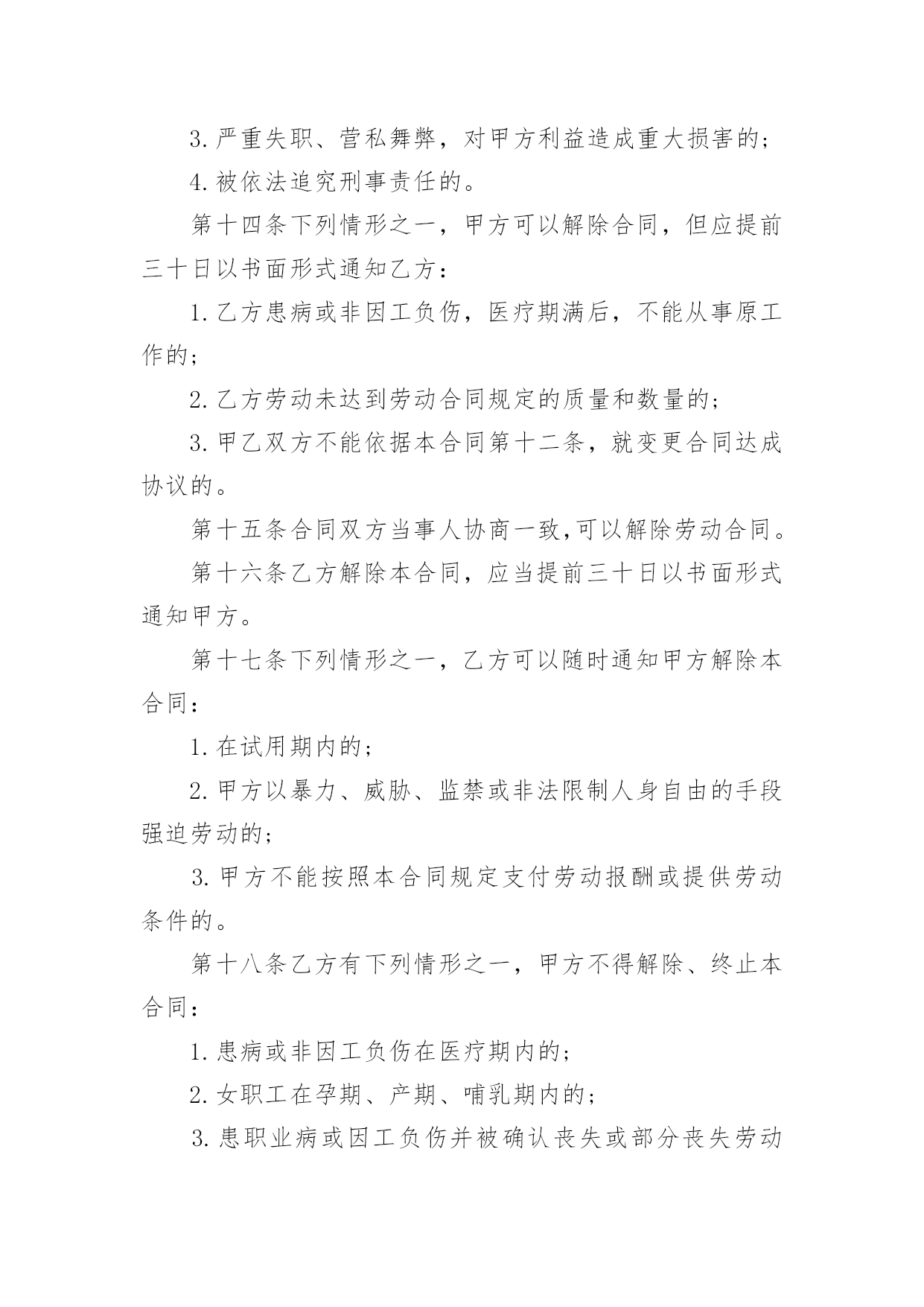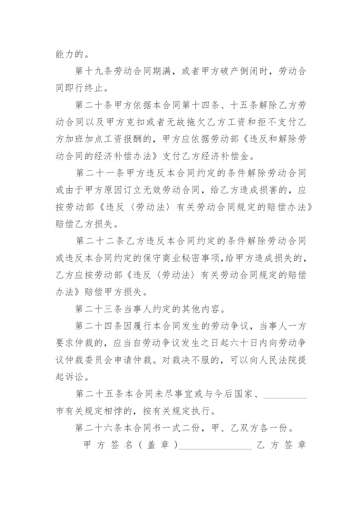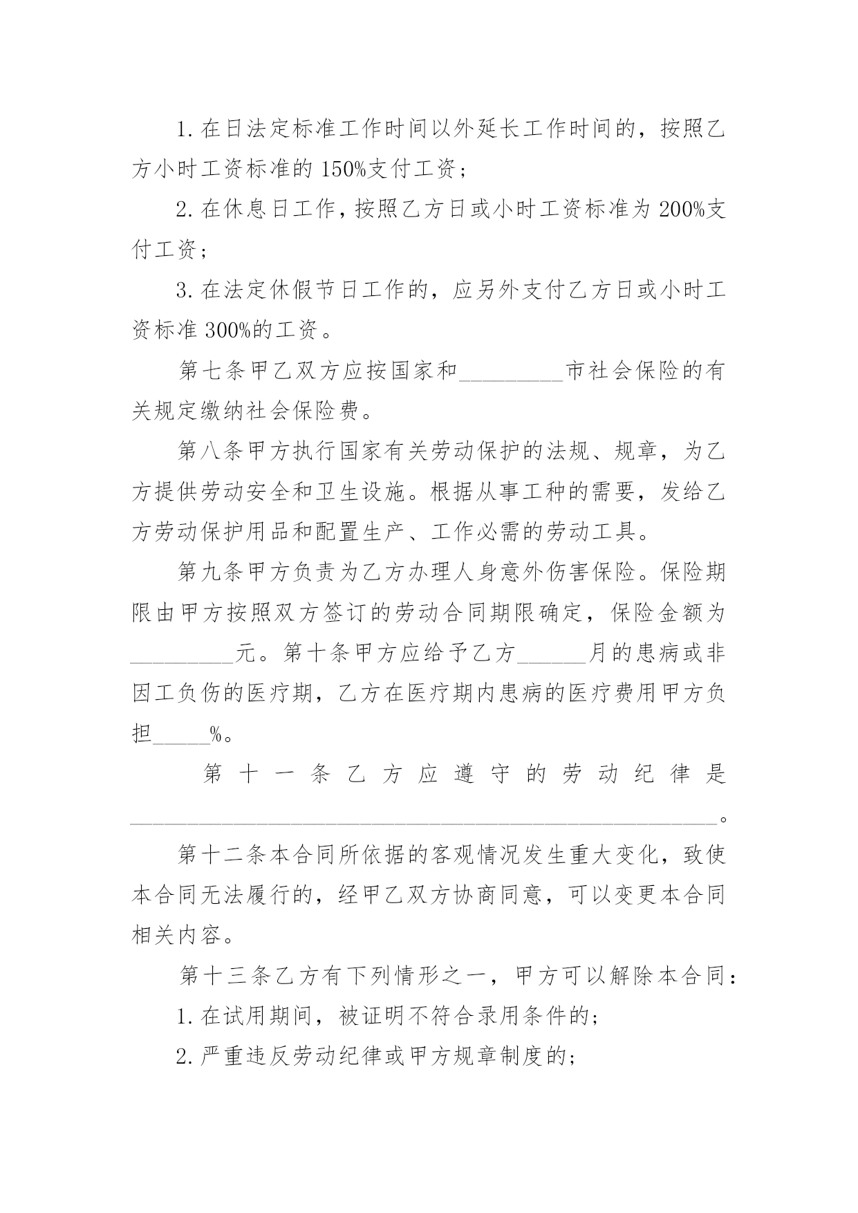 个体工商户雇工劳动协议在不断进步的社会中,协议与我们的生活息息相关,签订协议可以使双方受到法律的保护。协议的注意事项有许多,你确定会写吗?下面是小编帮大家整理的个体工商户雇工劳动协议,仅供参考,希望能够帮助到大家。雇主(以下简称甲方)与受雇职工(以下简称乙方)根据《中华人民共和国劳动法》和《_________》,甲乙双方经平等协商同意,自愿签订本合同,共同遵守本合同所列条款。第一条本合同期限自_________年______月______日开始,至_________年_____月_____日终止,其中试用期_________天。第二条乙方同意在甲方从事_________工作。第三条甲方对乙方的劳动质量和数量要求是_________。第四条甲方每月______日以_________货币形式支付乙方工资,工资不低于________元,其中试用期间工资为_________元。第五条甲方安排乙方每日工作时间不超过8小时,每周不超过40小时,甲方保证乙方每周至少休息一日,因工作需要延长工作时间的,经乙方同意延长工作时间每日不得超过3小时,每月不得超过36小时。第六条甲方安排乙方加班加点的,甲方应依法支付加班加点工资,按以下标准支付工资:1.在日法定标准工作时间以外延长工作时间的,按照乙方小时工资标准的150%支付工资;2.在休息日工作,按照乙方日或小时工资标准为200%支付工资;3.在法定休假节日工作的,应另外支付乙方日或小时工资标准300%的工资。第七条甲乙双方应按国家和_________市社会保险的有关规定缴纳社会保险费。第八条甲方执行国家有关劳动保护的法规、规章,为乙方提供劳动安全和卫生设施。根据从事工种的需要,发给乙方劳动保护用品和配置生产、工作必需的劳动工具。第九条甲方负责为乙方办理人身意外伤害保险。保险期限由甲方按照双方签订的劳动合同期限确定,保险金额为_________元。第十条甲方应给予乙方______月的患病或非因工负伤的医疗期,乙方在医疗期内患病的医疗费用甲方负担_____%。第十一条乙方应遵守的劳动纪律是___________________________________________________。第十二条本合同所依据的客观情况发生重大变化,致使本合同无法履行的,经甲乙双方协商同意,可以变更本合同相关内容。第十三条乙方有下列情形之一,甲方可以解除本合同:1.在试用期间,被证明不符合录用条件的;2.严重违反劳动纪律或甲方规章制度的;3.严重失职、营私舞弊,对甲方利益造成重大损害的;4.被依法追究刑事责任的。第十四条下列情形之一,甲方可以解除合同,但应提前三十日以书面形式通知乙方:1.乙方患病或非因工负伤,医疗期满后,不能从事原工作的;2.乙方劳动未达到劳动合同规定的质量和数量的;3.甲乙双方不能依据本合同第十二条,就变更合同达成协议的。第十五条合同双方当事人协商一致,可以解除劳动合同。第十六条乙方解除本合同,应当提前三十日以书面形式通知甲方。第十七条下列情形之一,乙方可以随时通知甲方解除本合同:1.在试用期内的;2.甲方以暴力、威胁、监禁或非法限制人身自由的手段强迫劳动的;3.甲方不能按照本合同规定支付劳动报酬或提供劳动条件的。第十八条乙方有下列情形之一,甲方不得解除、终止本合同:1.患病或非因工负伤在医疗期内的;2.女职工在孕期、产期、哺乳期内的;3.患职业病或因工负伤并被确认丧失或部分丧失劳动能力的。第十九条劳动合同期满,或者甲方破产倒闭时,劳动合同即行终止。第二十条甲方依据本合同第十四条、十五条解除乙方劳动合同以及甲方克扣或者无故拖欠乙方工资和拒不支付乙方加班加点工资报酬的,甲方应依据劳动部《违反和解除劳动合同的经济补偿办法》支付乙方经济补偿金。第二十一条甲方违反本合同约定的条件解除劳动合同或由于甲方原因订立无效劳动合同,给乙方造成损害的,应按劳动部《违反〈劳动法〉有关劳动合同规定的赔偿办法》赔偿乙方损失。第二十二条乙方违反本合同约定的条件解除劳动合同或违反本合同约定的保守商业秘密事项,给甲方造成损失的,乙方应按劳动部《违反〈劳动法〉有关劳动合同规定的赔偿办法》赔偿甲方损失。第二十三条当事人约定的其他内容。第二十四条因履行本合同发生的劳动争议,当事人一方要求仲裁的,应当自劳动争议发生之日起六十日内向劳动争议仲裁委员会申请仲裁。对裁决不服的,可以向人民法院提起诉讼。第二十五条本合同未尽事宜或与今后国家、_________市有关规定相悖的,按有关规定执行。第二十六条本合同书一式二份,甲、乙双方各一份。甲方签名(盖章)_______________乙方签章_______________________签订日期:______年_____月____日鉴证机关(盖章)_______________鉴证员(签章)
