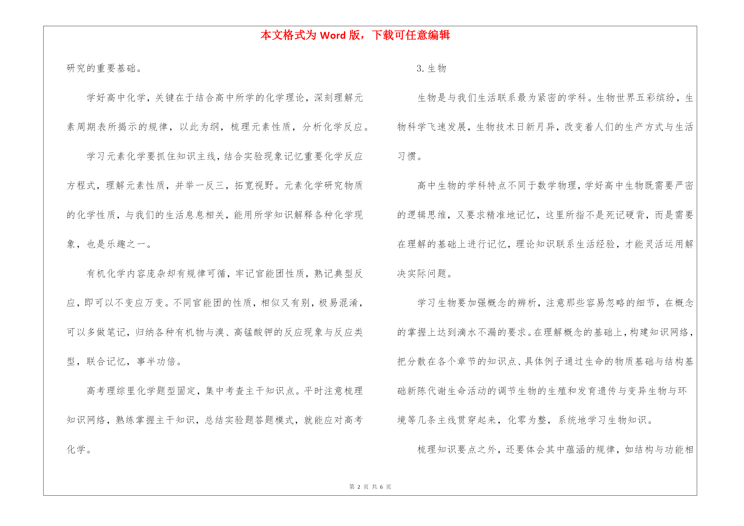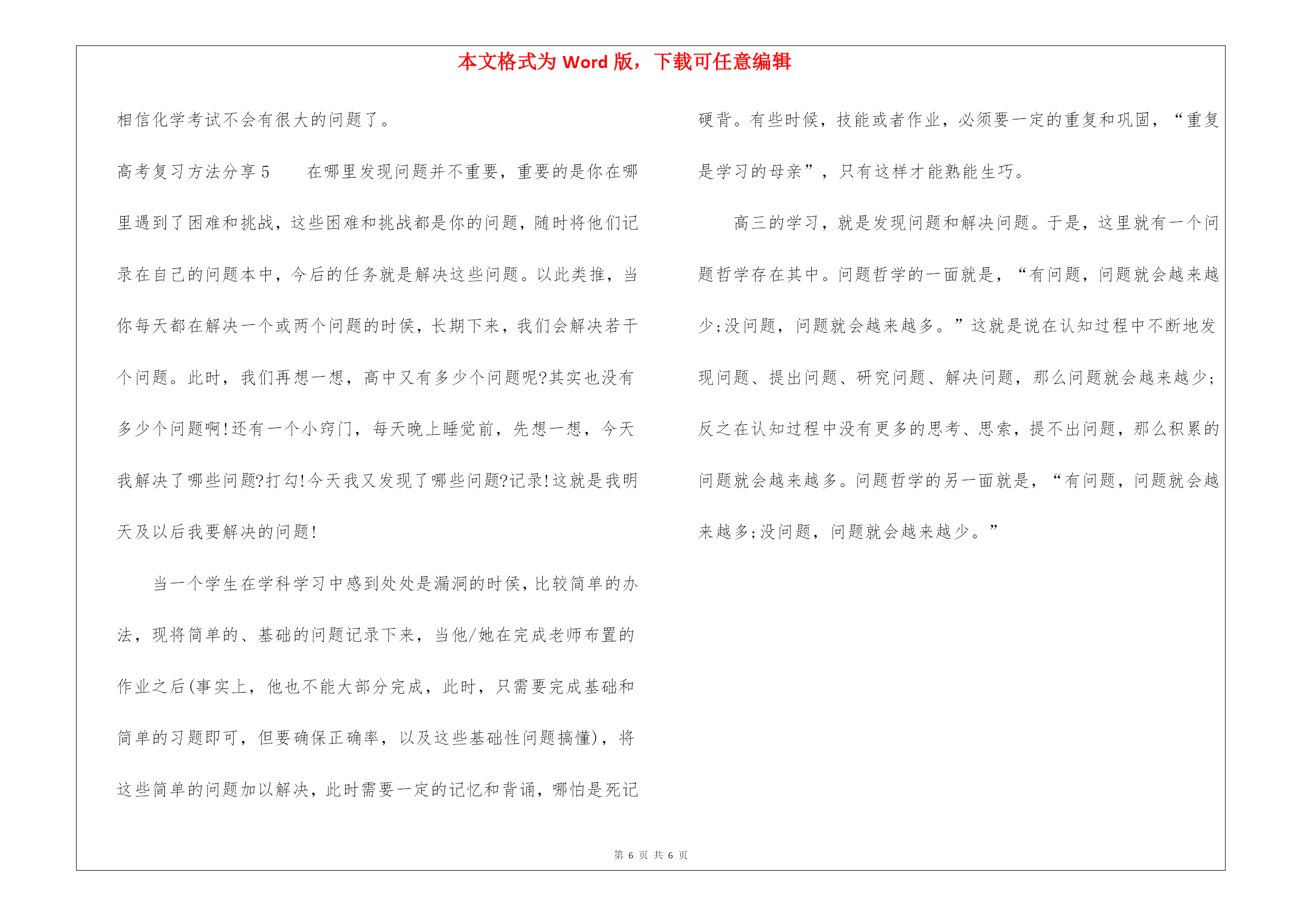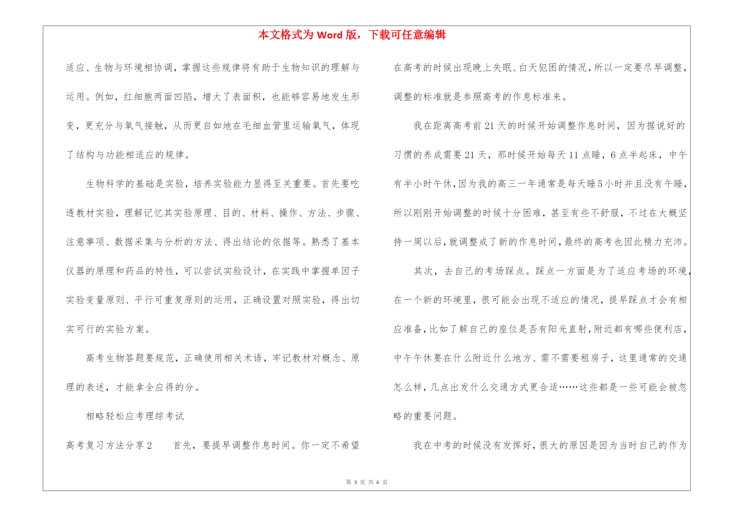 本文格式为Word版,下载可任意编辑第PAGE\*MERGEFORMAT6页共NUMPAGES\*MERGEFORMAT6页高考复习方法分享高考复习方法分享高考复习方法分享1高考牛人分享:高考理综复习方法1.物理如今知道,物理学照亮世界并非狂言。物理学是研究自然界的物质结构、物体间的相互作用和物体运动最一般规律的自然科学,对客观世界的规律作出了深刻地揭示,同时在物理学发展、成长的过程中,人们摸索出了一整套独特而卓有成效的思想方法体系。作为现代科学的基础,物理学不仅有着广泛的应用,而且不断改变人们的世界观、价值观与思维方式,深刻影响人类文明的进程。学习物理首先要深入理解基本概念,只有理解公式、定理的推导过程及其含义,才能记得更牢固,运用更自由。品味概念的内涵,思考其物理意义与其揭示的客观现象的本质属性,拓展概念的外延,把抽象概念还原到具体情景中。一般来说,解决物理问题先要把具体的生活情景抽象成物理模型,再运用物理知识找出数学关系,进而求出解答。建模能力对物理学习至关重要,就高中阶段而言,记住教材上出现过的常见物理模型,并加以延伸拓展,足以应付考试。物理解题要有清晰的思路,把陌生的情景转化成熟识的问题,套用熟悉的解题模式。比如,解有关碰撞的题目,一般就是先看有没有外力,没有的话,列出一个动量守恒方程,一个动能定理,把题搞定,解完全弹性碰撞的方程的特殊技巧,需要反复记忆至熟练掌握。2.化学化学是一门基础性、创造性和实用性的学科,是一门研究物质组成、结构性质和变化规律的科学,是研制新物质的科学,是信息科学、材料科学、能源科学、环境科学、海洋科学、生命科学和空间技术等研究的重要基础。学好高中化学,关键在于结合高中所学的化学理论,深刻理解元素周期表所揭示的规律,以此为纲,梳理元素性质,分析化学反应。学习元素化学要抓住知识主线,结合实验现象记忆重要化学反应方程式,理解元素性质,并举一反三,拓宽视野。元素化学研究物质的化学性质,与我们的生活息息相关,能用所学知识解释各种化学现象,也是乐趣之一。有机化学内容庞杂却有规律可循,牢记官能团性质,熟记典型反应,即可以不变应万变。不同官能团的性质,相似又有别,极易混淆,可以多做笔记,归纳各种有机物与溴、高锰酸钾的反应现象与反应类型,联合记忆,事半功倍。高考理综里化学题型固定,集中考查主干知识点。平时注意梳理知识网络,熟练掌握主干知识,总结实验题答题模式,就能应对高考化学。3.生物生物是与我们生活联系最为紧密的学科。生物世界五彩缤纷,生物科学飞速发展,生物技术日新月异,改变着人们的生产方式与生活习惯。高中生物的学科特点不同于数学物理,学好高中生物既需要严密的逻辑思维,又要求精准地记忆,这里所指不是死记硬背,而是需要在理解的基础上进行记忆,理论知识联系生活经验,才能灵活运用解决实际问题。学习生物要加强概念的辨析,注意那些容易忽略的细节,在概念的掌握上达到滴水不漏的要求。在理解概念的基础上,构建知识网络,把分散在各个章节的知识点、具体例子通过生命的物质基础与结构基础新陈代谢生命活动的调节生物的生殖和发育遗传与变异生物与环境等几条主线贯穿起来,化零为整,系统地学习生物知识。梳理知识要点之外,还要体会其中蕴涵的规律,如结构与功能相适应、生物与环境相协调,掌握这些规律将有助于生物知识的理解与运用。例如,红细胞两面凹陷,增大了表面积,也能够容易地发生形变,更充分与氧气接触,从而更自如地在毛细血管里运输氧气,体现了结构与功能相适应的规律。生物科学的基础是实验,培养实验能力显得至关重要。首先要吃透教材实验,理解记忆其实验原理、目的、材料、操作、方法、步骤、注意事项、数据采集与分析的方法、得出结论的依据等。熟悉了基本仪器的原理和药品的特性,可以尝试实验设计,在实践中掌握单因子实验变量原则、平行可重复原则的运用,正确设置对照实验,得出切实可行的实验方案。高考生物答题要规范,正确使用相关术语,牢记教材对概念、原理的表述,才能拿全应得的分。相略轻松应考理综考试高考复习方法分享2首先,要提早调整作息时间。你一定不希望在高考的时候出现晚上失眠、白天犯困的情况,所以一定要尽早调整,调整的标准就是参照高考的作息标准来。我在距离高考前21天的时候开始调整作息时间,因为据说好的习惯的养成需要21天,那时候开始每天11点睡,6点半起床,中午有半小时午休,因为我的高三一年通常是每天睡5小时并且没有午睡,所以刚刚开始调整的时候十分困难,甚至有些不舒服,不过在大概坚持一周以后,就调整成了新的作息时间,最终的高考也因此精力充沛。其次,去自己的考场踩点。踩点一方面是为了适应考场的环境,在一个新的环境里,很可能会出现不适应的情况,提早踩点才会有相应准备,比如了解自己的座位是否有阳光直射,附近都有哪些便利店,中午午休要在什么附近什么地方