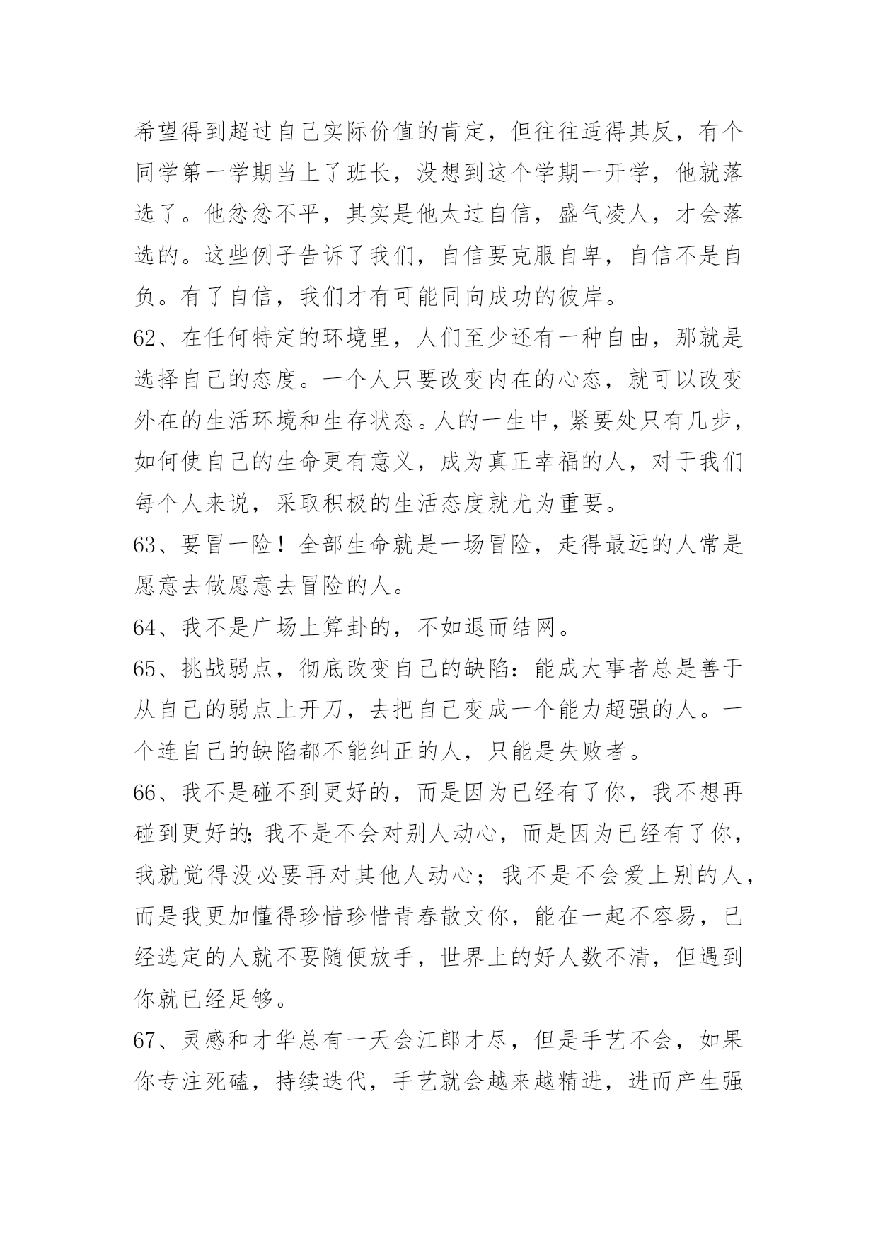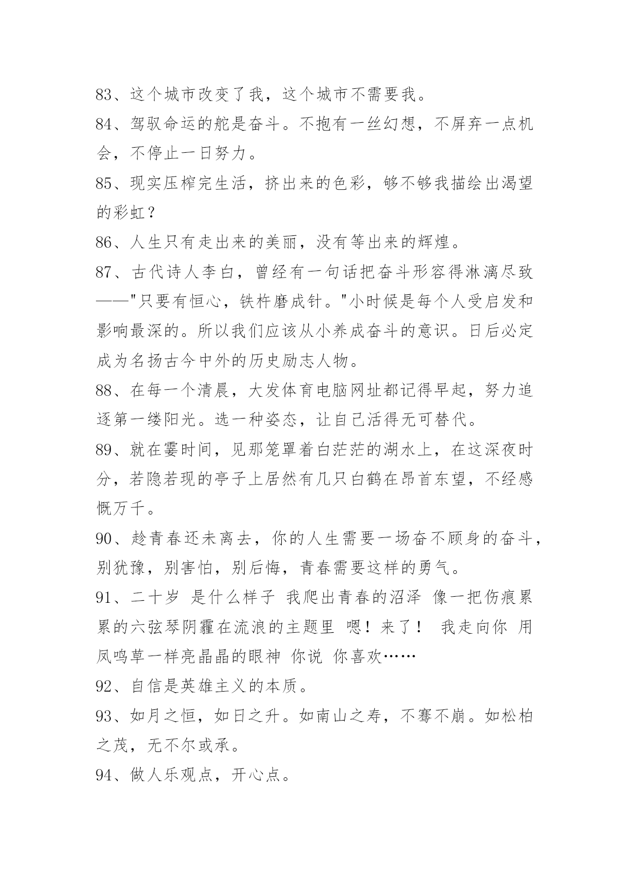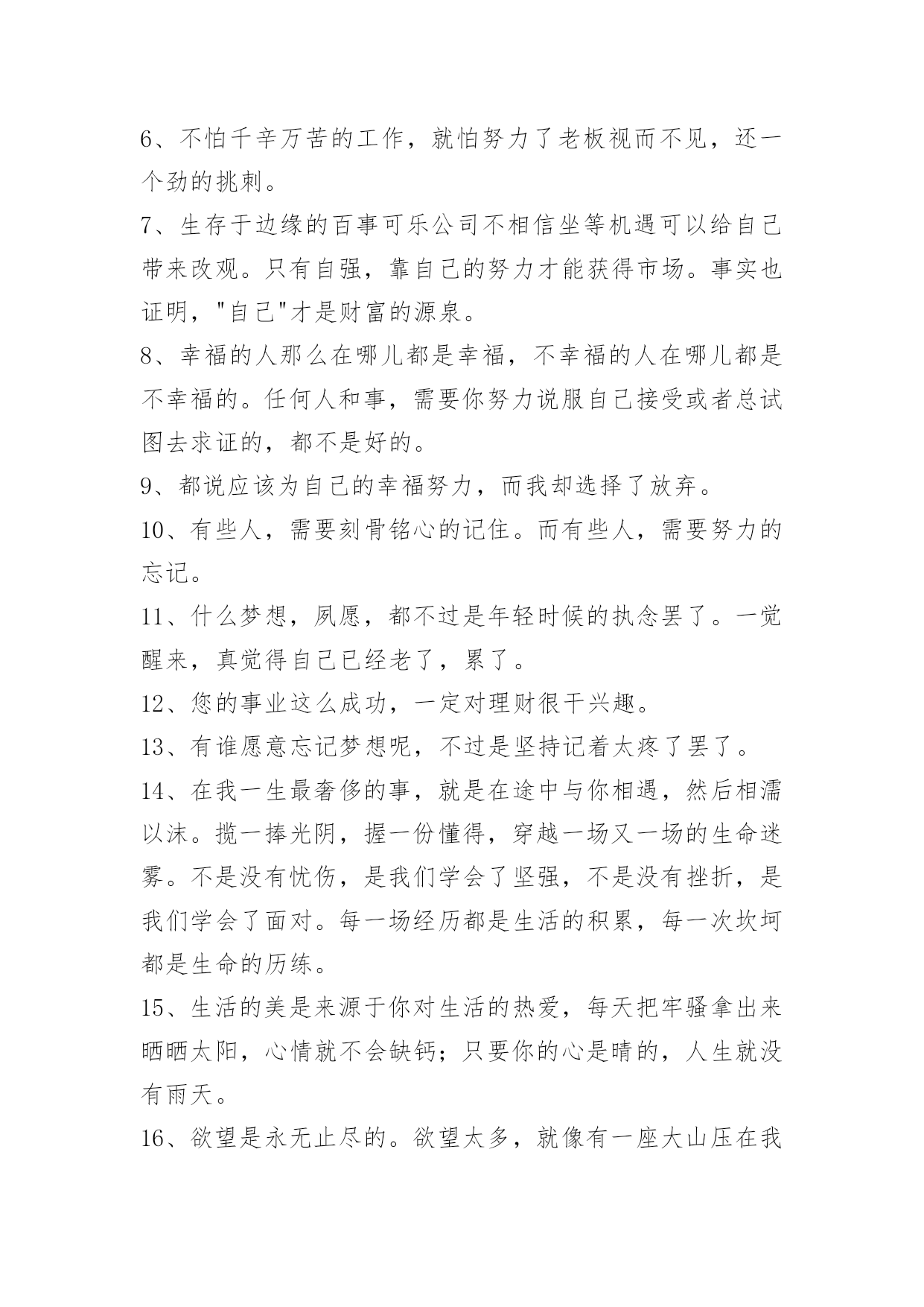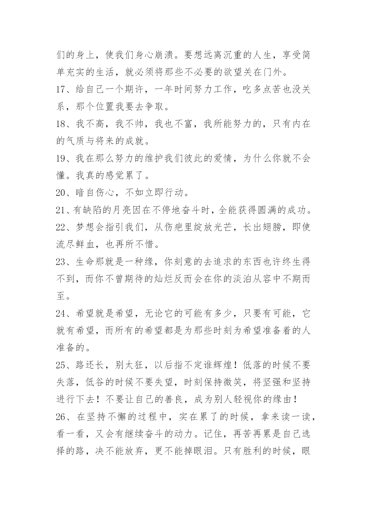 奋斗励志的句子100条【热门】奋斗励志的句子100条小时候,希望自己快点长大,长大了,却发现遗失了童年;单身时,羡慕恋人的甜蜜,恋爱时,怀念单身的自由。很多事物,没有得到时总觉得美好,得到之后才开始明白:我们在得到的同时也在失去。对自己说,有得有失,淡然面对。以下是小编为大家整理推荐的奋斗励志的句子100条,希望大家喜欢。1、你即是我心中的棉花糖,甜美的梦想。2、飞机上,乌鸦对乘务员说:给爷来杯水。猪听后也学道:给爷来杯水。乘务员把猪和乌鸦扔出机舱。乌鸦笑着对猪说:傻了吧?爷会飞。外界因素是一种约束条件,自身能力也是一种约束条件,而且往往更重要。所以,别人能成功的事,未必自己就能成功。选择适合自己的行业才是最好的行业,给自己定位。3、梁文道《我执》:你所见到的,只不过是自己的想象。你以为是自己的,只不过是种偶然。握得越紧越是徒然。4、人一生凭本事可挣上百万元;超过千万元以上靠的是德,靠的是理念,靠的是人助,靠的是时代和环境。5、这世界只要留心去看,应该还有许多当做的事。为了找不到工作而怨叹的人,我认为是没有真正付出努力去寻找的缘故。6、不怕千辛万苦的工作,就怕努力了老板视而不见,还一个劲的挑刺。7、生存于边缘的百事可乐公司不相信坐等机遇可以给自己带来改观。只有自强,靠自己的努力才能获得市场。事实也证明,"自己"才是财富的源泉。8、幸福的人那么在哪儿都是幸福,不幸福的人在哪儿都是不幸福的。任何人和事,需要你努力说服自己接受或者总试图去求证的,都不是好的。9、都说应该为自己的幸福努力,而我却选择了放弃。10、有些人,需要刻骨铭心的记住。而有些人,需要努力的忘记。11、什么梦想,夙愿,都不过是年轻时候的执念罢了。一觉醒来,真觉得自己已经老了,累了。12、您的事业这么成功,一定对理财很干兴趣。13、有谁愿意忘记梦想呢,不过是坚持记着太疼了罢了。14、在我一生最奢侈的事,就是在途中与你相遇,然后相濡以沫。揽一捧光阴,握一份懂得,穿越一场又一场的生命迷雾。不是没有忧伤,是我们学会了坚强,不是没有挫折,是我们学会了面对。每一场经历都是生活的积累,每一次坎坷都是生命的历练。15、生活的美是来源于你对生活的热爱,每天把牢骚拿出来晒晒太阳,心情就不会缺钙;只要你的心是晴的,人生就没有雨天。16、欲望是永无止尽的。欲望太多,就像有一座大山压在我们的身上,使我们身心崩溃。要想远离沉重的人生,享受简单充实的生活,就必须将那些不必要的欲望关在门外。17、给自己一个期许,一年时间努力工作,吃多点苦也没关系,那个位置我要去争取。18、我不高,我不帅,我也不富,我所能努力的,只有内在的气质与将来的成就。19、我在那么努力的维护我们彼此的爱情,为什么你就不会懂。我真的感觉累了。20、暗自伤心,不如立即行动。21、有缺陷的月亮因在不停地奋斗时,全能获得圆满的成功。22、梦想会指引我们,从伤疤里绽放光芒,长出翅膀,即使流尽鲜血,也再所不惜。23、生命那就是一种缘,你刻意的去追求的东西也许终生得不到,而你不曾期待的灿烂反而会在你的淡泊从容中不期而至。24、希望就是希望,无论它的可能有多少,只要有可能,它就有希望,而所有的希望都是为那些时刻为希望准备着的人准备的。25、路还长,别太狂,以后指不定谁辉煌!低落的时候不要失落,低谷的时候不要失望,时刻保持微笑,将坚强和坚持进行下去!不要让自己的善良,成为别人轻视你的缘由!26、在坚持不懈的过程中,实在累了的时候,拿来读一读,看一看,又会有继续奋斗的动力。记住,再苦再累是自己选择的路,决不能放弃,更不能掉眼泪。只有胜利的时候,眼泪才能留下。27、怕的不是绝望的环境,而是一颗绝望的心灵。28、失败并不可怕,最怕的是你放弃努力。29、人在跳板上,最辛苦的不是跳下来那一刻,而是跳下来之前,心里的挣扎、犹豫、无助和患得患失,根本无法向别人倾诉。我们以为跳不过去了,闭上眼睛,鼓起勇气,却跳过了。星期天,早安!30、人生没有真正的绝望。树,在秋天放下了落叶,心很疼。可是,整个冬天,它让心在平静中积蓄力量。春天一到,芳华依然。只要生命还握在手心,人生就没有绝望。人有悲欢离合,月有阴晴圆缺。一时的成败得失对于一生来说,不过来了一场小感冒。心若累了,让它休息,灵魂的修复是人生永不干枯的希望。早晨好!31、自己改变自己的命运。32、有时候你以为自己是世上最苦命的人,可是你没看到多少人,是生生熬过无数个暗无天日的时光才苦尽甘来。他不是比你幸运,只是比你能"熬"。33、命运总是宠爱勇士的。34、所谓天才,只不过是把别人喝咖啡的功夫都用在工作上了。善于利用零星时间的人,才会做出更大的成绩来。35、水急难流滩底月,山高不碍岭头云。36、中国近代文学家林琴南,自幼十分刻苦,勤奋好学,一生创作了大量文学作品,还翻译了多部外国文学著作。他曾在居室的墙上画了