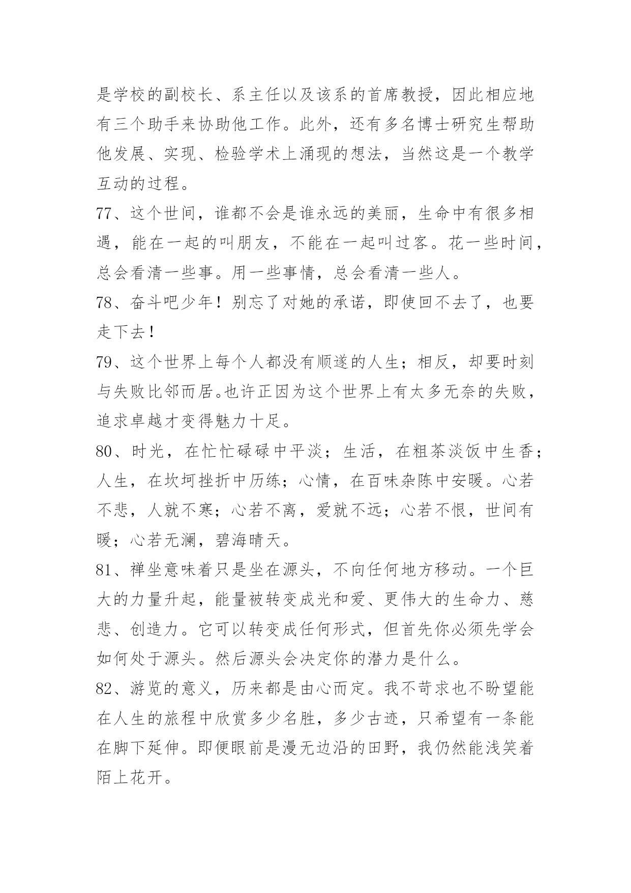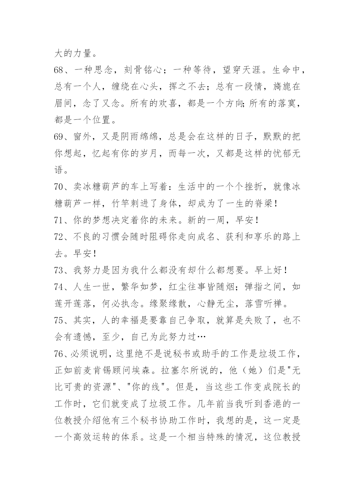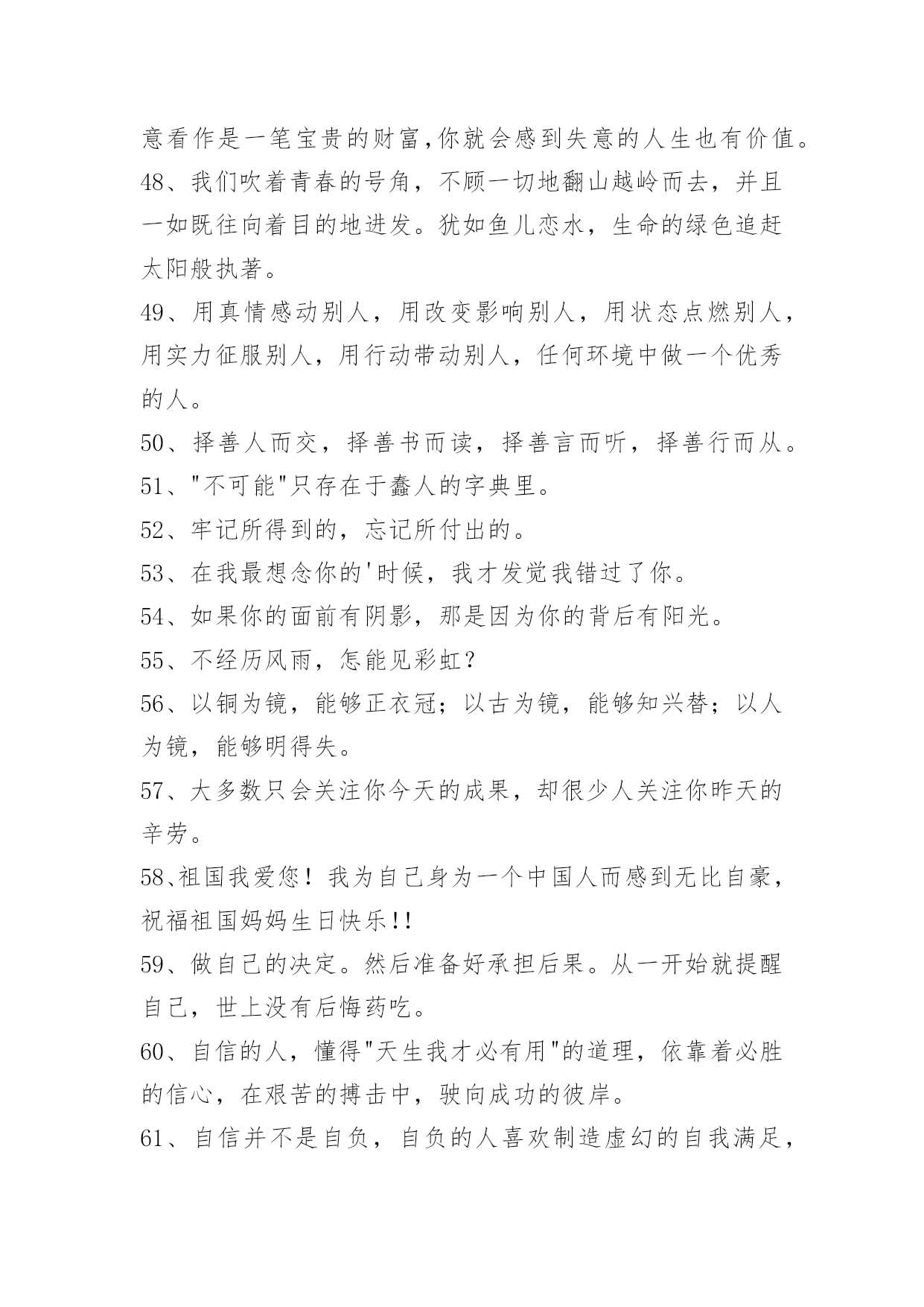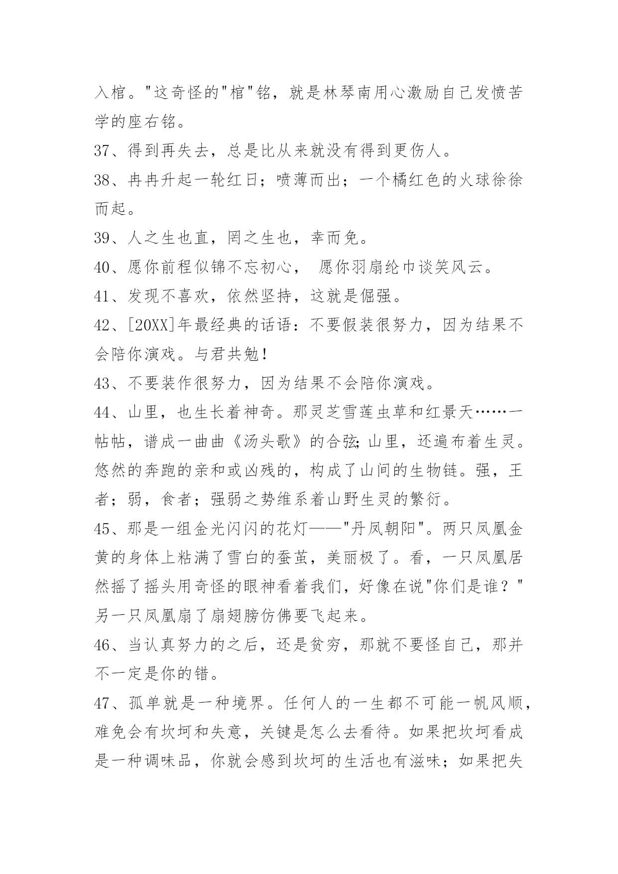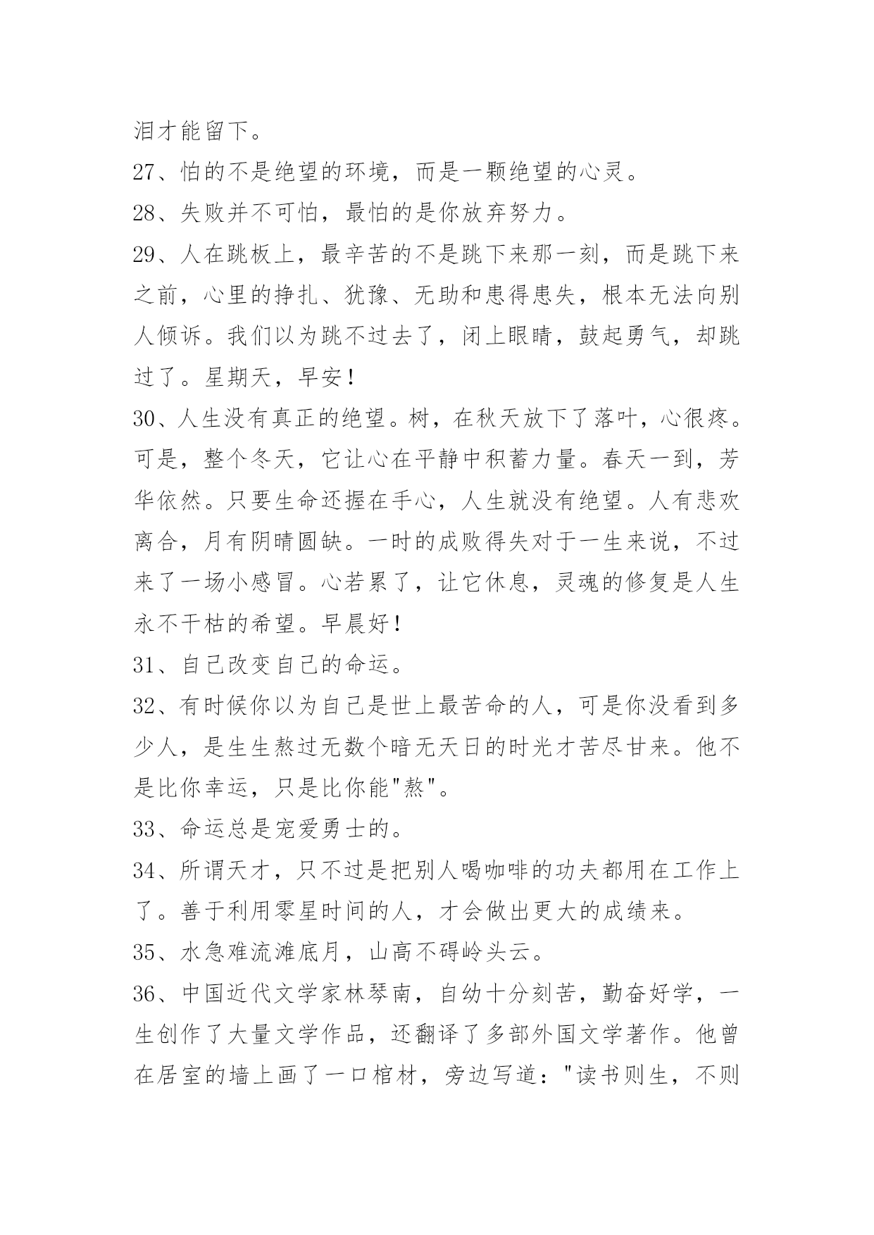 奋斗励志的句子100条【热门】奋斗励志的句子100条小时候,希望自己快点长大,长大了,却发现遗失了童年;单身时,羡慕恋人的甜蜜,恋爱时,怀念单身的自由。很多事物,没有得到时总觉得美好,得到之后才开始明白:我们在得到的同时也在失去。对自己说,有得有失,淡然面对。以下是小编为大家整理推荐的奋斗励志的句子100条,希望大家喜欢。1、你即是我心中的棉花糖,甜美的梦想。2、飞机上,乌鸦对乘务员说:给爷来杯水。猪听后也学道:给爷来杯水。乘务员把猪和乌鸦扔出机舱。乌鸦笑着对猪说:傻了吧?爷会飞。外界因素是一种约束条件,自身能力也是一种约束条件,而且往往更重要。所以,别人能成功的事,未必自己就能成功。选择适合自己的行业才是最好的行业,给自己定位。3、梁文道《我执》:你所见到的,只不过是自己的想象。你以为是自己的,只不过是种偶然。握得越紧越是徒然。4、人一生凭本事可挣上百万元;超过千万元以上靠的是德,靠的是理念,靠的是人助,靠的是时代和环境。5、这世界只要留心去看,应该还有许多当做的事。为了找不到工作而怨叹的人,我认为是没有真正付出努力去寻找的缘故。6、不怕千辛万苦的工作,就怕努力了老板视而不见,还一个劲的挑刺。7、生存于边缘的百事可乐公司不相信坐等机遇可以给自己带来改观。只有自强,靠自己的努力才能获得市场。事实也证明,"自己"才是财富的源泉。8、幸福的人那么在哪儿都是幸福,不幸福的人在哪儿都是不幸福的。任何人和事,需要你努力说服自己接受或者总试图去求证的,都不是好的。9、都说应该为自己的幸福努力,而我却选择了放弃。10、有些人,需要刻骨铭心的记住。而有些人,需要努力的忘记。11、什么梦想,夙愿,都不过是年轻时候的执念罢了。一觉醒来,真觉得自己已经老了,累了。12、您的事业这么成功,一定对理财很干兴趣。13、有谁愿意忘记梦想呢,不过是坚持记着太疼了罢了。14、在我一生最奢侈的事,就是在途中与你相遇,然后相濡以沫。揽一捧光阴,握一份懂得,穿越一场又一场的生命迷雾。不是没有忧伤,是我们学会了坚强,不是没有挫折,是我们学会了面对。每一场经历都是生活的积累,每一次坎坷都是生命的历练。15、生活的美是来源于你对生活的热爱,每天把牢骚拿出来晒晒太阳,心情就不会缺钙;只要你的心是晴的,人生就没有雨天。16、欲望是永无止尽的。欲望太多,就像有一座大山压在我们的身上,使我们身心崩溃。要想远离沉重的人生,享受简单充实的生活,就必须将那些不必要的欲望关在门外。17、给自己一个期许,一年时间努力工作,吃多点苦也没关系,那个位置我要去争取。18、我不高,我不帅,我也不富,我所能努力的,只有内在的气质与将来的成就。19、我在那么努力的维护我们彼此的爱情,为什么你就不会懂。我真的感觉累了。20、暗自伤心,不如立即行动。21、有缺陷的月亮因在不停地奋斗时,全能获得圆满的成功。22、梦想会指引我们,从伤疤里绽放光芒,长出翅膀,即使流尽鲜血,也再所不惜。23、生命那就是一种缘,你刻意的去追求的东西也许终生得不到,而你不曾期待的灿烂反而会在你的淡泊从容中不期而至。24、希望就是希望,无论它的可能有多少,只要有可能,它就有希望,而所有的希望都是为那些时刻为希望准备着的人准备的。25、路还长,别太狂,以后指不定谁辉煌!低落的时候不要失落,低谷的时候不要失望,时刻保持微笑,将坚强和坚持进行下去!不要让自己的善良,成为别人轻视你的缘由!26、在坚持不懈的过程中,实在累了的时候,拿来读一读,看一看,又会有继续奋斗的动力。记住,再苦再累是自己选择的路,决不能放弃,更不能掉眼泪。只有胜利的时候,眼泪才能留下。27、怕的不是绝望的环境,而是一颗绝望的心灵。28、失败并不可怕,最怕的是你放弃努力。29、人在跳板上,最辛苦的不是跳下来那一刻,而是跳下来之前,心里的挣扎、犹豫、无助和患得患失,根本无法向别人倾诉。我们以为跳不过去了,闭上眼睛,鼓起勇气,却跳过了。星期天,早安!30、人生没有真正的绝望。树,在秋天放下了落叶,心很疼。可是,整个冬天,它让心在平静中积蓄力量。春天一到,芳华依然。只要生命还握在手心,人生就没有绝望。人有悲欢离合,月有阴晴圆缺。一时的成败得失对于一生来说,不过来了一场小感冒。心若累了,让它休息,灵魂的修复是人生永不干枯的希望。早晨好!31、自己改变自己的命运。32、有时候你以为自己是世上最苦命的人,可是你没看到多少人,是生生熬过无数个暗无天日的时光才苦尽甘来。他不是比你幸运,只是比你能"熬"。33、命运总是宠爱勇士的。34、所谓天才,只不过是把别人喝咖啡的功夫都用在工作上了。善于利用零星时间的人,才会做出更大的成绩来。35、水急难流滩底月,山高不碍岭头云。36、中国近代文学家林琴南,自幼十分刻苦,勤奋好学,一生创作了大量文学作品,还翻译了多部外国文学著作。他曾在居室的墙上画了