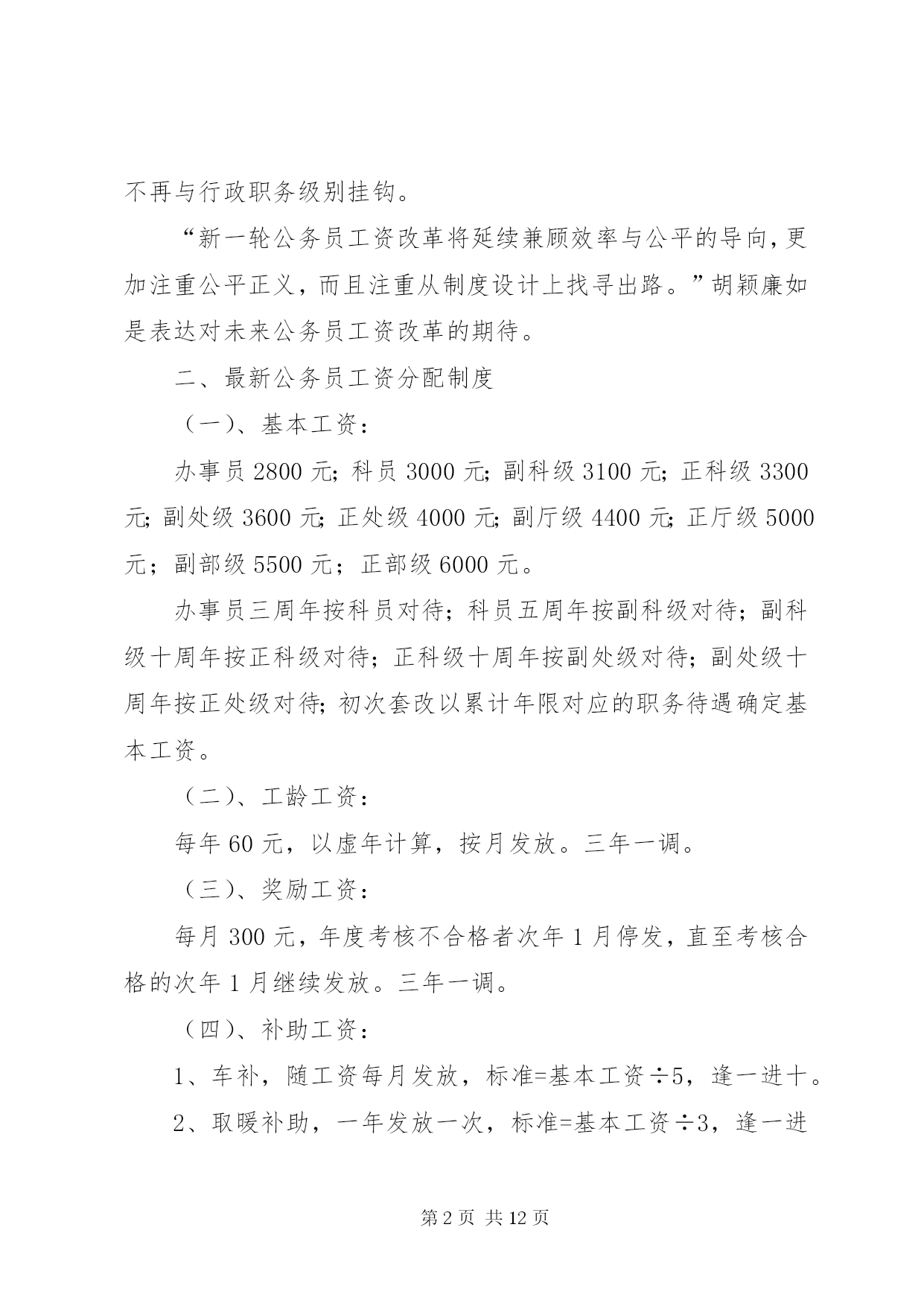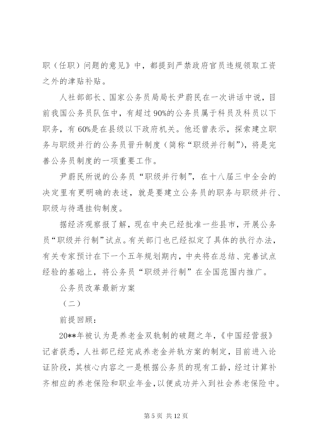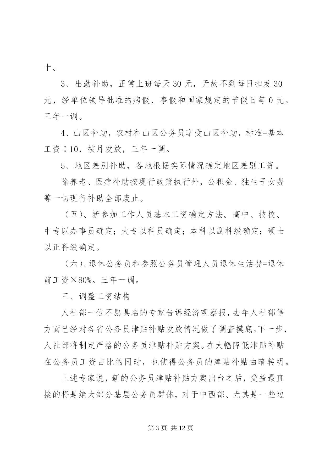 第PAGE\*Arabic\*MERGEFORMAT12页共NUMPAGES\*MERGEFORMAT12页公务员改革最新方案公务员改革最新方案(一)一、公务员工资改革已明确目标根据**年2月国务院转发的《深化收入分配制度改革若干意见》工作任务,胡颖廉就新一轮公务员工资改革方向表示,此次改革的重点应是提高基层公务员待遇,具体做法有两点,一是规范公务员地区附加津贴制度;二是完善职务和职级并行的薪酬制度。“公务员队伍是国家治理现代化的重要载体和支撑,基层公务员更是上情下达的关键环节”,胡颖廉认为,规范公务员地区附加津贴制度,能够有效解决地区差别不合理的问题。现实中,省与省之间最高和最低津补贴相差可达3至4倍,同一省内不同地区也存在差距,不仅挫伤了积极性,也直接影响行政效率。其次,完善职务和职级并行的薪酬制度,就需要在“升官”的狭窄路径之外,拓宽“职级”这条路。这方面深圳走在全国前列。作为人社部批准的全国聘任制公务员制度试点,深圳于**年和**年分两批招聘了53名聘任制公务员。**年1月1日起深圳规定所有新进入行政机关的公务员,一律实行聘任制。同时开始正式推行公务员分类管理改革,将公务员分为综合管理、行政执法和专业技术三类,并为后两类建立独立的职务序列,工资待遇不再与行政职务级别挂钩。“新一轮公务员工资改革将延续兼顾效率与公平的导向,更加注重公平正义,而且注重从制度设计上找寻出路。”胡颖廉如是表达对未来公务员工资改革的期待。二、最新公务员工资分配制度(一)、基本工资:办事员2800元;科员3000元;副科级3100元;正科级3300元;副处级3600元;正处级4000元;副厅级4400元;正厅级5000元;副部级5500元;正部级6000元。办事员三周年按科员对待;科员五周年按副科级对待;副科级十周年按正科级对待;正科级十周年按副处级对待;副处级十周年按正处级对待;初次套改以累计年限对应的职务待遇确定基本工资。(二)、工龄工资:每年60元,以虚年计算,按月发放。三年一调。(三)、奖励工资:每月300元,年度考核不合格者次年1月停发,直至考核合格的次年1月继续发放。三年一调。(四)、补助工资:1、车补,随工资每月发放,标准=基本工资÷5,逢一进十。2、取暖补助,一年发放一次,标准=基本工资÷3,逢一进十。3、出勤补助,正常上班每天30元,无故不到每日扣发30元,经单位领导批准的病假、事假和国家规定的节假日等0元。三年一调。4、山区补助,农村和山区公务员享受山区补助,标准=基本工资÷10,按月发放,三年一调。5、地区差別补助,各地根据实际情况确定地区差別工资。除养老、医疗补助按现行政策执行外,公积金、独生子女费等一切现行补助全部废止。(五)、新参加工作人员基本工资确定方法。高中、技校、中专以办事员确定;大专以科员确定;本科以副科级确定;硕士以正科级确定。(六)、退休公务员和参照公务员管理人员退休生活费=退休前工资×80%。三年一调。三、调整工资结构人社部一位不愿具名的专家告诉经济观察报,去年人社部等方面已经对各省公务员津贴补贴发放情况做了调查摸底。下一步,人社部将制定严格的公务员津贴补贴方案。在大幅降低津贴补贴在公务员工资占比的同时,也使得公务员的津贴补贴由暗转明。上述专家说,新的公务员津贴补贴方案出台之后,受益最直接的将是绝大部分基层公务员群体,对于中西部、尤其是一些边远地区的公务员,国家将会提高津贴补贴标准,相应地,中西部地区公务员的整体工资收入水平也会随之提高。我国现行的公务员工资制度,主要的依据是2006年实施的《公务员法》、《公务员工资制度改革实施办法》等政策法规。公务员工资由基本工资、津贴补贴组成。基本工资标准全国统一。公务员职务高,相应级别就高,基本工资也高。从国务院总理到乡镇一级政府的科员、办事员,共分27个级别。基本工资最高与最低的比例是12:1。公务员工资的差距主要是体现在津贴补贴部分。人社部劳动工资研究所曾做过调查,现在国内公务员工资收入中,基本工资占比大约是30%,剩下的就是各种名目、花样繁多的津贴补贴。各省之间,公务员的津贴补贴标准不一致,最高与最低省份之间的津贴补贴有3-4倍的差距。同一省内不同县市的公务员津贴补贴也差距很大。有的省内公务员津贴补贴标准多达32个,最低和最高相差1.5万元/年。**年6月,国务院颁布《公务员工资制度改革方案》,提出要制定津贴补贴制度,但是对何时出台没有时间限制。现在公务员津贴补贴都是各地自行规定。近两年,中央加大反腐力度,在中纪委发出《关于落实中央八项规定精神坚决刹住中秋国庆期间公款送礼等不正之风的通知》,以及中组部印发《关于进一步规范党政领导干部在企业兼职(任职)问题的意见》中,都提到严禁政府官员违规领取工资之外的津贴补贴。人社部部长、国家公务员局局