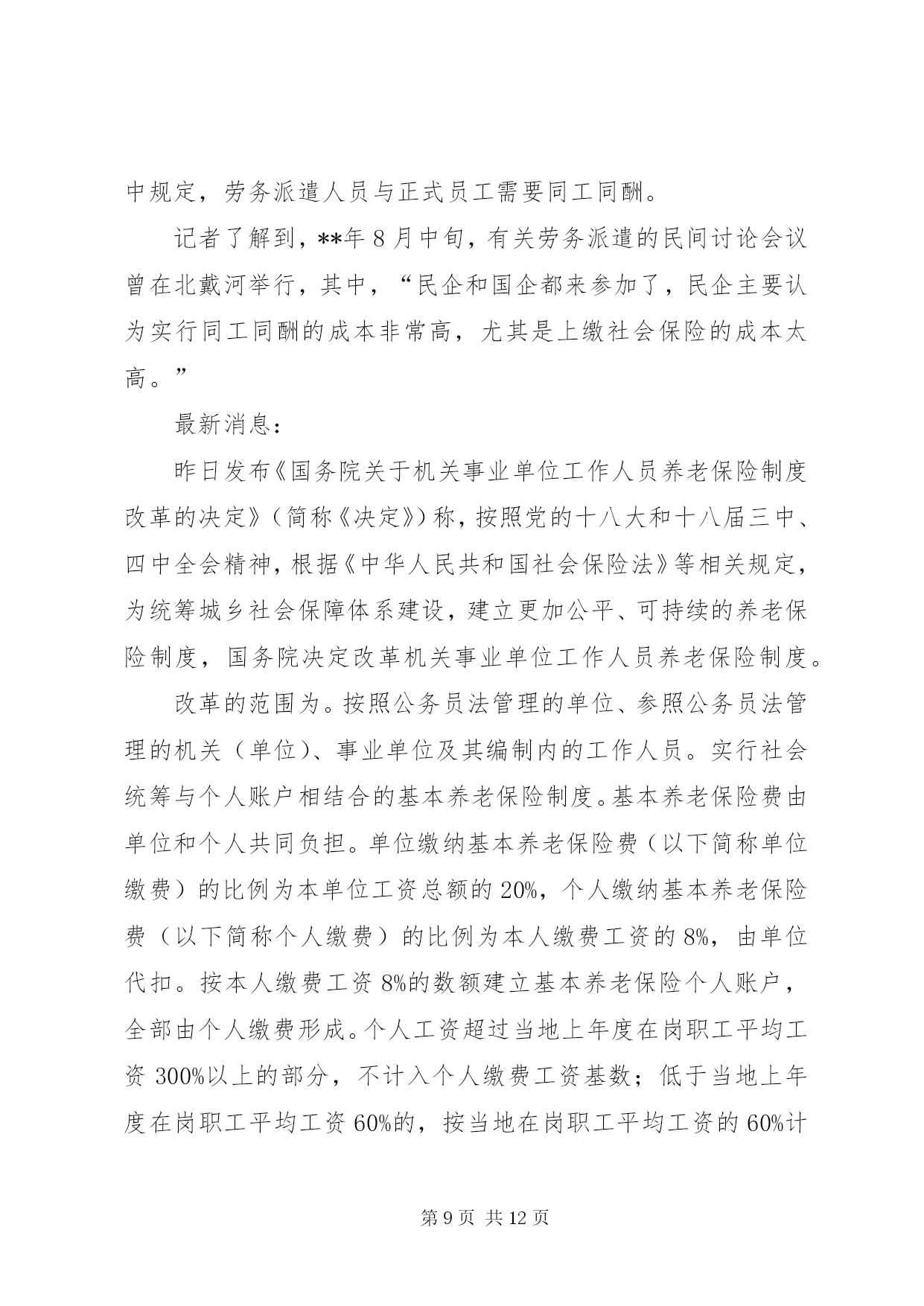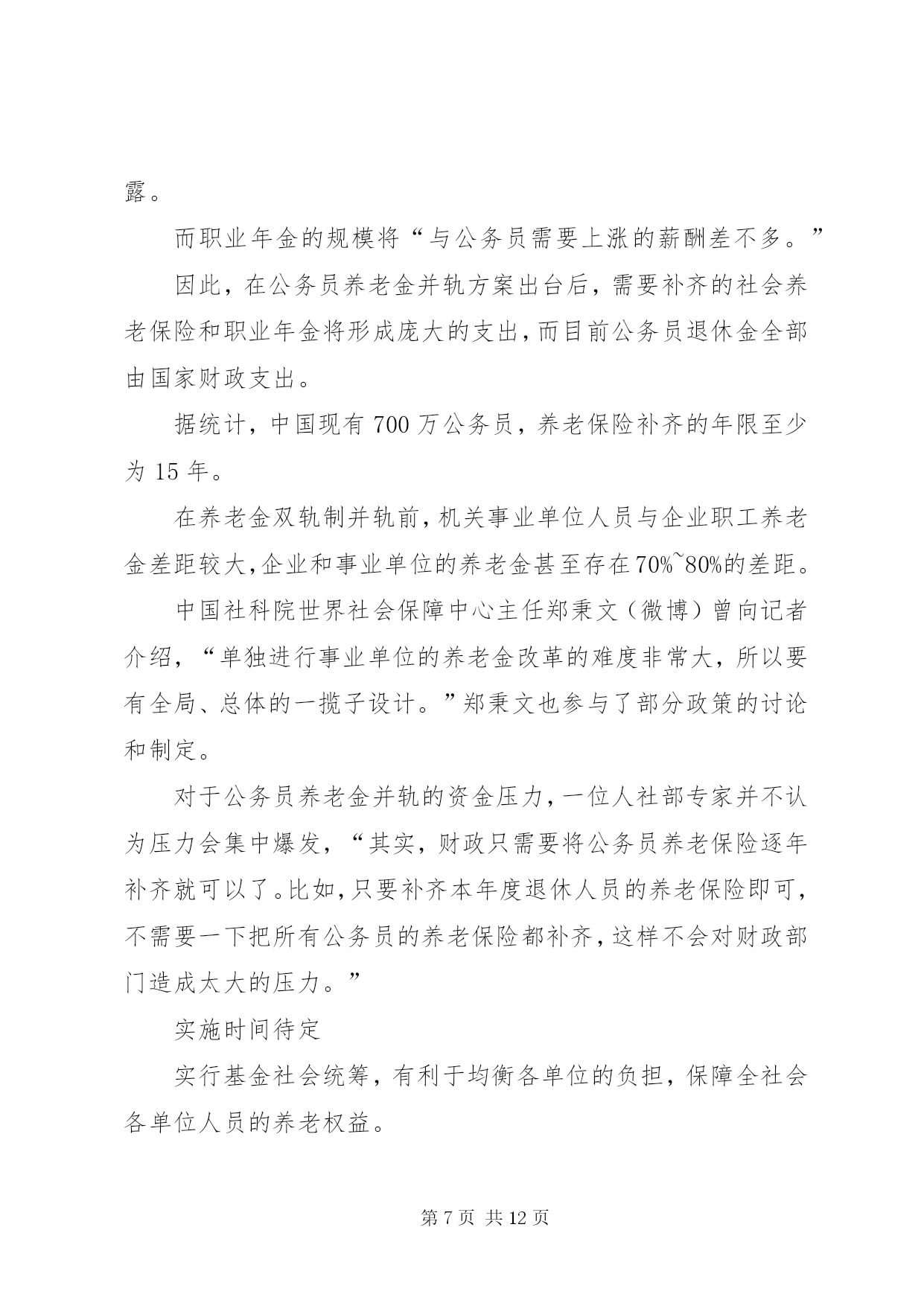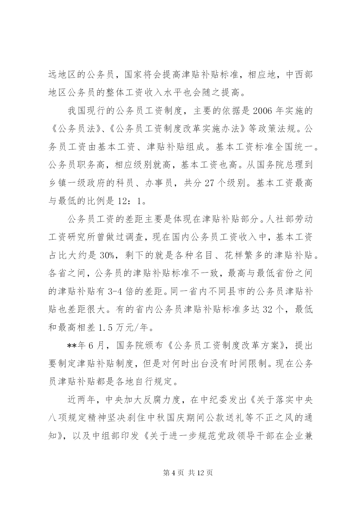 第PAGE\*Arabic\*MERGEFORMAT12页共NUMPAGES\*MERGEFORMAT12页公务员改革最新方案公务员改革最新方案(一)一、公务员工资改革已明确目标根据**年2月国务院转发的《深化收入分配制度改革若干意见》工作任务,胡颖廉就新一轮公务员工资改革方向表示,此次改革的重点应是提高基层公务员待遇,具体做法有两点,一是规范公务员地区附加津贴制度;二是完善职务和职级并行的薪酬制度。“公务员队伍是国家治理现代化的重要载体和支撑,基层公务员更是上情下达的关键环节”,胡颖廉认为,规范公务员地区附加津贴制度,能够有效解决地区差别不合理的问题。现实中,省与省之间最高和最低津补贴相差可达3至4倍,同一省内不同地区也存在差距,不仅挫伤了积极性,也直接影响行政效率。其次,完善职务和职级并行的薪酬制度,就需要在“升官”的狭窄路径之外,拓宽“职级”这条路。这方面深圳走在全国前列。作为人社部批准的全国聘任制公务员制度试点,深圳于**年和**年分两批招聘了53名聘任制公务员。**年1月1日起深圳规定所有新进入行政机关的公务员,一律实行聘任制。同时开始正式推行公务员分类管理改革,将公务员分为综合管理、行政执法和专业技术三类,并为后两类建立独立的职务序列,工资待遇不再与行政职务级别挂钩。“新一轮公务员工资改革将延续兼顾效率与公平的导向,更加注重公平正义,而且注重从制度设计上找寻出路。”胡颖廉如是表达对未来公务员工资改革的期待。二、最新公务员工资分配制度(一)、基本工资:办事员2800元;科员3000元;副科级3100元;正科级3300元;副处级3600元;正处级4000元;副厅级4400元;正厅级5000元;副部级5500元;正部级6000元。办事员三周年按科员对待;科员五周年按副科级对待;副科级十周年按正科级对待;正科级十周年按副处级对待;副处级十周年按正处级对待;初次套改以累计年限对应的职务待遇确定基本工资。(二)、工龄工资:每年60元,以虚年计算,按月发放。三年一调。(三)、奖励工资:每月300元,年度考核不合格者次年1月停发,直至考核合格的次年1月继续发放。三年一调。(四)、补助工资:1、车补,随工资每月发放,标准=基本工资÷5,逢一进十。2、取暖补助,一年发放一次,标准=基本工资÷3,逢一进十。3、出勤补助,正常上班每天30元,无故不到每日扣发30元,经单位领导批准的病假、事假和国家规定的节假日等0元。三年一调。4、山区补助,农村和山区公务员享受山区补助,标准=基本工资÷10,按月发放,三年一调。5、地区差別补助,各地根据实际情况确定地区差別工资。除养老、医疗补助按现行政策执行外,公积金、独生子女费等一切现行补助全部废止。(五)、新参加工作人员基本工资确定方法。高中、技校、中专以办事员确定;大专以科员确定;本科以副科级确定;硕士以正科级确定。(六)、退休公务员和参照公务员管理人员退休生活费=退休前工资×80%。三年一调。三、调整工资结构人社部一位不愿具名的专家告诉经济观察报,去年人社部等方面已经对各省公务员津贴补贴发放情况做了调查摸底。下一步,人社部将制定严格的公务员津贴补贴方案。在大幅降低津贴补贴在公务员工资占比的同时,也使得公务员的津贴补贴由暗转明。上述专家说,新的公务员津贴补贴方案出台之后,受益最直接的将是绝大部分基层公务员群体,对于中西部、尤其是一些边远地区的公务员,国家将会提高津贴补贴标准,相应地,中西部地区公务员的整体工资收入水平也会随之提高。我国现行的公务员工资制度,主要的依据是2006年实施的《公务员法》、《公务员工资制度改革实施办法》等政策法规。公务员工资由基本工资、津贴补贴组成。基本工资标准全国统一。公务员职务高,相应级别就高,基本工资也高。从国务院总理到乡镇一级政府的科员、办事员,共分27个级别。基本工资最高与最低的比例是12:1。公务员工资的差距主要是体现在津贴补贴部分。人社部劳动工资研究所曾做过调查,现在国内公务员工资收入中,基本工资占比大约是30%,剩下的就是各种名目、花样繁多的津贴补贴。各省之间,公务员的津贴补贴标准不一致,最高与最低省份之间的津贴补贴有3-4倍的差距。同一省内不同县市的公务员津贴补贴也差距很大。有的省内公务员津贴补贴标准多达32个,最低和最高相差1.5万元/年。**年6月,国务院颁布《公务员工资制度改革方案》,提出要制定津贴补贴制度,但是对何时出台没有时间限制。现在公务员津贴补贴都是各地自行规定。近两年,中央加大反腐力度,在中纪委发出《关于落实中央八项规定精神坚决刹住中秋国庆期间公款送礼等不正之风的通知》,以及中组部印发《关于进一步规范党政领导干部在企业兼职(任职)问题的意见》中,都提到严禁政府官员违规领取工资之外的津贴补贴。人社部部长、国家公务员局局