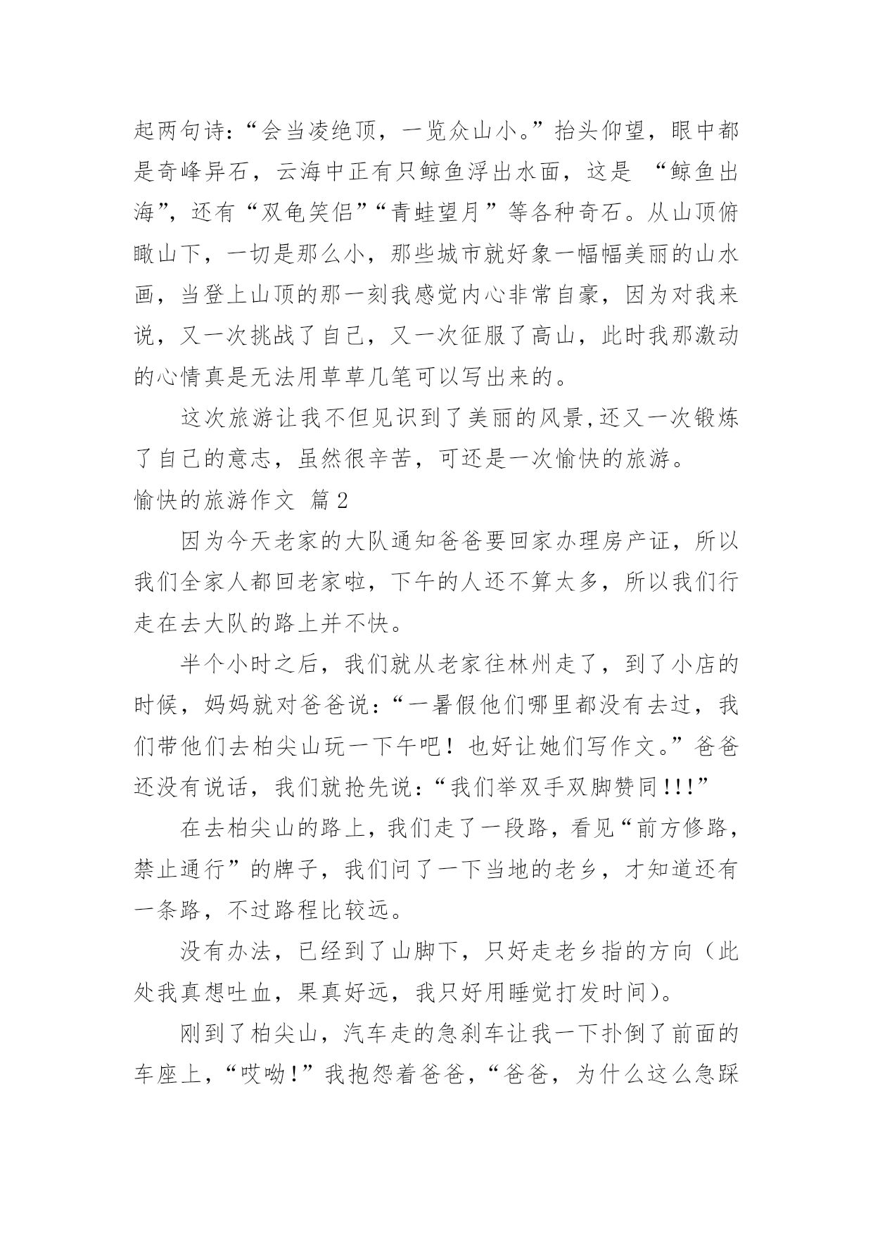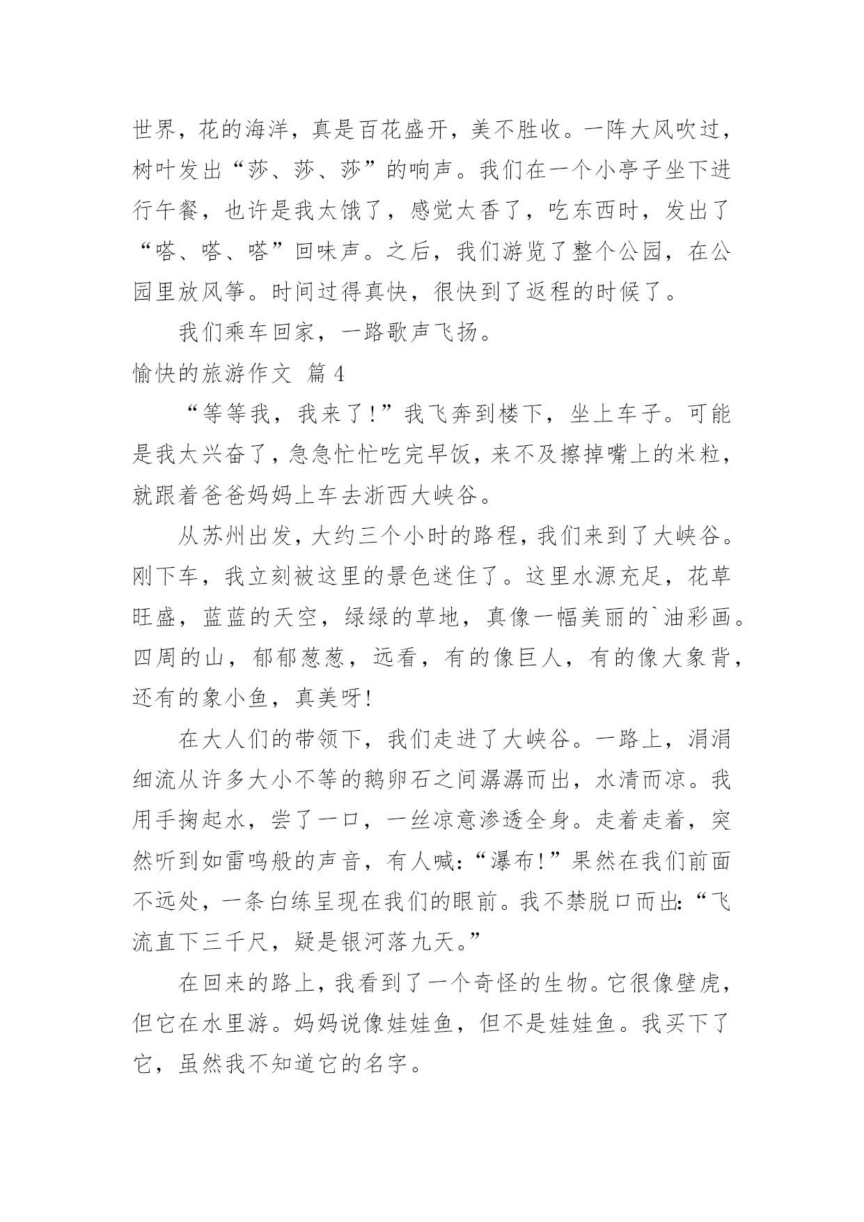愉快的旅游作文愉快的旅游作文5篇在平平淡淡的日常中,大家总少不了接触作文吧,借助作文人们可以实现文化交流的目的。还是对作文一筹莫展吗?下面是小编帮大家整理的愉快的旅游作文5篇,欢迎阅读,希望大家能够喜欢。愉快的旅游作文篇1在暑假里,我感受最深的是去风景如画的天堂寨游玩。天堂寨是华东最后一片原始森林,此山高1700多米。直插云霄之中。山里的天气凉爽,缕缕清风吹来,会让旅途的人们所有劳累都消失了,在山林中,昆虫、鸟儿、游客,让人感觉到与大自然合二为一了。天堂寨有着许多瀑布,九影瀑,泻玉瀑,垂帘瀑……从山脚到山顶一路上处处可以听到瀑布的哗哗流水声,仔细地听,才感觉到流水声一点不单调,时而欢快,时而低沉,时而激昂,停下脚步用心去感受,一曲别样的自然交响乐就演奏出来。虽说山顶风光美,可在途中的景色也不差,如饮马石,恋石松,剑劈石等。其中印象最深还数剑劈石了,据说是被一位剑士劈开的,一块巨大的石头被劈成了俩半,劈开的面很整齐,也不知是如何做到的,留下的只有联想了。在经过努力之后,最终来到山的最高处,这不禁让我想起两句诗:“会当凌绝顶,一览众山小。”抬头仰望,眼中都是奇峰异石,云海中正有只鲸鱼浮出水面,这是“鲸鱼出海”,还有“双龟笑侣”“青蛙望月”等各种奇石。从山顶俯瞰山下,一切是那么小,那些城市就好象一幅幅美丽的山水画,当登上山顶的那一刻我感觉内心非常自豪,因为对我来说,又一次挑战了自己,又一次征服了高山,此时我那激动的心情真是无法用草草几笔可以写出来的。这次旅游让我不但见识到了美丽的风景,还又一次锻炼了自己的意志,虽然很辛苦,可还是一次愉快的旅游。愉快的旅游作文篇2因为今天老家的大队通知爸爸要回家办理房产证,所以我们全家人都回老家啦,下午的人还不算太多,所以我们行走在去大队的路上并不快。半个小时之后,我们就从老家往林州走了,到了小店的时候,妈妈就对爸爸说:“一暑假他们哪里都没有去过,我们带他们去柏尖山玩一下午吧!也好让她们写作文。”爸爸还没有说话,我们就抢先说:“我们举双手双脚赞同!!!”在去柏尖山的路上,我们走了一段路,看见“前方修路,禁止通行”的牌子,我们问了一下当地的老乡,才知道还有一条路,不过路程比较远。没有办法,已经到了山脚下,只好走老乡指的方向(此处我真想吐血,果真好远,我只好用睡觉打发时间)。刚到了柏尖山,汽车走的急刹车让我一下扑倒了前面的车座上,“哎呦!”我抱怨着爸爸,“爸爸,为什么这么急踩刹车?”爸爸说“你看。”我往前一看,哎哟我去,前面有一辆挖掘机,只好下车走着上去。“哇”我还没有发出声音,就听见妈妈说“咱上次来的时候还是山路,这次秀的成木头路啦!”我们继续往前走,不到一刻钟,我们惊讶的连下巴都掉下来了……我看到是在山头上屹立起来的旅游景区——柏尖山。我们转了一圈全是庙,好多啊!虽然我对这里的风景特别喜欢,但是还是依依不舍的离开了。愉快的旅游作文篇3星期日,天朗气清,万里无云。我的心情万分激动,今天,我要和爸爸妈妈外出旅行。一大早,我们就起床了,立刻洗脸刷牙,然后吃一点早饭,背上头一天准备好的行李,我一蹦一跳地下楼出发了。我们乘坐一辆旅游大巴,汽车穿过繁华的城市,很快行使上了高速公路。汽车的高速行使发出了“呼、呼、呼”的响声。我坐在汽车里,唱着歌,欣赏着窗外的景色。汽车行使上了一个大坡,原来是一座高架桥。铛、铛、铛……,“爸爸妈妈快看……”,一列火车行使过来了,就像一条黑色的长龙行使在铁轨上。“嘟、嘟、嘟”的汽笛声响个不停。汽车又行使上了平坦的大道,道路的两旁是一望无际的田野,田野上到处是绿油油的庄稼。到达目的地,我第一个下了车。来到公园,这里是绿的世界,花的海洋,真是百花盛开,美不胜收。一阵大风吹过,树叶发出“莎、莎、莎”的响声。我们在一个小亭子坐下进行午餐,也许是我太饿了,感觉太香了,吃东西时,发出了“嗒、嗒、嗒”回味声。之后,我们游览了整个公园,在公园里放风筝。时间过得真快,很快到了返程的时候了。我们乘车回家,一路歌声飞扬。愉快的旅游作文篇4“等等我,我来了!”我飞奔到楼下,坐上车子。可能是我太兴奋了,急急忙忙吃完早饭,来不及擦掉嘴上的米粒,就跟着爸爸妈妈上车去浙西大峡谷。从苏州出发,大约三个小时的路程,我们来到了大峡谷。刚下车,我立刻被这里的景色迷住了。这里水源充足,花草旺盛,蓝蓝的天空,绿绿的草地,真像一幅美丽的`油彩画。四周的山,郁郁葱葱,远看,有的像巨人,有的像大象背,还有的象小鱼,真美呀!在大人们的带领下,我们走进了大峡谷。一路上,涓涓细流从许多大小不等的鹅卵石之间潺潺而出,水清而凉。我用手掬起水,尝了一口,一丝凉意渗透全身。走着走着,突然听到如雷鸣般的声音,有人喊:“瀑布!”果然在我们前面不远处,一条白练呈现在我们的眼前。我不禁脱口而出:“飞流直下三千尺,疑是银河落九天。”在回来的路上,我看到了