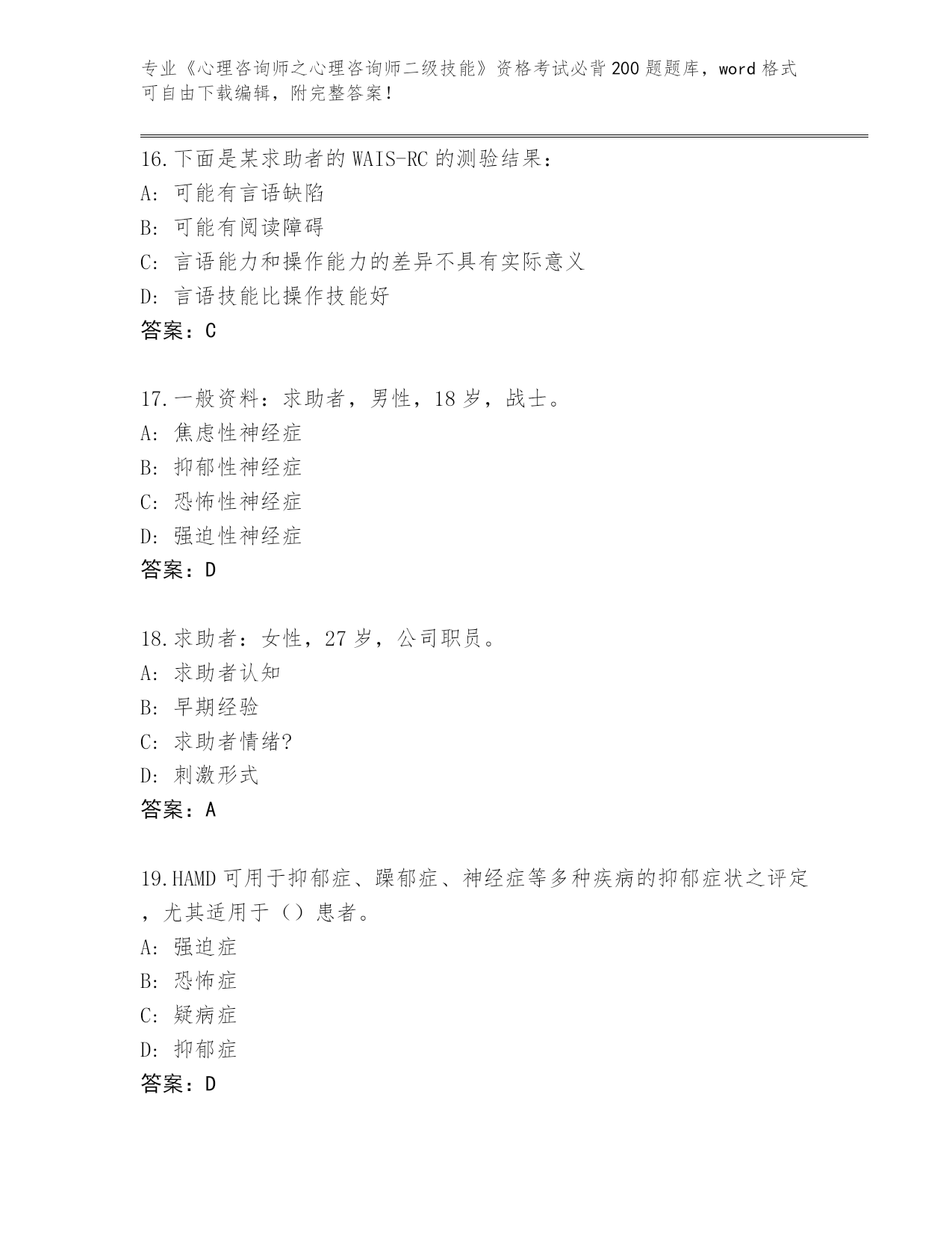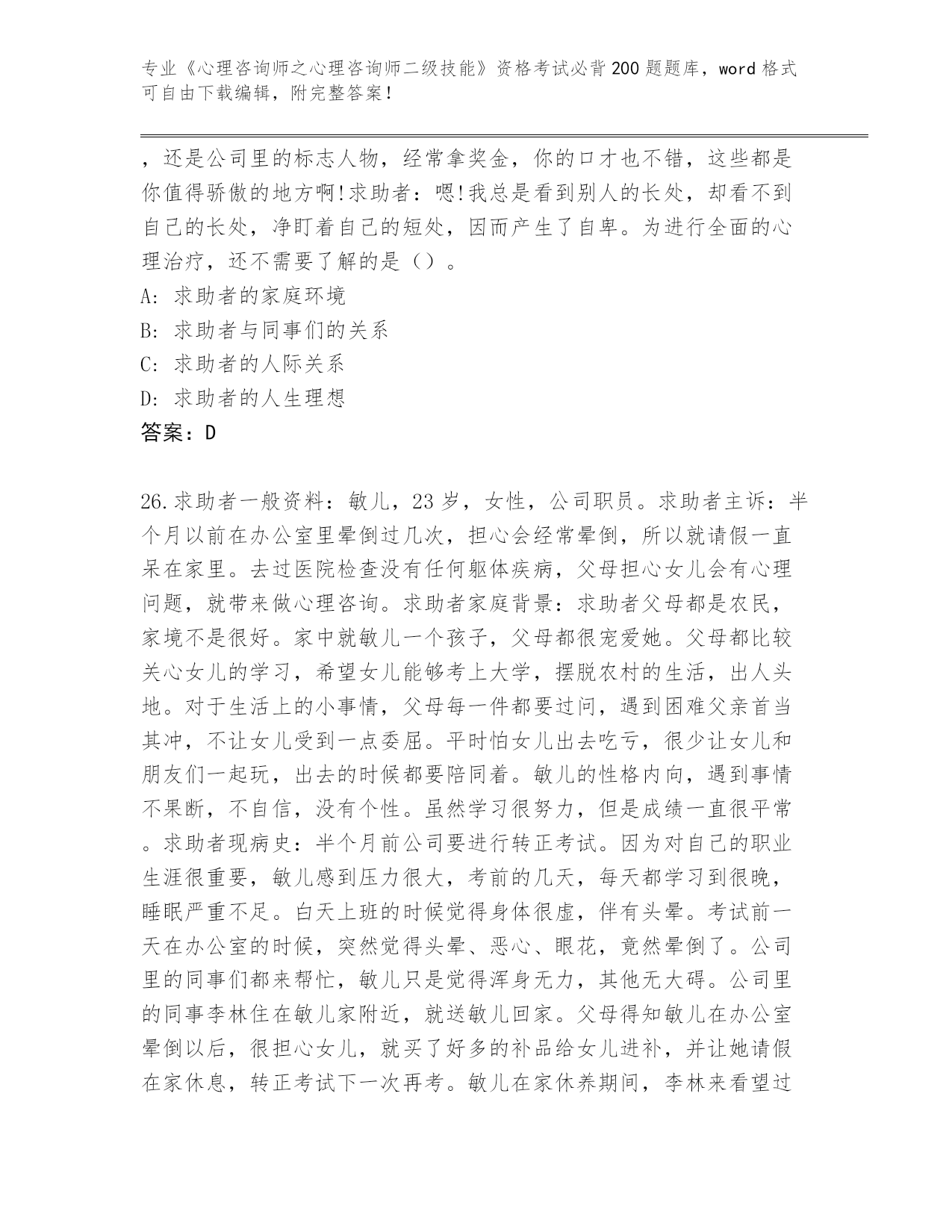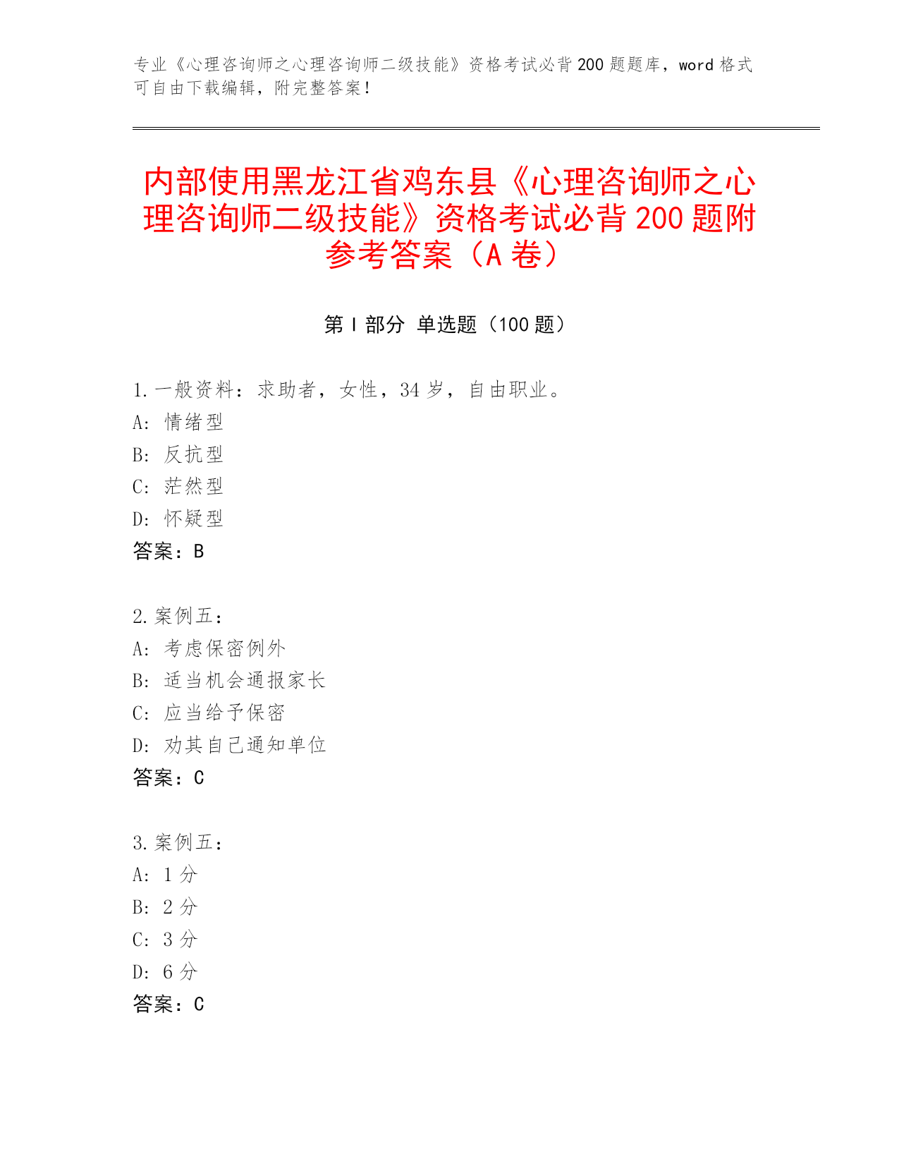 内部使用黑龙江省鸡东县《心理咨询师之心理咨询师二级技能》资格考试必背200题完整