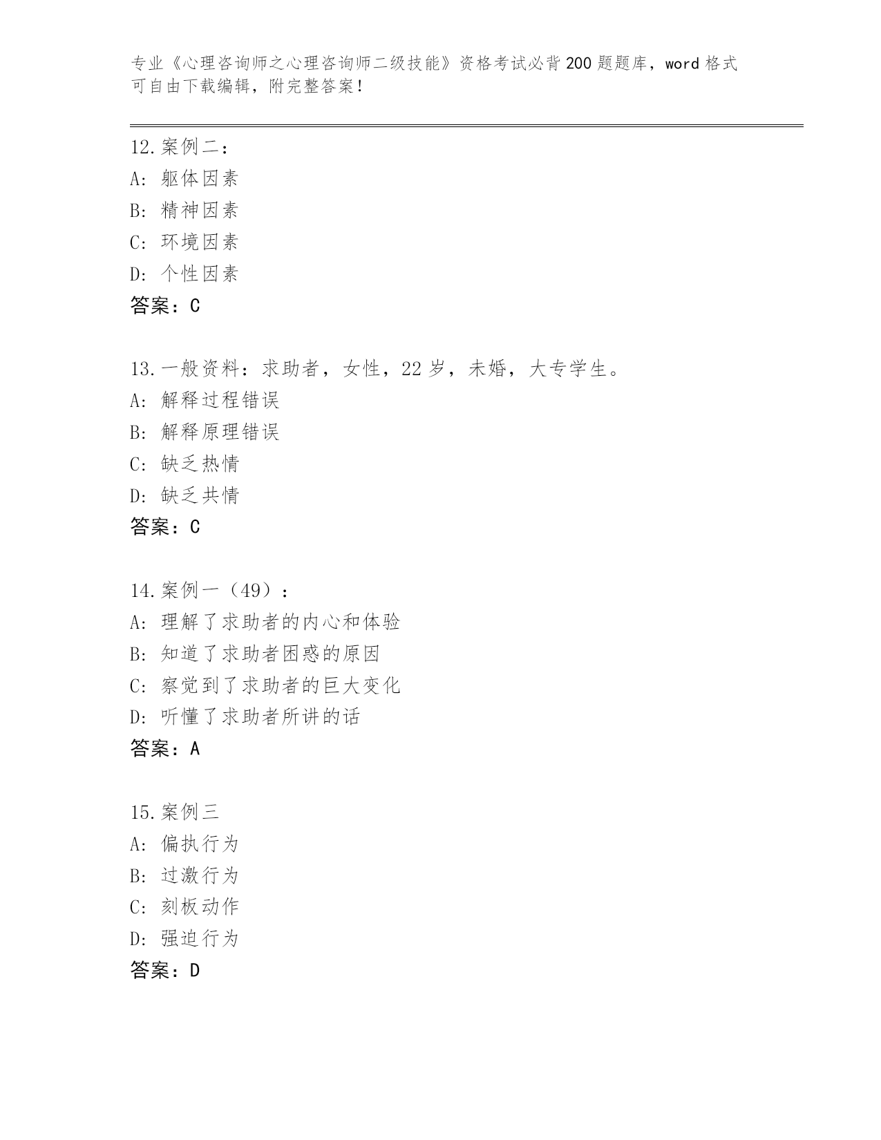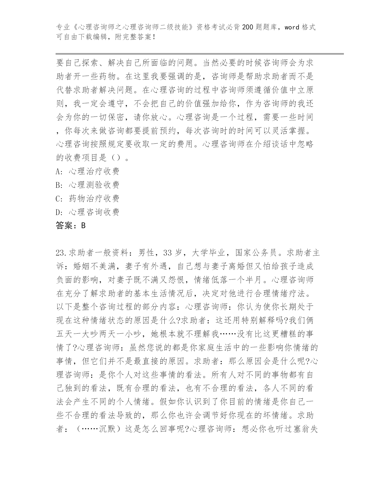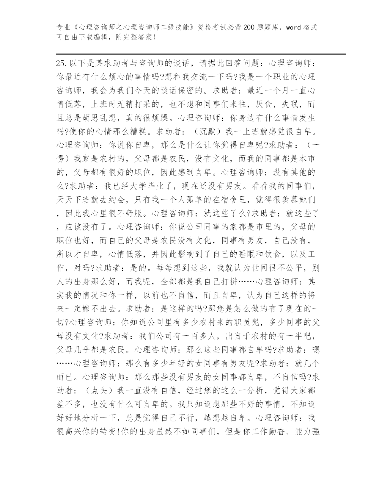 内部使用浙江省《心理咨询师之心理咨询师二级技能》资格考试必背200题(原创题)