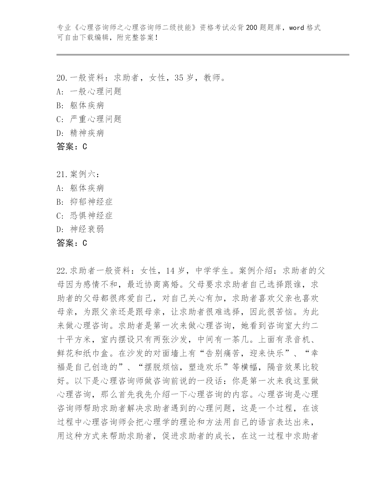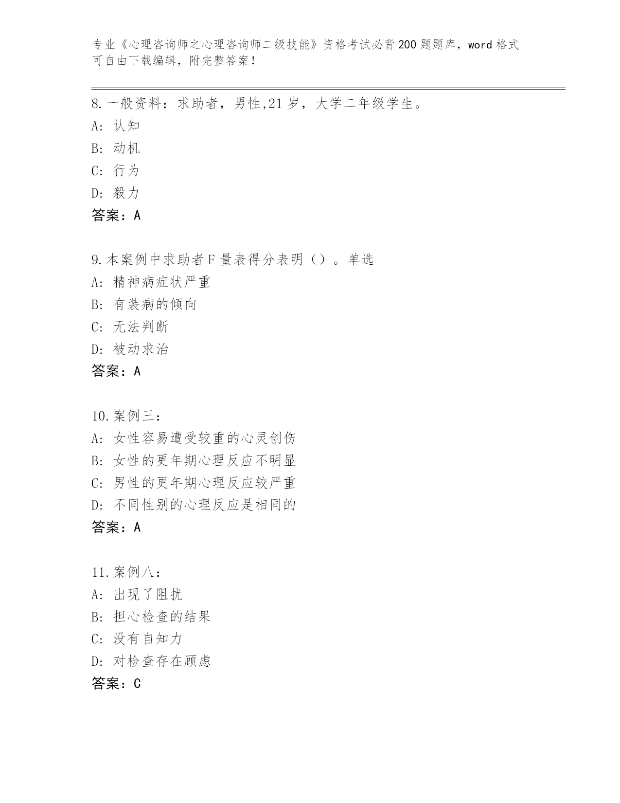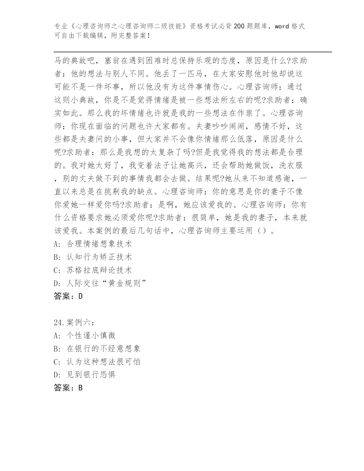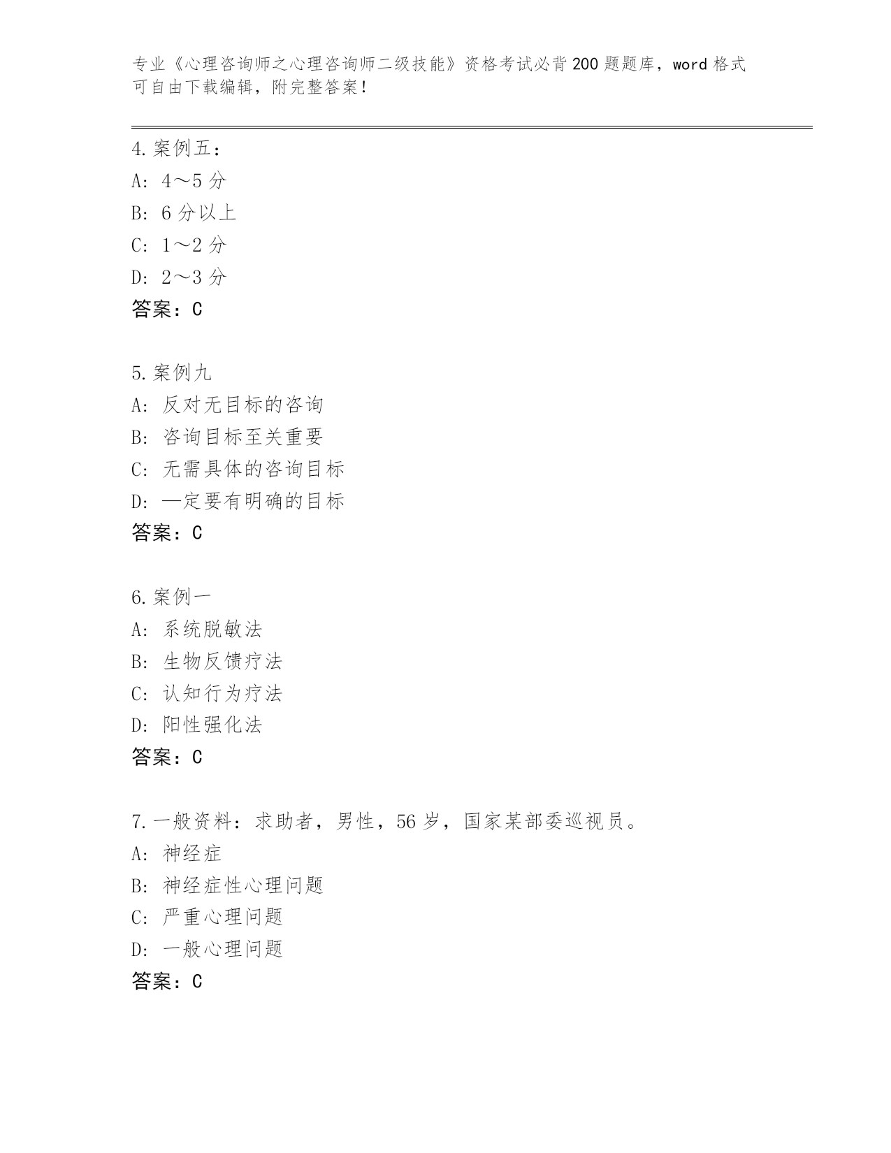 内部使用浙江省《心理咨询师之心理咨询师二级技能》资格考试必背200题(原创题)